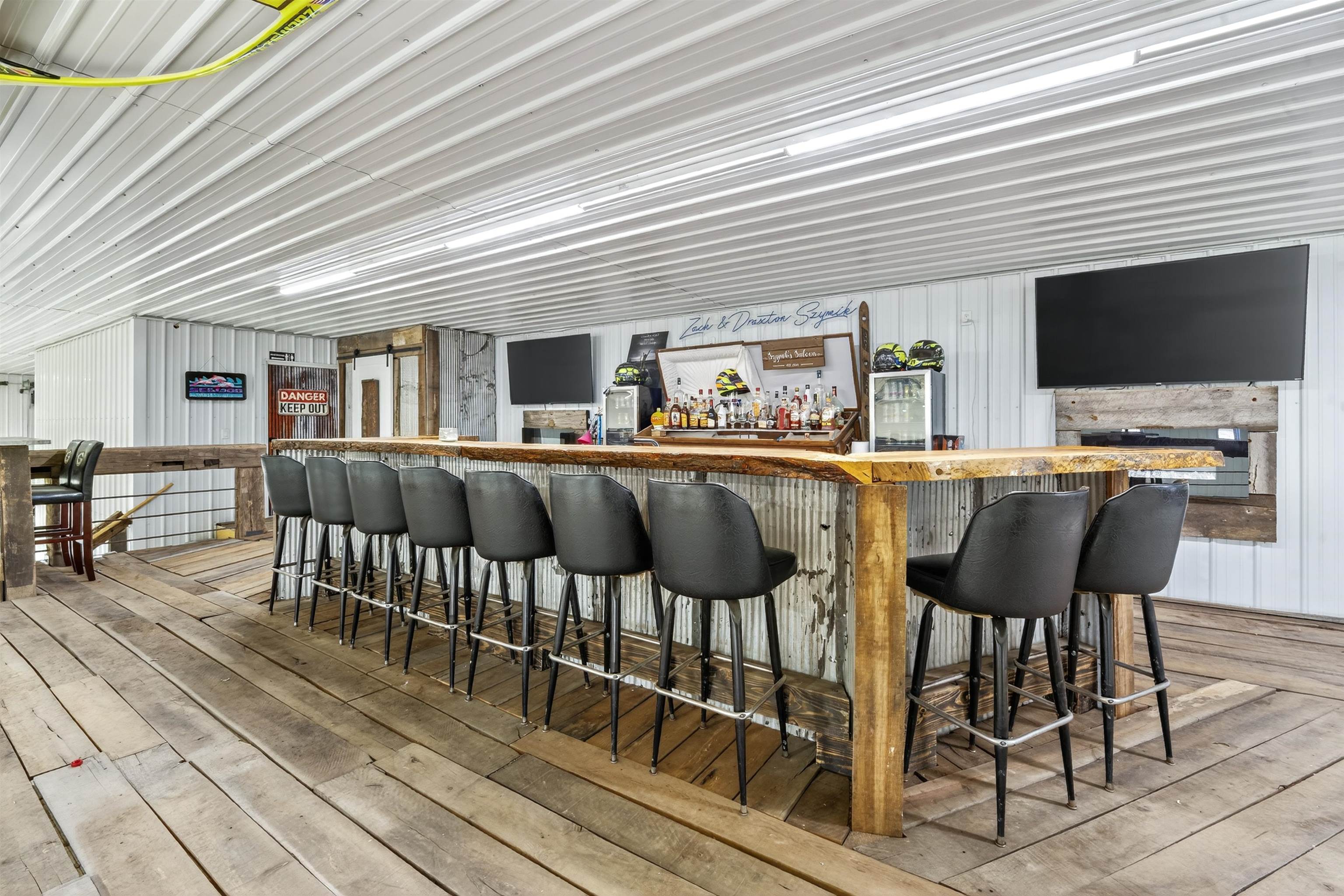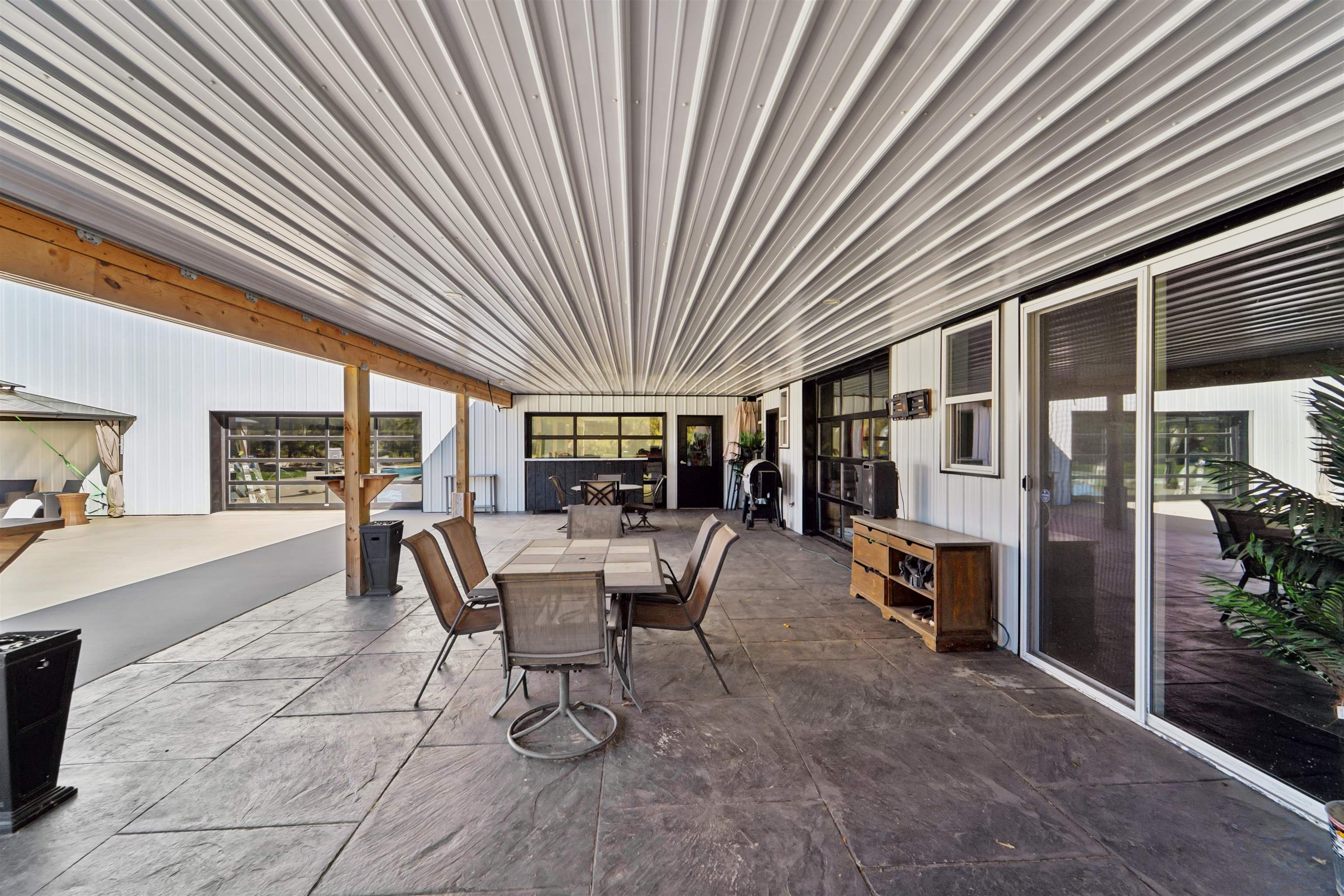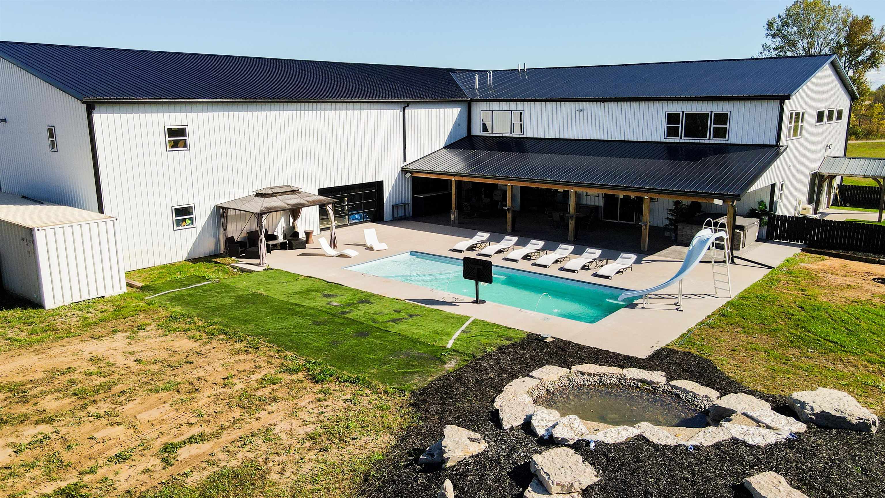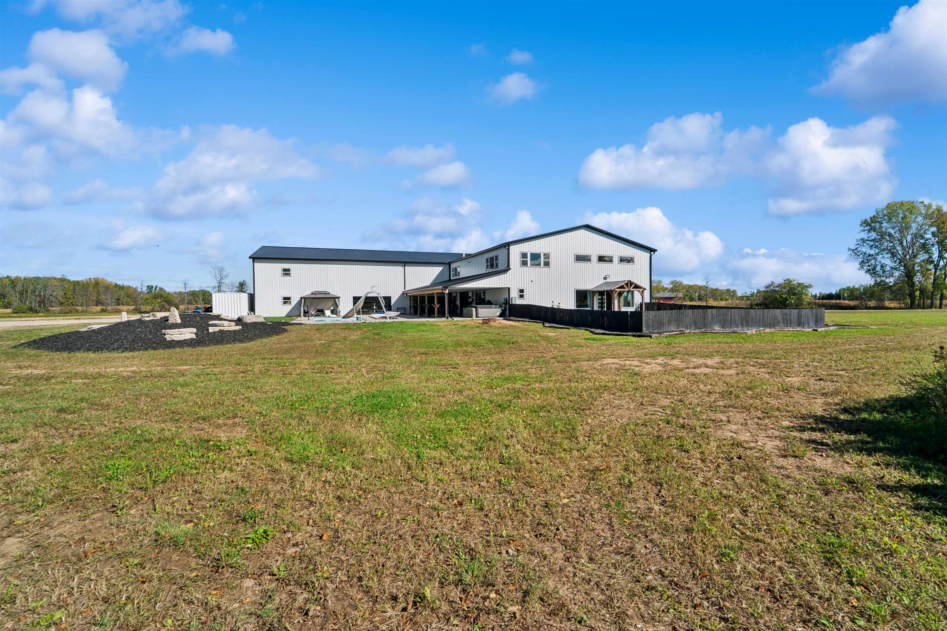 This one-of-a-kind Barndominium offers luxurious living & versatile space on 13 +/- scenic acres w/a wooded border & private pond. The 2story GR features soaring ceilings, lg windows, & FP, flowing into a fully applianced kitchen w/white cabinetry, quartzite counters, center-island & SS appliances. Glass doors from the dining area open to a covered porch w/inground pool & patio w/full bath access-ideal for entertaining & relaxing. The main-floor primary suite includes a spa-like bath w/dual vanity, tile shower & walk-in closet. Upstairs offers: loft, 2 bdrms, LR, office & 3rd bath. Enjoy a heated 7,200 sqft garage w/14 ft overhead door, ½ bath, mezzanine w/bar & rec area, glass doors to pool/patio—ideal for hobbies, business, or entertaining. A rare blend of comfort, style & functionality.