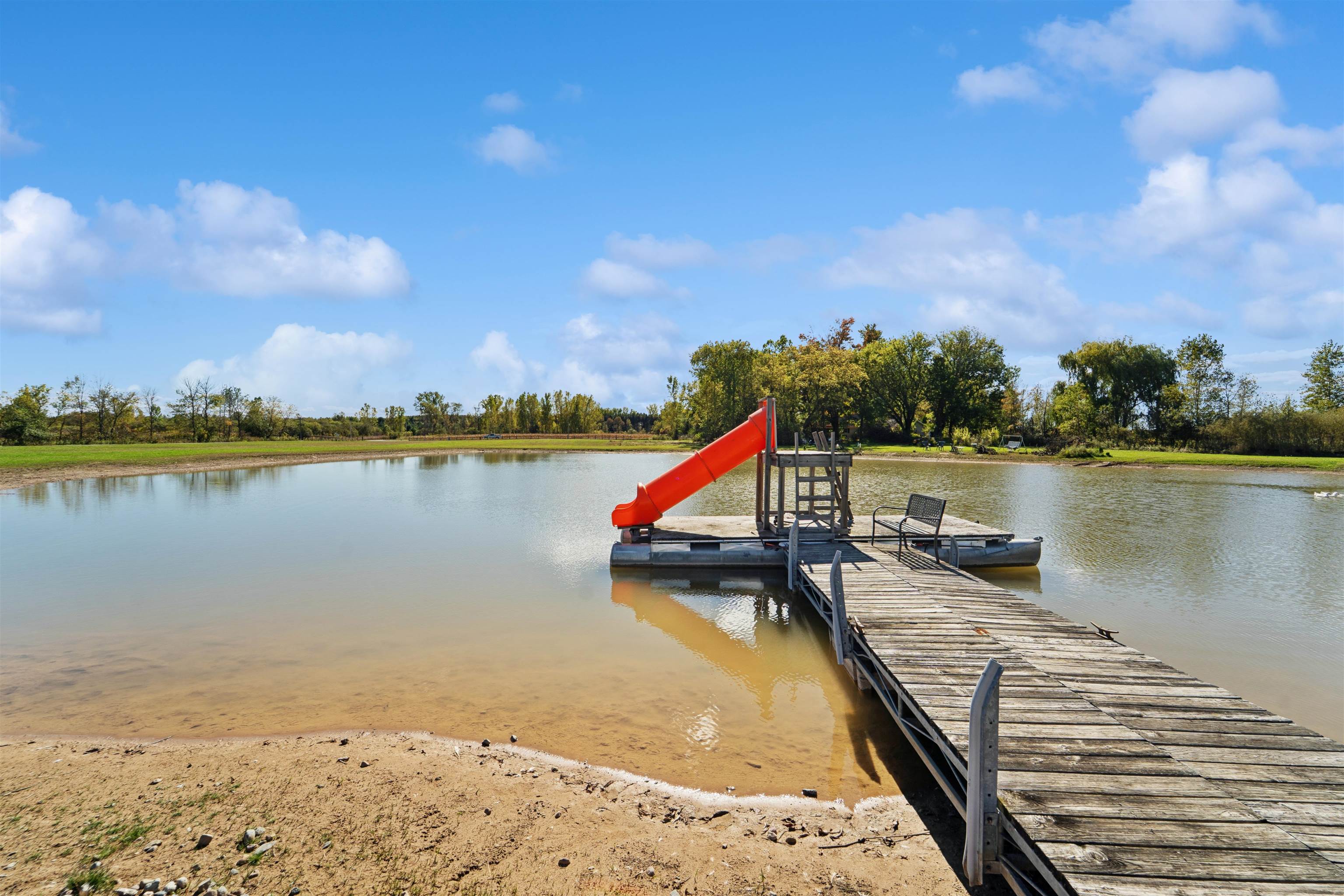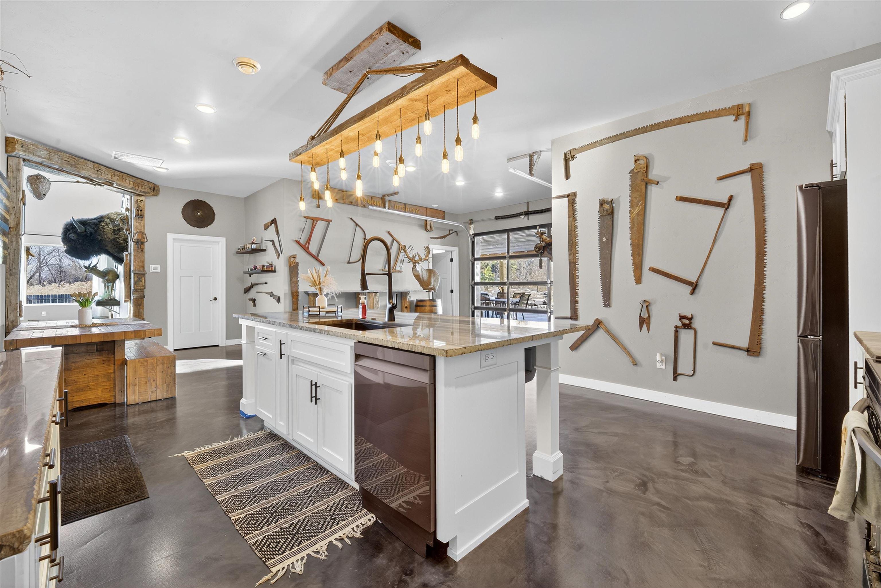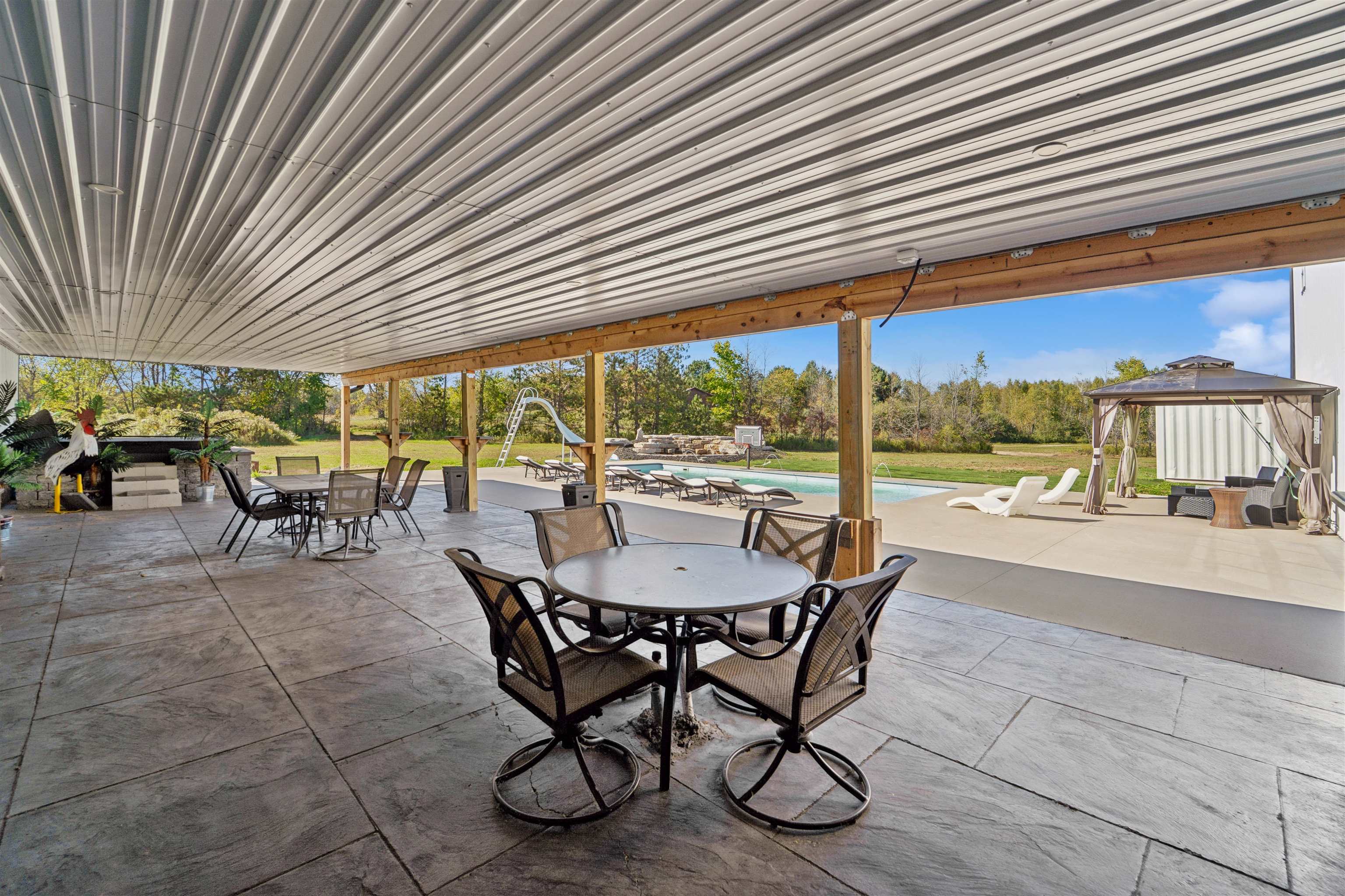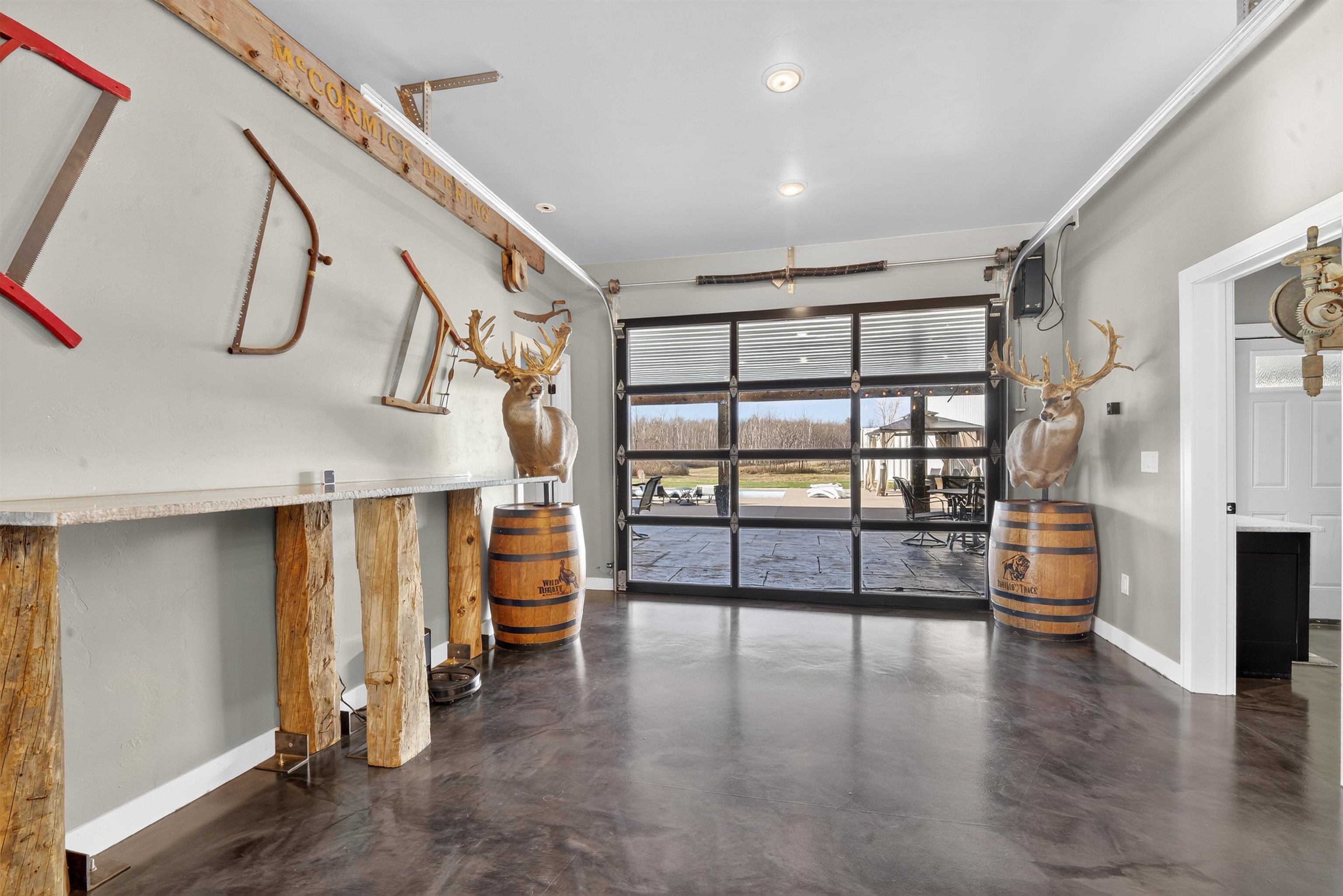 This one-of-a-kind Barndominium offers luxurious living & versatile space on 13 +/- scenic acres w/a wooded border & private pond. The 2story GR features soaring ceilings, lg windows, & FP, flowing into a fully applianced kitchen w/white cabinetry, quartzite counters, center-island & SS appliances. Glass doors from the dining area open to a covered porch w/inground pool & patio w/full bath access-ideal for entertaining & relaxing. The main-floor primary suite includes a spa-like bath w/dual vanity, tile shower & walk-in closet. Upstairs offers: loft, 2 bdrms, LR, office & 3rd bath. Enjoy a heated 7,200 sqft garage w/14 ft overhead door, ½ bath, mezzanine w/bar & rec area, glass doors to pool/patio—ideal for hobbies, business, or entertaining. A rare blend of comfort, style & functionality.
