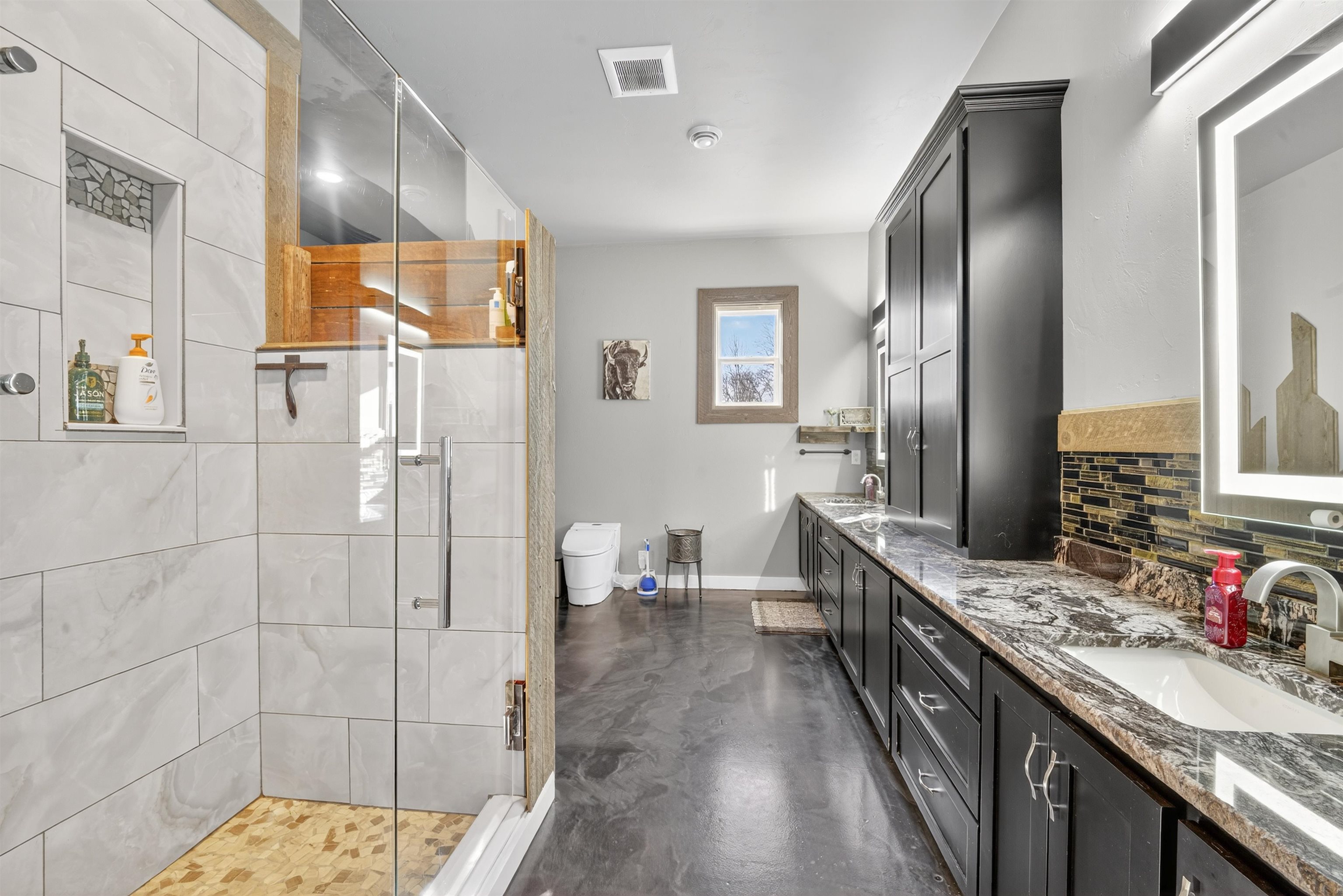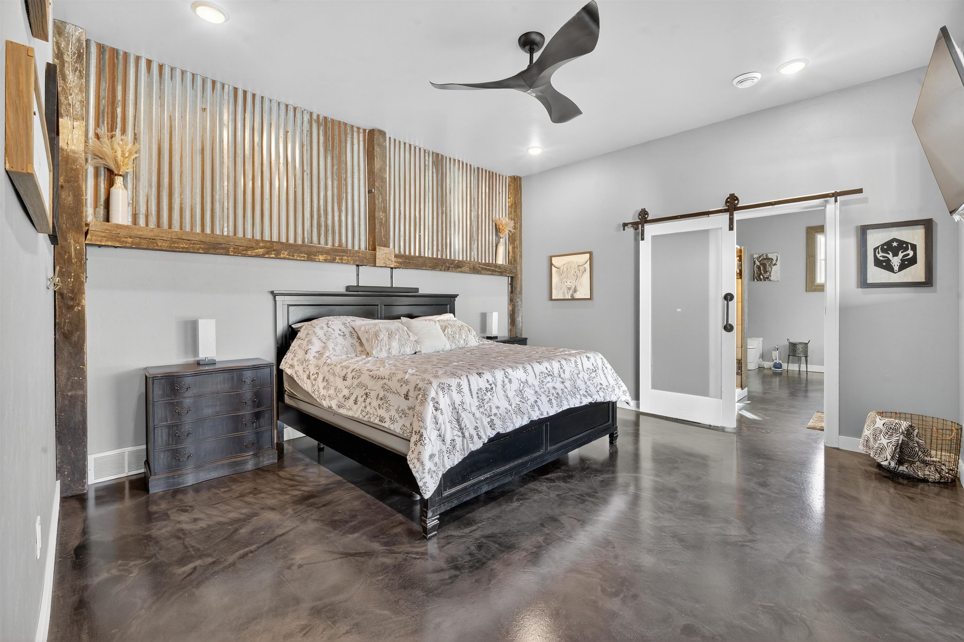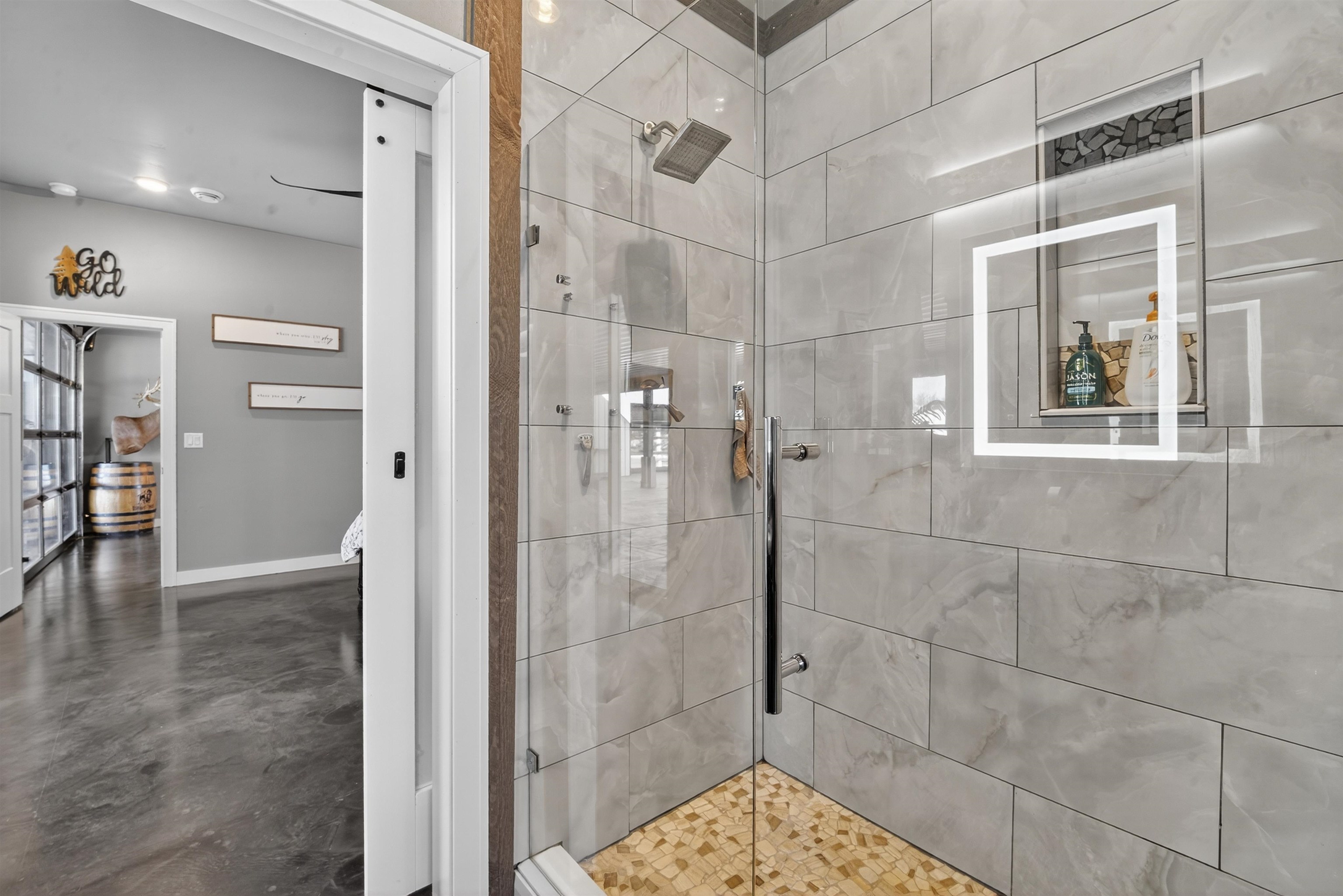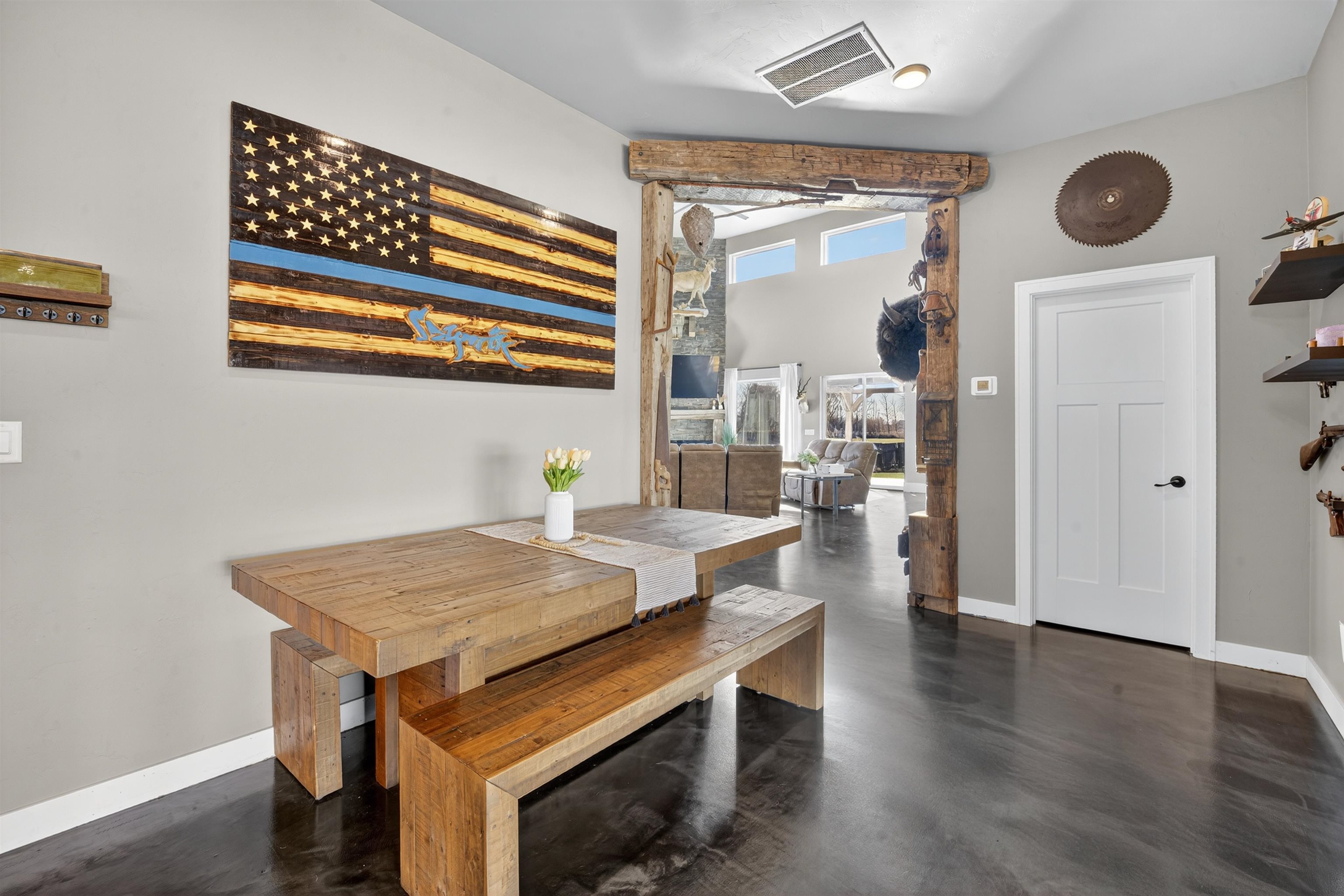 This one-of-a-kind Barndominium offers luxurious living & versatile space on 13 +/- scenic acres w/a wooded border & private pond. The 2story GR features soaring ceilings, lg windows, & FP, flowing into a fully applianced kitchen w/white cabinetry, quartzite counters, center-island & SS appliances. Glass doors from the dining area open to a covered porch w/inground pool & patio w/full bath access-ideal for entertaining & relaxing. The main-floor primary suite includes a spa-like bath w/dual vanity, tile shower & walk-in closet. Upstairs offers: loft, 2 bdrms, LR, office & 3rd bath. Enjoy a heated 7,200 sqft garage w/14 ft overhead door, ½ bath, mezzanine w/bar & rec area, glass doors to pool/patio—ideal for hobbies, business, or entertaining. A rare blend of comfort, style & functionality.