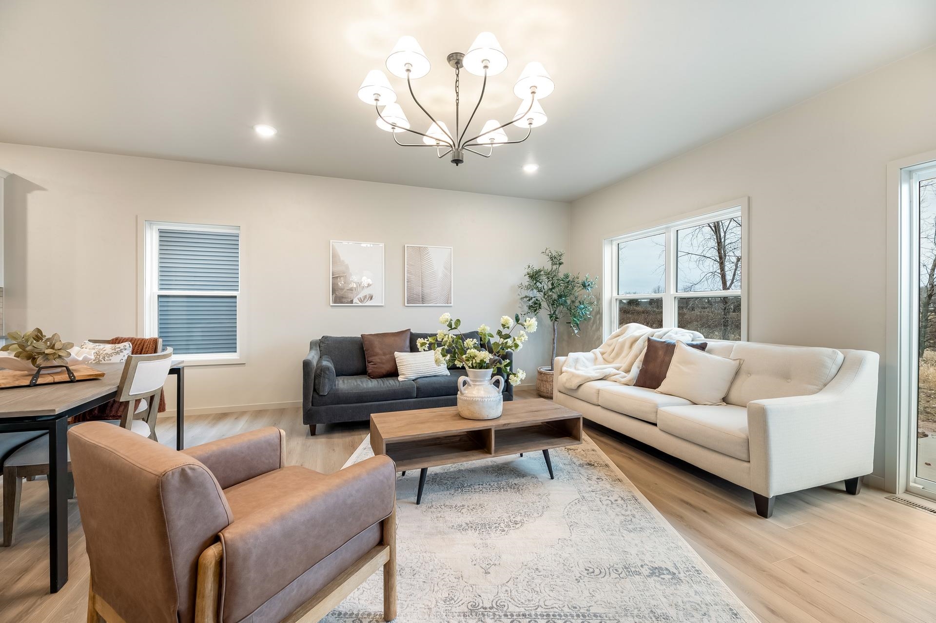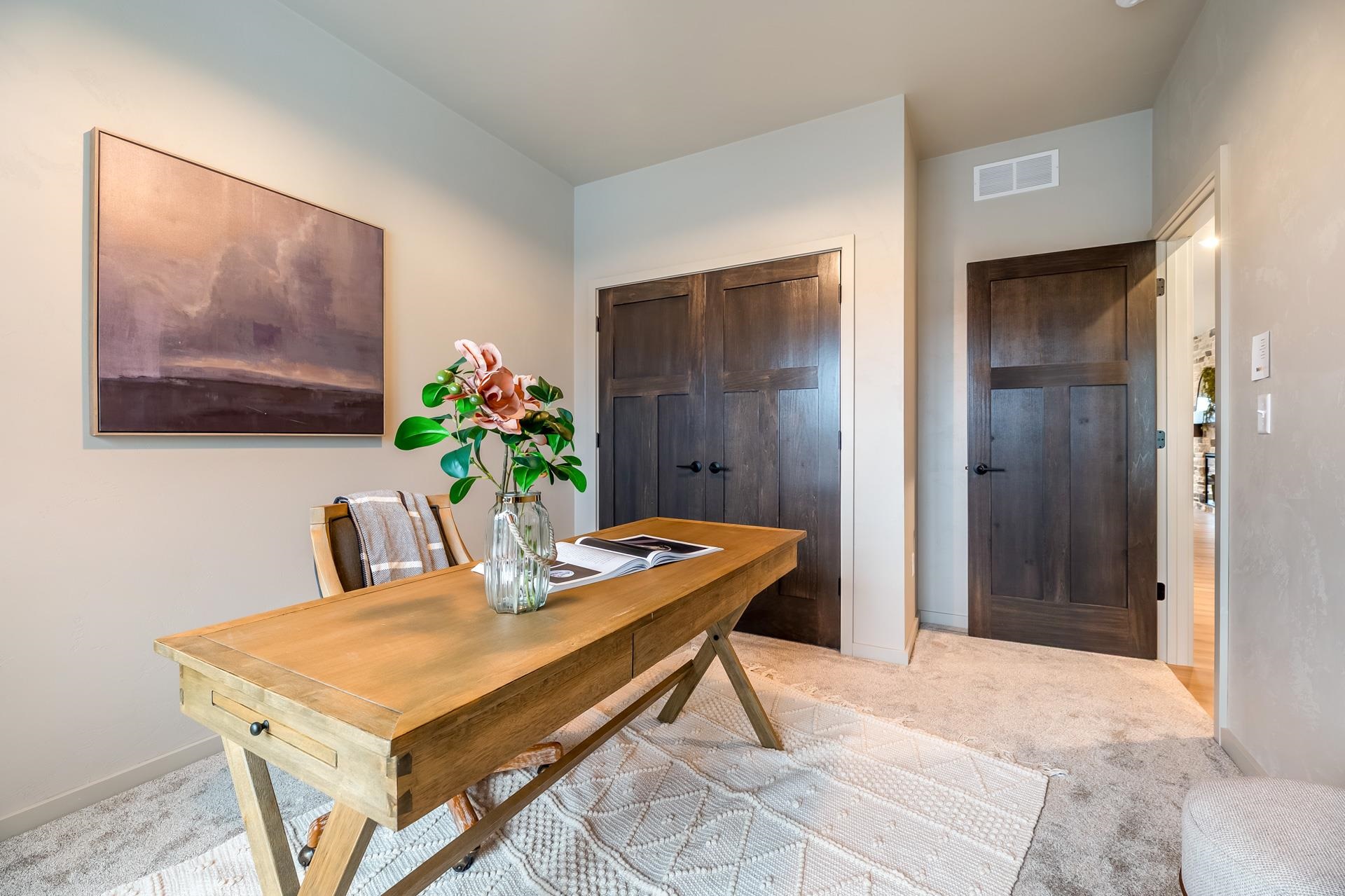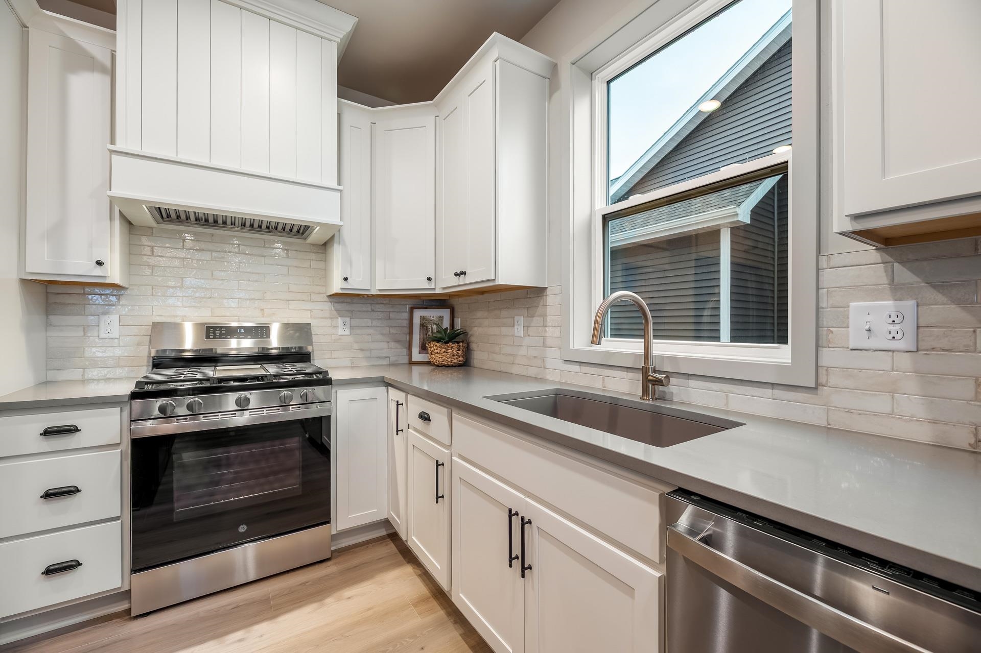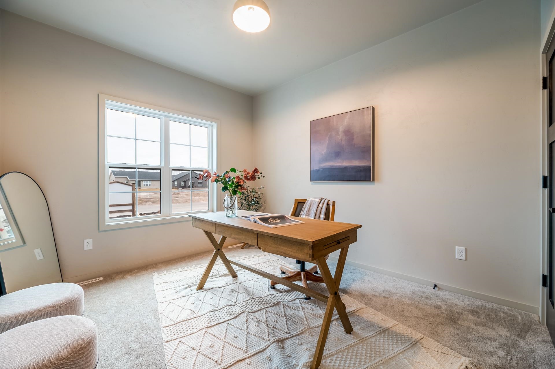 This home features a beautiful combination of soft beige and grey tones. The primary suite offers a standalone tub and clay tile accents. The open-concept interior boasts LVP flooring, premium carpeting, and a 36" electric fireplace with a stone surround. The gourmet kitchen is equipped with Fossil Grey Quartz countertops, white and graphite cabinetry, and GE stainless steel appliances. Built for efficiency, the home includes 2x6 construction, R-50 insulation, high-efficiency HVAC system and heated garage. Smart home features like a Ring doorbell, smart lock, and programmable thermostat are also included. The design is finished with custom trim and paint. Located near Badger Sports Park, extensive trail system, restaurants, shopping and more!