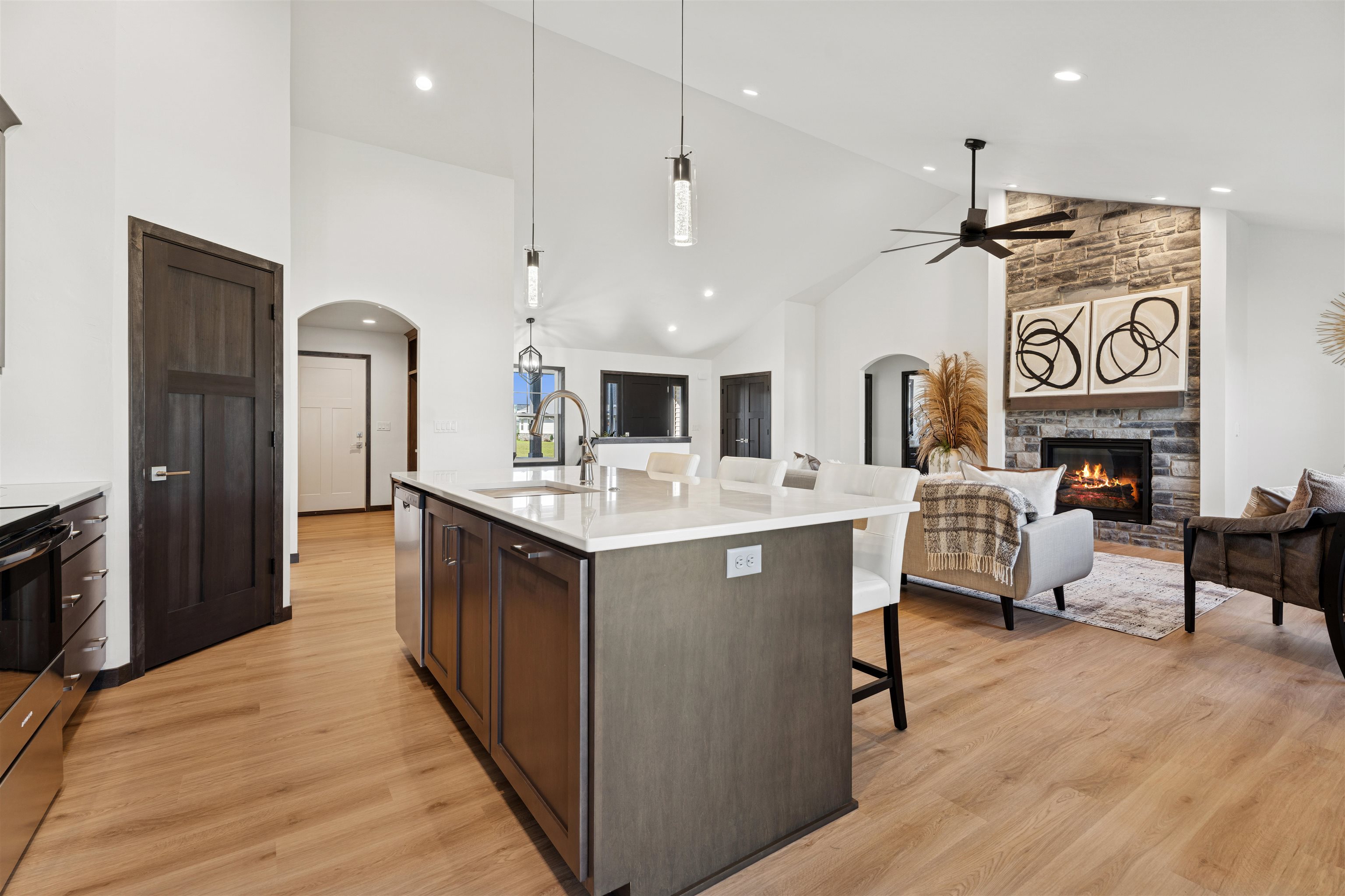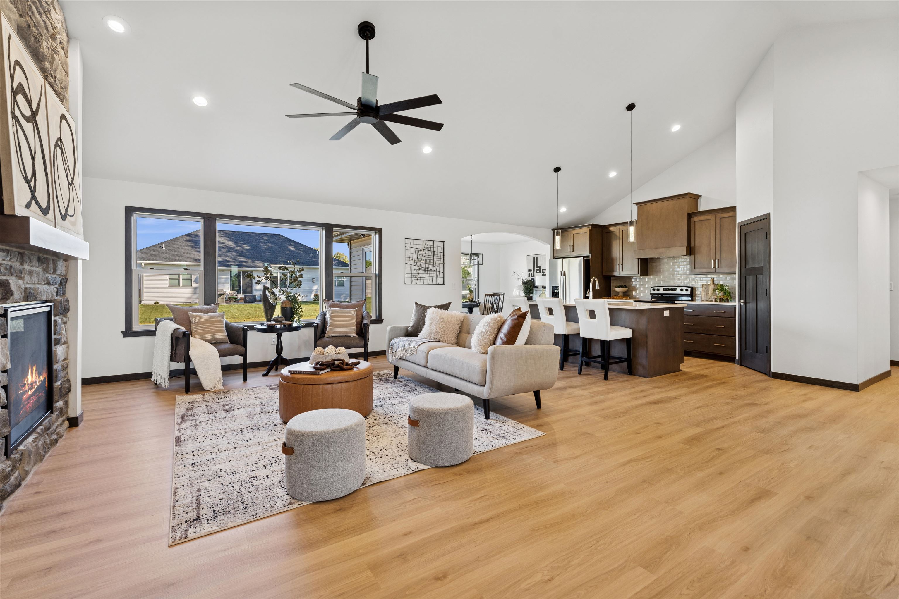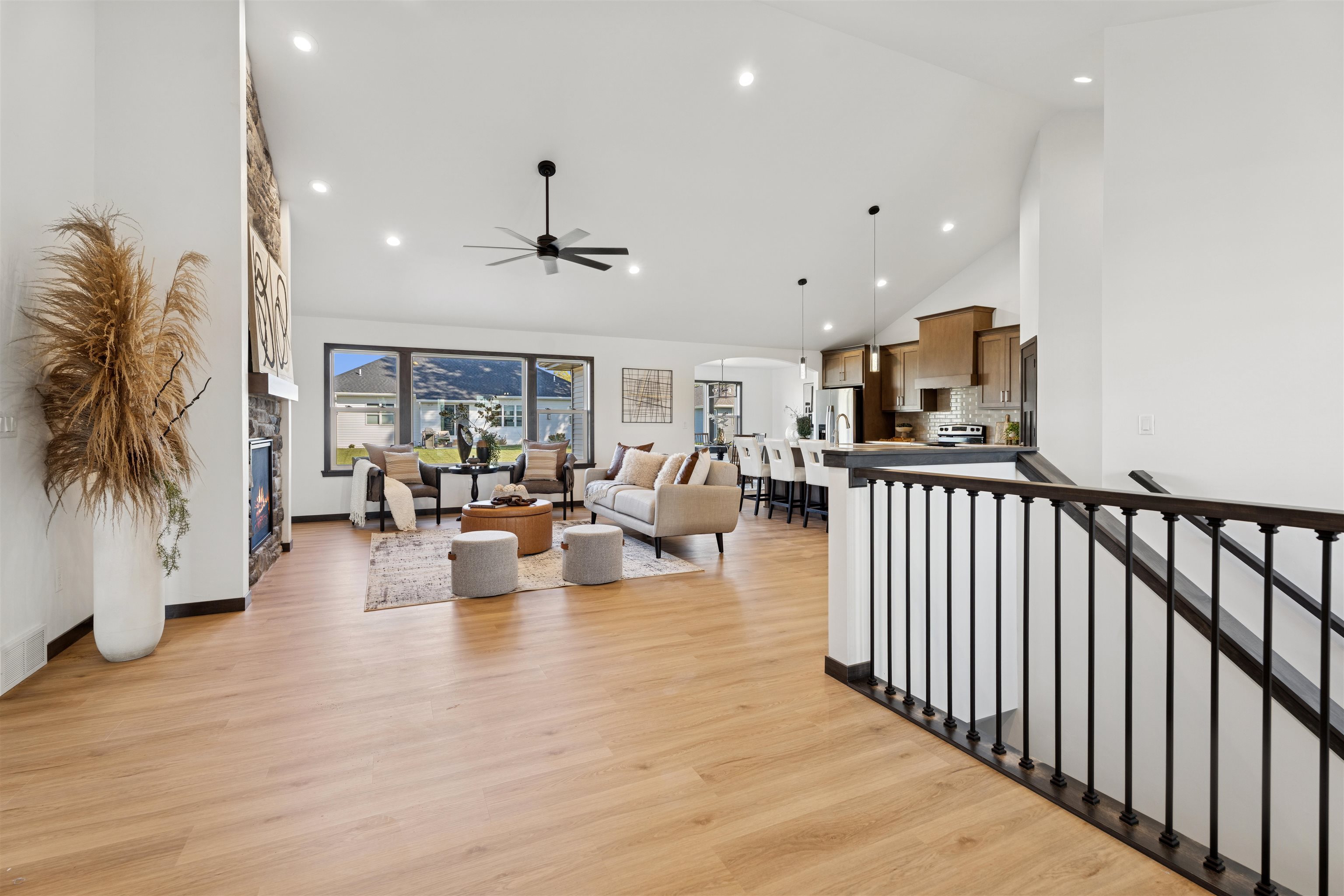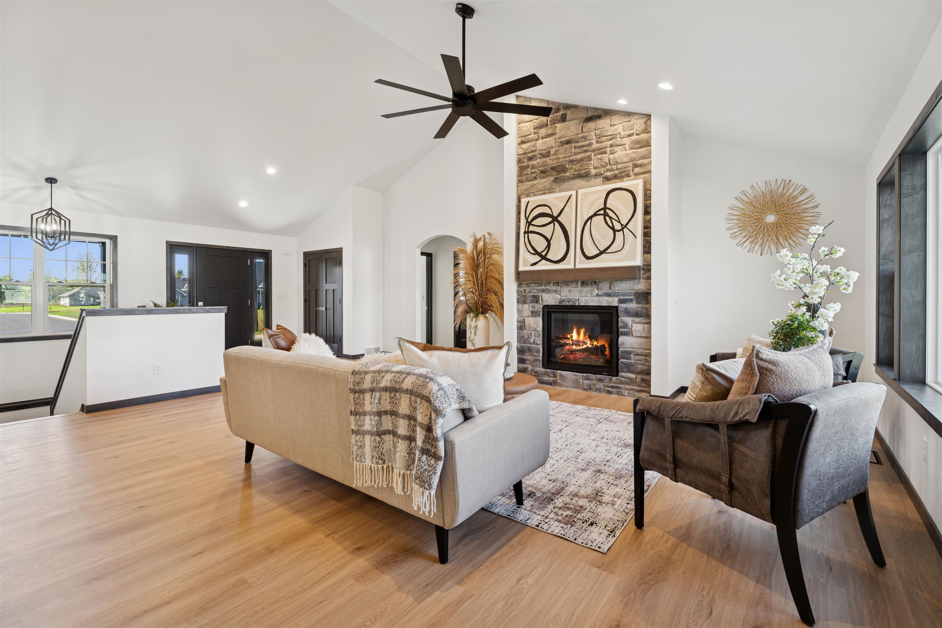 Step into over 2,000 sq ft of beautifully designed living space in this stunning 3 bdrm, 2.5-bath split bdrm ranch. From the inviting stone accents & covered front porch to the spacious, light-filled interior, every detail has been thoughtfully crafted. The open-concept floor plan is ideal for entertaining or relaxing & features: GR w/soaring ceiling & striking FP, kitchen boats tall cabinetry, SS appliances, Quartz counters, center island, tile backsplash & walk-in pantry. Bright DA w/glass door to the patio perfect for indoor-outdoor living, luxurious primary suite w/tray ceiling, spa-like bath w/quartz dual vanity, HUGE tile shower & walk-in closet, FF laundry + ½ bath, lockers, Quartz counters through-out, finished garage w/sink & stub for heater, LL w/2 egress windows & stub for bath.