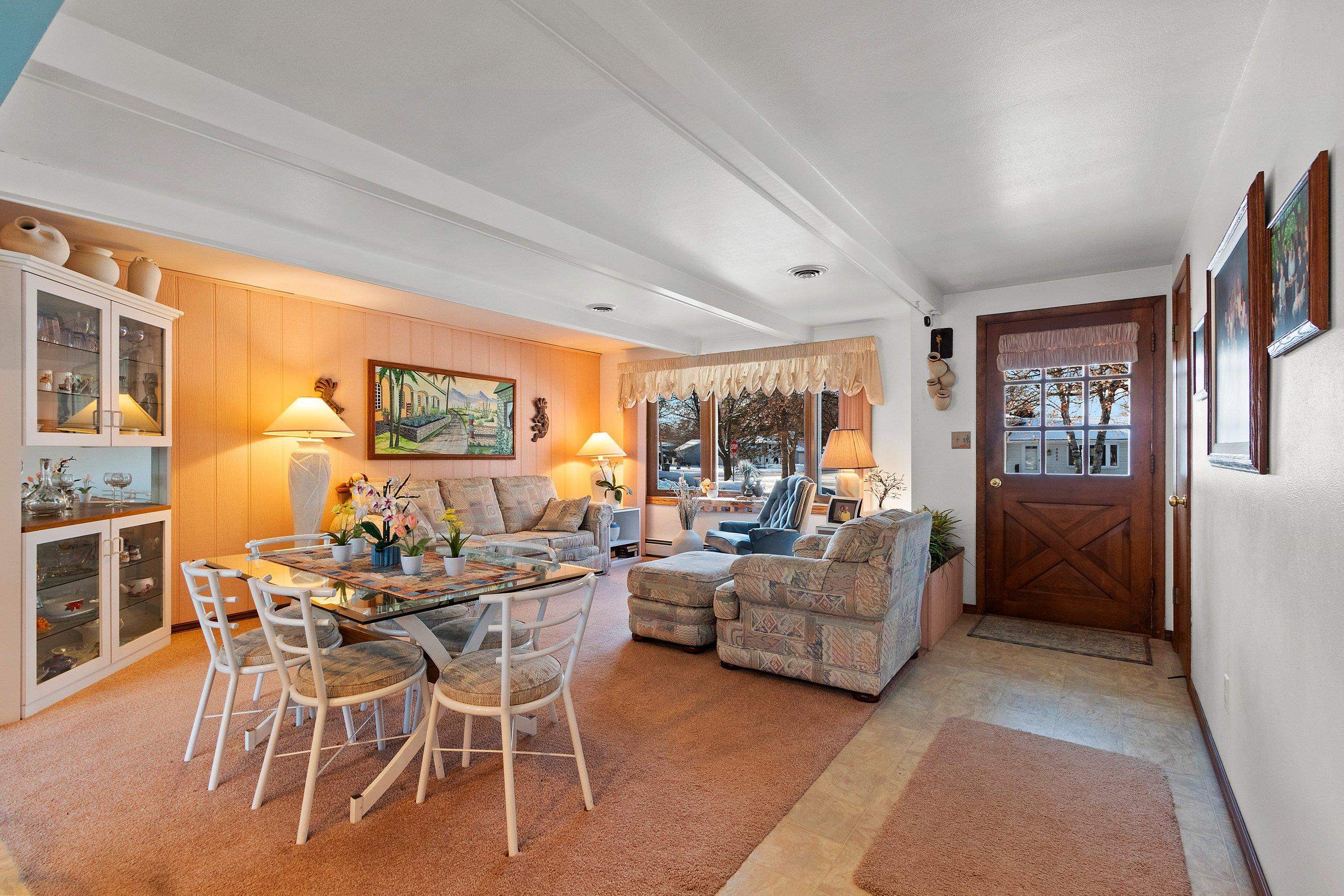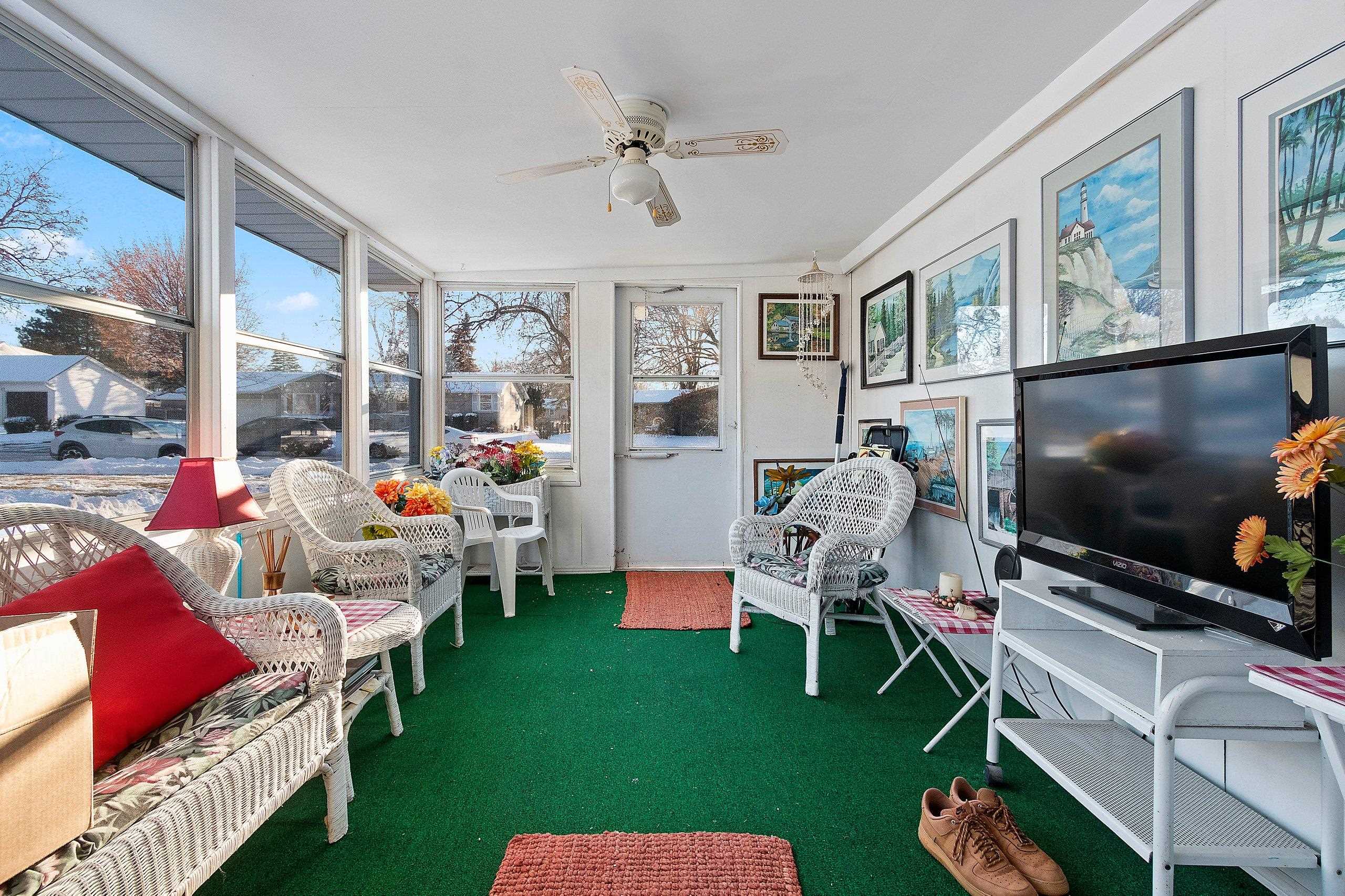 Parking cars for Packer games is not the only enjoyment you'll receive when living just blocks away from Lambeau Field. You'll also enjoy the Park across the street, nearby dining, entertainment & schools. An enclosed porch & flagstone patio within the fenced yard which are used daily. The open-designed floor plan with a beamed ceiling in the living room & kitchen/dinette where there is a center island with seating & the fresh look of white cabinets will make you want to say this feels like home! An open staircase, presently with a chairlift, leading to the timeless themed tiki bar and cozy Family room with wood-burning fireplace in the basement will be enjoyed by all who live & visit here. Roof 3 yr old. Furnace 2022, AC approx 2018