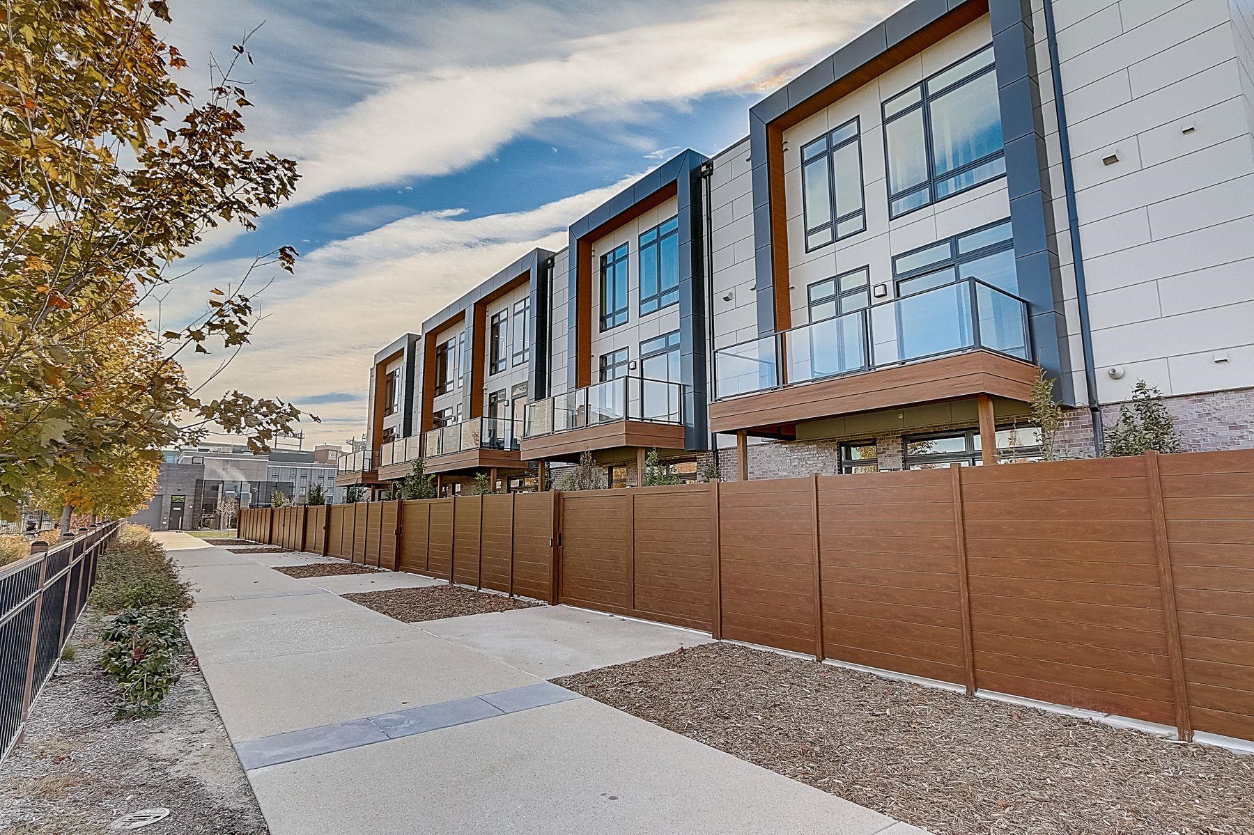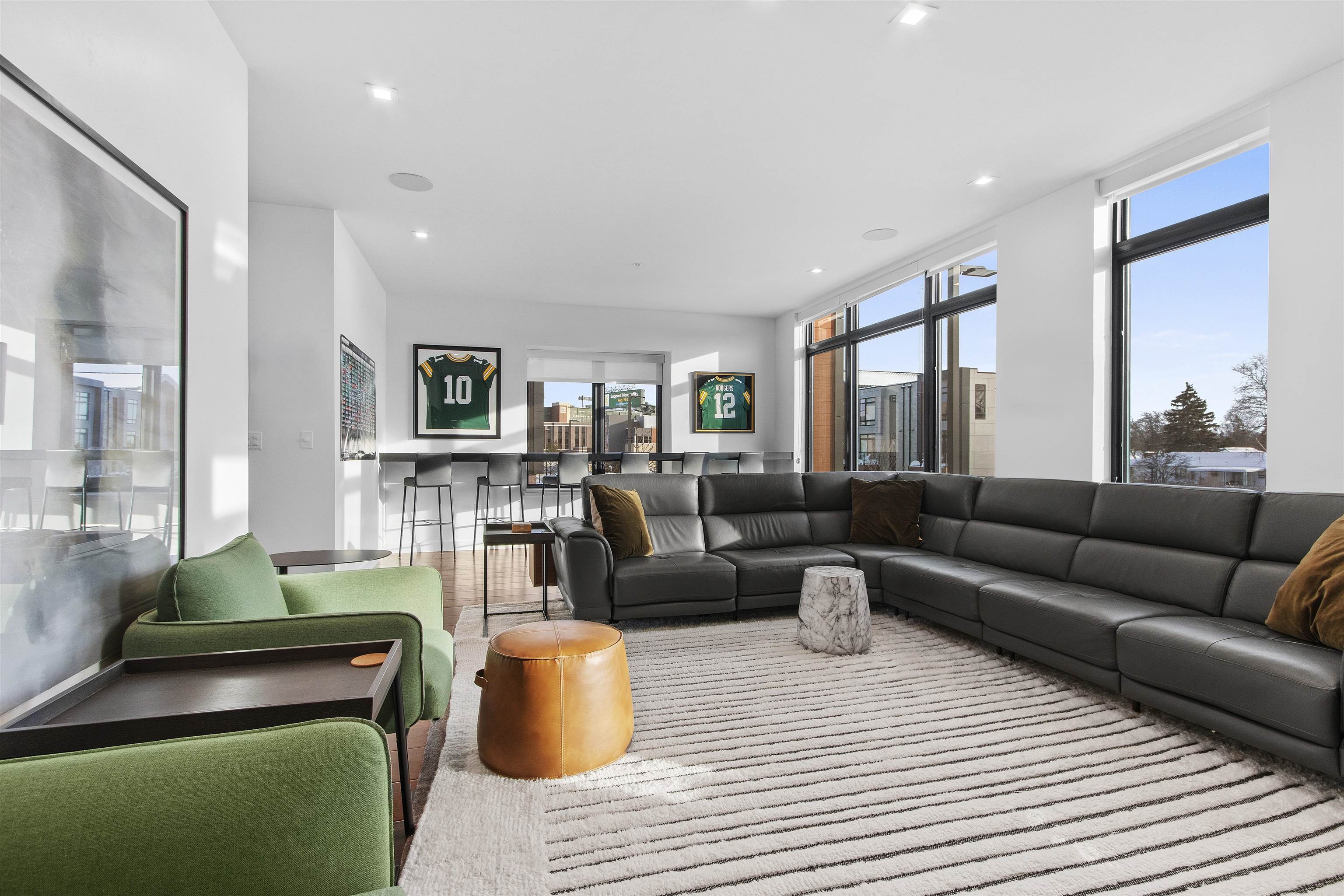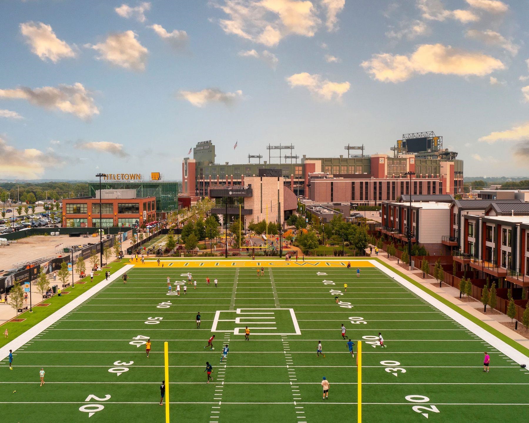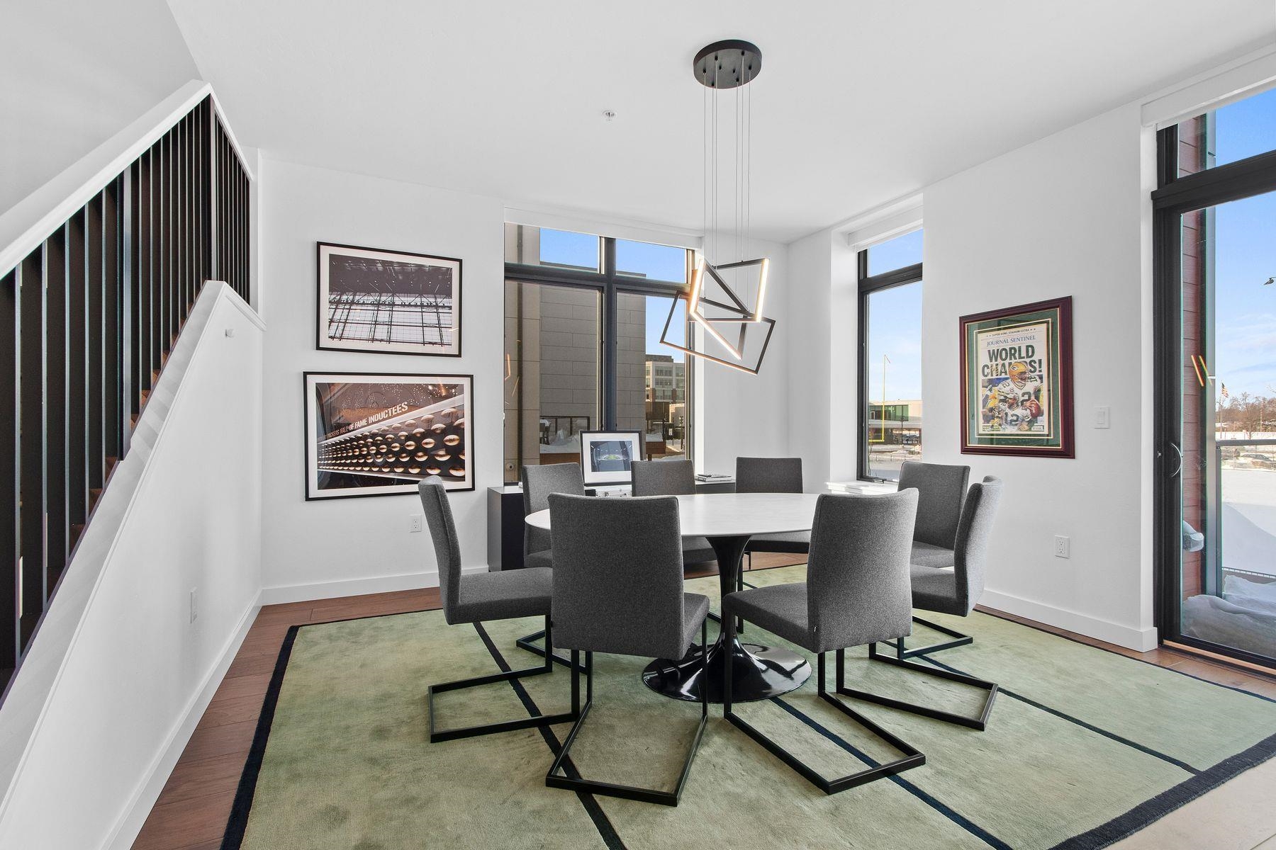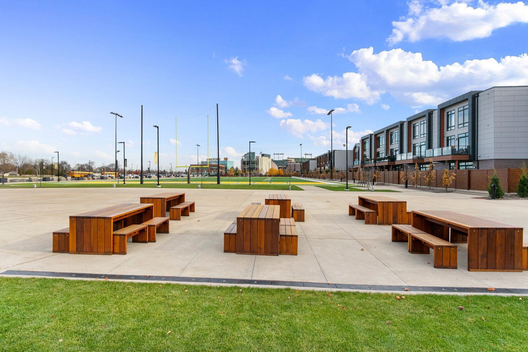 This premier Titletown townhome is a rare corner residence offering the largest private outdoor space, opening directly onto the Titletown field and just steps from Lambeau. Enjoy front-row access to Titletown's vibrant events unfolding right outside your door. Designed for both everyday living and game-day entertaining, this residence is filled with premium upgrades and custom details, including a den/office, Sub-Zero and Wolf appliances, custom millwork, an outdoor firepit, and a heated garage. Expansive floor-to-ceiling windows flood the interiors with natural light, while thoughtfully designed living spaces create a seamless flow. A special opportunity in this sold-out community. Virtual staging.