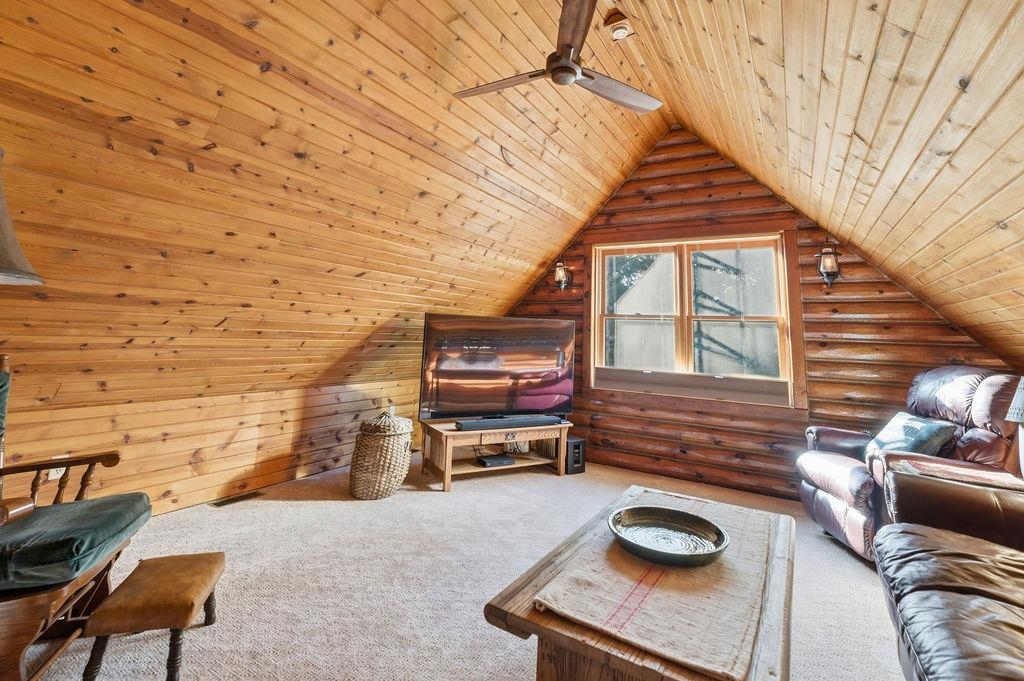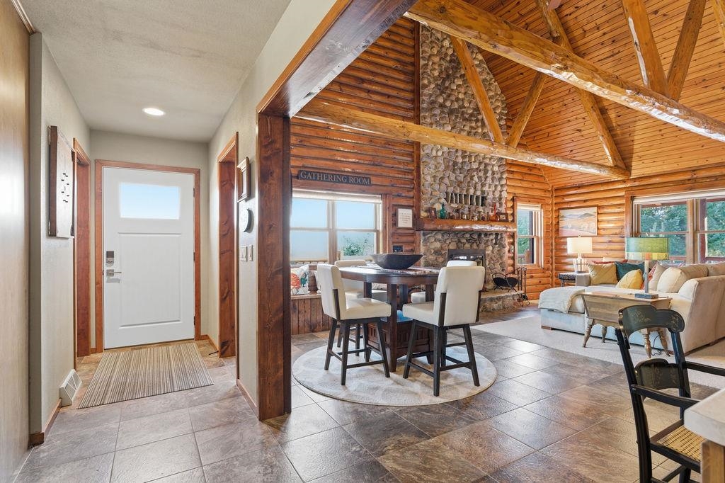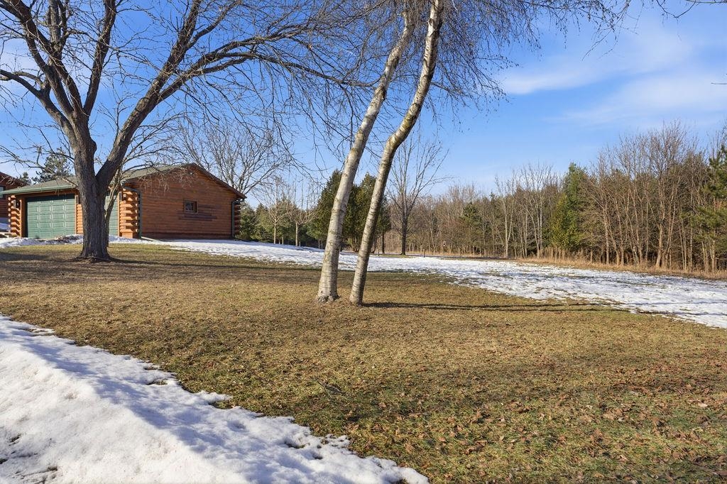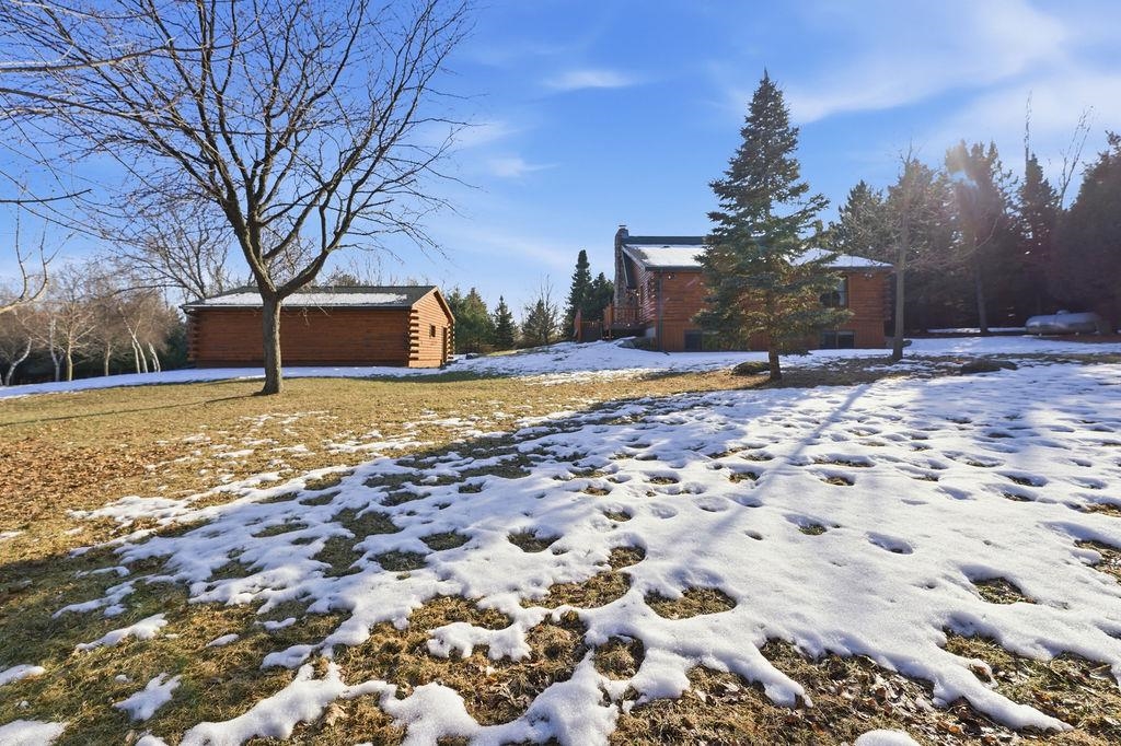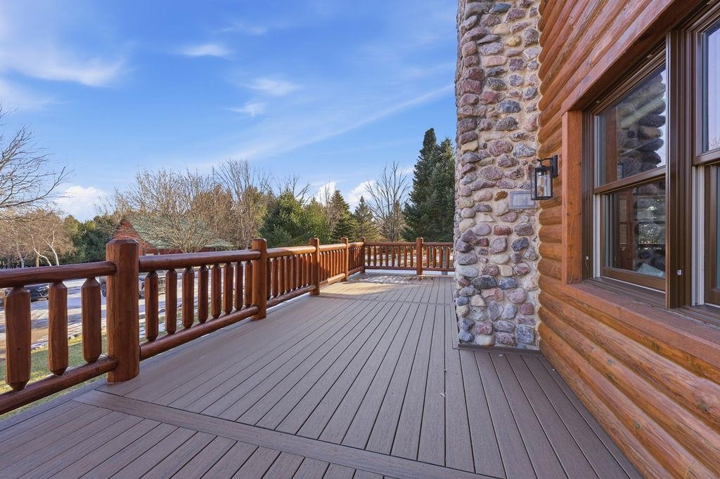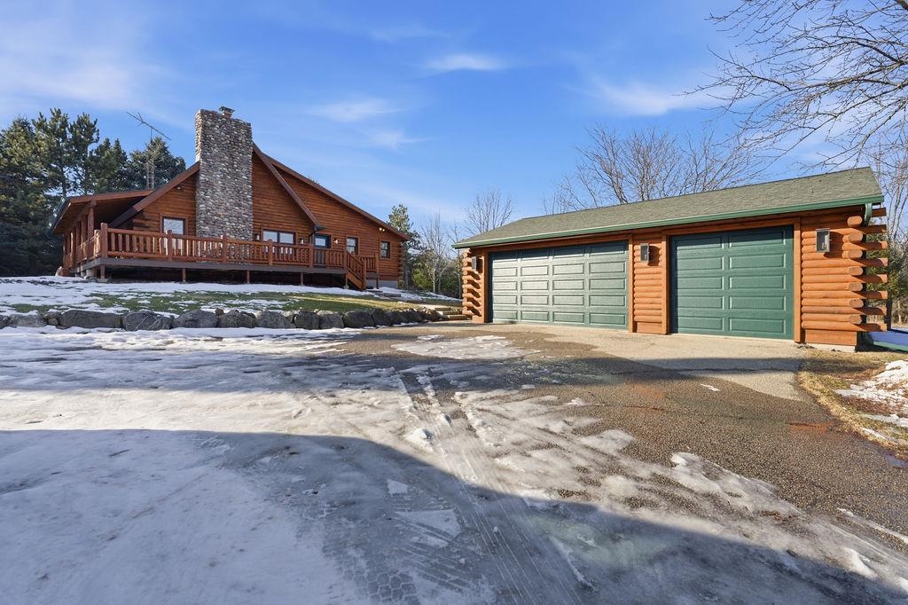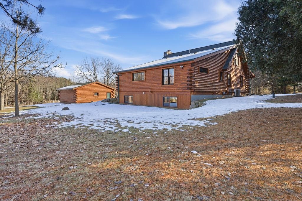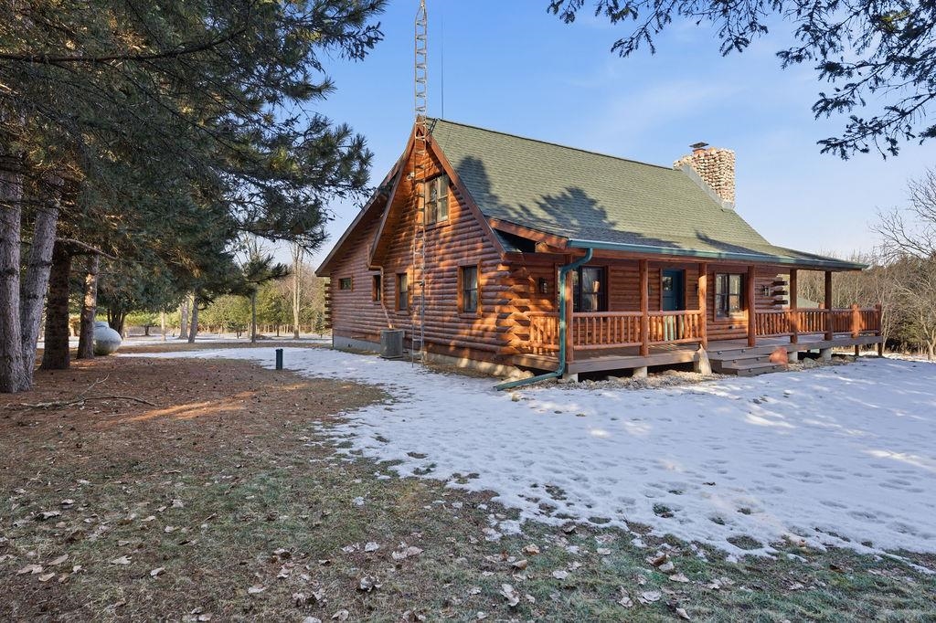 Serenity Awaits! Nestled on 5.22 acres, lies this captivating, 4 Bd/3 BA, Log home that boasts new carpet, some new tile, appliances, shades and more. Renovated main floor bathroom/hand sawn oak vanity, stone sink, walk in marble shower and Quartz counter top.1st floor laundry/mud room.Gazing down from the open relaxing upper loft, notice the living room stunning floor to ceiling wood burning fieldstone fireplace to cozy up around!Open the door to the basement custom stairway that leads to 2 additonal bedrooms with giant storage closets.LL famiy room and another full bath.Sit outside on the wrap around Timbertech maintenace free deck and enjoy the wildlife, including deer, geese,and many species of birds.Large 3 car insulated garage, plus a 26x30 steel building with lean-to.Call now!