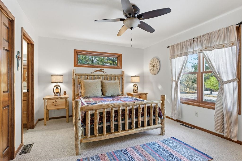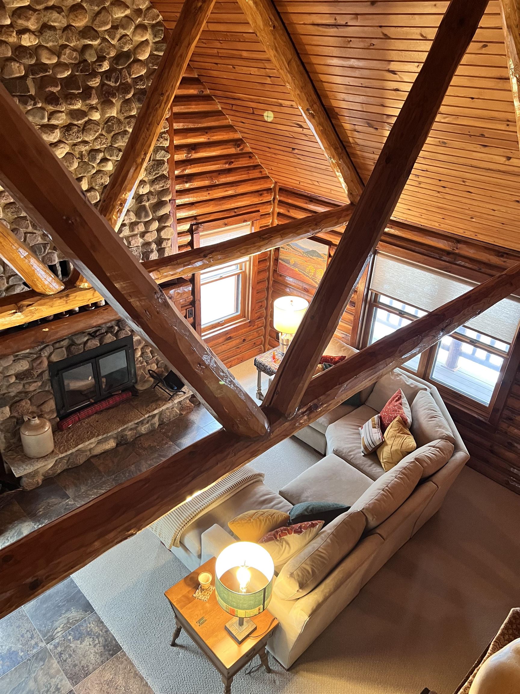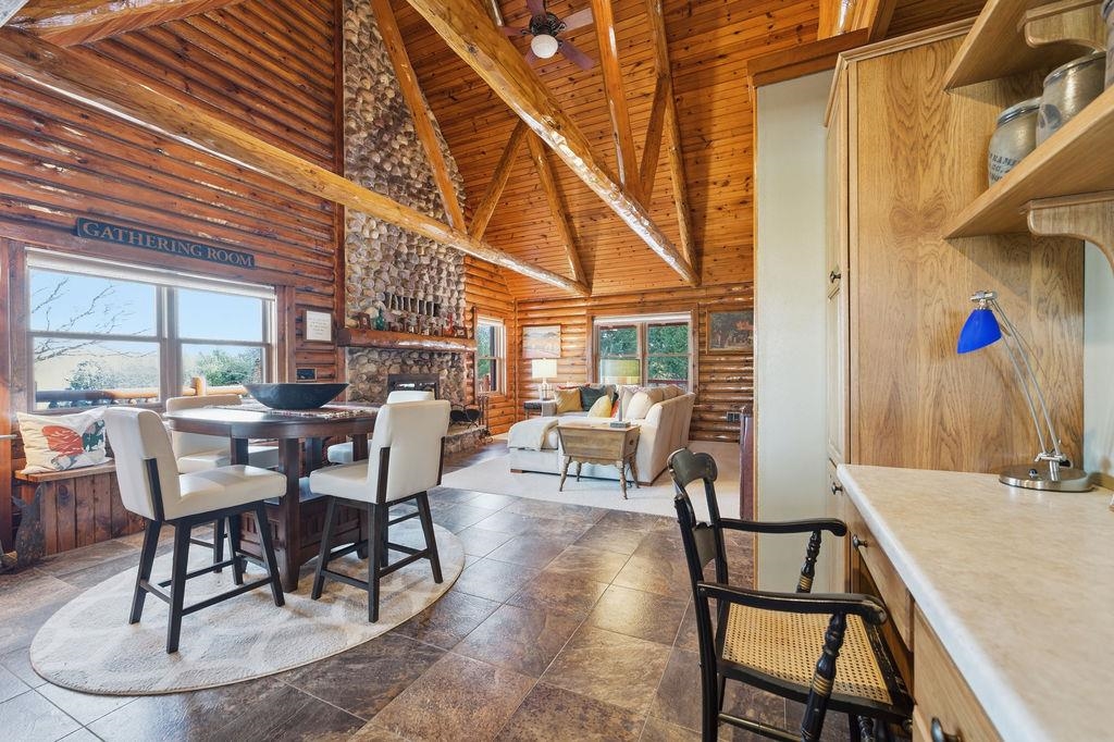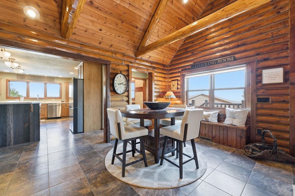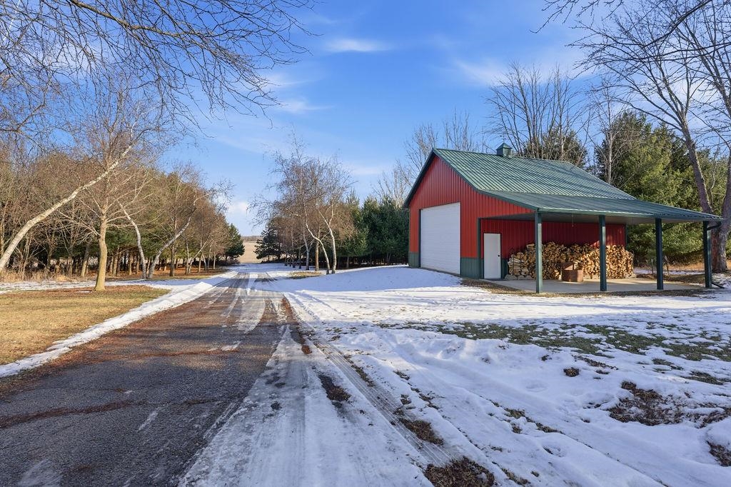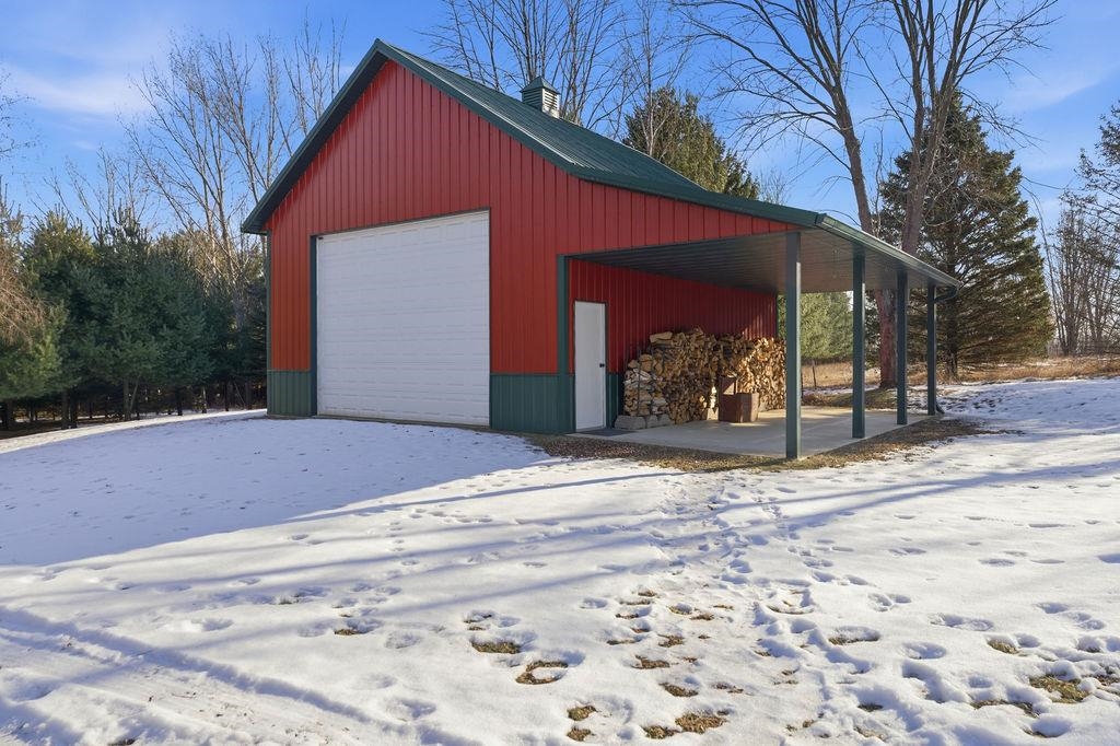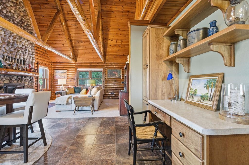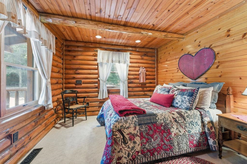 Serenity Awaits! Nestled on 5.22 acres, lies this captivating, 4 Bd/3 BA, Log home that boasts new carpet, some new tile, appliances, shades and more. Renovated main floor bathroom/hand sawn oak vanity, stone sink, walk in marble shower and Quartz counter top.1st floor laundry/mud room.Gazing down from the open relaxing upper loft, notice the living room stunning floor to ceiling wood burning fieldstone fireplace to cozy up around!Open the door to the basement custom stairway that leads to 2 additonal bedrooms with giant storage closets.LL famiy room and another full bath.Sit outside on the wrap around Timbertech maintenace free deck and enjoy the wildlife, including deer, geese,and many species of birds.Large 3 car insulated garage, plus a 26x30 steel building with lean-to.Call now!