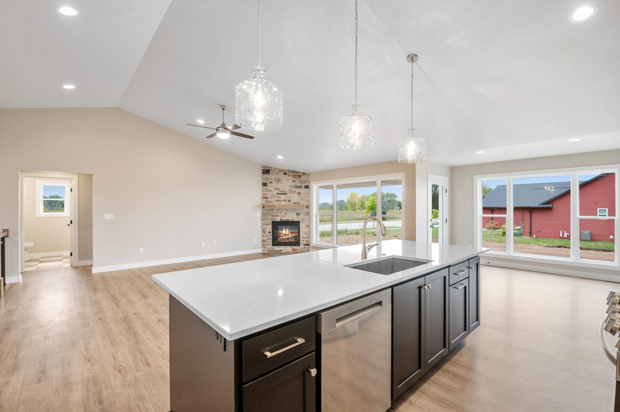 Welcome to the beautifully designed Oakdale Model! Step inside to an open concept layout filled with natural light, highlighted by large windows, a cozy gas fireplace, and a designated dining area that flows seamlessly into the living space. The spacious kitchen boasts high-end finishes including quartz countertops, a sleek tile backsplash, and a generous 6x8 walk-in pantry ideal for storage. Thoughtfully designed with a split-bedroom layout, this home includes a convenient locker system, laundry room, and a half bath with direct access to the oversized 3-stall garage. The luxurious primary suite features custom tile shower and walk-in closet. The lower level is prepped for future expansion with plumbing for a full bath and an egress window. 12x12 composite deck included!