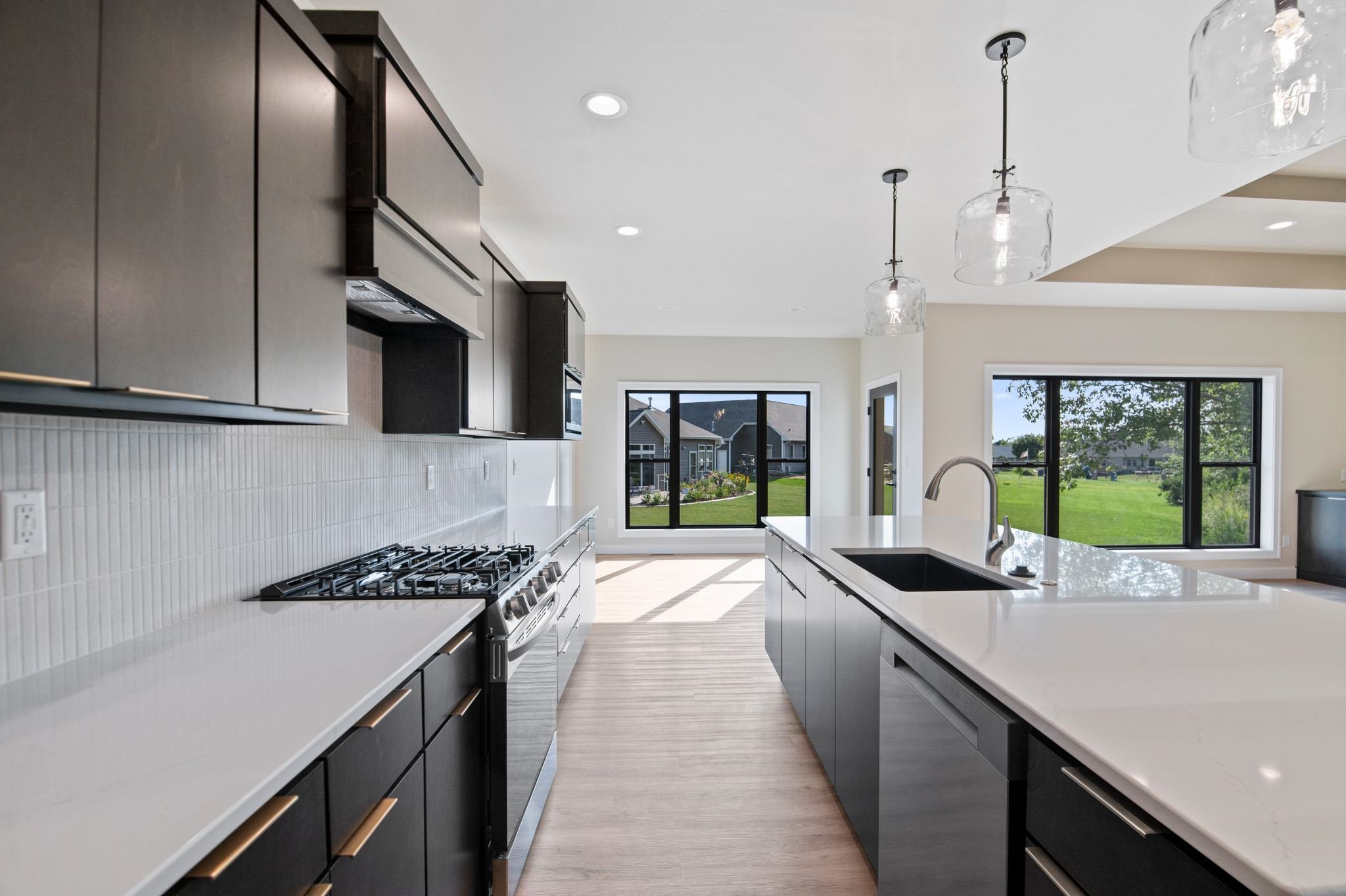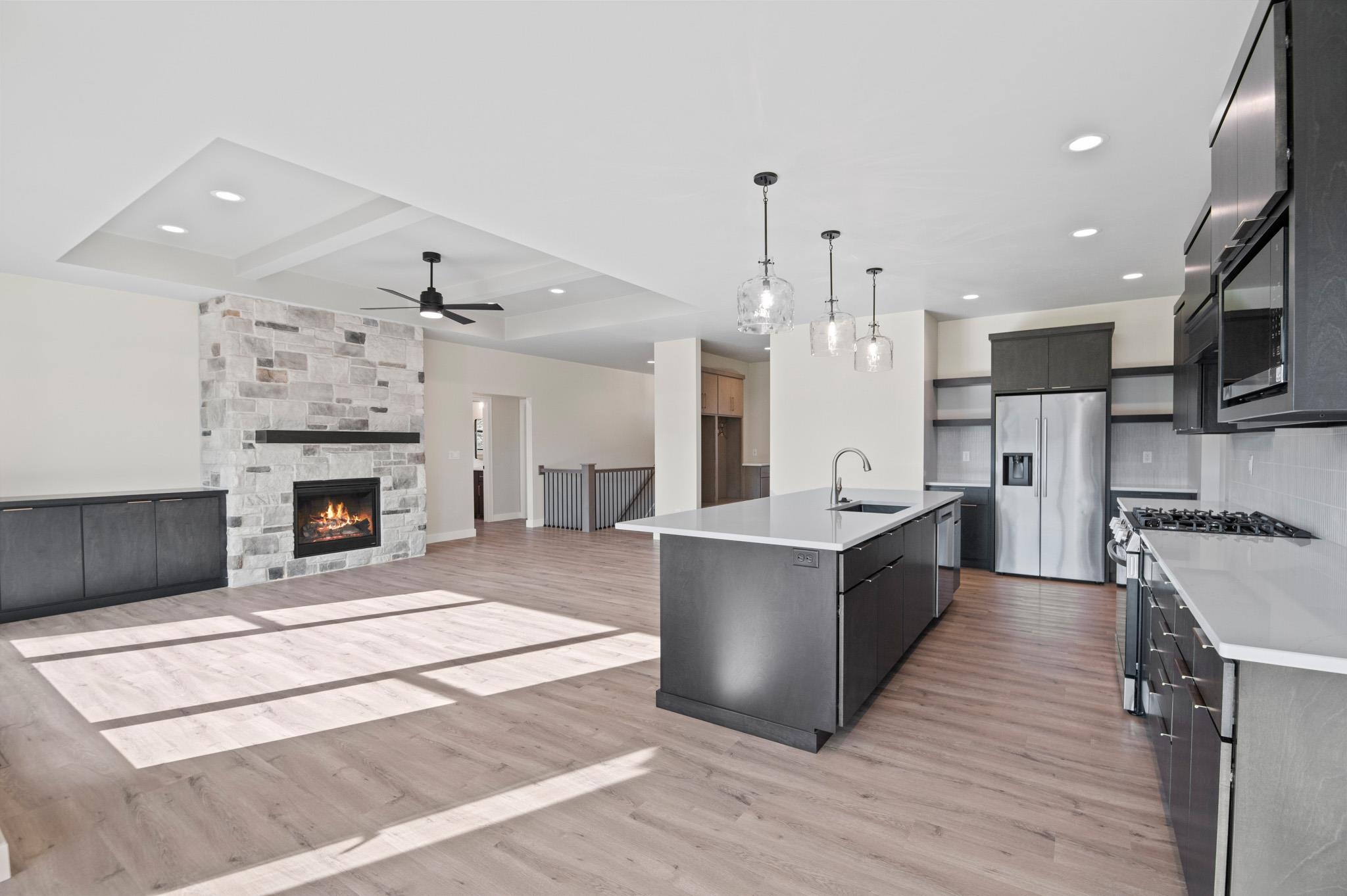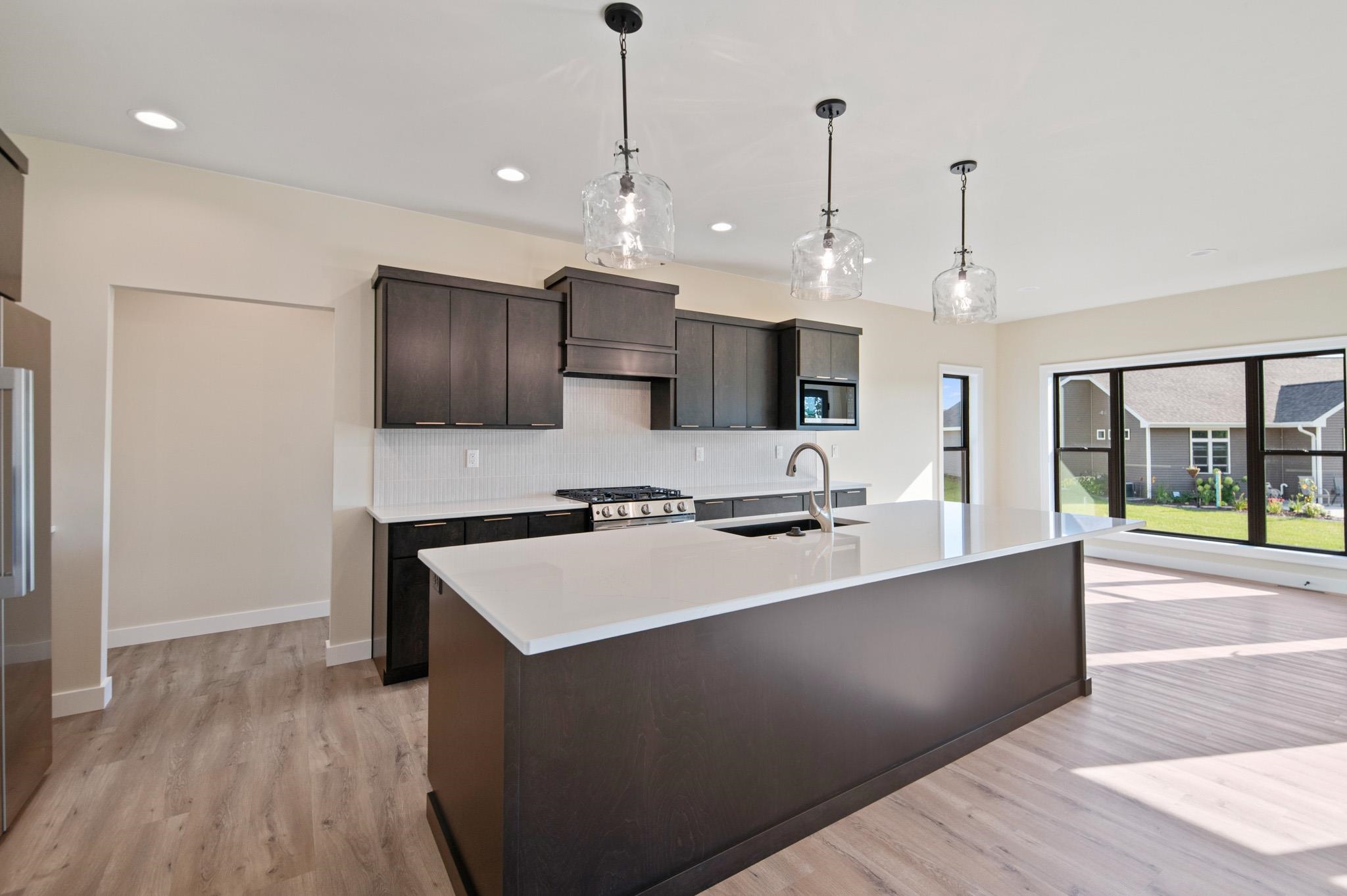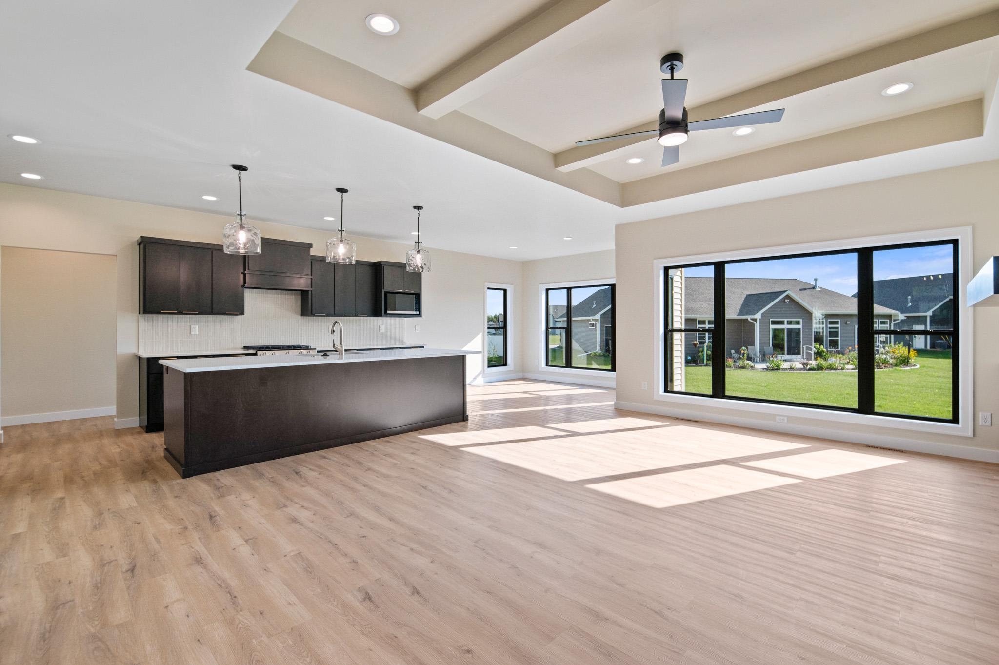 Beautiful Oakdale Model has all the amenities you are looking for! Bonus room above garage AND stairs from garage to basement. This open concept home welcomes you with its custom beamed ceiling, floor to ceiling windows, gas fireplace and a designated dining area integrated into the open concept. Spacious kitchen with high quality finishing touches including a large walk-in pantry, quartz countertops & tile backsplash. This home features a split bedroom plan, mudroom, separate laundry room & 1/2 bath with access to extra large, finished 3-stall garage. Primary ensuite includes custom tile shower & access to a large walk-in closet. Also features an amazing finished bonus room over the garage!