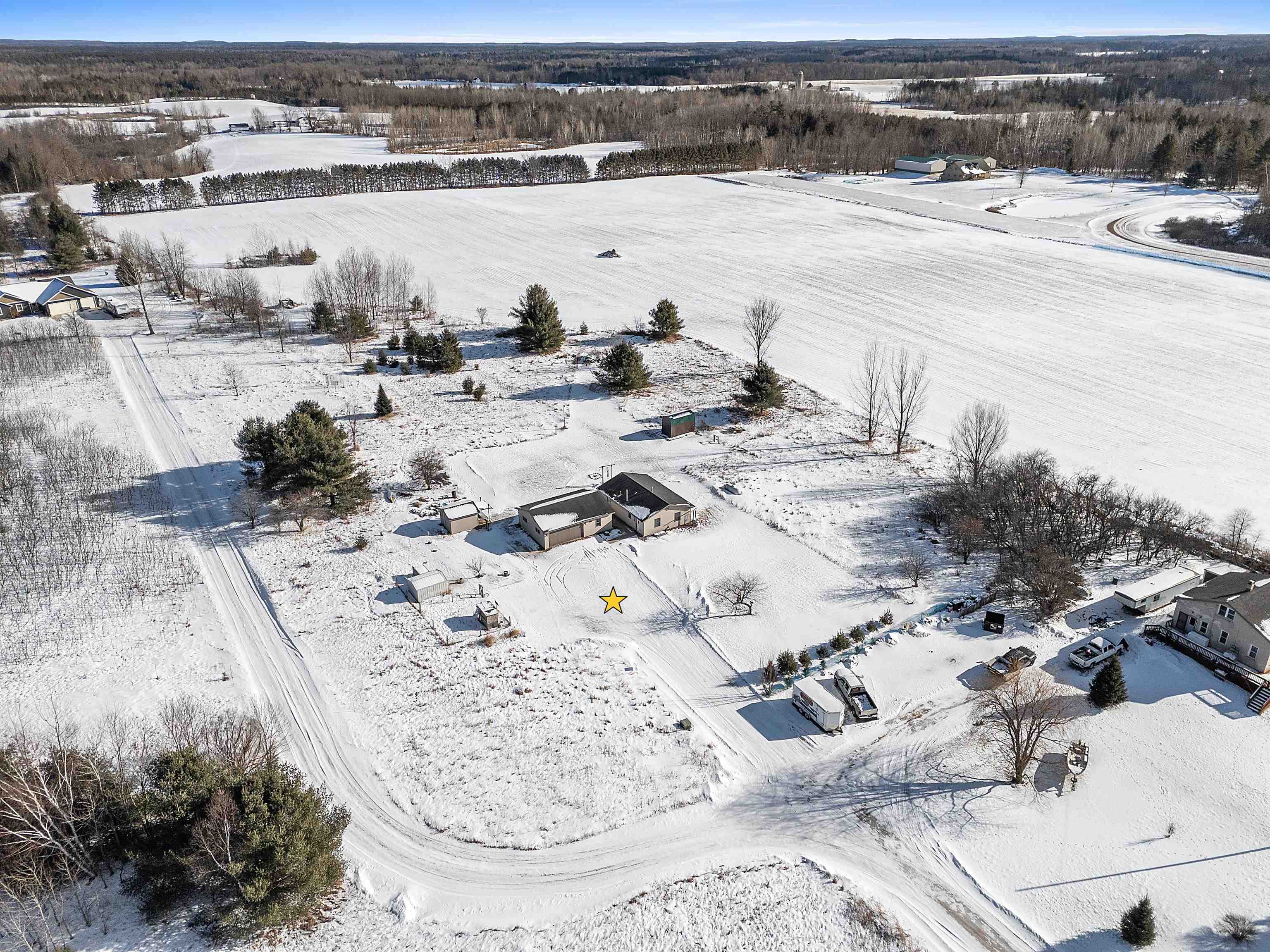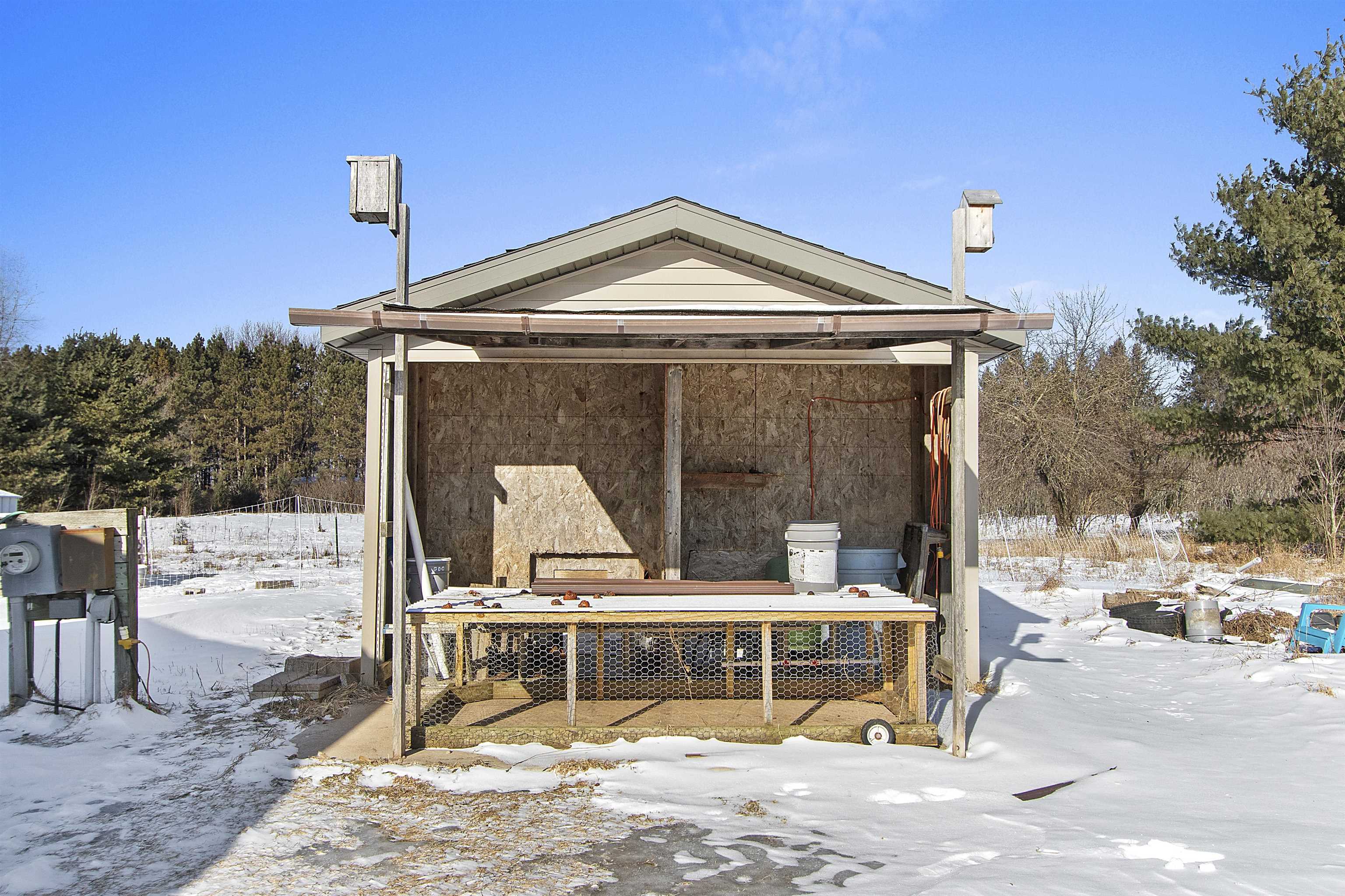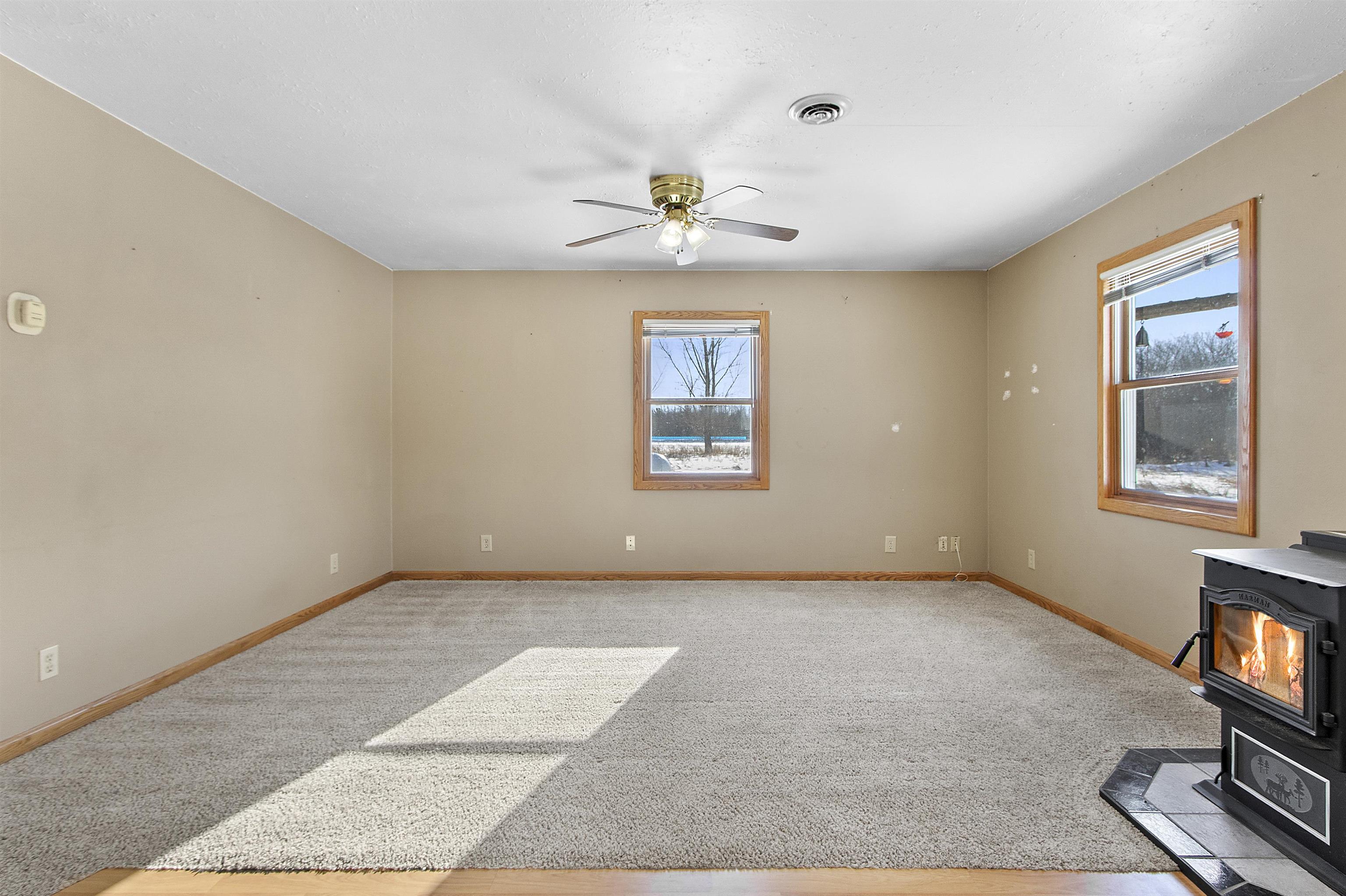Close to trails and lakes is where you'll find this gem. Two-bedroom home on 2.53 acres with a 2.5 stall (32X24) garage. Rural residential zoning allows for some farm animals such as goats and chickens. Set back off the road for a more private setting. Anderson Lake and the Oconto County Trail System is just up the road. Plenty of space to park the snowmobile trailers or to build a pole shed for storing them. Open concept, forced air heating and a pellet stove. The back bedroom has patio doors leading out to the back patio.