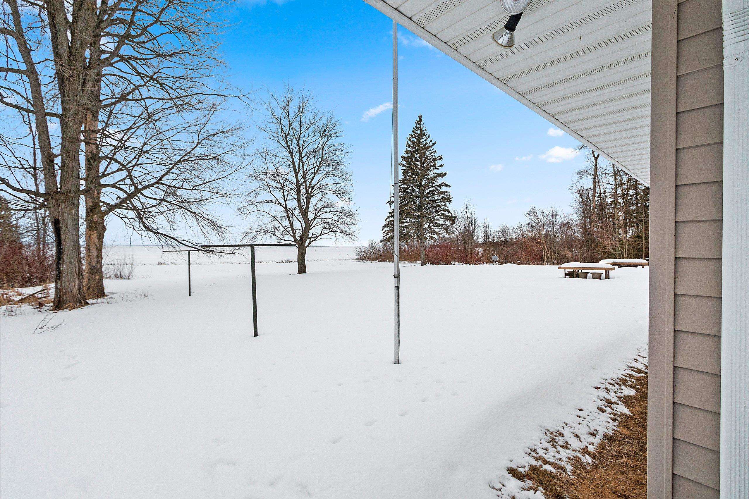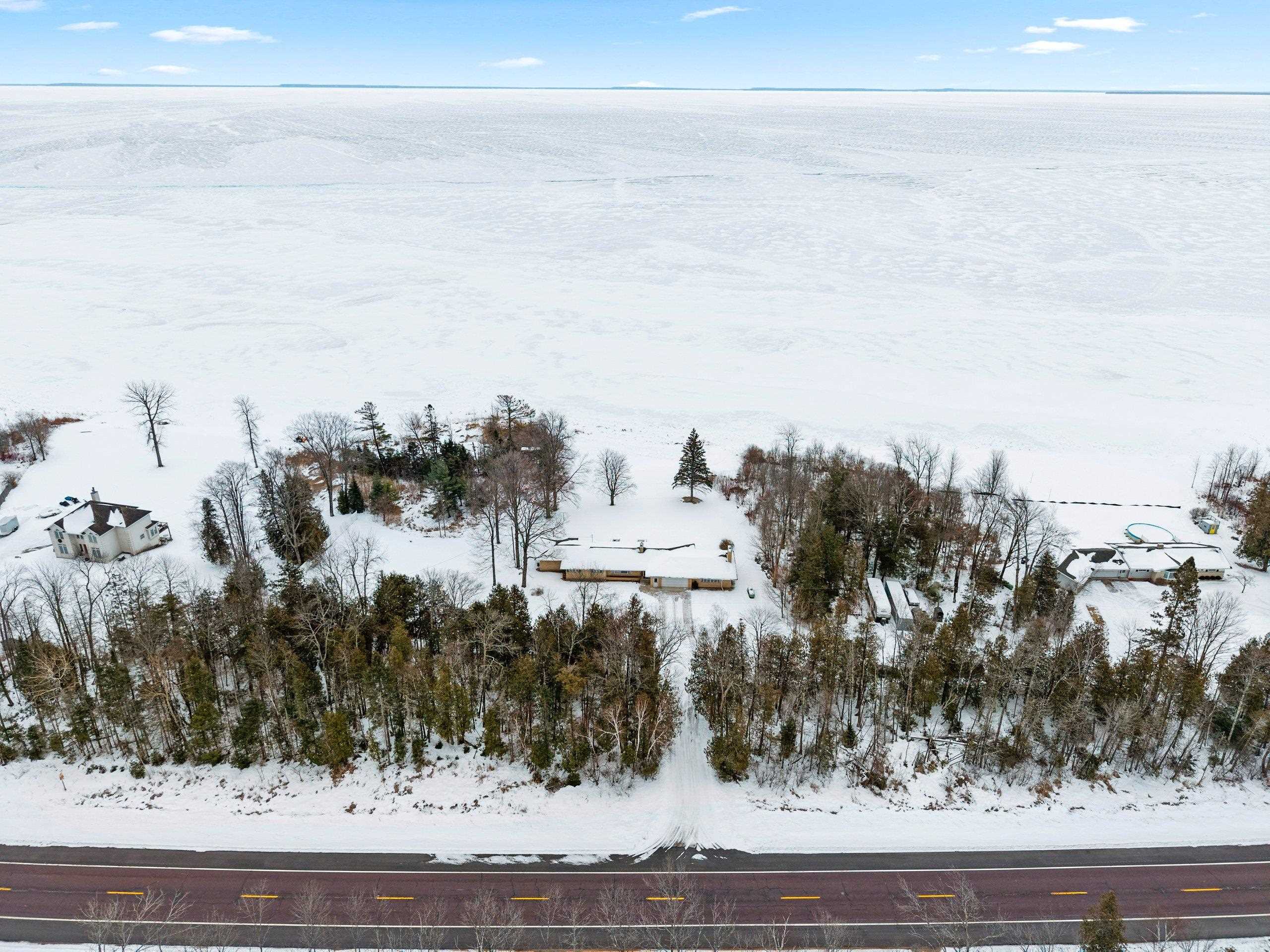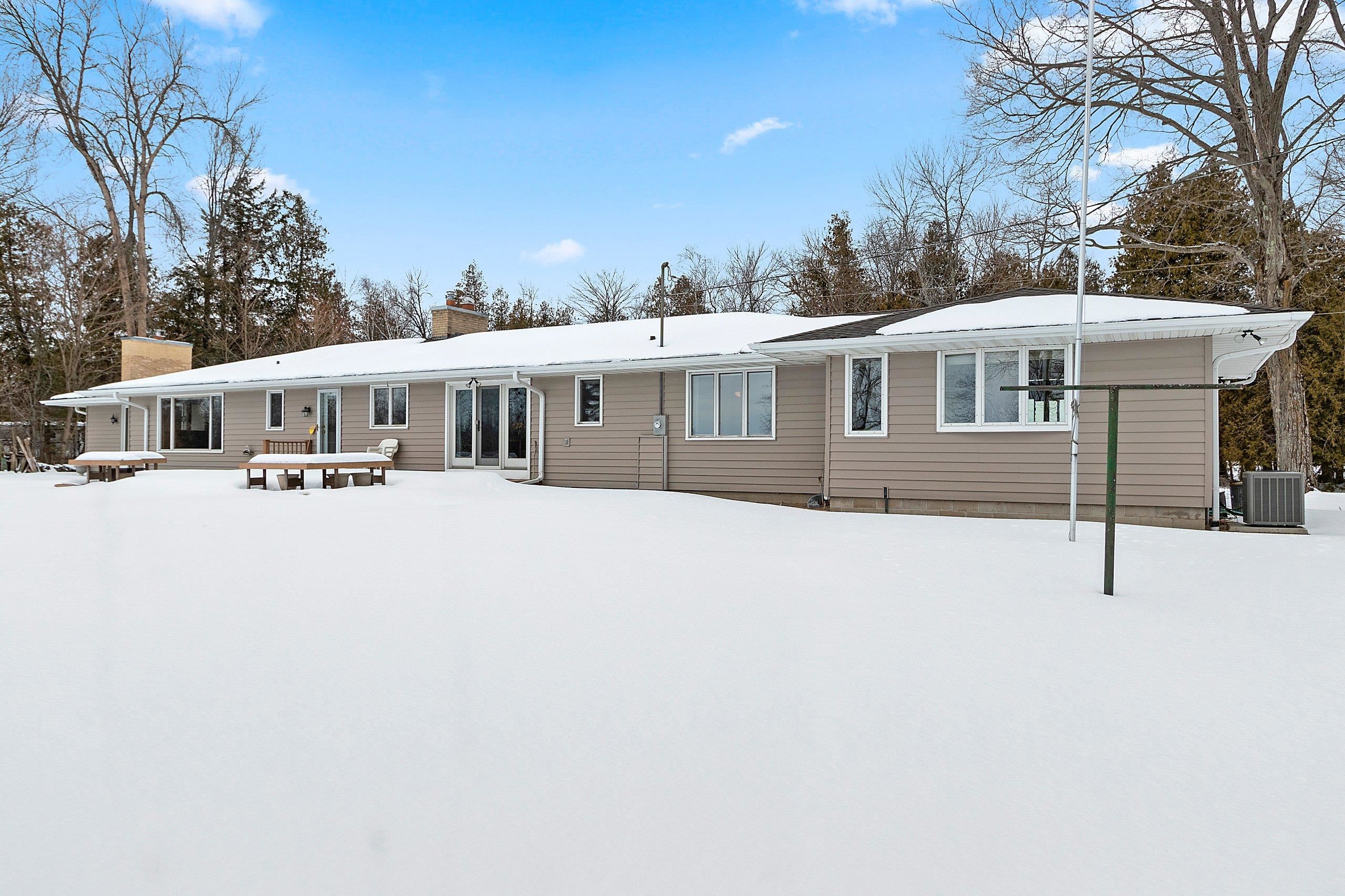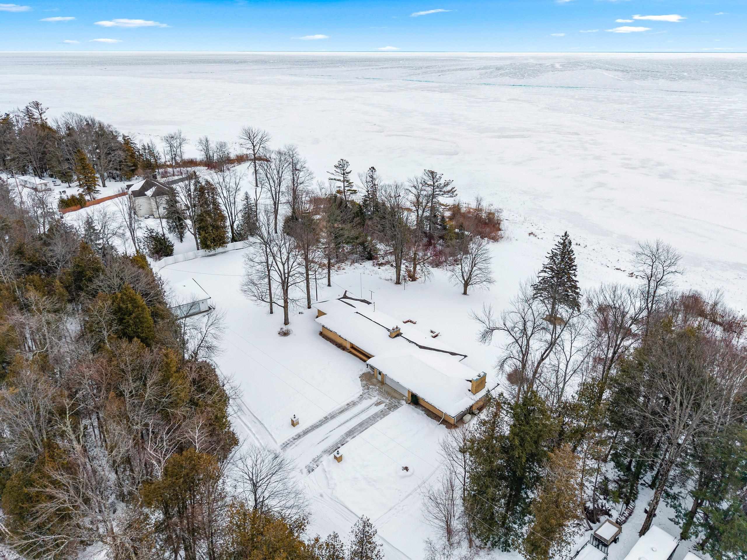 Spacious 2+ bed, 2.5 bath ranch offering approx. 2,600 sq ft on 3 acres with 290 feet of Green Bay frontage. Tucked back from the road for added privacy, this professionally maintained property features stunning water views, a large primary suite with soaking tub, dual vanities, and walk-in closet, plus both living and family rooms with fireplaces and a dedicated library/office. The family room offers flexibility to add additional bedrooms if needed. Beautiful kitchen cabinetry w/granite countertops and a back deck with beautiful views of the bay. Partial basement with dyke system, new mound septic (2023), roof replaced (2019), Generac backup generator, attached 2-car garage and additional detached 2-car garage. Conveniently located near Cedar River Marina, campgrounds, and recreation.