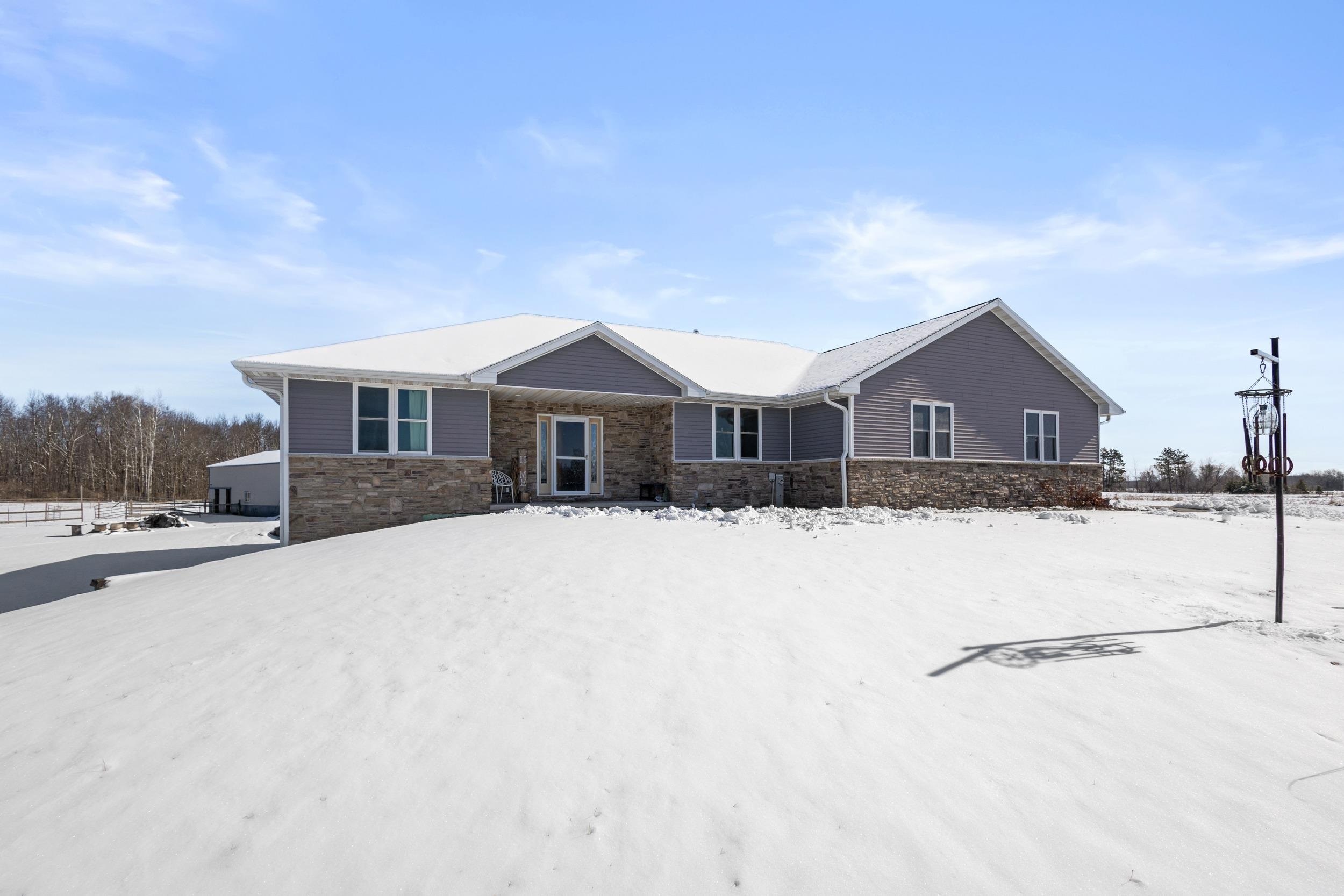 This custom-built 5 bed, 3.5 bath ranch sits on 10 beautiful acres in Pulaski, offering craftsmanship, comfort, and true Wisconsin living. The main level features fresh paint, updated lighting, a home office, first-floor laundry, and a kitchen with custom hickory cabinetry & generous storage. The great room overlooks open countryside and the primary suite includes tray ceilings and dual walk-in closets. The finished lower level adds a family room & game room (exposed floor joists), garage access, plus a safe room and root cellar. The attached garage is insulated and freshly painted. Outside, enjoy a 36x72 pole barn, two stables, fenced-in pastures, and a private pond with aeration and pier. Hunt deer right on your own land and enjoy wide-open space built for work, recreation, and privacy.