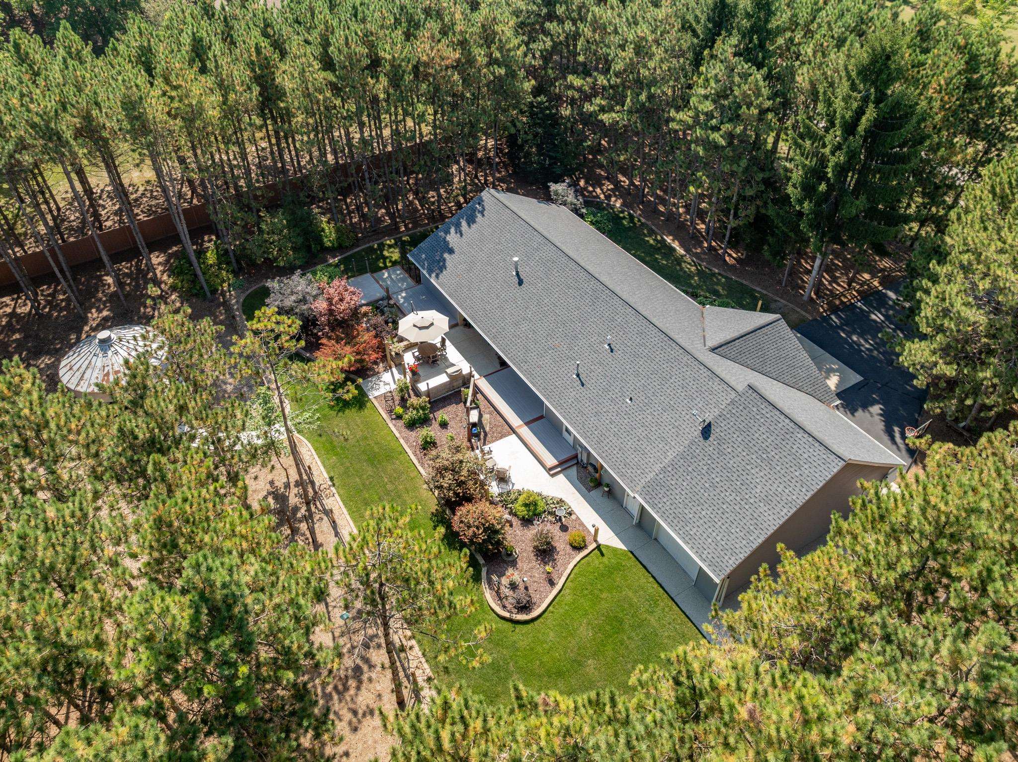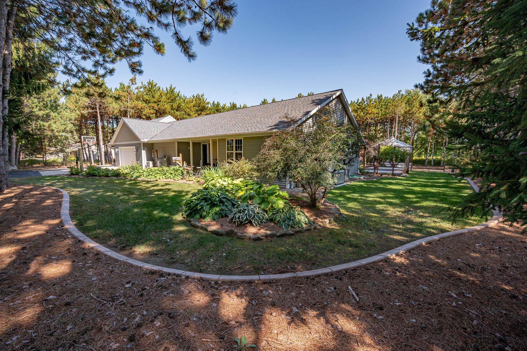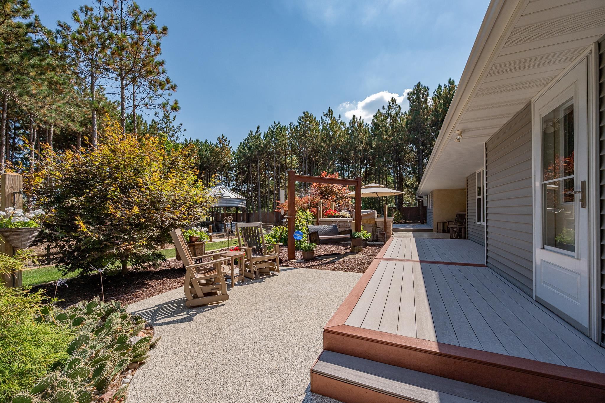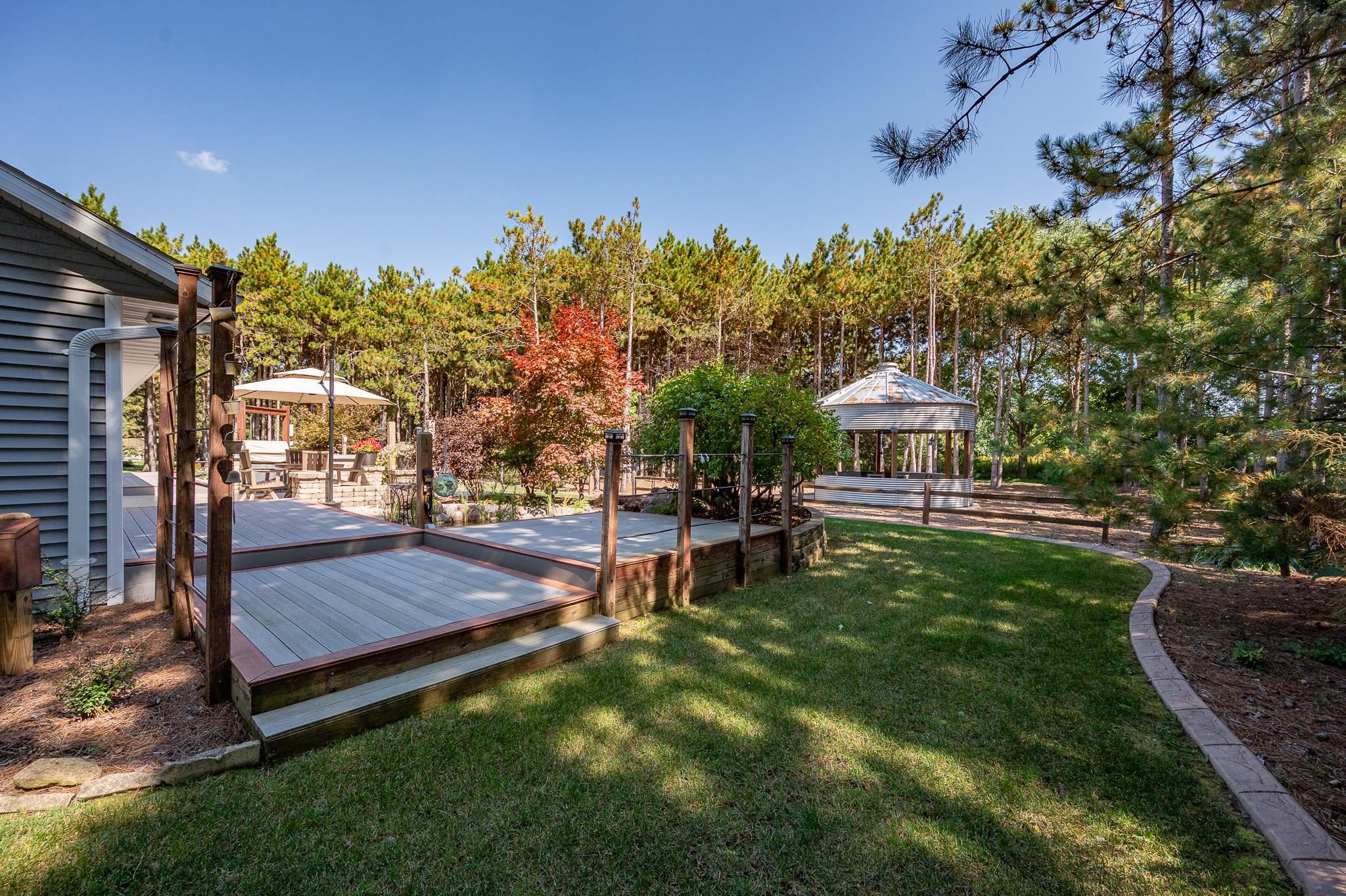 Set on 1.5 wooded acres in Sobieski, this home offers a private, thoughtfully designed setting. Vaulted ceilings and a gas fireplace anchor the main living space, while the kitchen features granite countertops, a large walk in pantry, island seating, and full size fridge and freezer. The primary suite includes heated tile floors, dual sinks, tiled walk in shower and jetted tub. The finished lower level adds a theatre room with raised seating, bedroom and full bath. Outside, a multi level patio and Trex decking create distinct gathering spaces, from the built in grill and covered seating area to the decorative pond with waterfall and silo style gazebo set among the trees. Recent updates include furnace, AC, a whole house generator and garage addition.