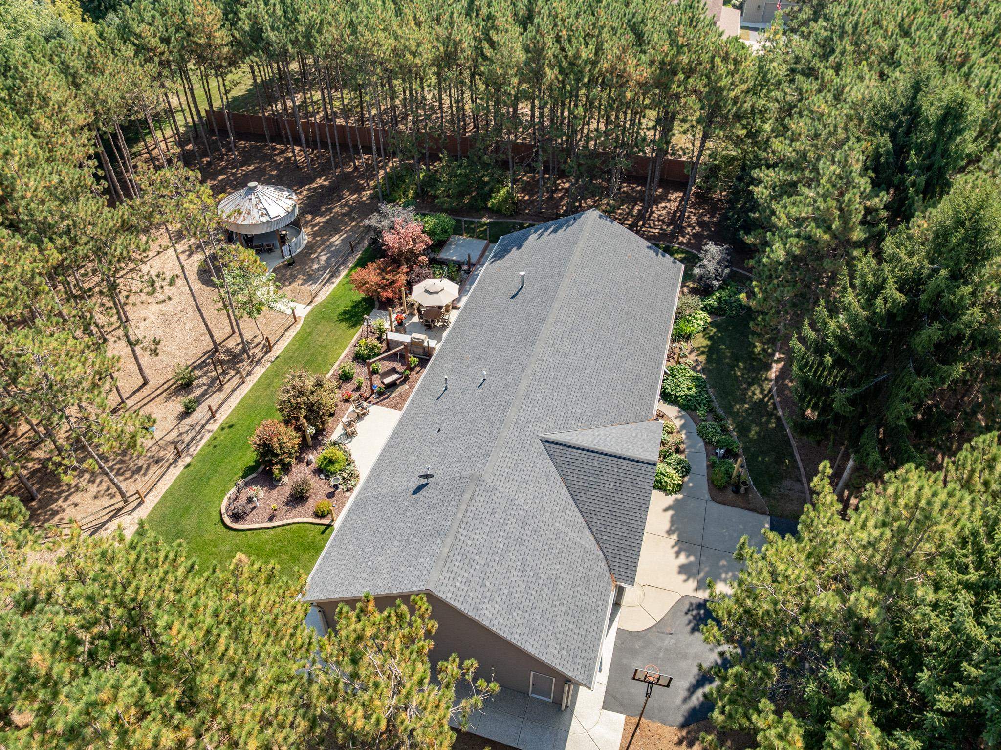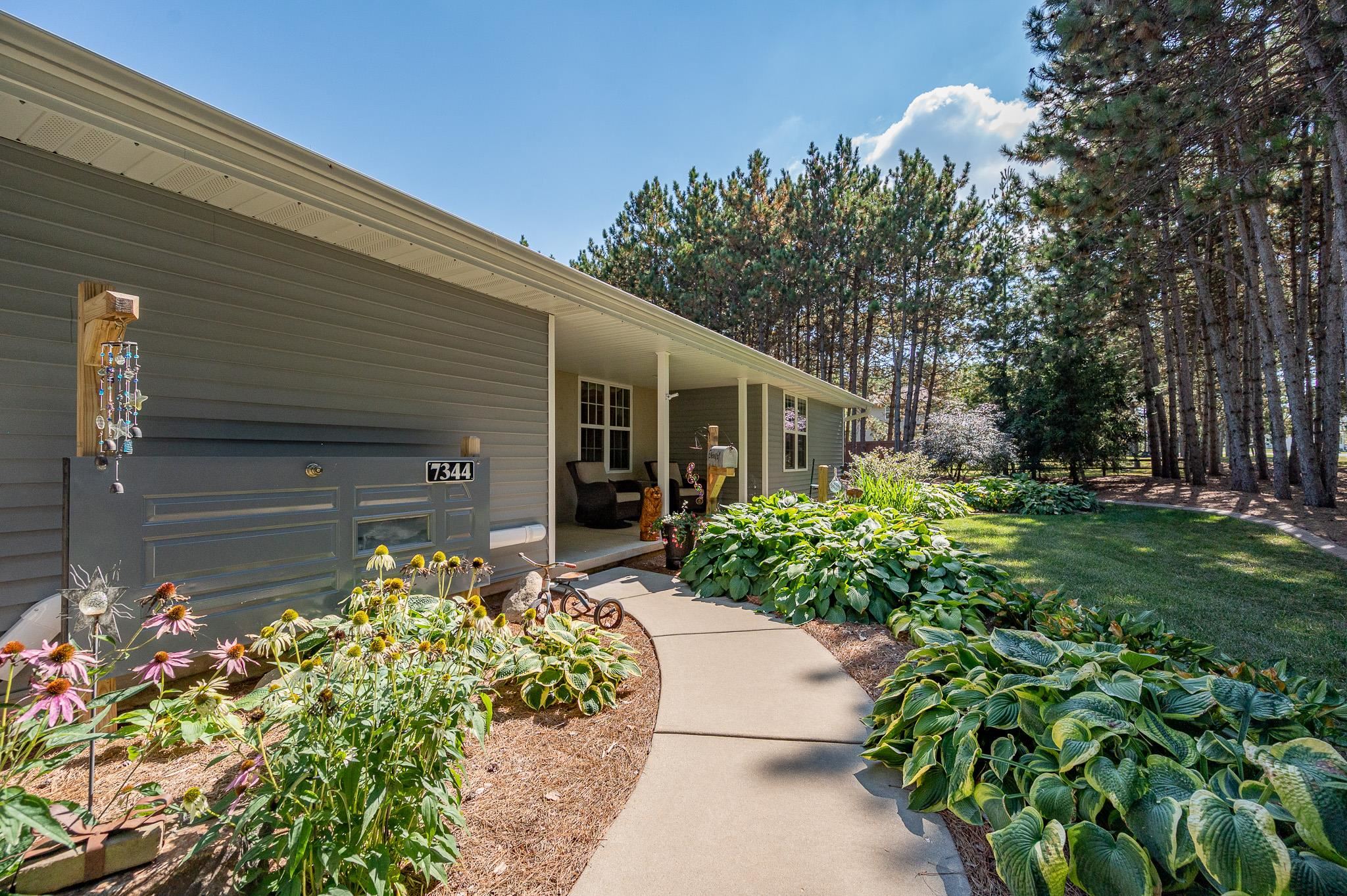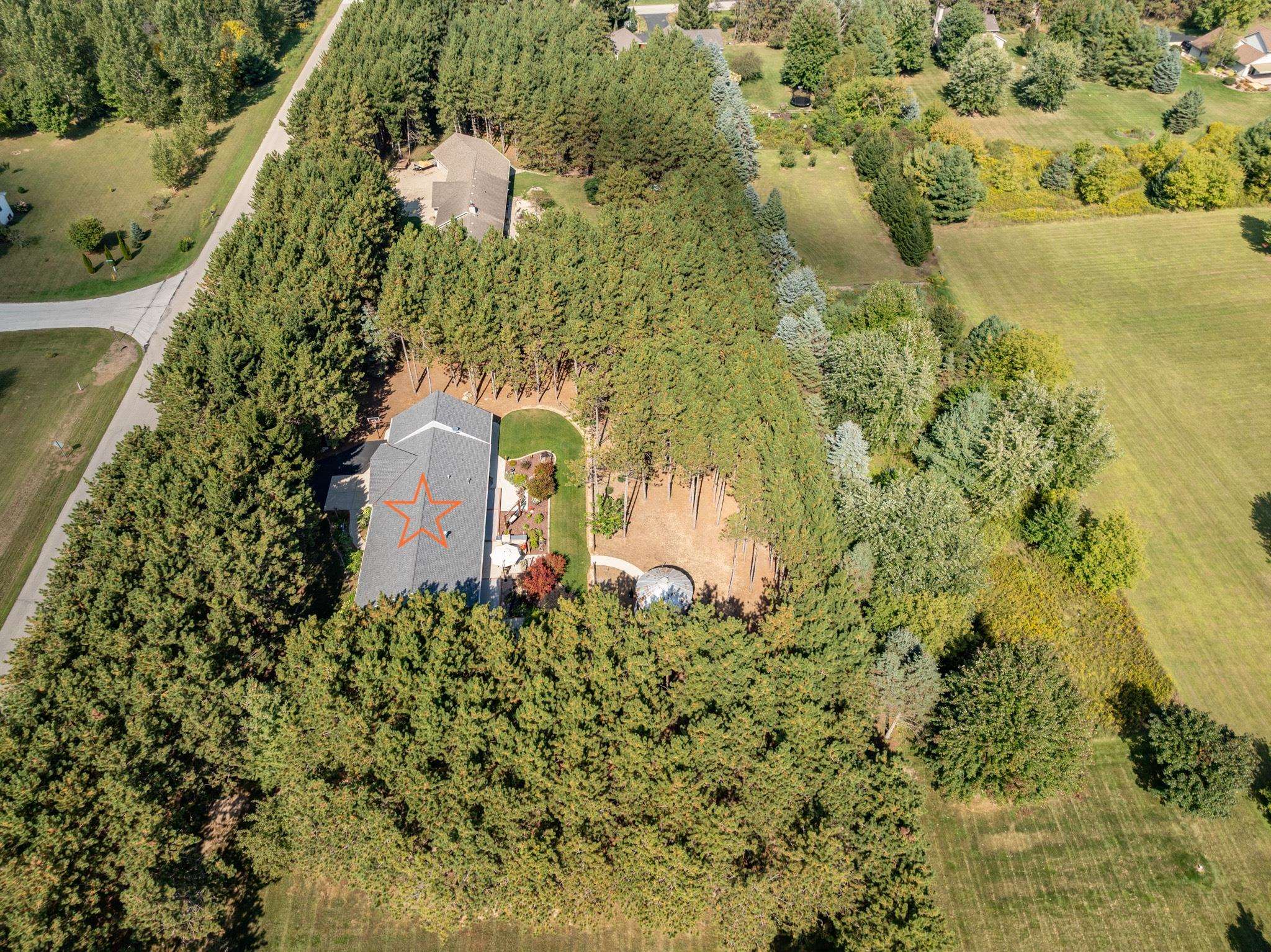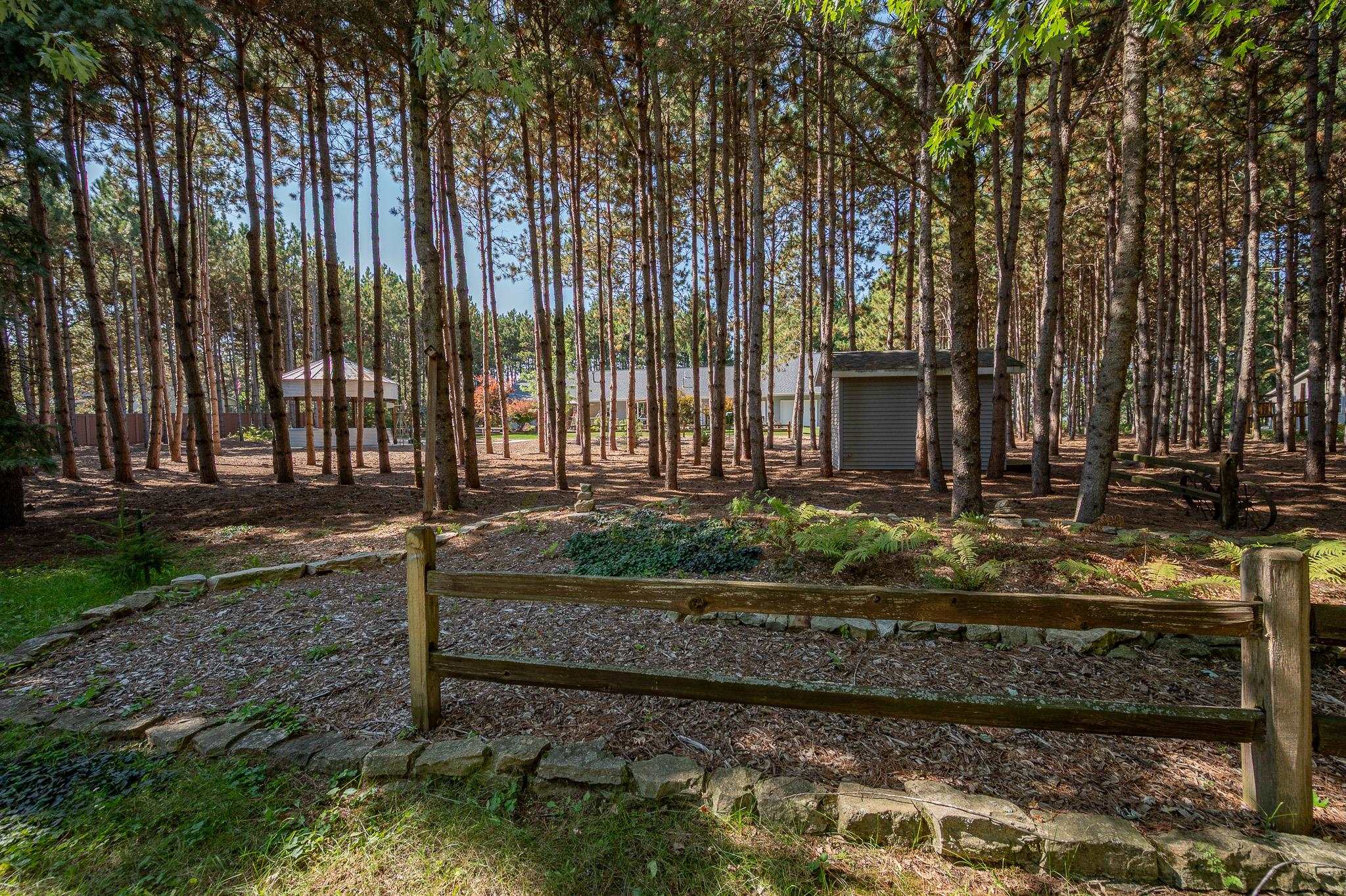 Set on 1.5 wooded acres in Sobieski, this home offers a private, thoughtfully designed setting. Vaulted ceilings and a gas fireplace anchor the main living space, while the kitchen features granite countertops, a large walk in pantry, island seating, and full size fridge and freezer. The primary suite includes heated tile floors, dual sinks, tiled walk in shower and jetted tub. The finished lower level adds a theatre room with raised seating, bedroom and full bath. Outside, a multi level patio and Trex decking create distinct gathering spaces, from the built in grill and covered seating area to the decorative pond with waterfall and silo style gazebo set among the trees. Recent updates include furnace, AC, a whole house generator and garage addition.