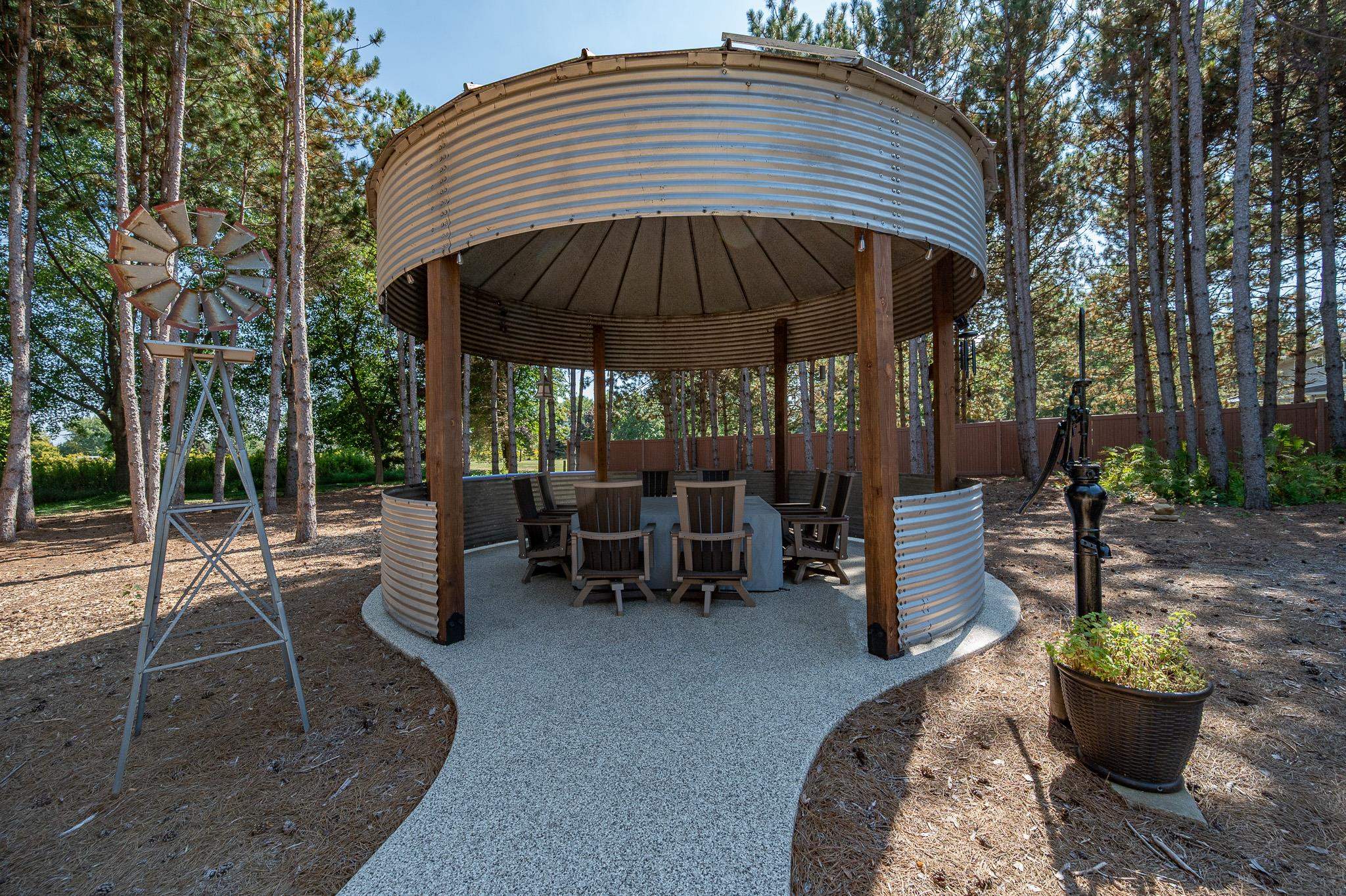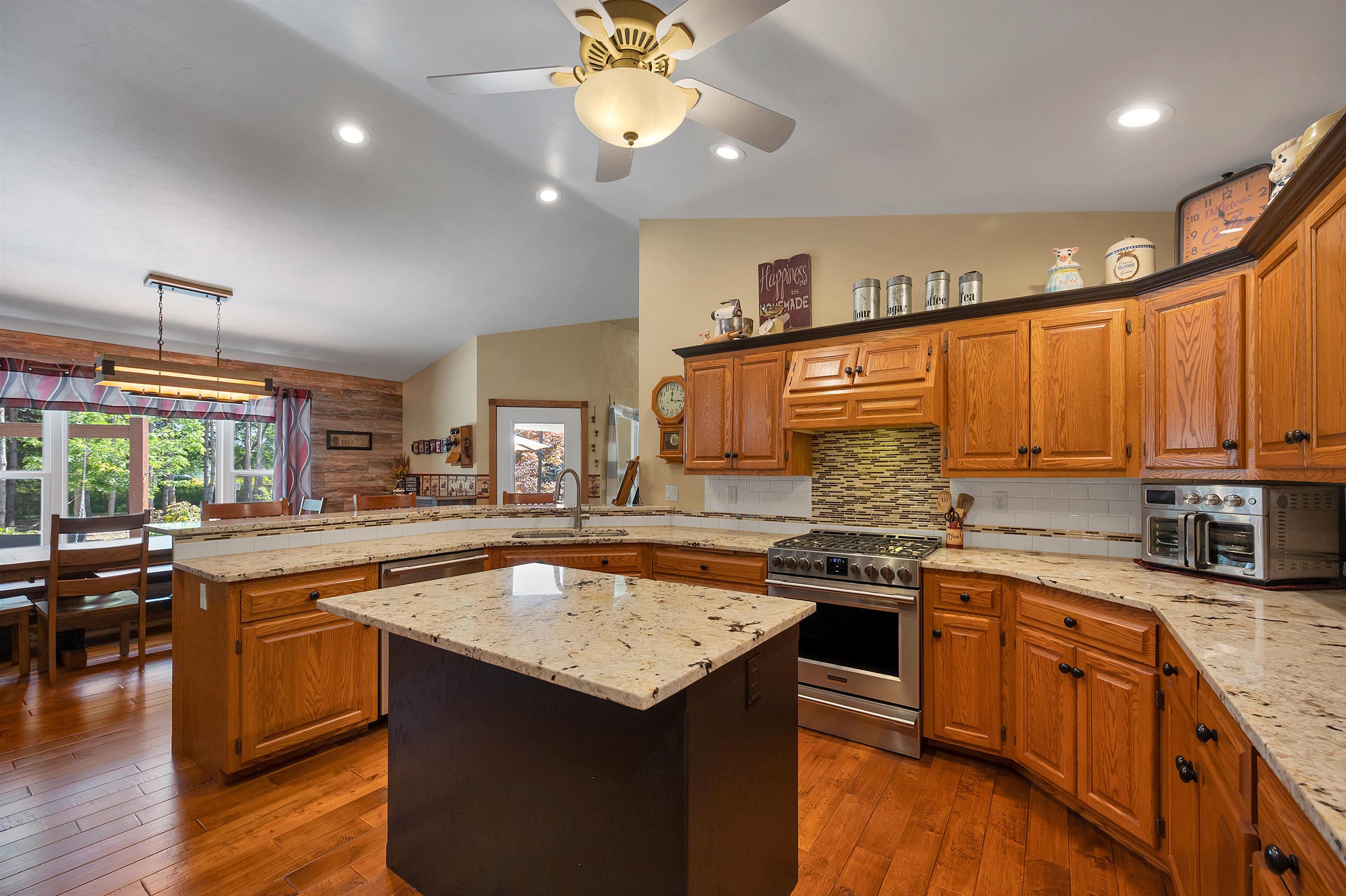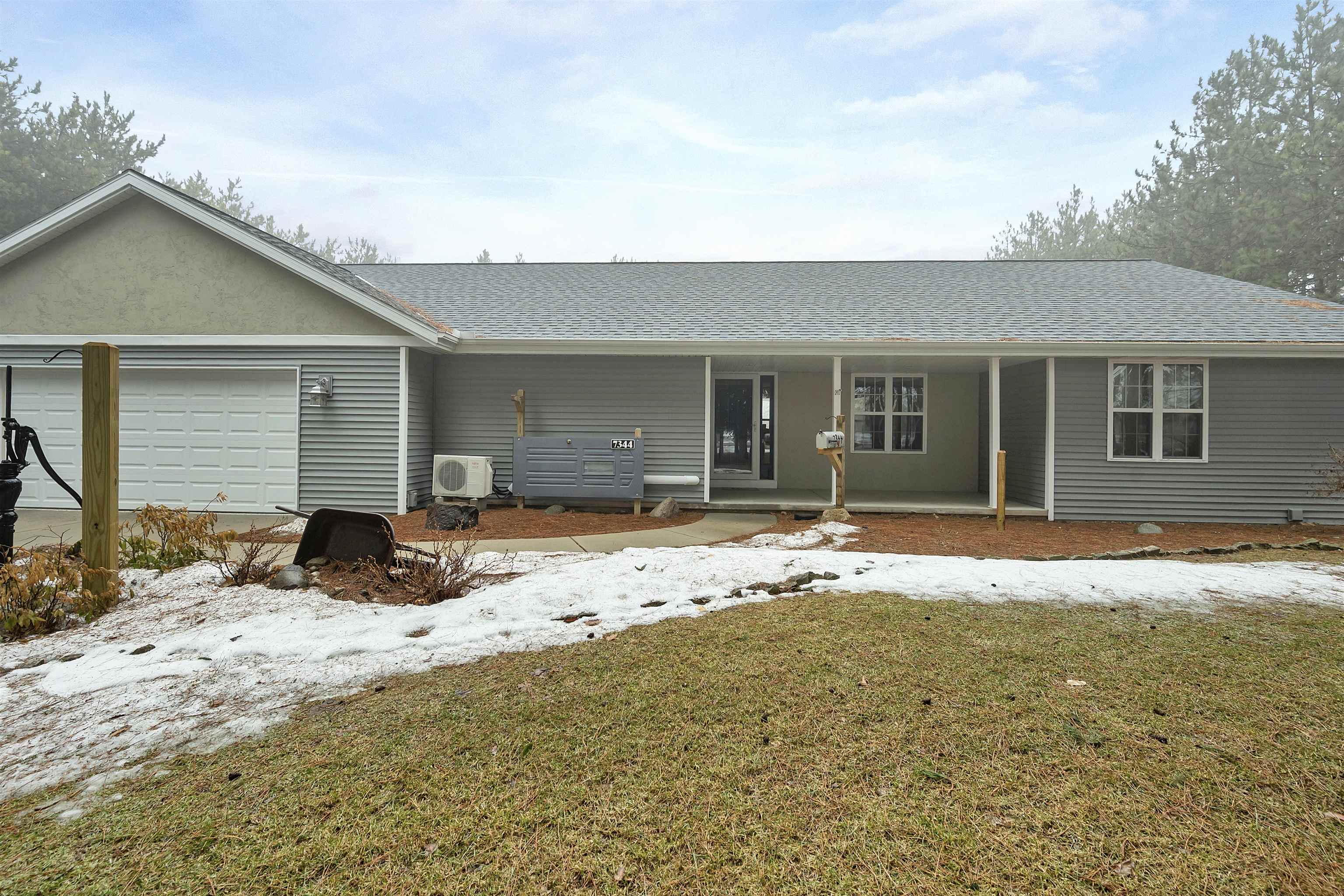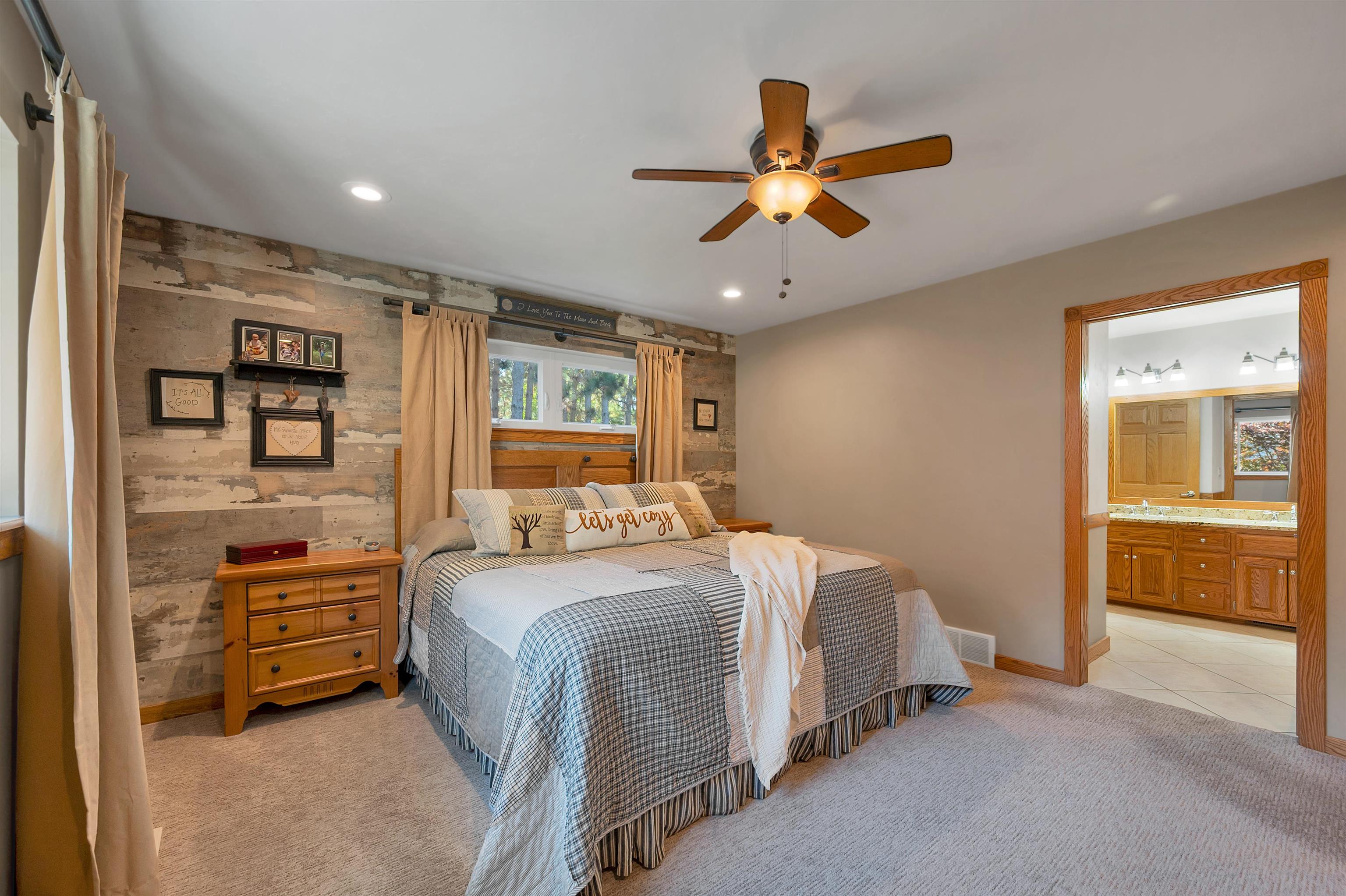 Set on 1.5 wooded acres in Sobieski, this home offers a private, thoughtfully designed setting. Vaulted ceilings and a gas fireplace anchor the main living space, while the kitchen features granite countertops, a large walk in pantry, island seating, and full size fridge and freezer. The primary suite includes heated tile floors, dual sinks, tiled walk in shower and jetted tub. The finished lower level adds a theatre room with raised seating, bedroom and full bath. Outside, a multi level patio and Trex decking create distinct gathering spaces, from the built in grill and covered seating area to the decorative pond with waterfall and silo style gazebo set among the trees. Recent updates include furnace, AC, a whole house generator and garage addition.