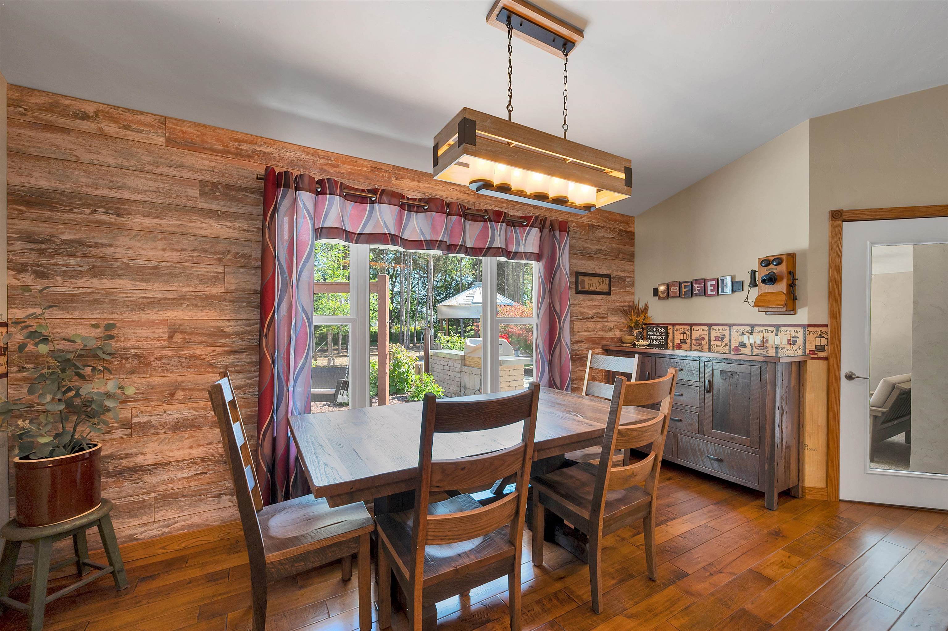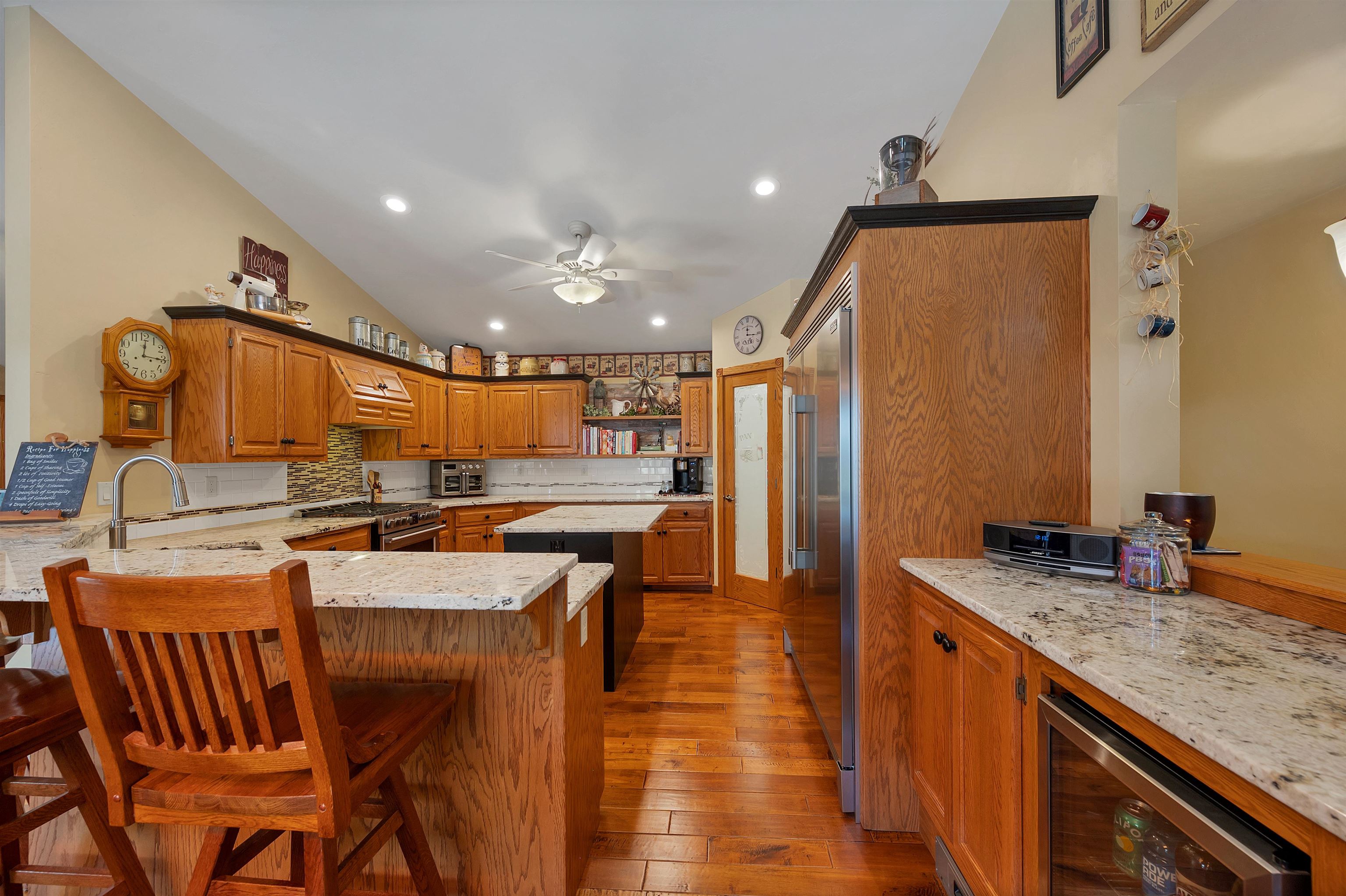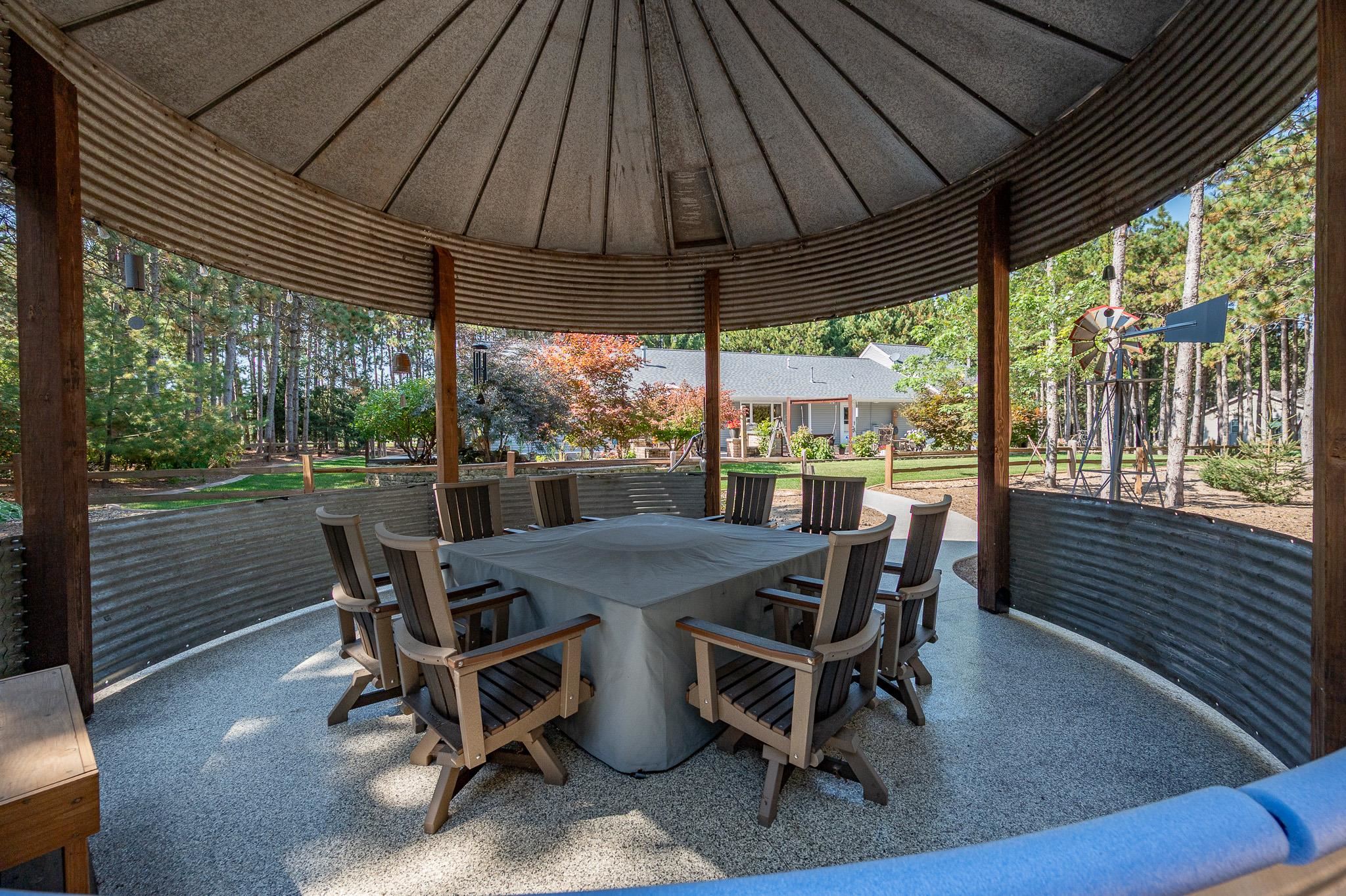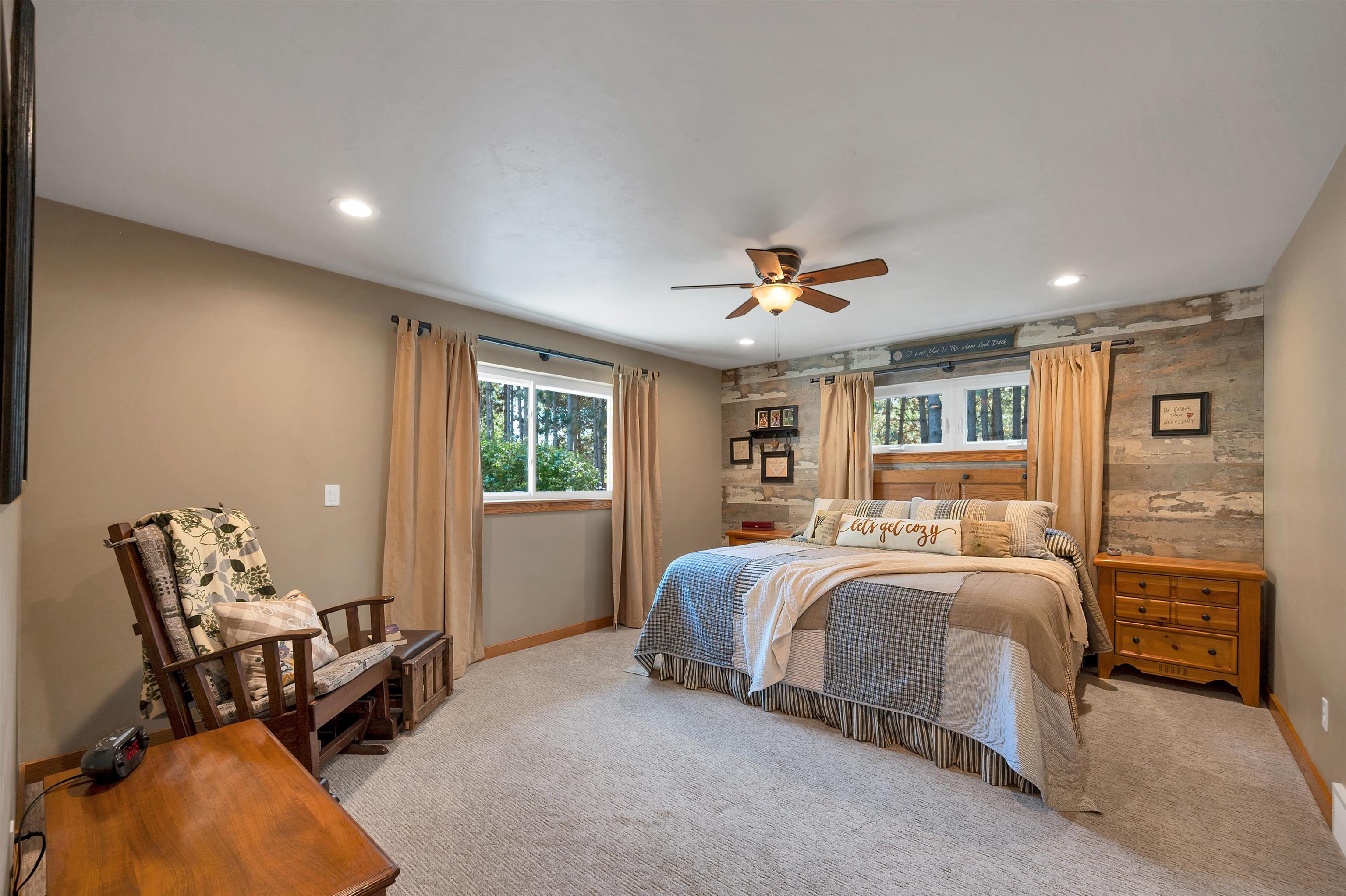 Set on 1.5 wooded acres in Sobieski, this home offers a private, thoughtfully designed setting. Vaulted ceilings and a gas fireplace anchor the main living space, while the kitchen features granite countertops, a large walk in pantry, island seating, and full size fridge and freezer. The primary suite includes heated tile floors, dual sinks, tiled walk in shower and jetted tub. The finished lower level adds a theatre room with raised seating, bedroom and full bath. Outside, a multi level patio and Trex decking create distinct gathering spaces, from the built in grill and covered seating area to the decorative pond with waterfall and silo style gazebo set among the trees. Recent updates include furnace, AC, a whole house generator and garage addition.