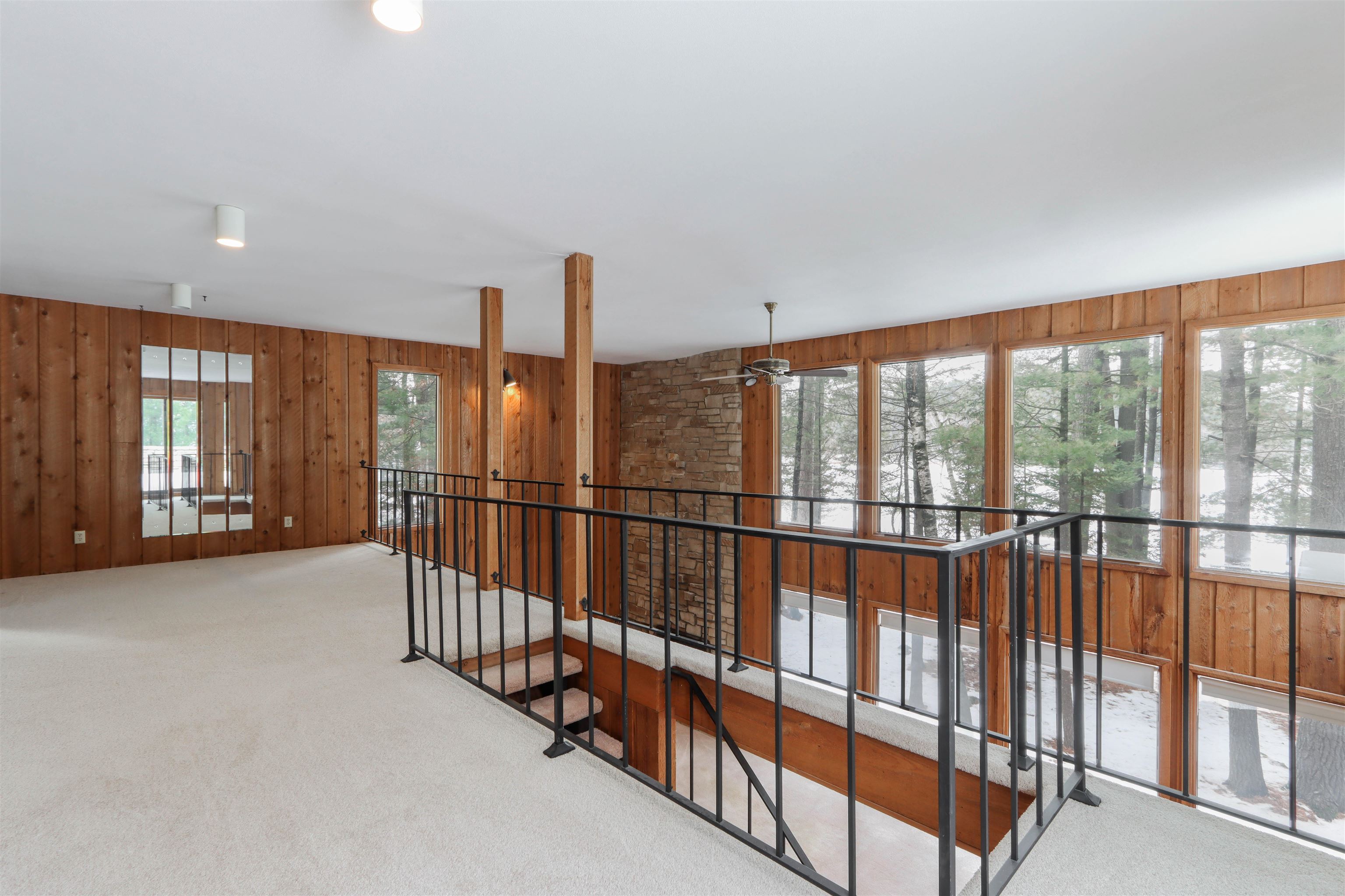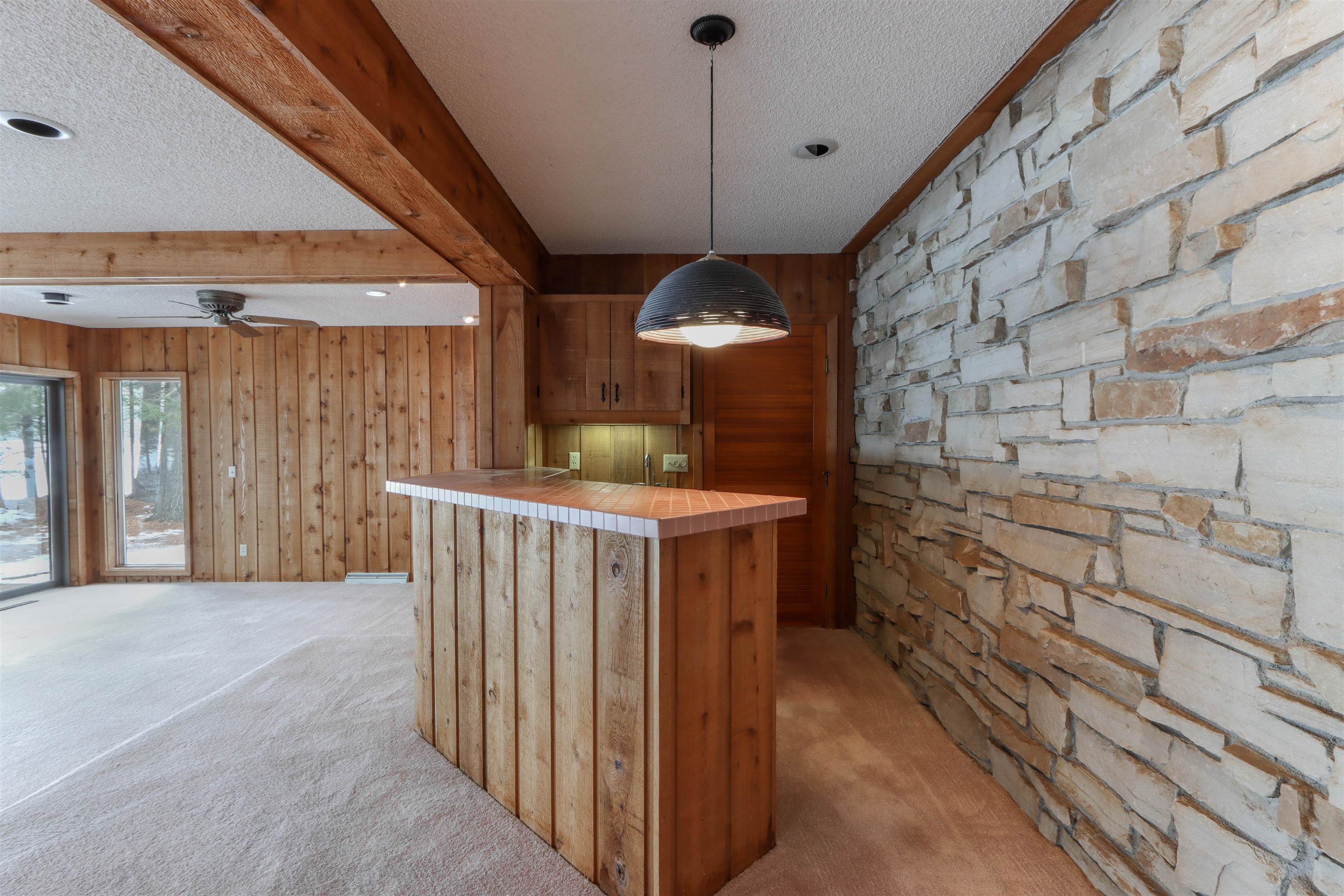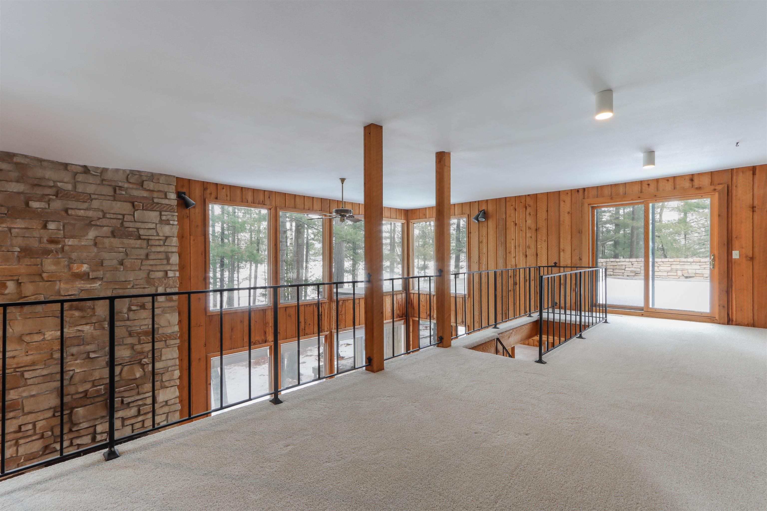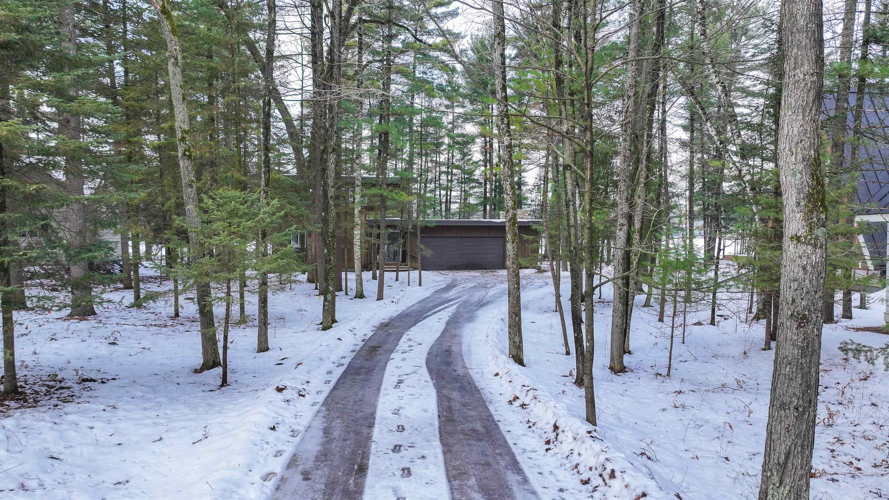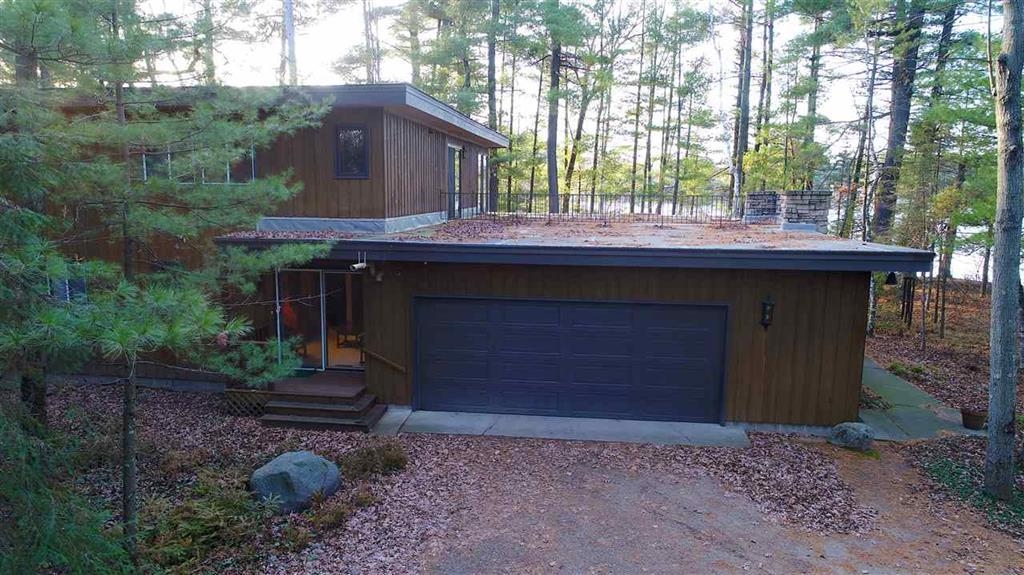 Tucked along the shores of Dake Lake on the stunning Chain O’ Lakes, this architecturally distinctive residence offers sunset views, approx 110 feet of level lake frontage, and a wooded setting that provides privacy and presence. This custom stone and cedar Mission-style home reflects thoughtful design principles, with clean 90-degree lines, strong horizontal geometry, extended overhangs, and a seamless connection to nature. Walls of windows frame the lake and surrounding woods, filling the home with natural light. Soaring ceilings and a dramatic two-story stone fireplace anchor the open living space. The primary suite includes a sitting area with access to an upper-level deck. Three bedrooms, two baths, main-floor laundry, and an attached 2 car garage complete this rare offering.