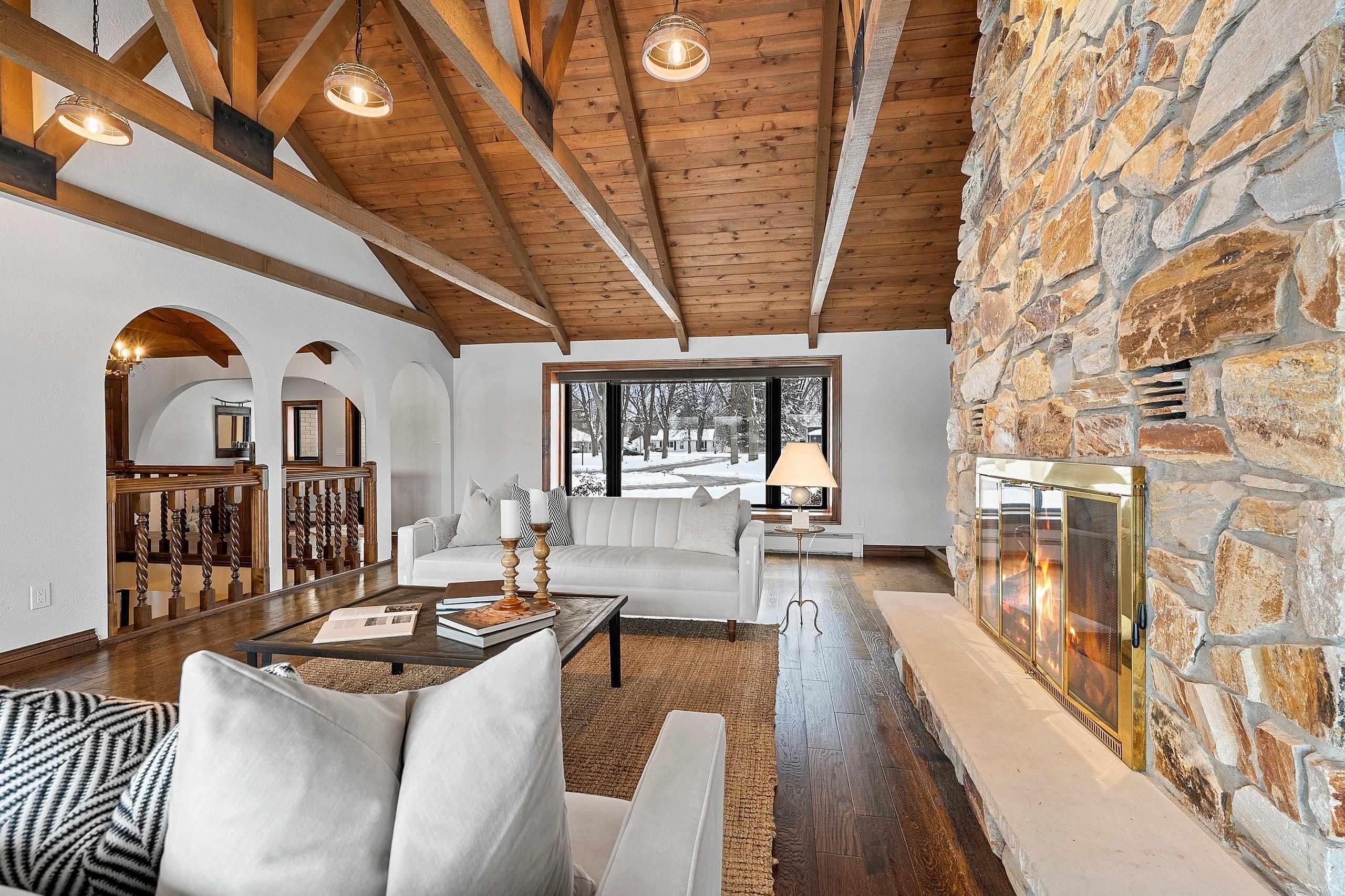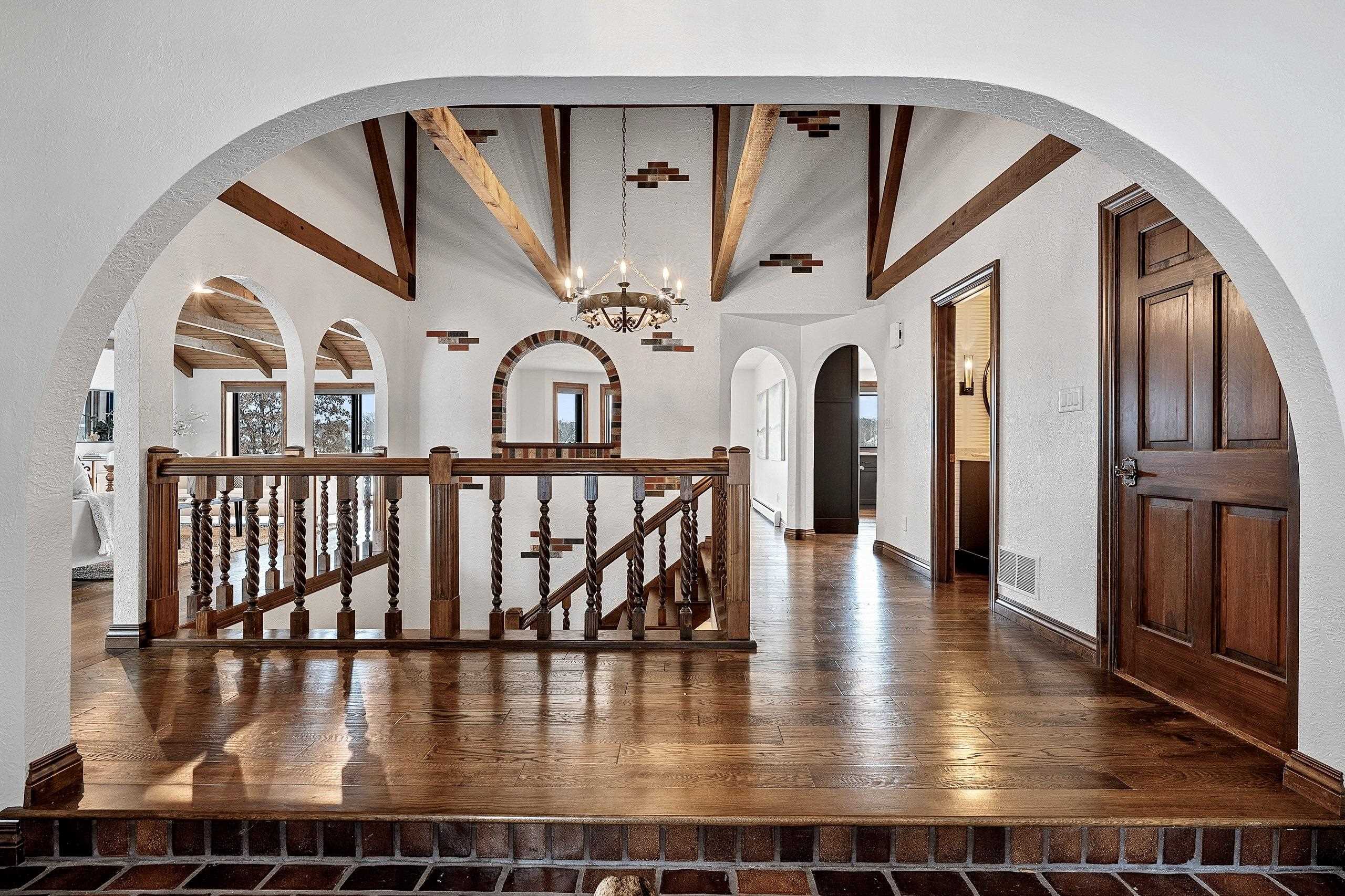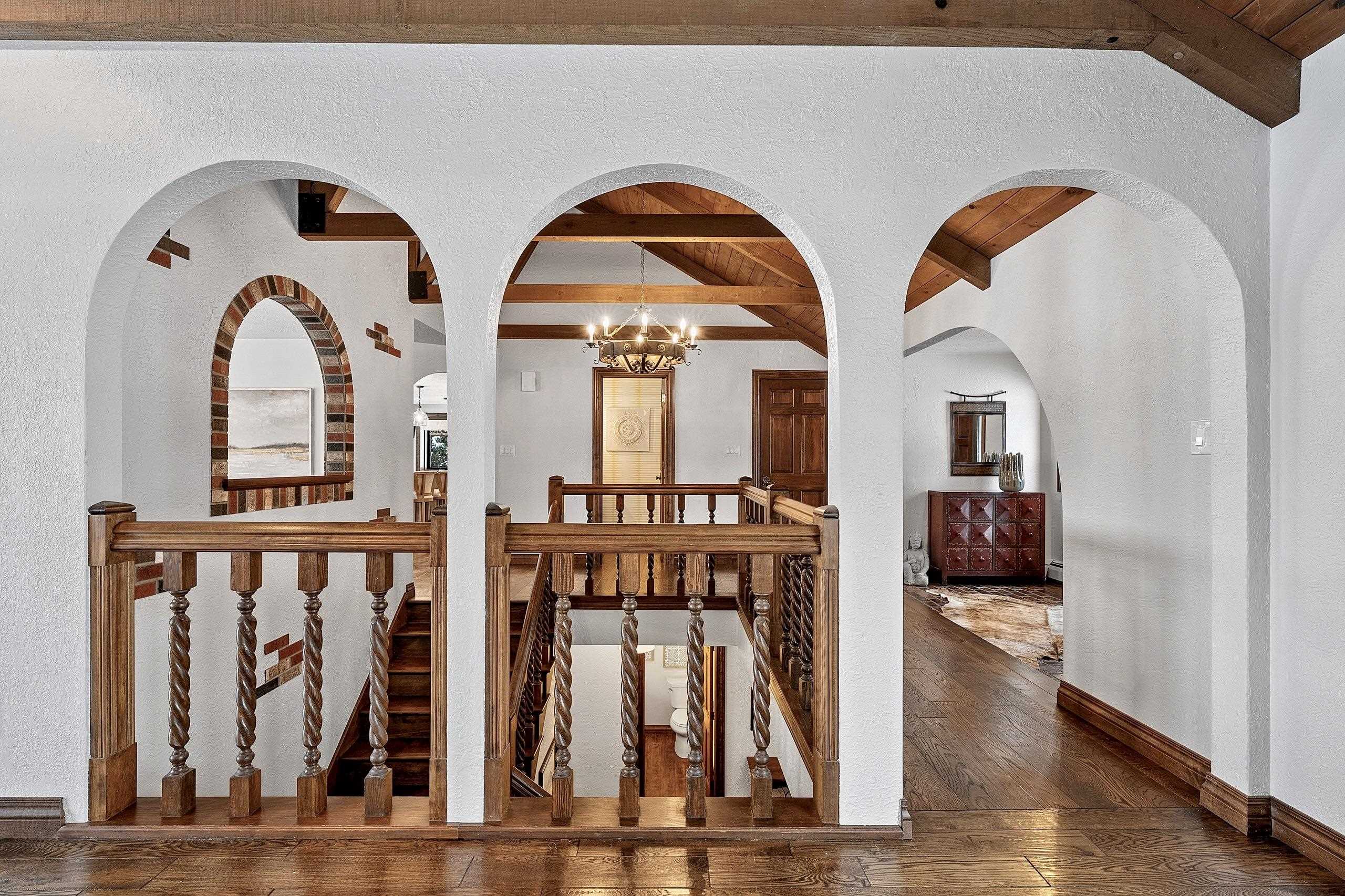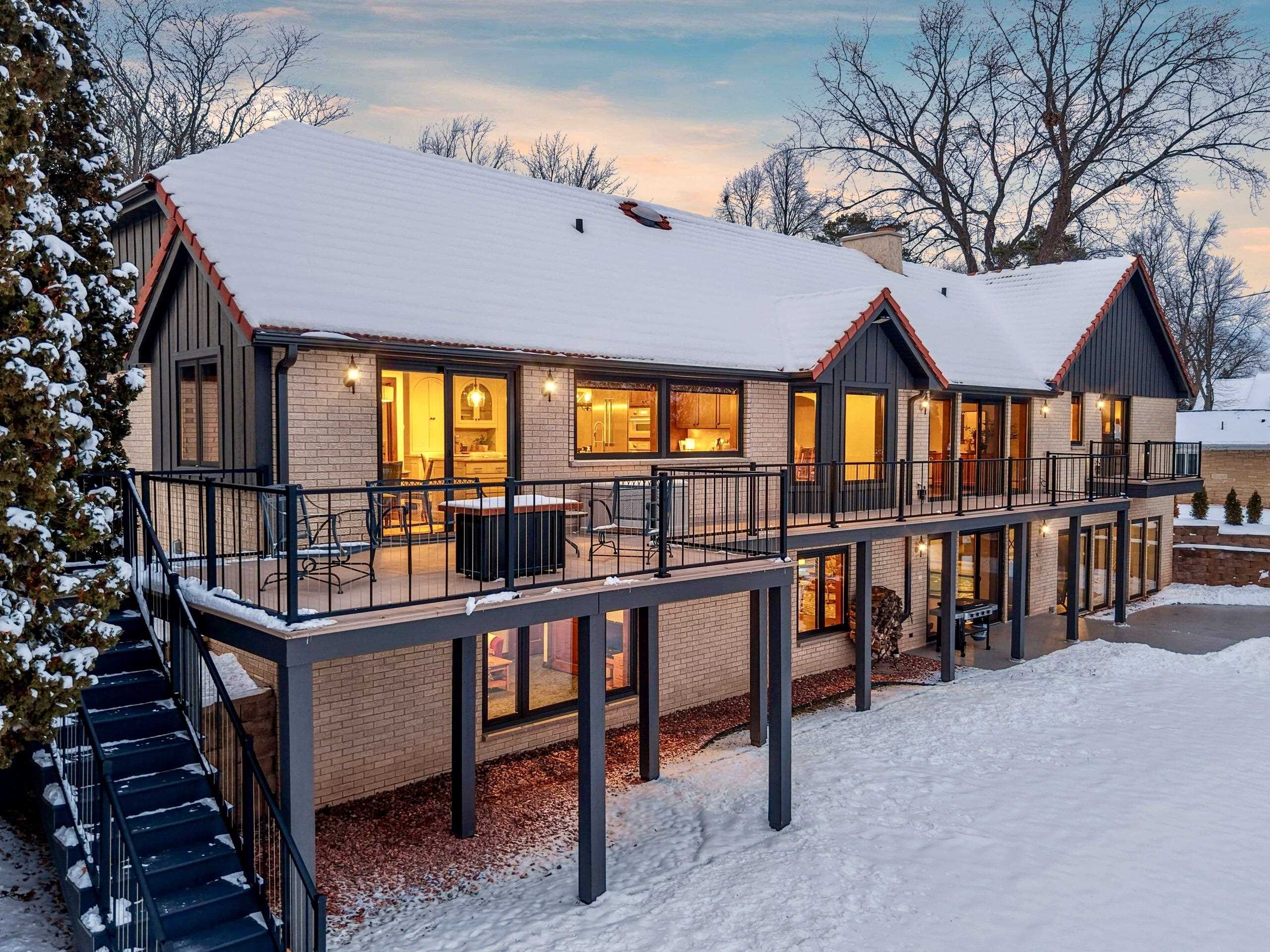 Stunning Spanish Mediterranean 5 bdrm w/o brick ranch featuring panoramic river views (140 ' frontage/1 acre) & smart functional floor plan. Completely renovated (Designs of the Interior) w/ all new Anderson windows, gorgeous new kitchen w/ Taj Mahal counters/huge walk-in pantry/expansive river views, updated baths, white oak real HW flooring from Ralph's HW Flooring, relaxing primary suite w/ private balcony, full interior painted, fantastic back hall, radiant heat in all new interior 3 stall garage, hvac updated '18. Exterior upgrades include all new cement flatwork, new aluminum upper deck, epoxy patio, refurbished rip-rap, new composite dock w/ boat lift, new soffits/downspouts, new landscaping/uplighting. Refurbished indoor pool area w/ sauna.