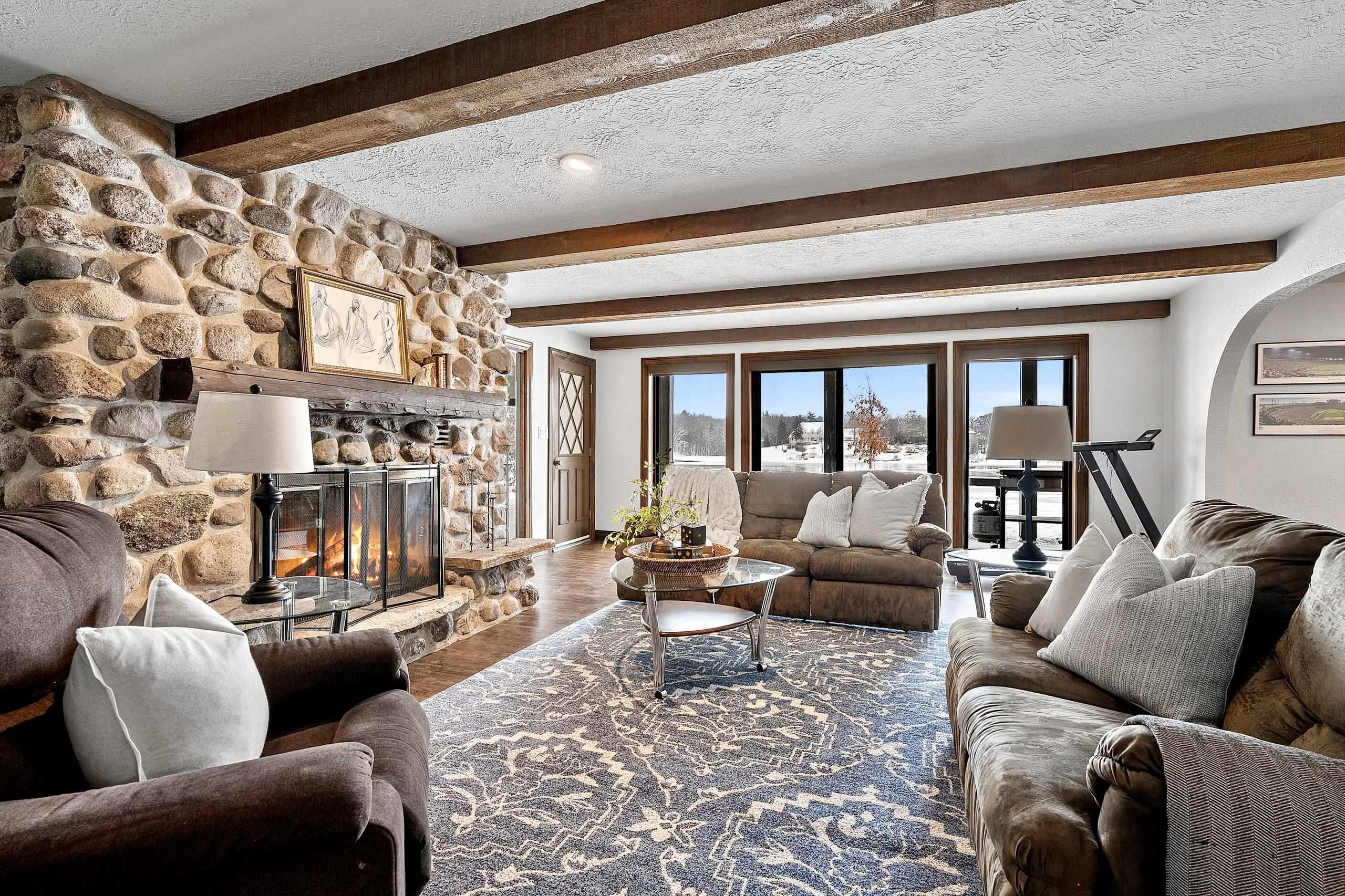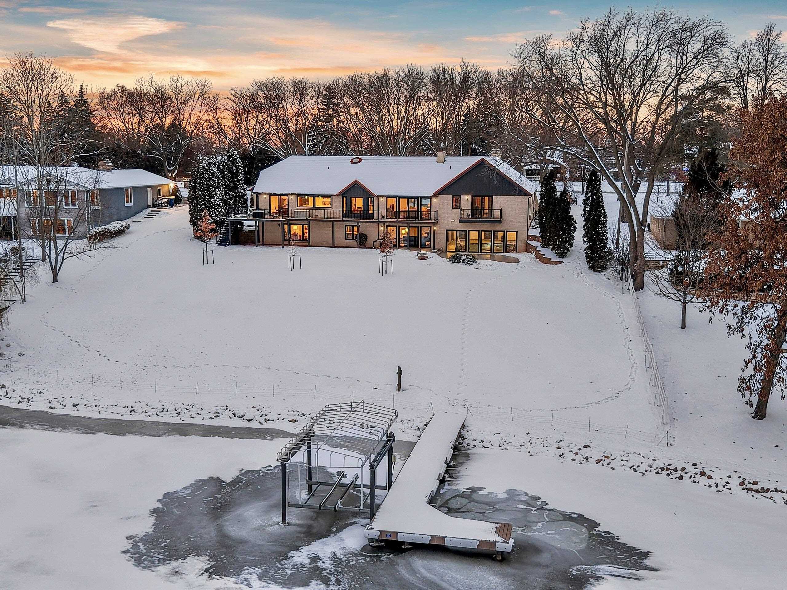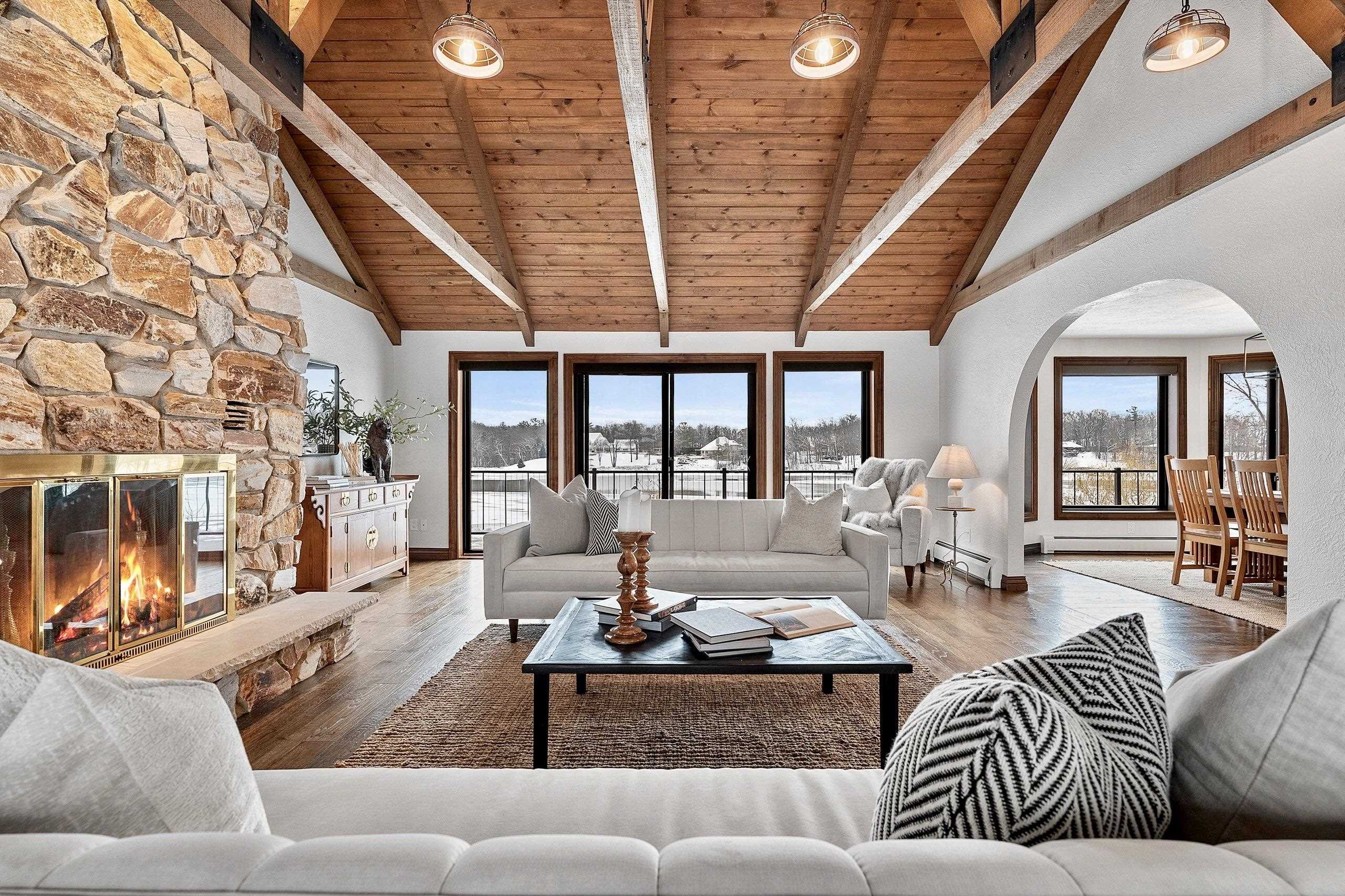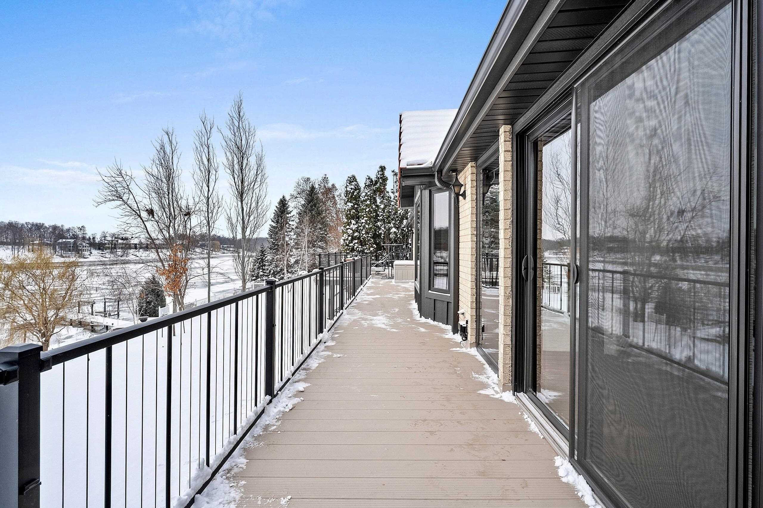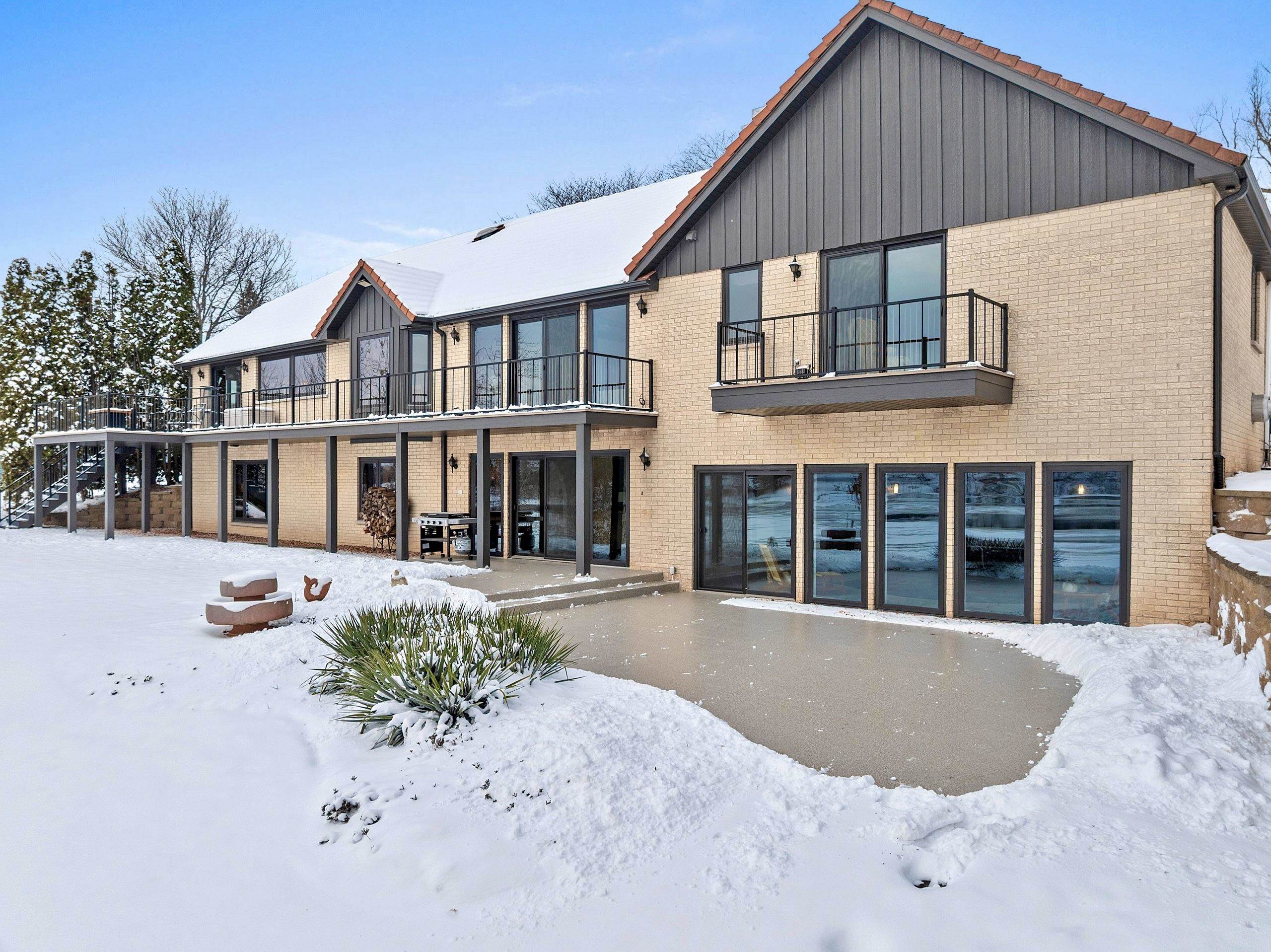 Stunning Spanish Mediterranean 5 bdrm w/o brick ranch featuring panoramic river views (140 ' frontage/1 acre) & smart functional floor plan. Completely renovated (Designs of the Interior) w/ all new Anderson windows, gorgeous new kitchen w/ Taj Mahal counters/huge walk-in pantry/expansive river views, updated baths, white oak real HW flooring from Ralph's HW Flooring, relaxing primary suite w/ private balcony, full interior painted, fantastic back hall, radiant heat in all new interior 3 stall garage, hvac updated '18. Exterior upgrades include all new cement flatwork, new aluminum upper deck, epoxy patio, refurbished rip-rap, new composite dock w/ boat lift, new soffits/downspouts, new landscaping/uplighting. Refurbished indoor pool area w/ sauna.