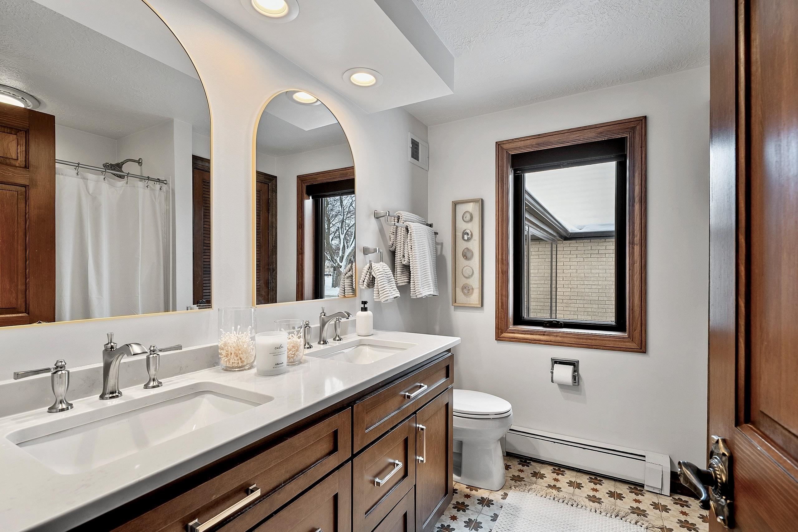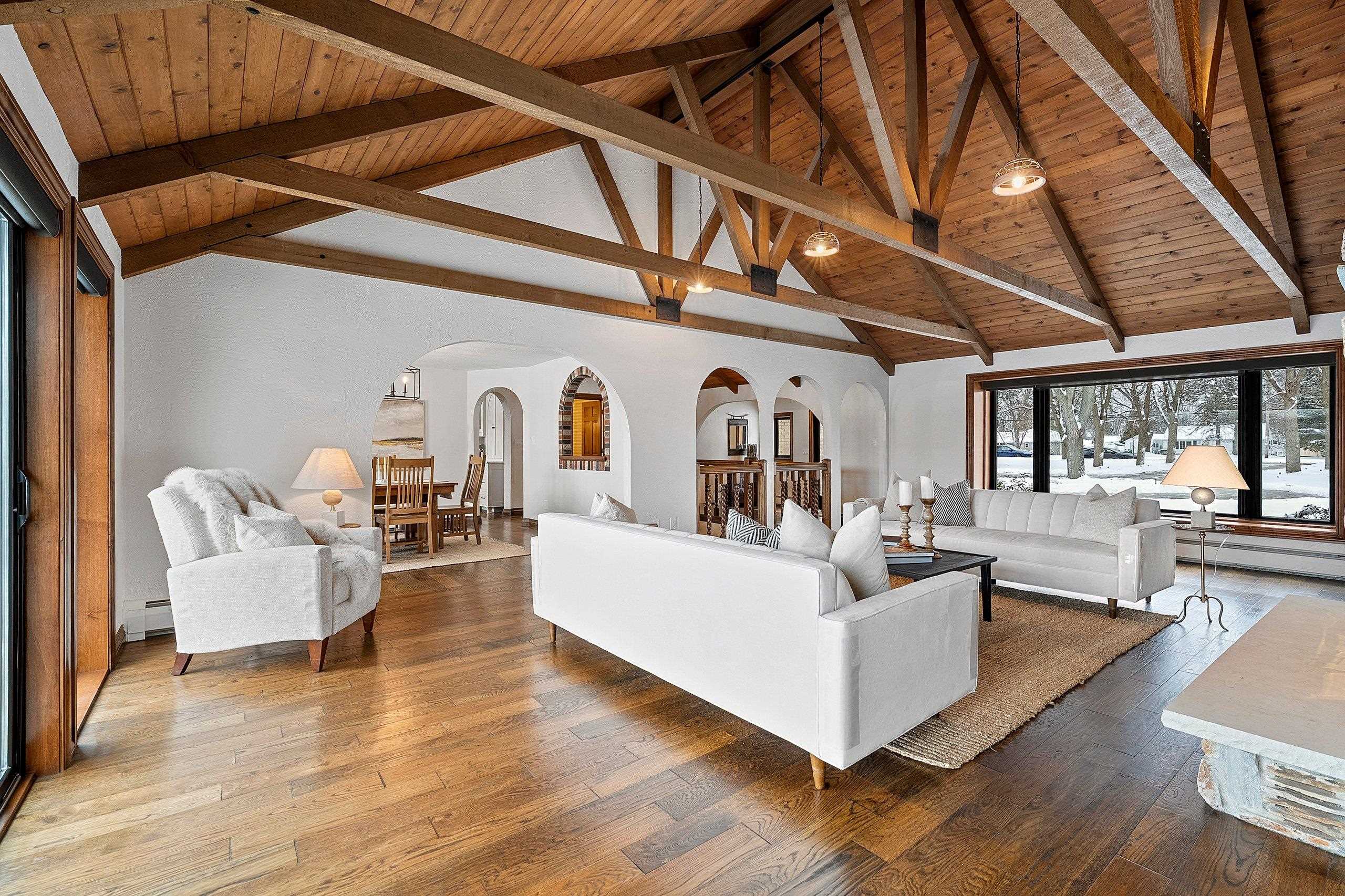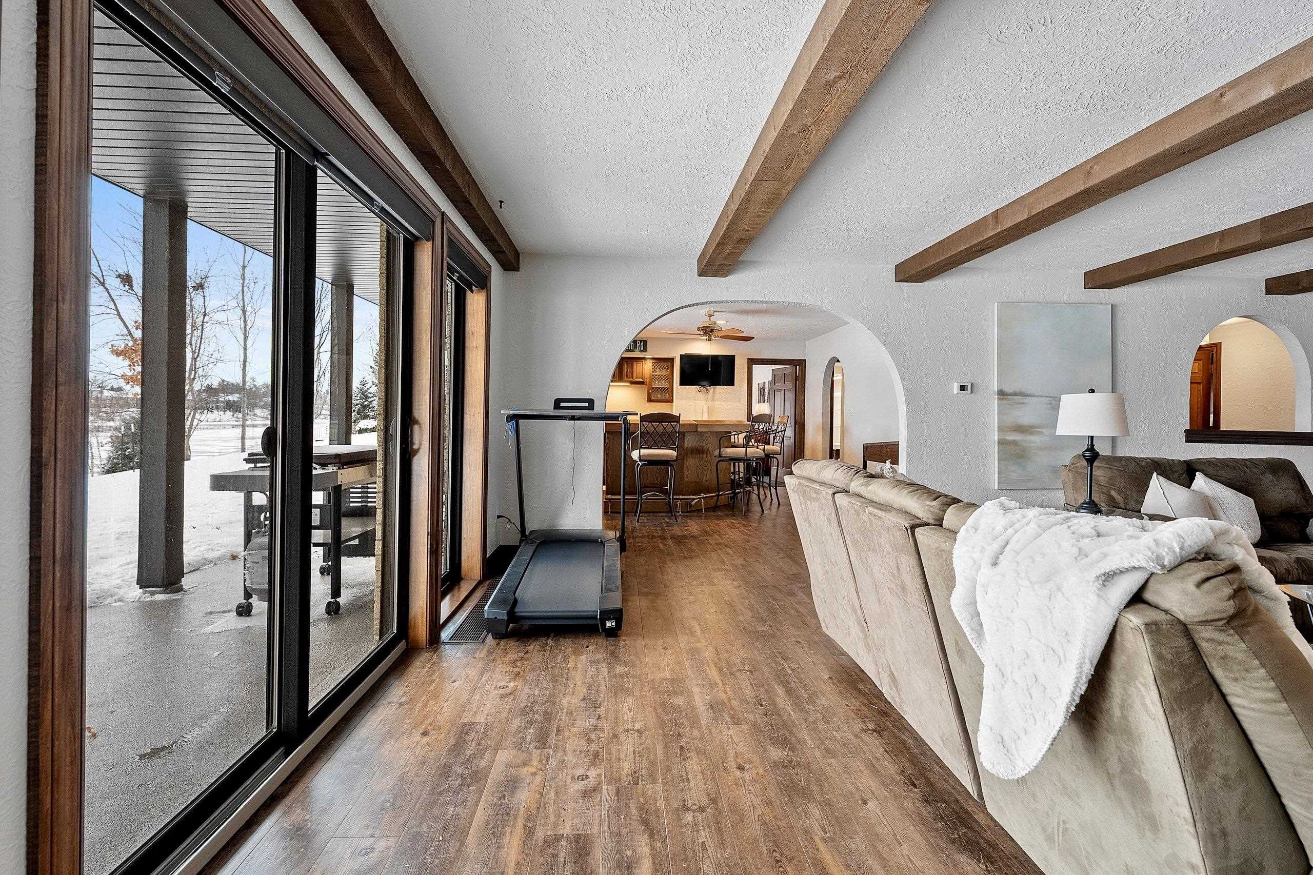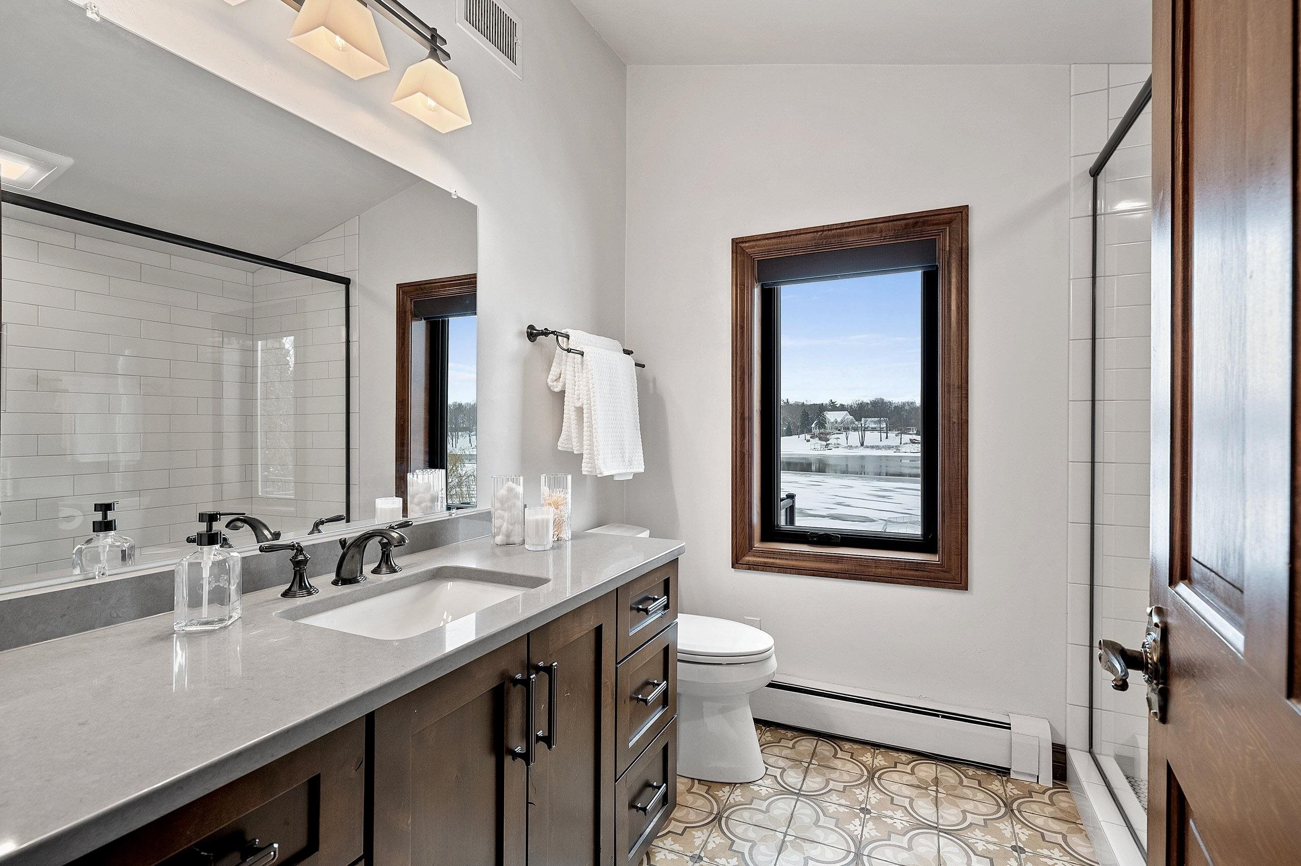 Stunning Spanish Mediterranean 5 bdrm w/o brick ranch featuring panoramic river views (140 ' frontage/1 acre) & smart functional floor plan. Completely renovated (Designs of the Interior) w/ all new Anderson windows, gorgeous new kitchen w/ Taj Mahal counters/huge walk-in pantry/expansive river views, updated baths, white oak real HW flooring from Ralph's HW Flooring, relaxing primary suite w/ private balcony, full interior painted, fantastic back hall, radiant heat in all new interior 3 stall garage, hvac updated '18. Exterior upgrades include all new cement flatwork, new aluminum upper deck, epoxy patio, refurbished rip-rap, new composite dock w/ boat lift, new soffits/downspouts, new landscaping/uplighting. Refurbished indoor pool area w/ sauna.