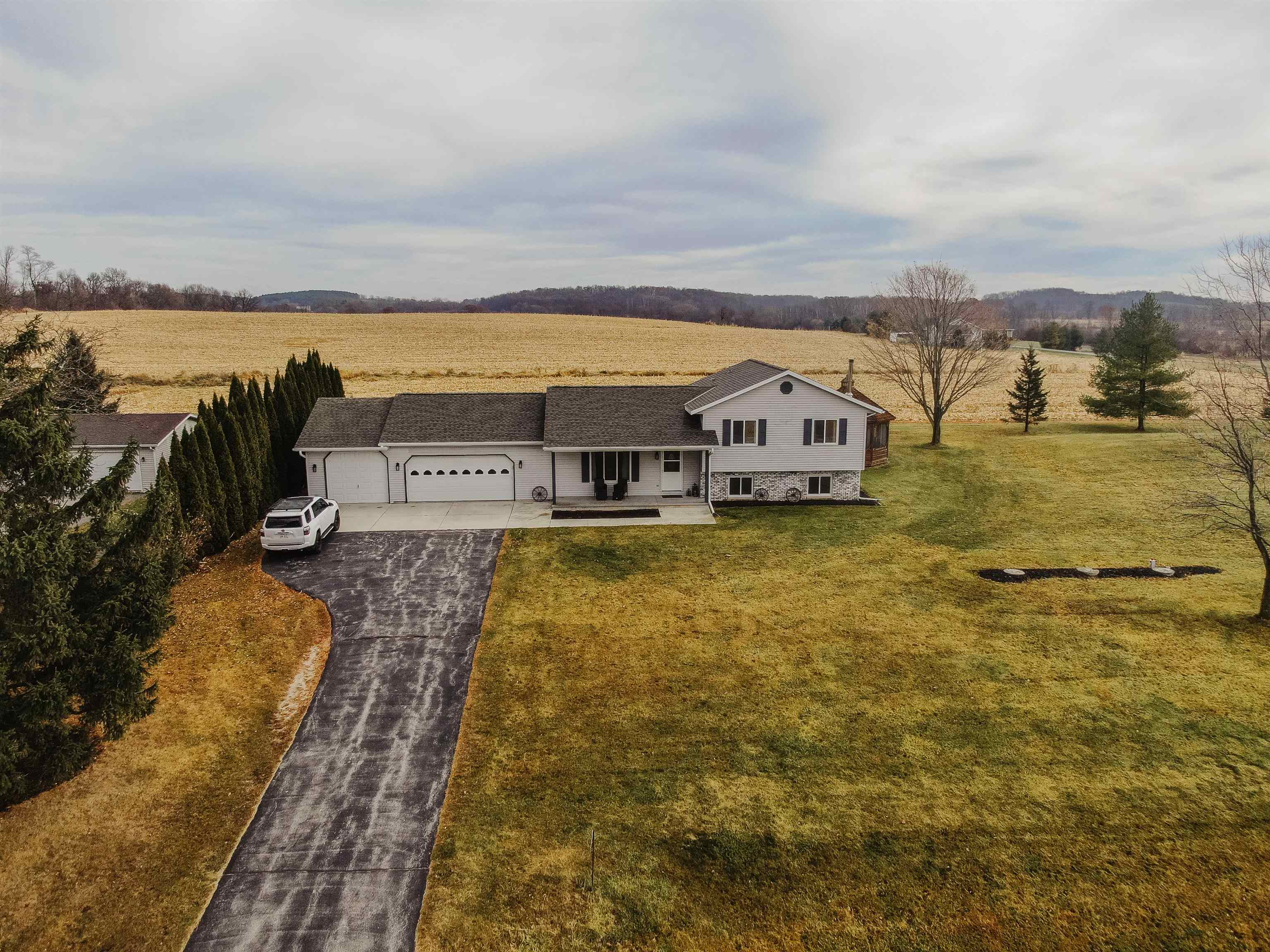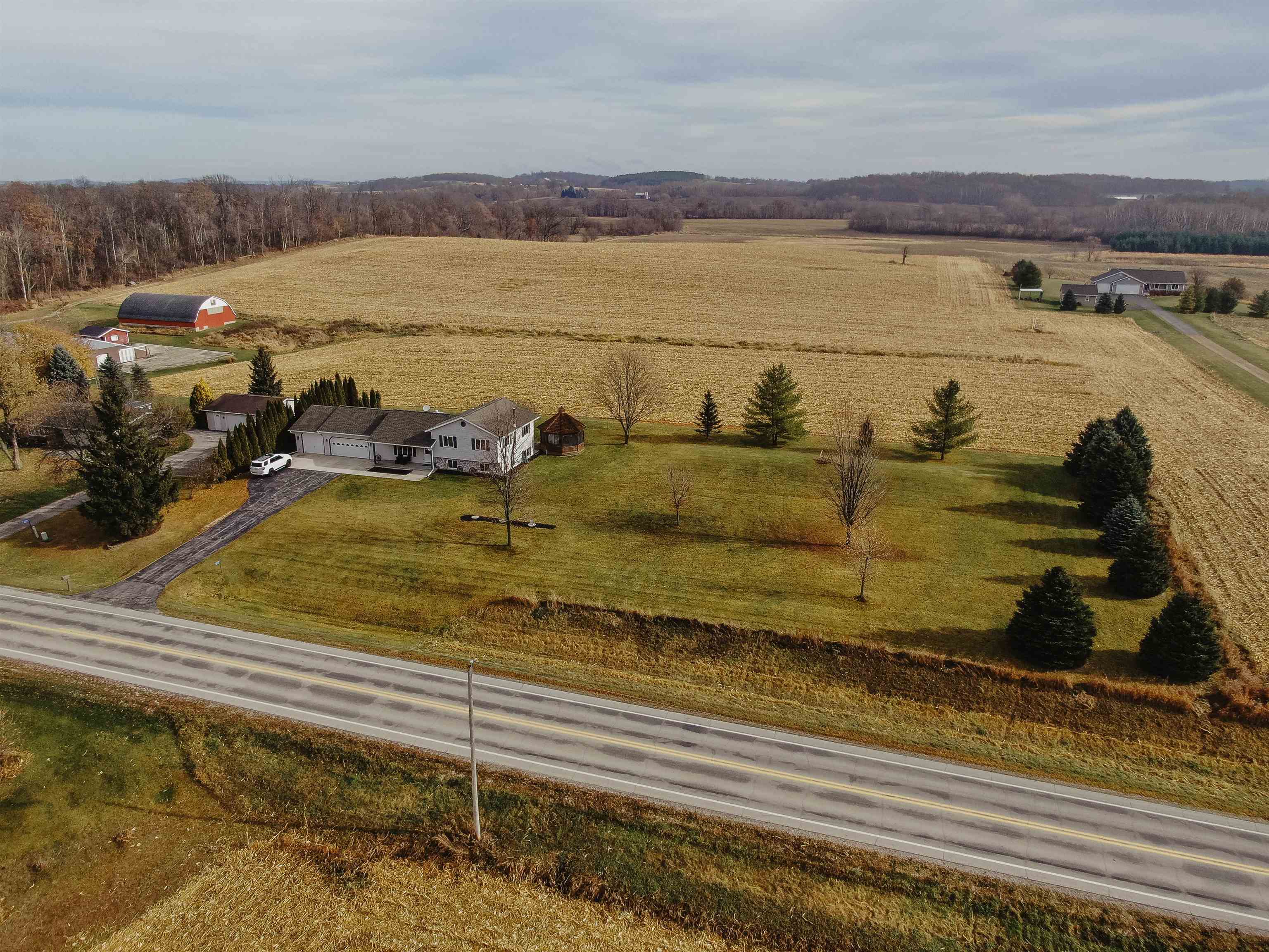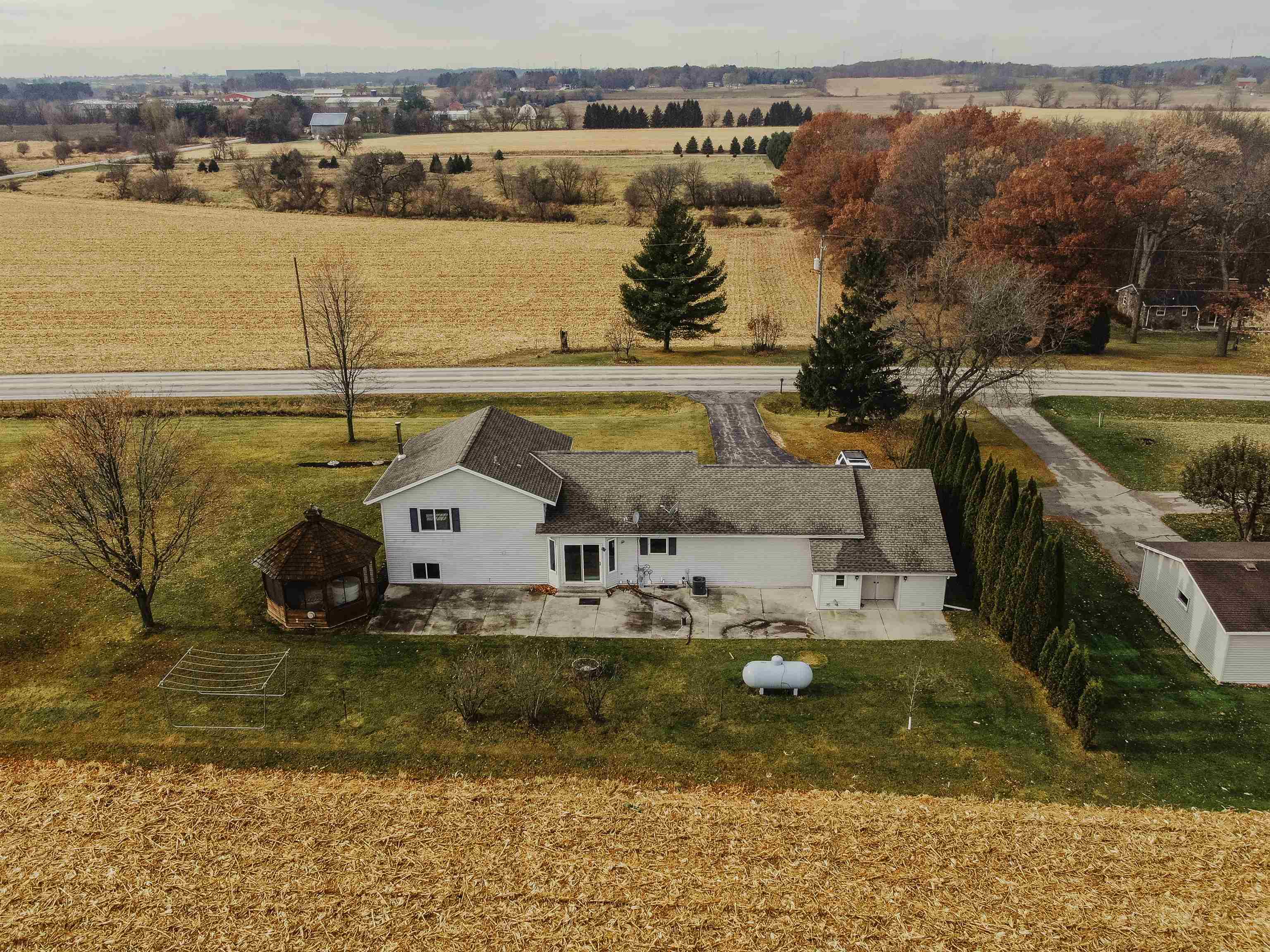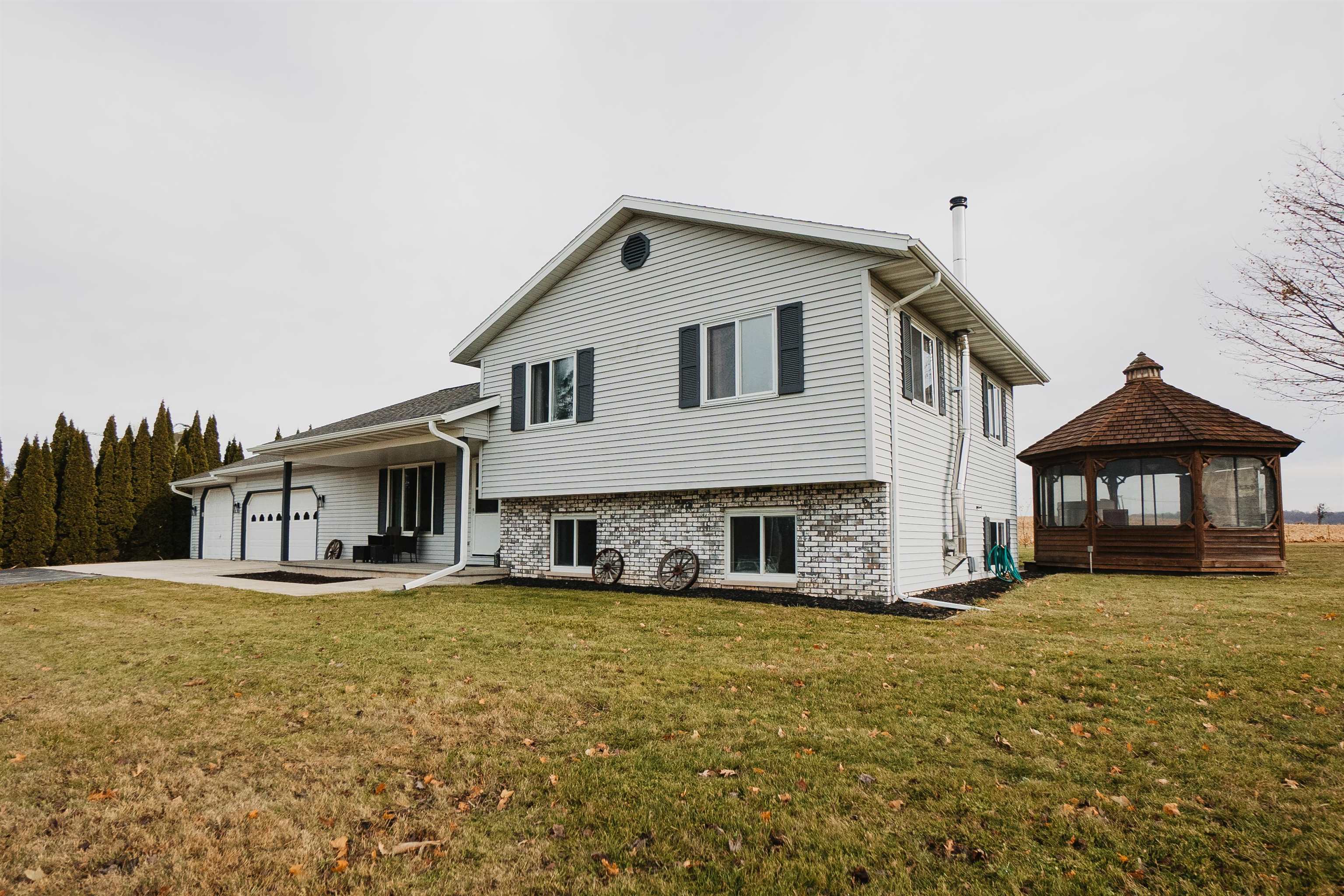 FANTASTIC COUNTRY VIEW! Welcome to this wonderful Quad level home featuring 3 bedrooms, 2 full bath with a 3 car detached garage all on an 1-acre lot surrounded by corn farmland. As soon as you enter the front door you walk into a bright and cheerful living room that leads into the updated kitchen and dining area, all with newer flooring. Patio doors from the dining area will let you access the back yard overlooking the country fields, perfect for entertaining and watching wildlife as a bonus you can also enjoy the gazebo for some added relaxation. Large rec room with a fireplace for added space to enjoy. If you enjoy to tinker the 3rd stall heated garage offers plenty of room to set up shop or use it as additional storage for toys.