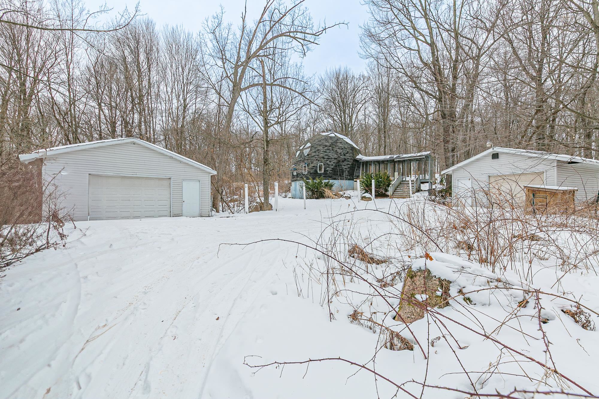Priced for condition, this 5-acre property presents a strong opportunity for investors or renovation buyers to build equity. Dome-style home has been taken down to the studs and is ready for transformation, with potential for approximately 2,000 sq ft of finished space. Detached 2-stall and tandem 4-stall garages add significant value for storage, workshop, or hobby use. Wooded setting offers privacy and flexibility. Existing footprint provides a solid starting point. Conveniently located near the Chain O’ Lakes and the City of Waupaca, enhancing long-term value and investment potential. Property currently without utilities and will not qualify for traditional financing. Cash, commercial, or renovation financing required. Some photos have been virtually staged.