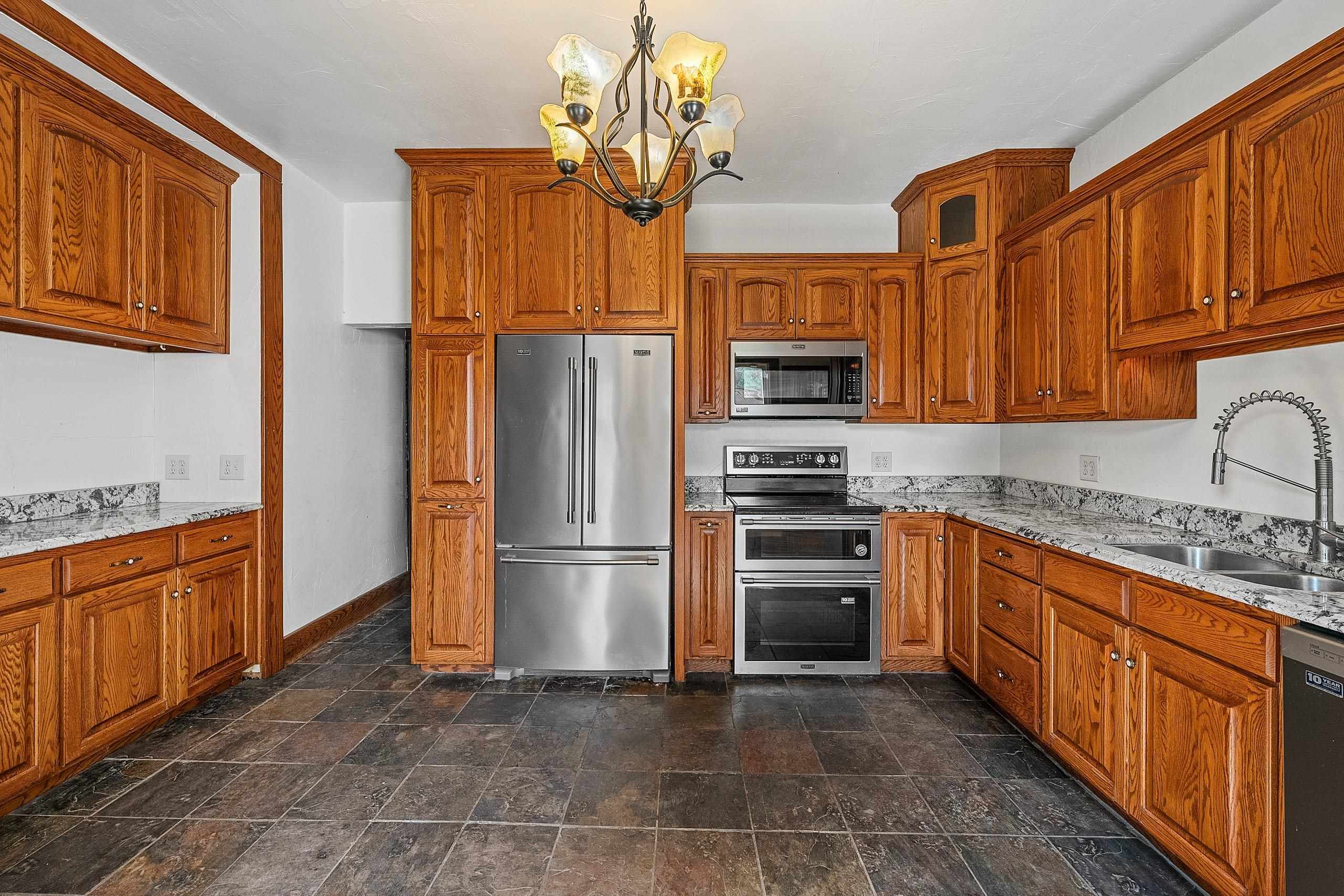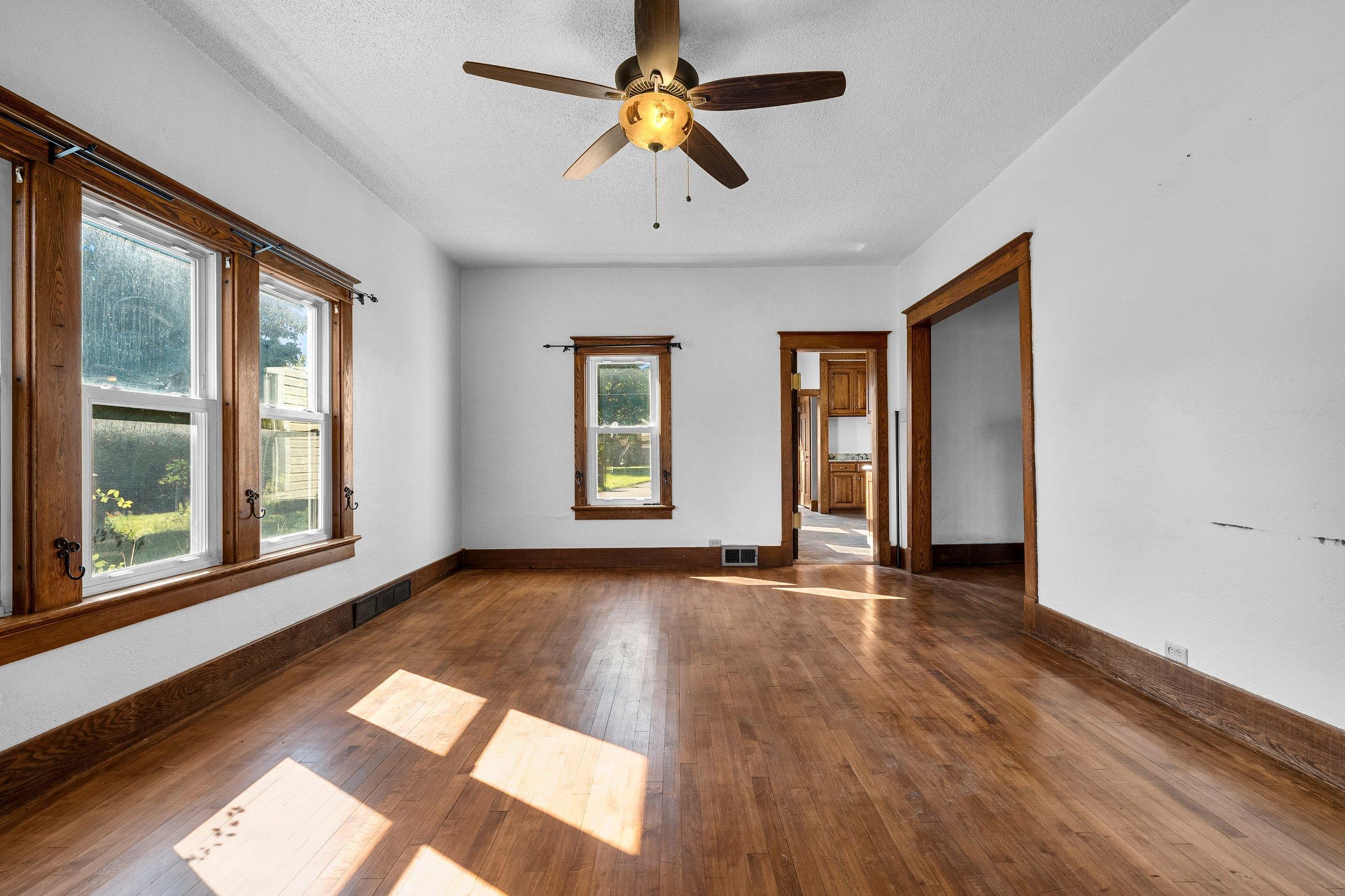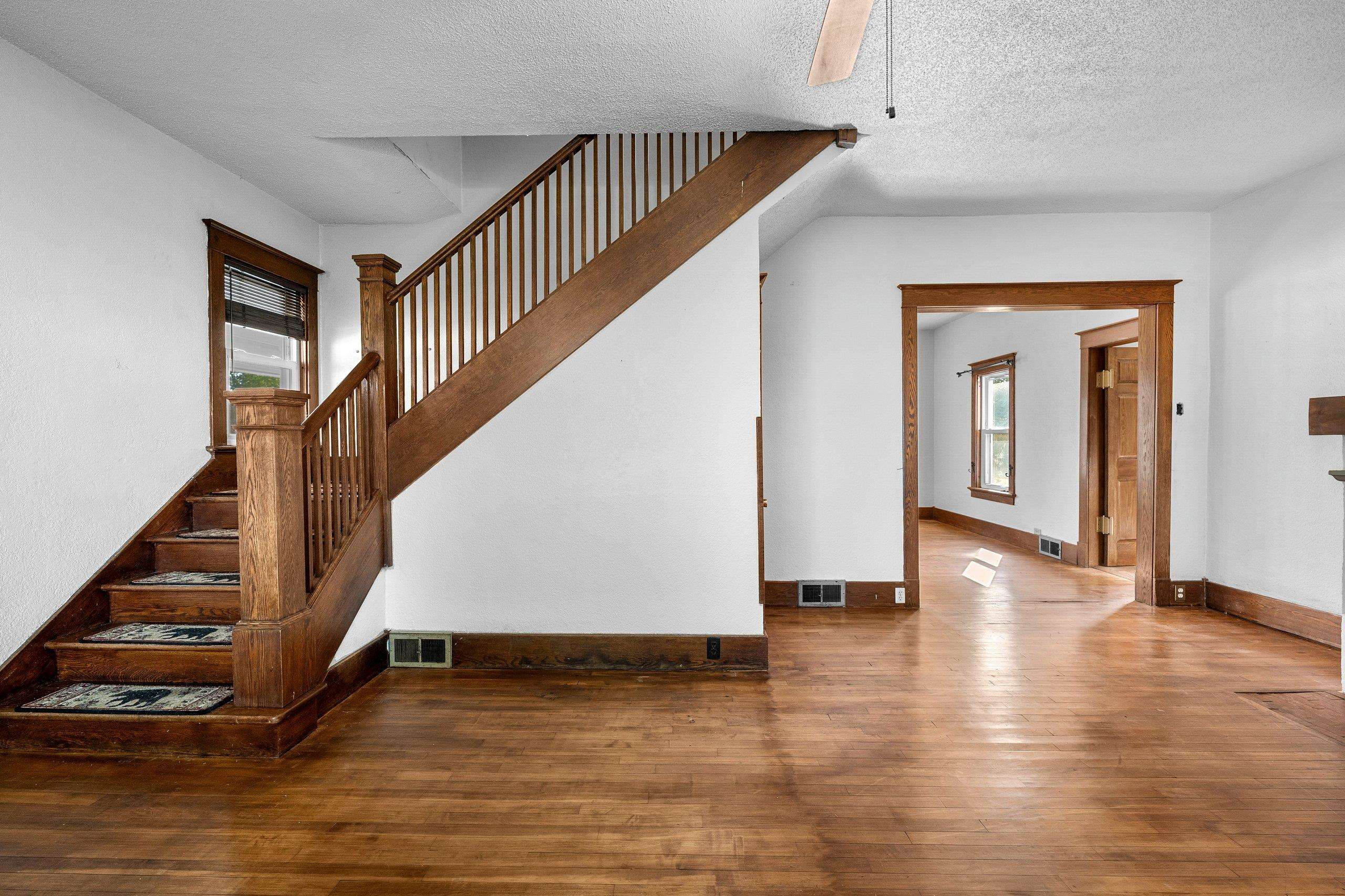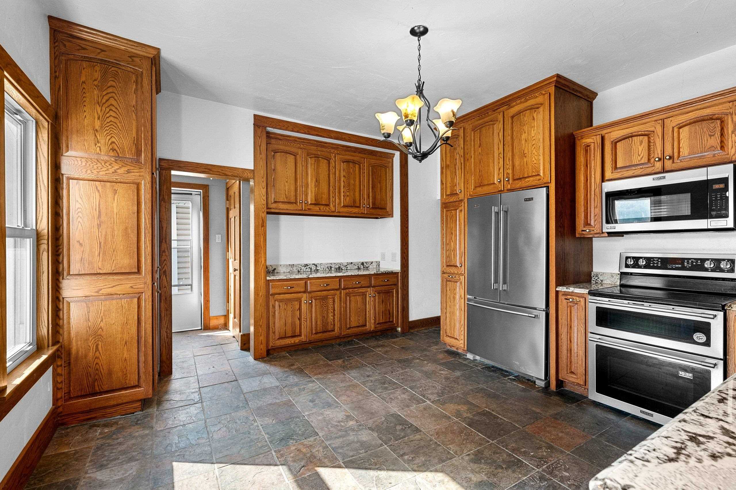 Conveniently located and move-in ready, this spacious home offers meaningful updates throughout. Improvements include refinished hardwood and slate tile floors, a remodeled kitchen, refreshed upper bath with tile walk-in shower, and two pellet stoves for added comfort. The main level flows easily for everyday living and entertaining, while the upper level features four generous bedrooms with walk-in closets. Enjoy a fenced yard with poured-concrete patio, plus a 2-car detached garage, extra parking pad, and a full dry basement ideal for storage and hobbies. With 3,300+ sq ft and an in-town location close to shopping, dining, lakes, and trails, this home delivers space, convenience, and functionality. Some photos virtually staged.
