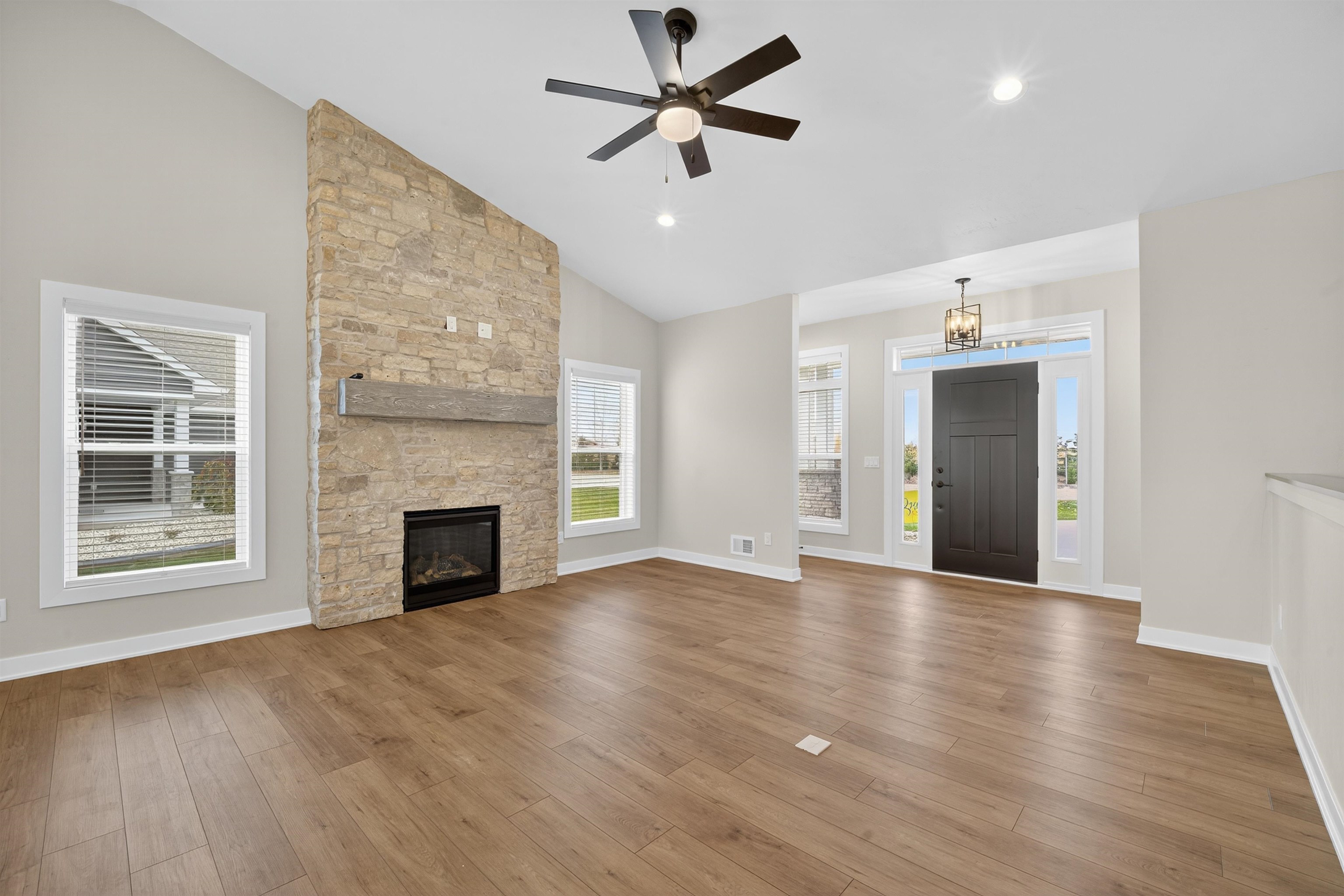 Welcome to your peaceful retreat at Lighthouse Village. This modern condo offers a seamless blend of comfort and elegance, featuring a spacious primary suite and a second bedroom to suit your lifestyle - alongside two stunning, high-end bathrooms. Bring in the natural light through the impressive window lined sunroom and enjoy tranquil garden views. Enjoy open concept living and entertaining with the expansive stone, gas fireplace and beautifully designed kitchen which boasts a large lighted pantry. Need more space? The generously sized basement with egress windows serves as a blank canvas. Beyond your door, experience exclusive access to an open-air clubhouse designed for premier entertainment. A short walk to a private pond stocked with fish. Elevate your lifestyle.