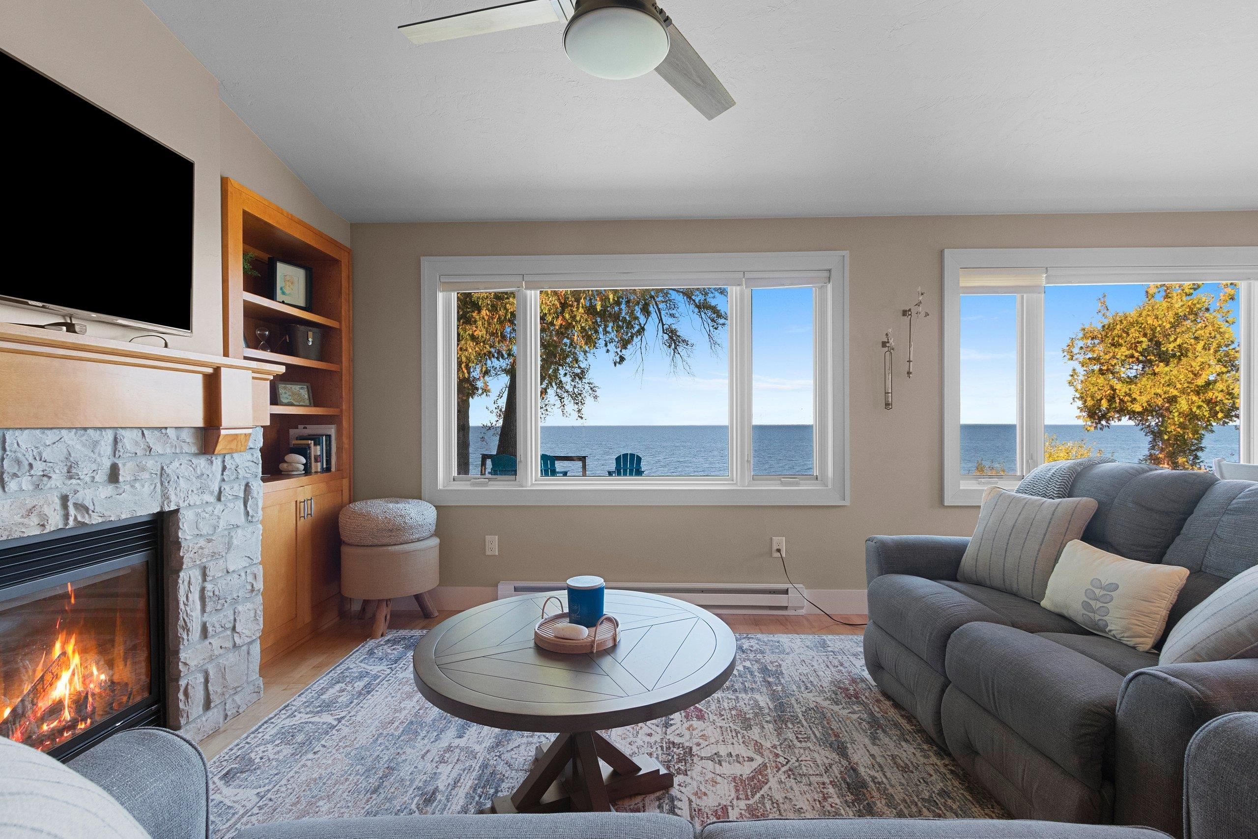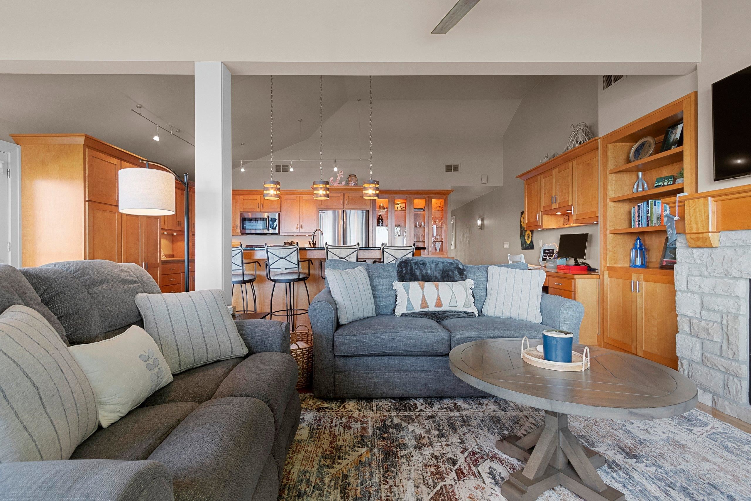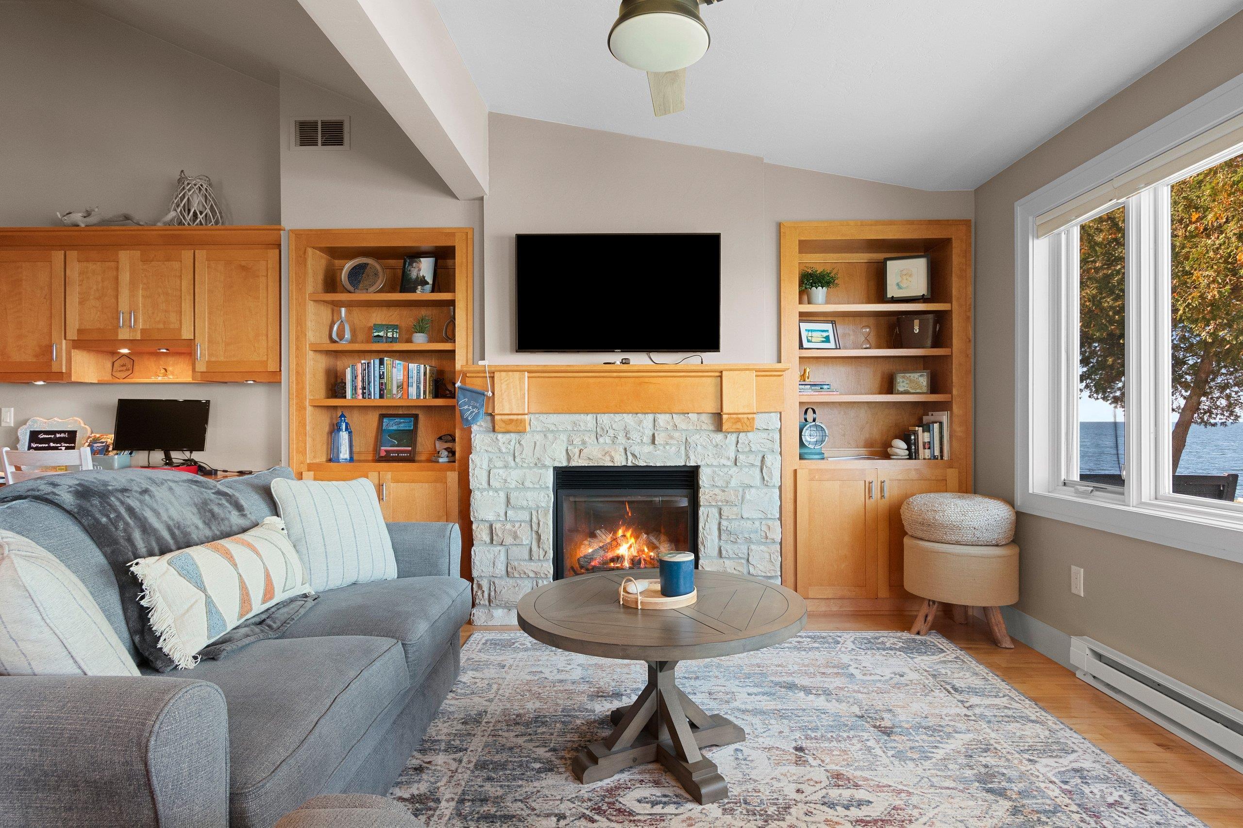 Waterfront summer cottage/condo retreat on the Bay! Completely renovated with quality craftsmanship in 2007 under a prior owner, this 2BR/1.5BA ranch-style condo blends charm, views, and quality. Hardwood floors, Pella windows/doors, custom cabinetry, built-ins, and stone gas fireplace. Open-concept living features cathedral ceiling, granite island, and stainless appliances. New washer/dryer. Propane forced air + A/C. Enjoy sunsets from inside or your Trex deck, evenings by the firepit, and 445’ of shared waterfront. Community amenities include pool, basketball courts, & green space. With low $1,500 HOA dues and income potential, this is a perfect get away or vacation rental. Pride of ownership!
