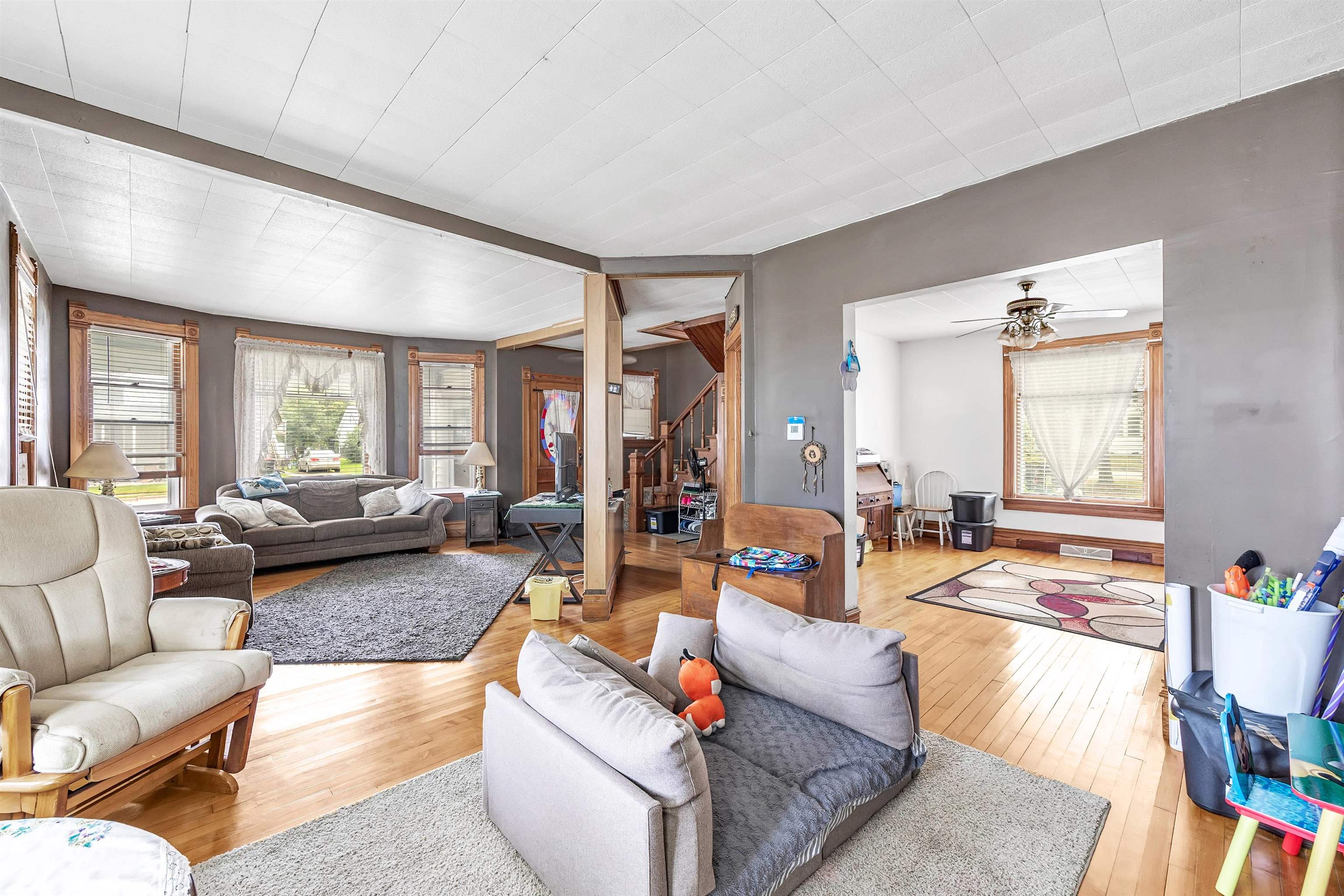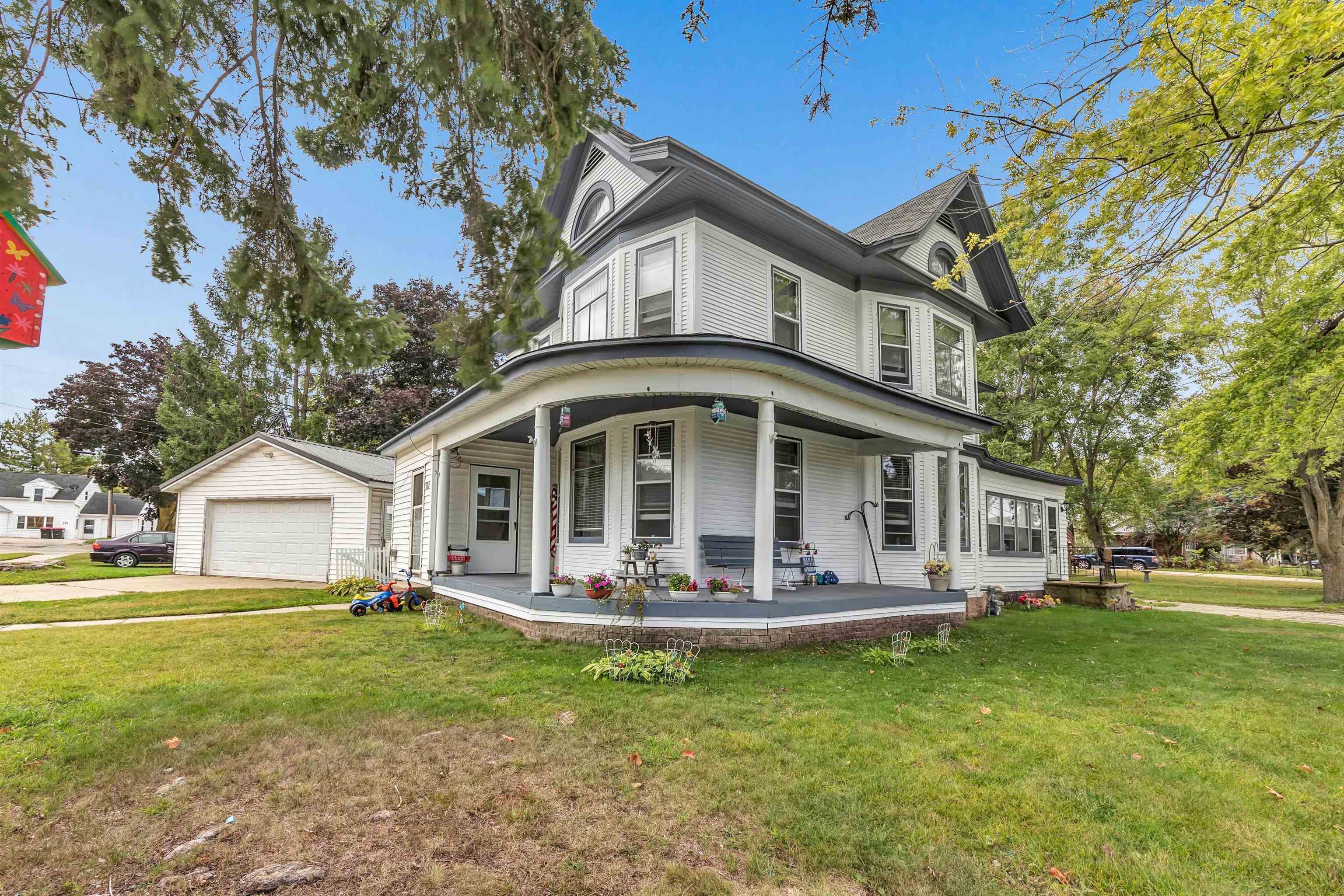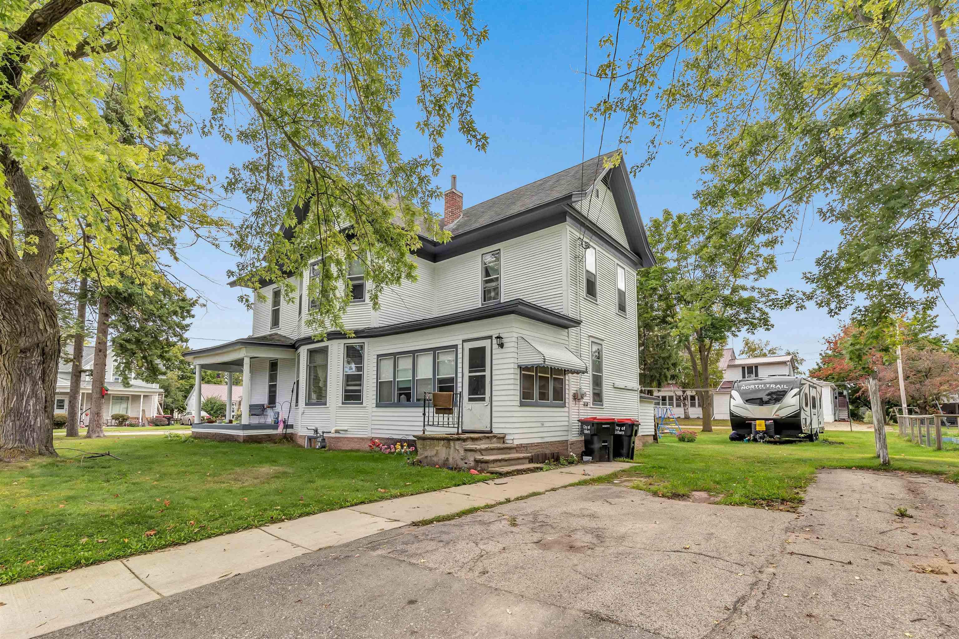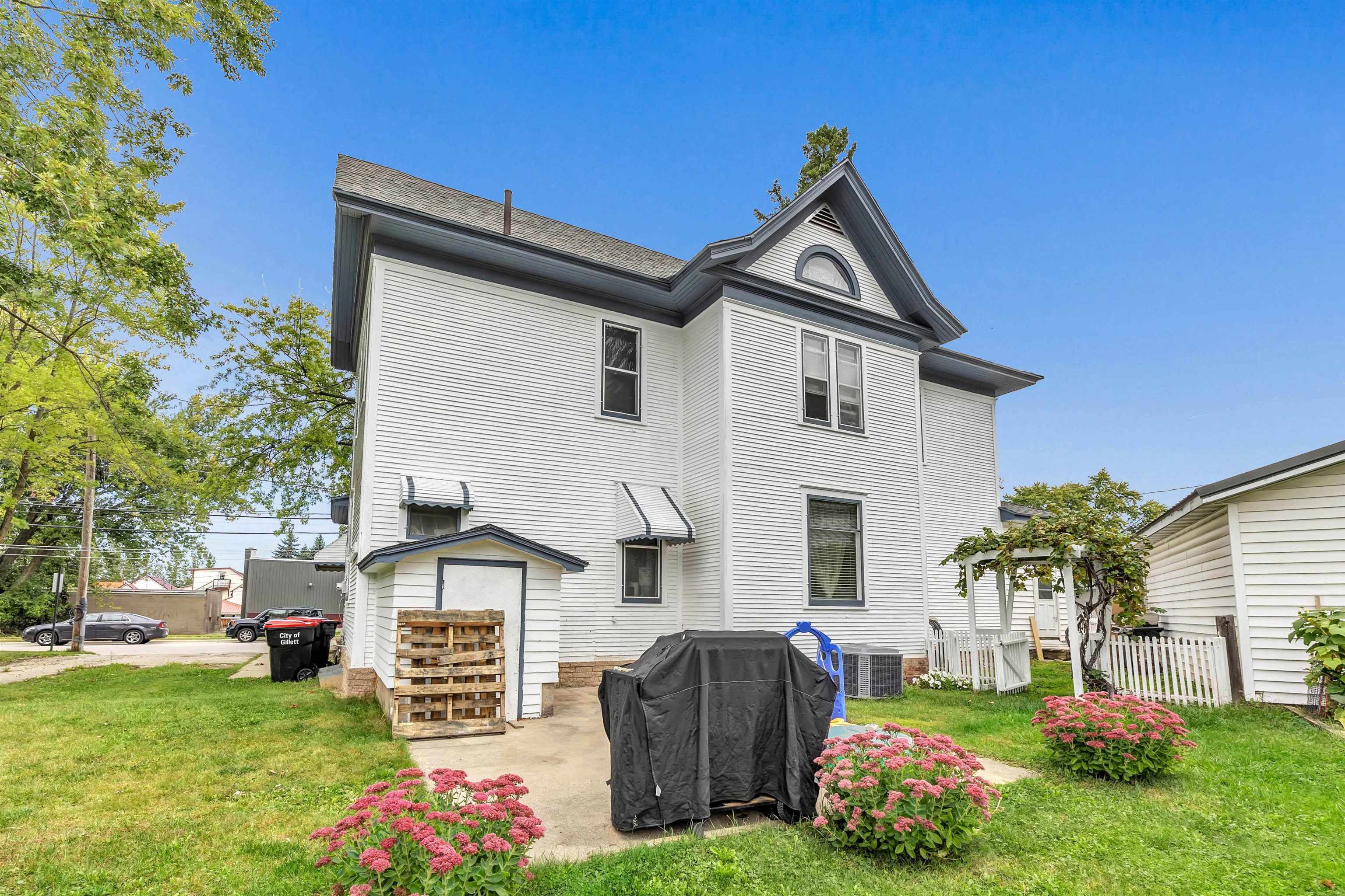 4 bed, 1.5 bath two-story home with wraparound porch and detached 2-stall garage. Spacious main level offers large living and dining rooms with original woodwork and tall ceilings. Kitchen has plenty of cabinet space and room to update to your style. Upper level features 4 bedrooms with natural light and a full bath. Yard provides outdoor space. Convenient location near downtown Gillett, parks, and local amenities.