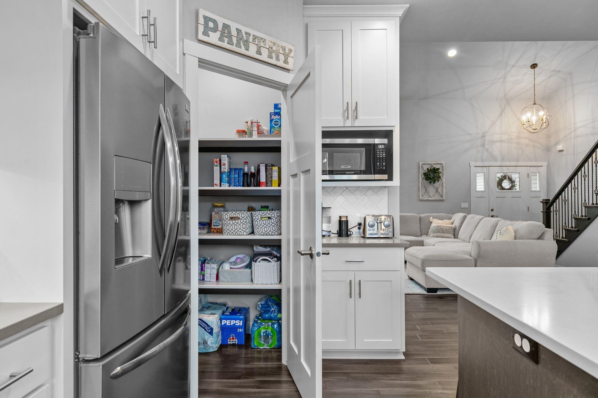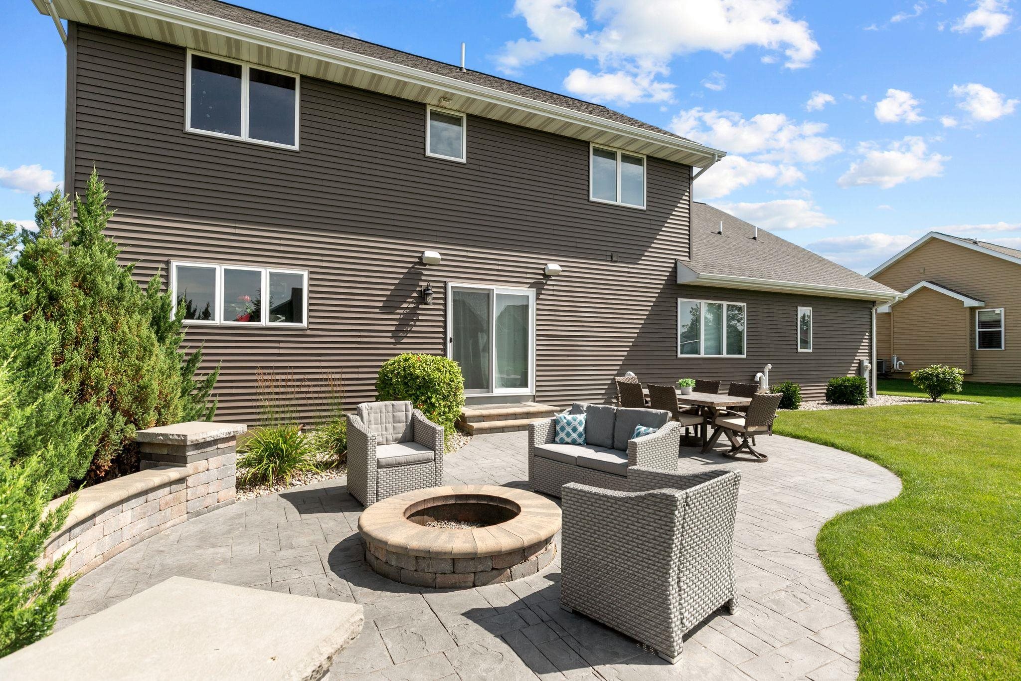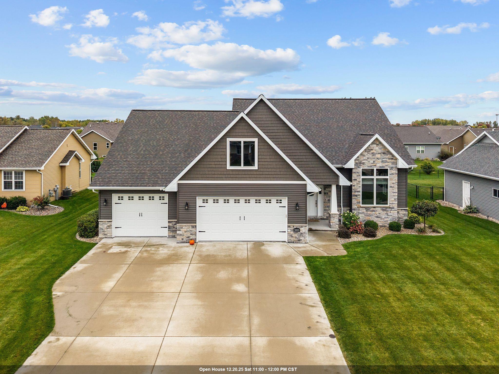 Welcome to your dream home! This elegant 5-bedroom, 3.5-bathroom two-story residence features a spacious 3-car garage, including an extra-deep stall. The bright living room boasts vaulted ceilings & a cozy fireplace, while the beautiful kitchen includes a large island, pantry, & stone countertops. First-floor laundry adds convenience. The primary bedroom features an ensuite bathroom with a walk-in shower & dual walk-in closets. Three additional bedrooms & a full bathroom can be found on the second floor. The finished lower level includes a bar area with a fireplace, a fifth bedroom, a full bathroom, & a bonus exercise room. Garage access is available from the basement. ALL drawers & cabinets are soft close, plus an in-ground sprinkler system with a weather station. Don’t miss this one.