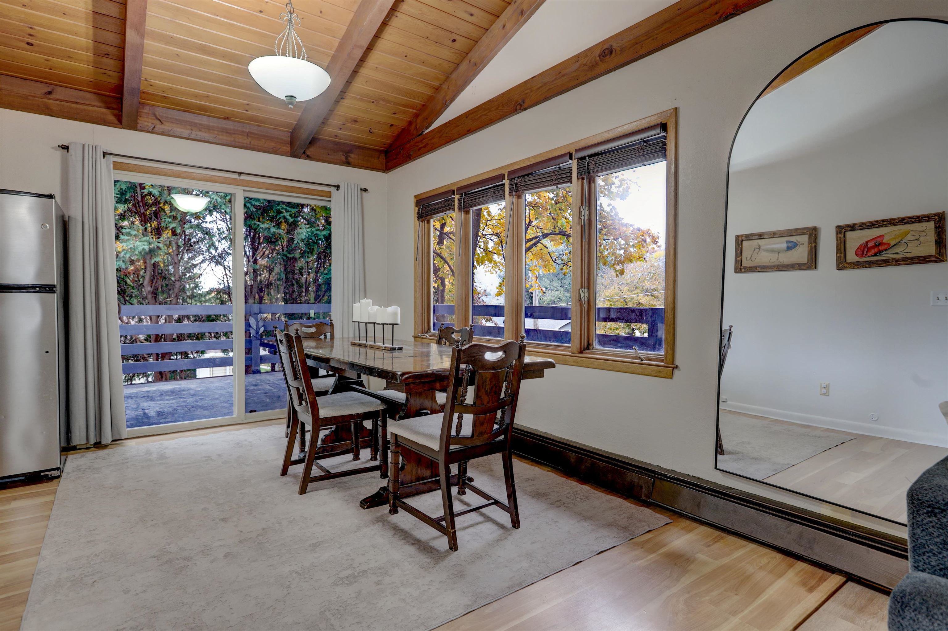 Welcome to this 4 bedroom, 2 bathroom home designed with tongue and grove vaulted ceiling on upper level. This home has a cabin like feel. All bedrooms are big in size, 2 on lower and 2 on upper level. Home has mini-split AC system. Large Laundry room in lower level has painted concrete floor. Both bathrooms have been updated. Huge backyard features New Vinyl Fenced most of the yard has been fenced-in. Wrap around deck of off dining area. Attached 2 car garage. All Appliances included plus more. New flooring in Living room and most of the interior has been painted. Home is move in ready. Set up your showing before it is gone. 4th Bedroom could also be used as a family room or office, lots of options. This is a MUST SEE! Close to Schools, parks and shopping.