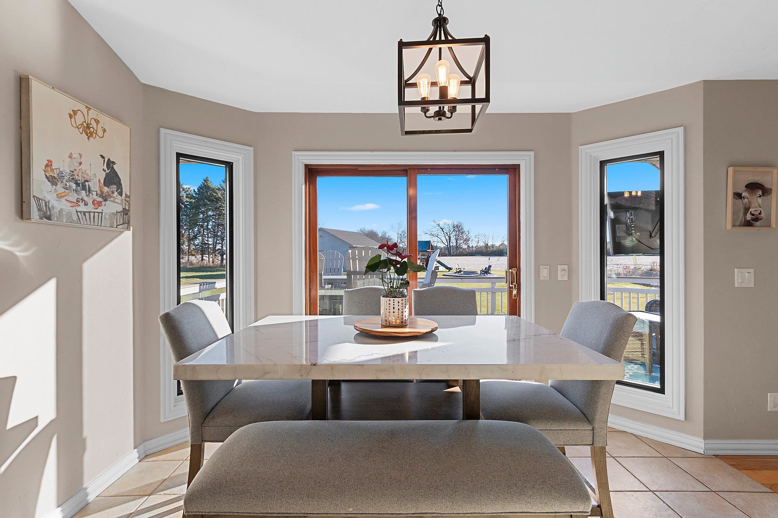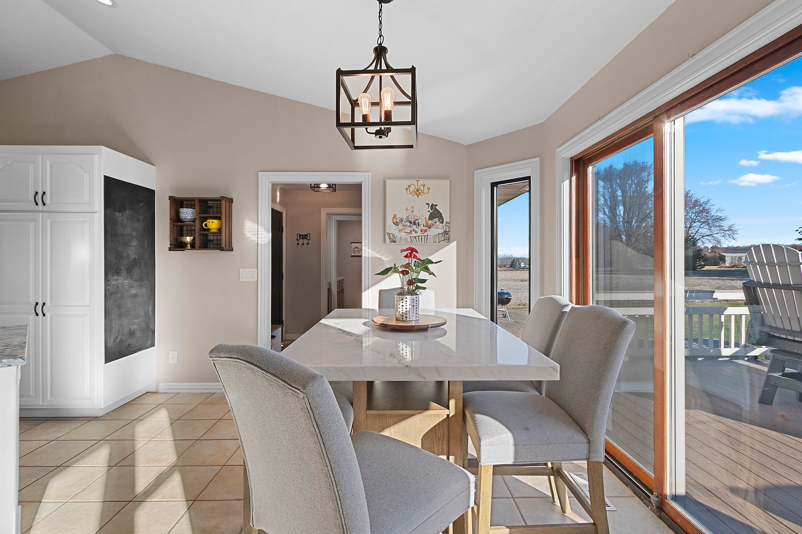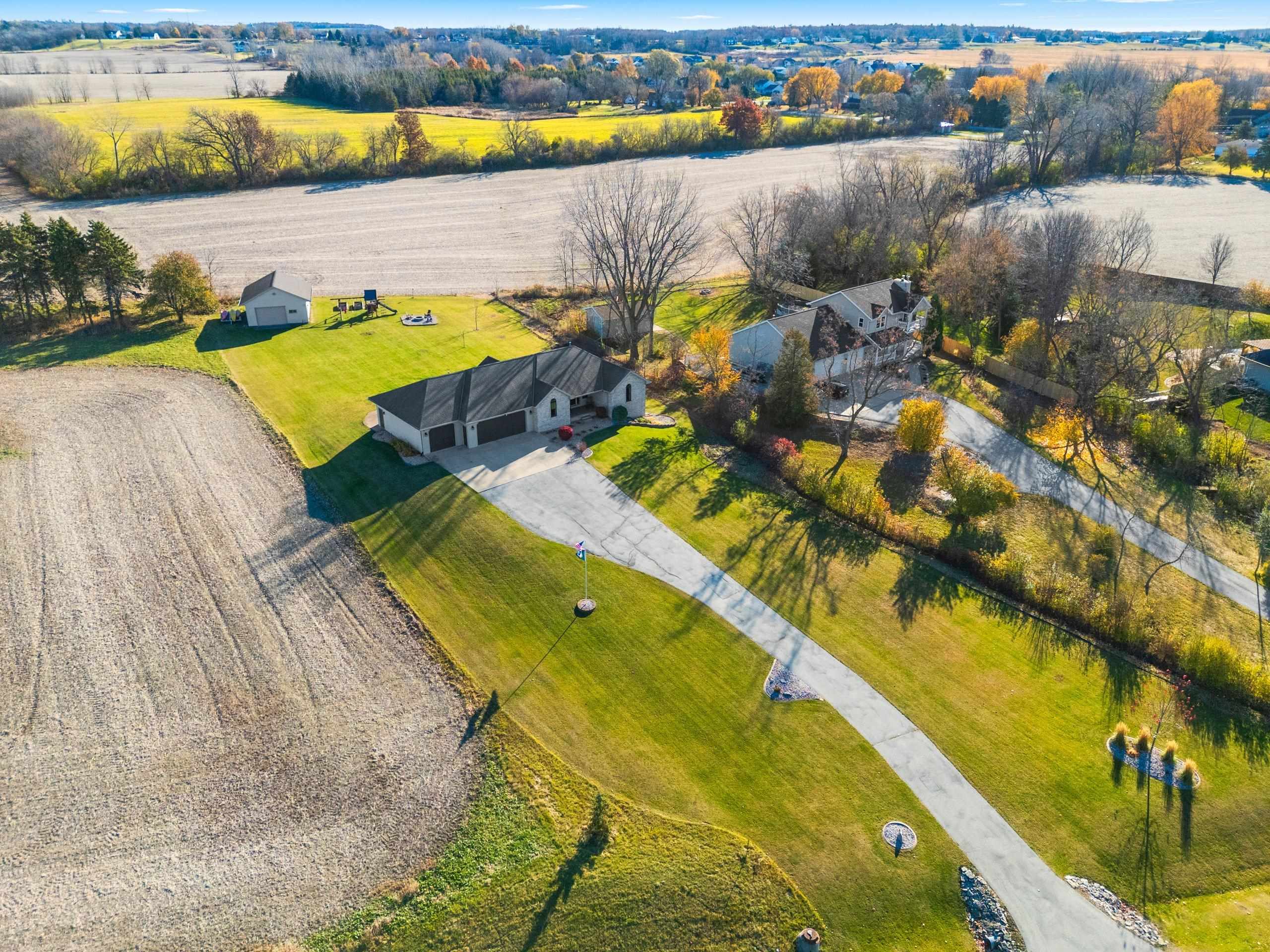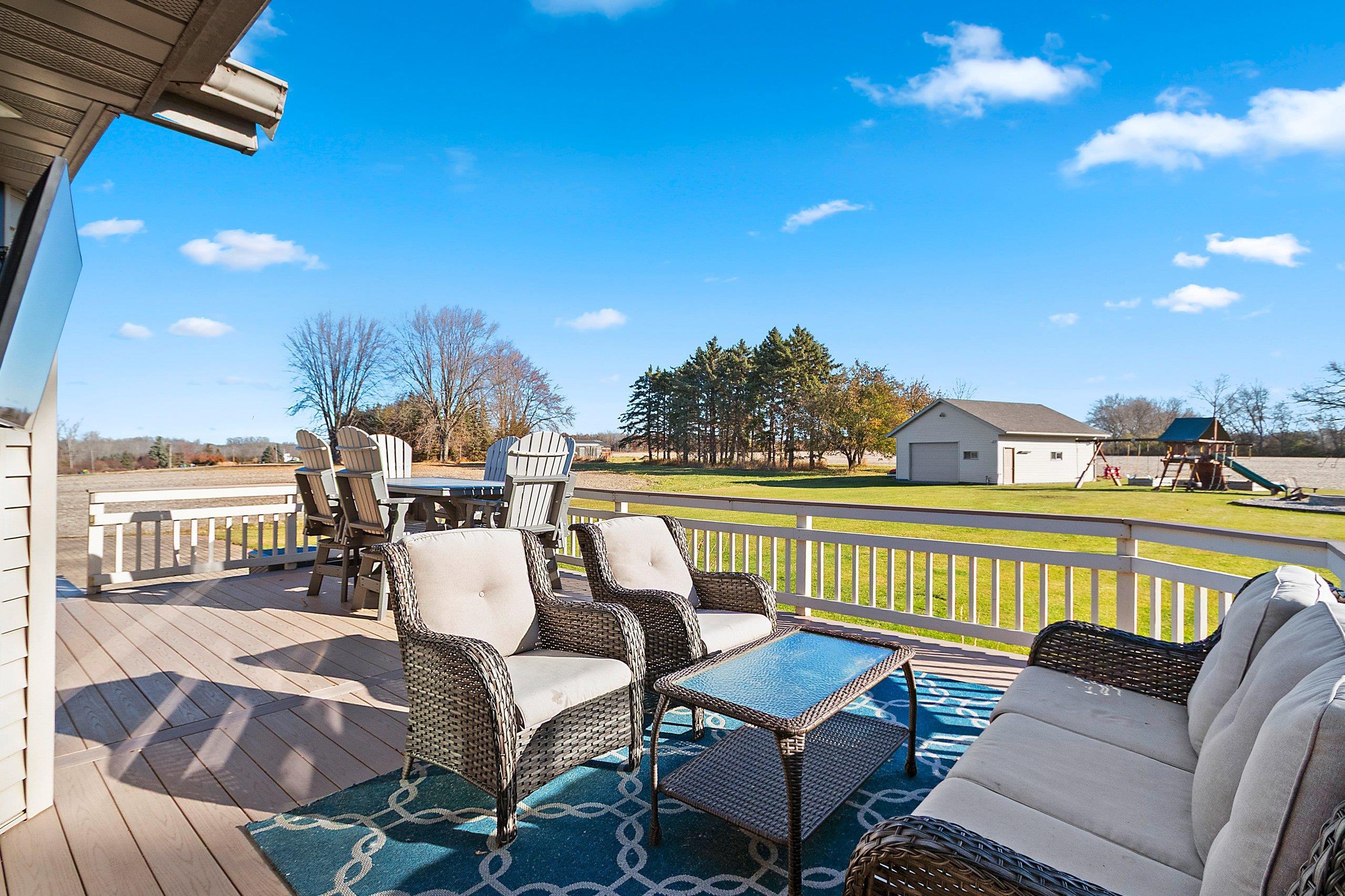 Stunning open-concept home set on a 1-acre lot offering the perfect blend of convenience and tranquility. Enjoy sunrises over the backyard and sunsets across the bay. The main level features a primary suite with a walk-in closet and private bath, plus two additional bedrooms and laundry room. The airy kitchen and dining area flow seamlessly to the deck and patio—perfect for entertaining. The finished lower level includes a family room, bedroom, full bath, office, and bonus room. Enjoy a heated 3 stall attached garage with basement access, plus a heated 2.5-stall detached garage for extra storage or workspace. Surrounded by open fields and visiting wildlife, this home offers peaceful privacy with bay views just minutes from town amenities. Close proximity to Eagles Nest Boat Launch