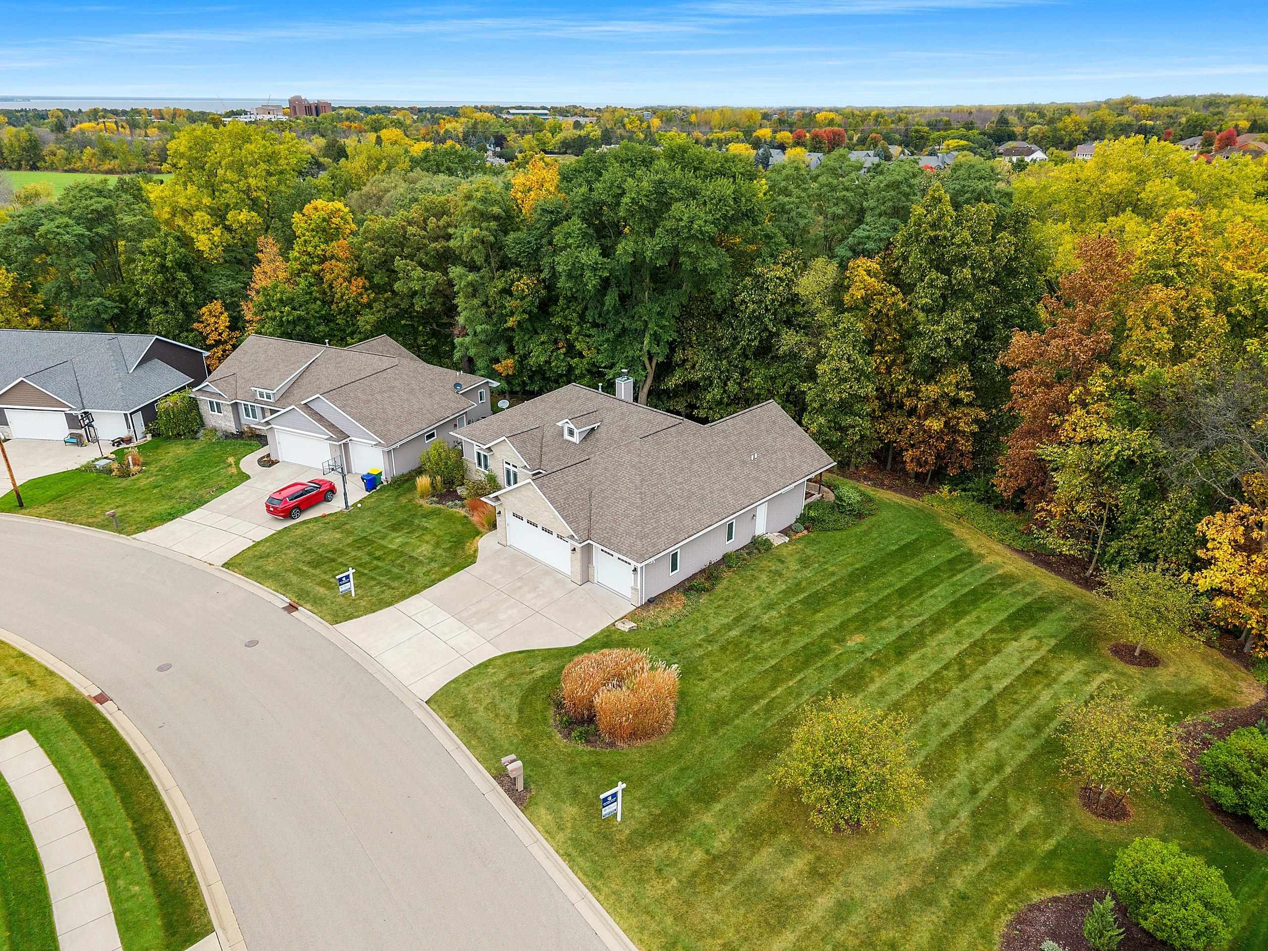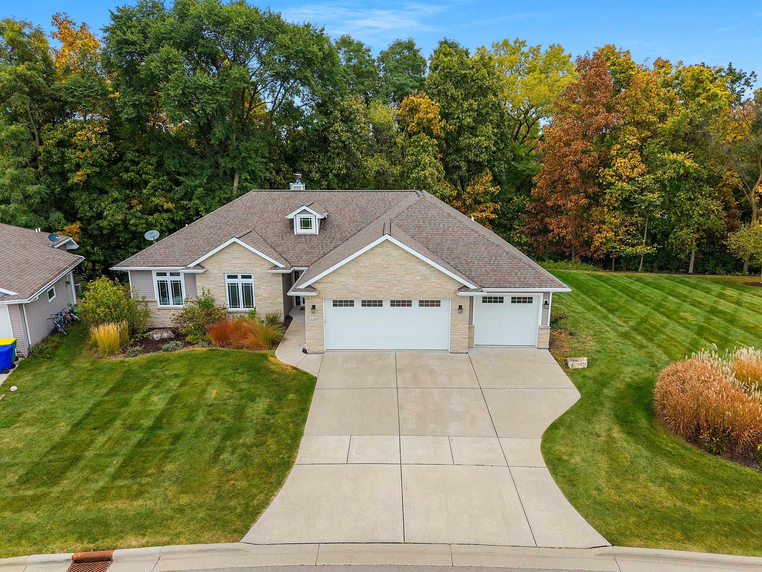 Beautifully designed 2,000 SF lookout ranch featuring a no-step entry and open concept layout ideal for comfortable living. The kitchen boasts solid surface countertops, a center island, and a walk-in pantry, opening to the spacious great room with 9' ceilings and hickory hardwood floors. Enjoy peaceful views from the bright sunroom overlooking a gorgeous (.9 acre per assessor) wooded lot. The primary suite offers a private bath including a no-step shower for ease of access. Quality finishes continue throughout, with granite countertops in baths and thoughtful details in every room. The extra-deep, finished 3-stall garage is insulated and offers basement access and space for vehicles, storage, or hobbies. A perfect blend of style, function, and accessibility! Adjacent lot also for sale.