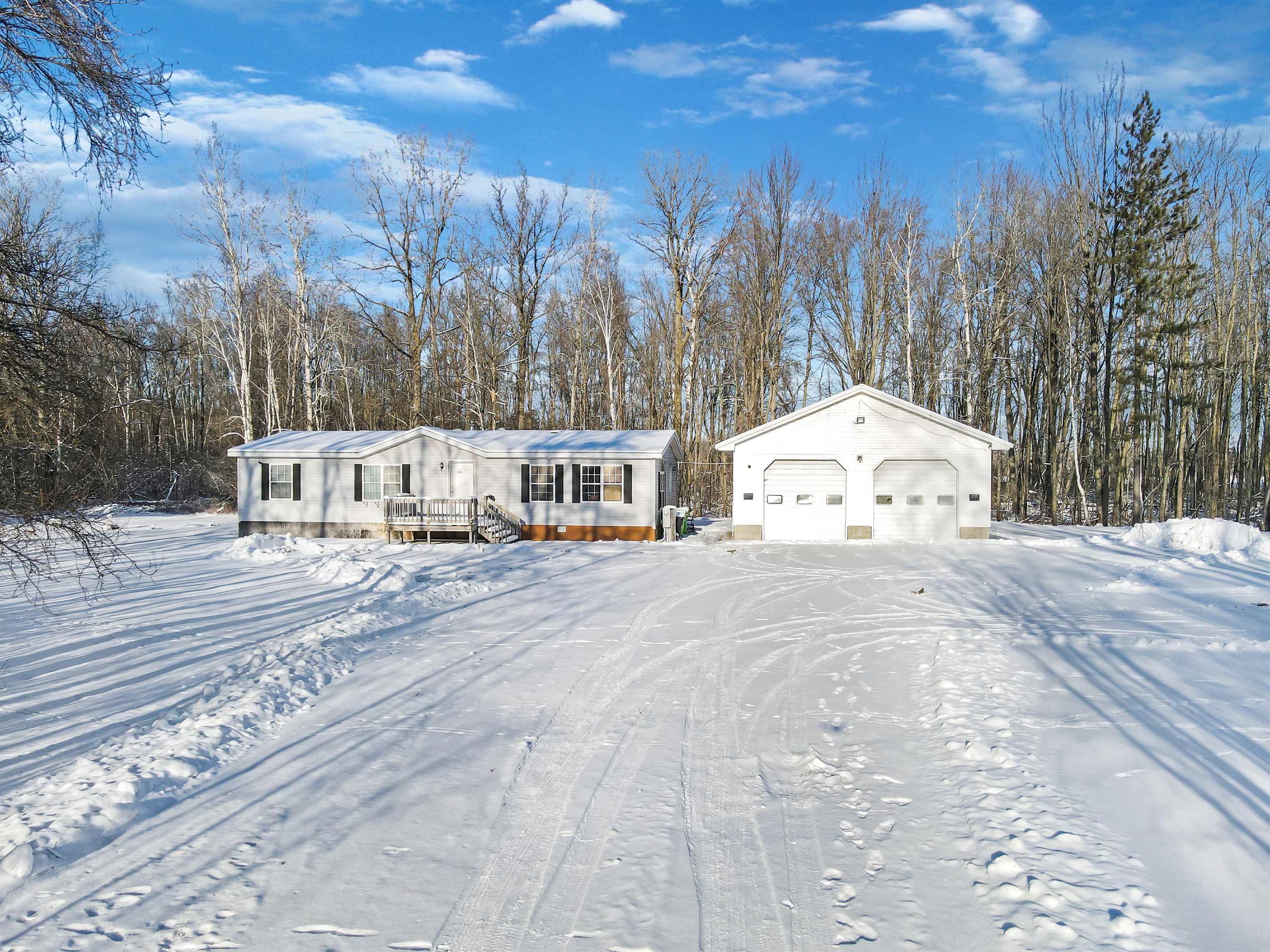 Enjoy comfortable one level living on 5.55 wooded acres in a peaceful county setting. This 3 bedroom 2 full bath home offers a welcoming layout with vaulted ceilings & a spacious primary suite with a walk in closet. The home includes all appliances, making it easy to settle right in. A 2.5 stall detached garage provides excellent space for projects or storage & includes an LP heater, air compressor & vehicle lift. 2 semi trailers offer additional storage. The drilled well & mound system w/alarm were installed in 2000. Ideal for outdoor enthusiasts or hobbyists seeking space, privacy, & potential. Estate property being sold as-is. Offers will be reviewed on Monday January 19th at 5:00 pm