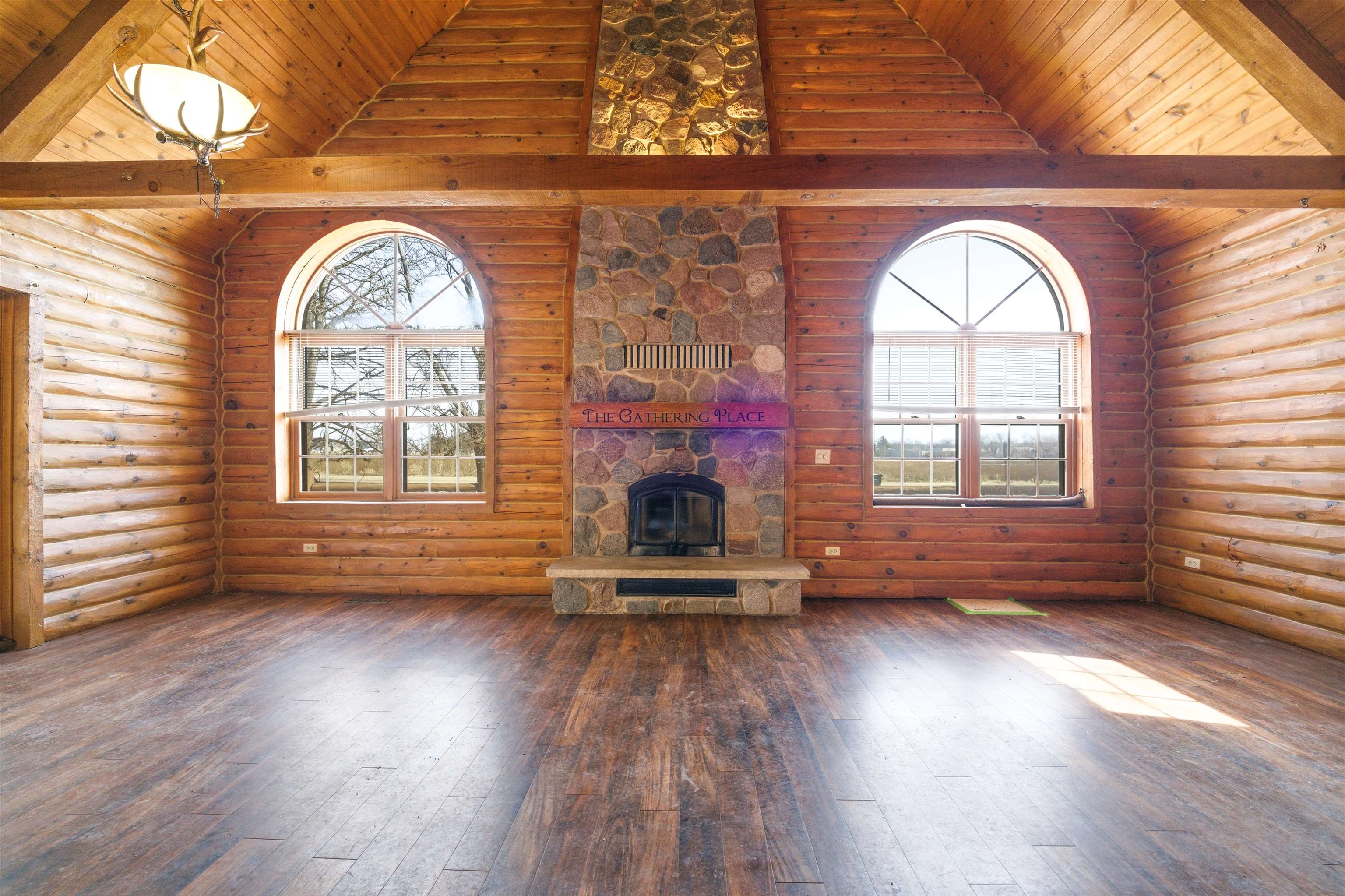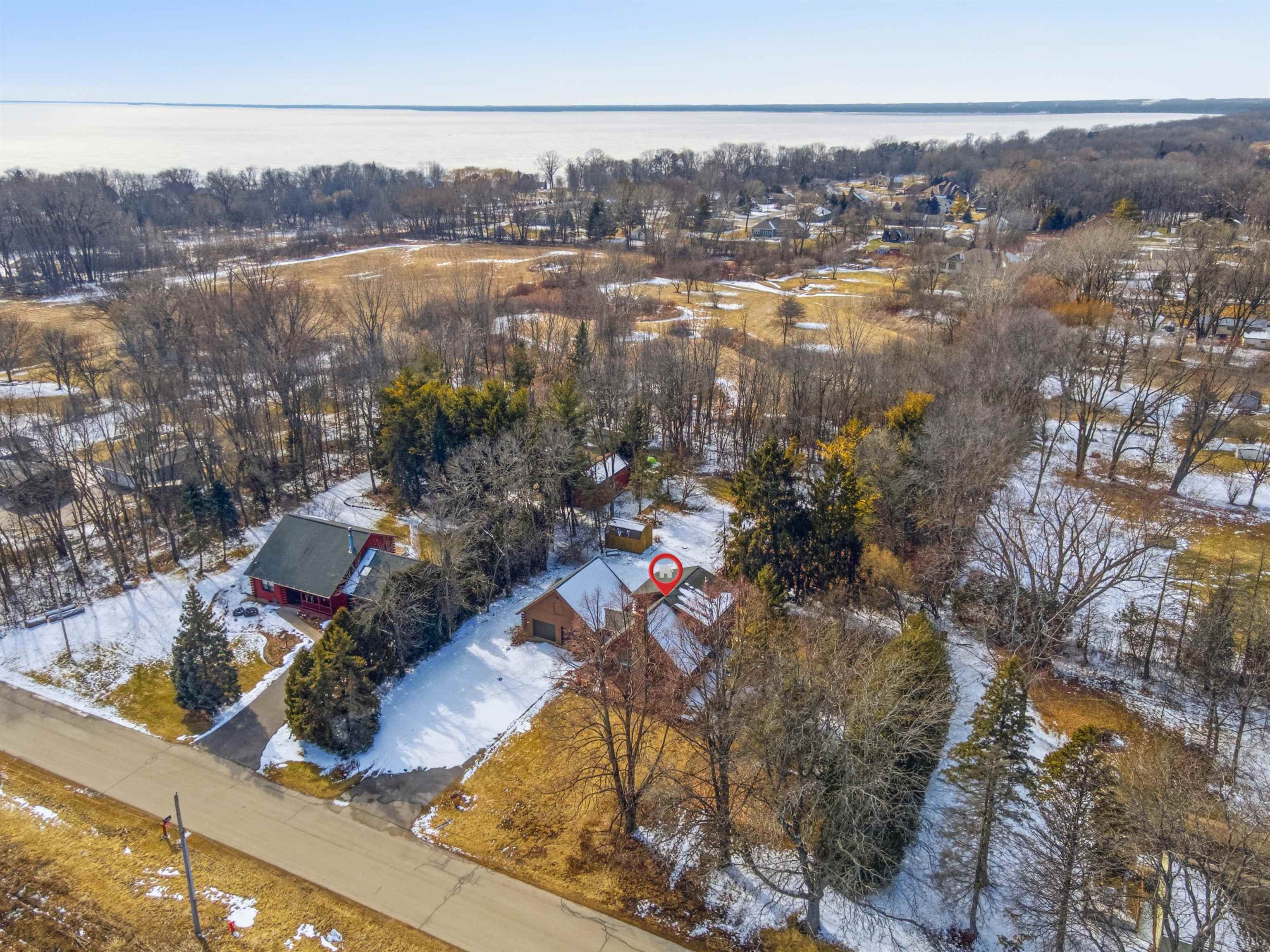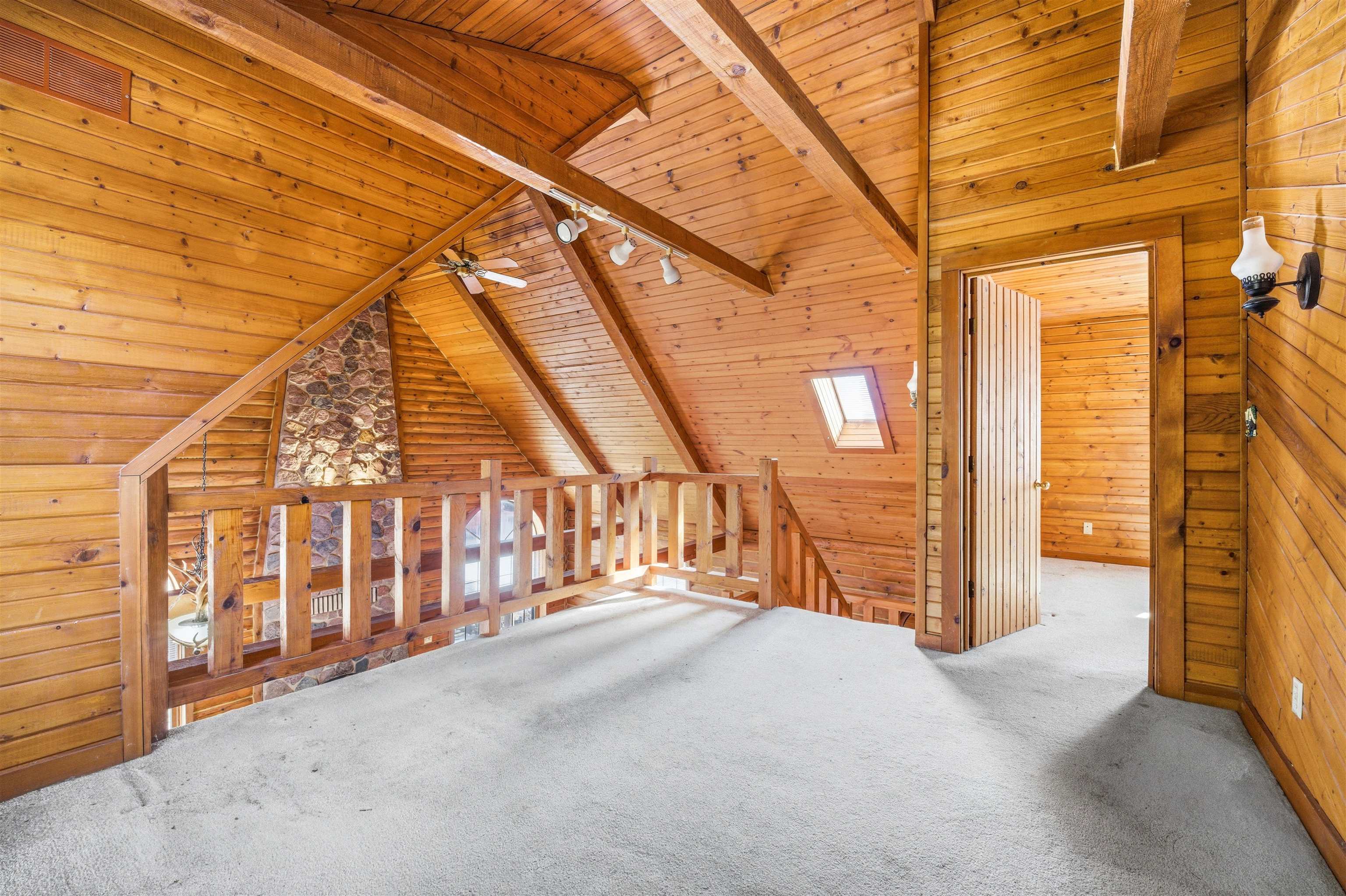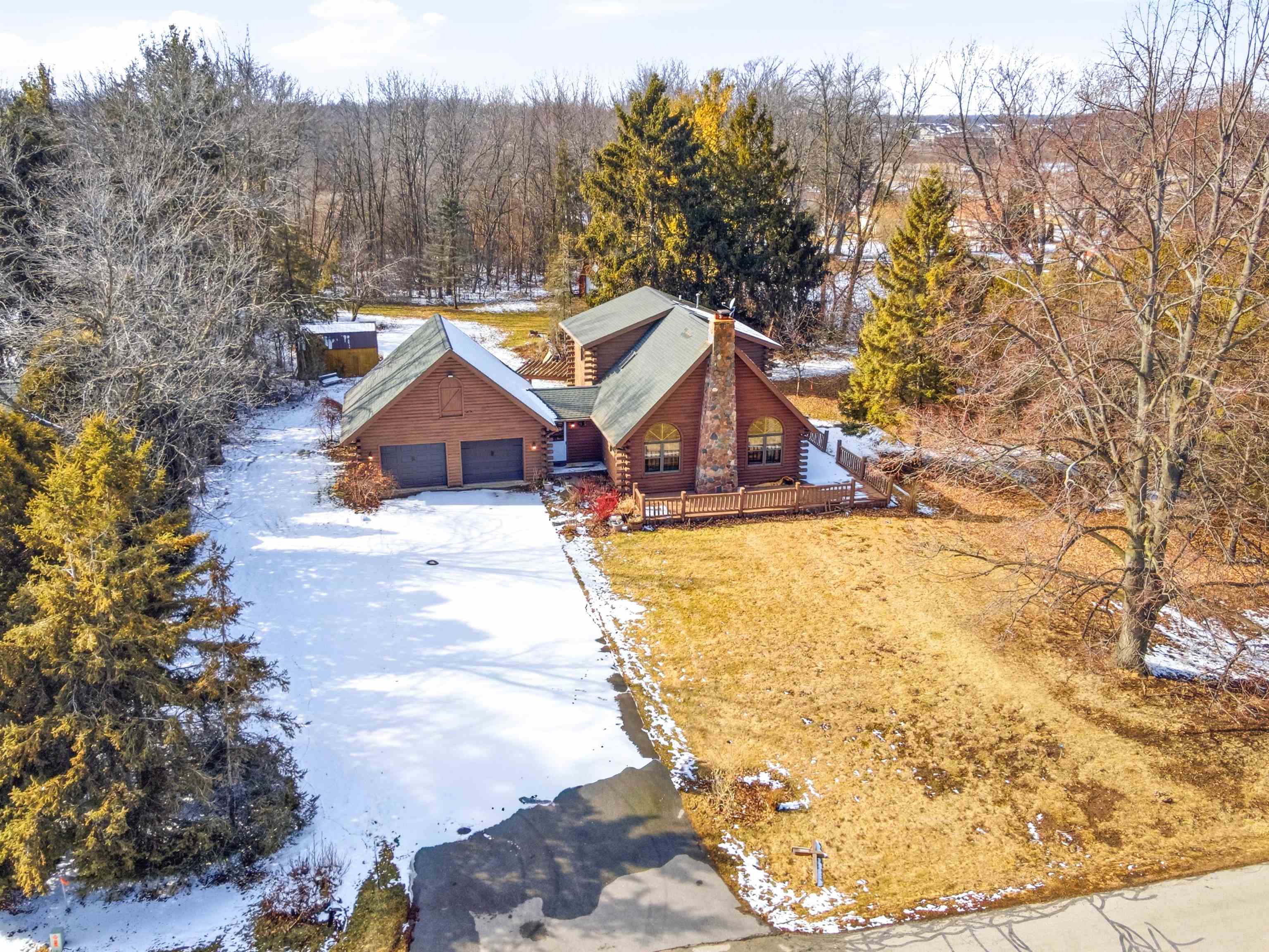 Nestled on nearly an acre, this distinctive log home offers rustic charm with an exposed stone two-story fireplace, arched doorways, and a wraparound porch. The soaring great room features a floor-to-ceiling fireplace flanked by windows. The efficient eat-in kitchen includes a snack bar. Main-floor ensuite offers dual closets, dual bath access, private deck, and first-floor laundry. Upstairs loft overlooks the great room, plus second suite with walk-in closet. Full basement stubbed for bath, 2.5-car garage, and two sheds. Close to Lake Winnebago and public boat launch. Sold as-is by guardian.