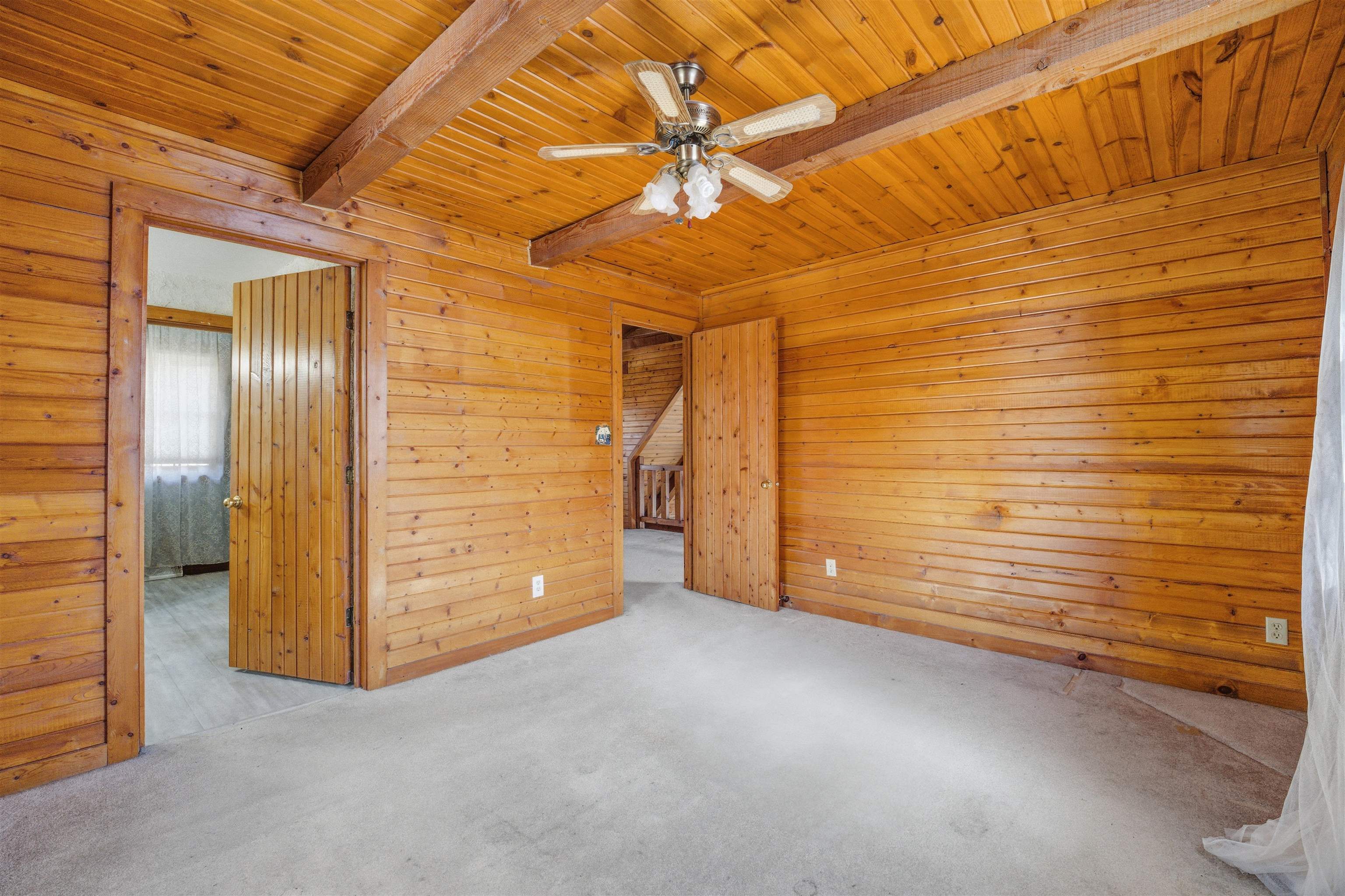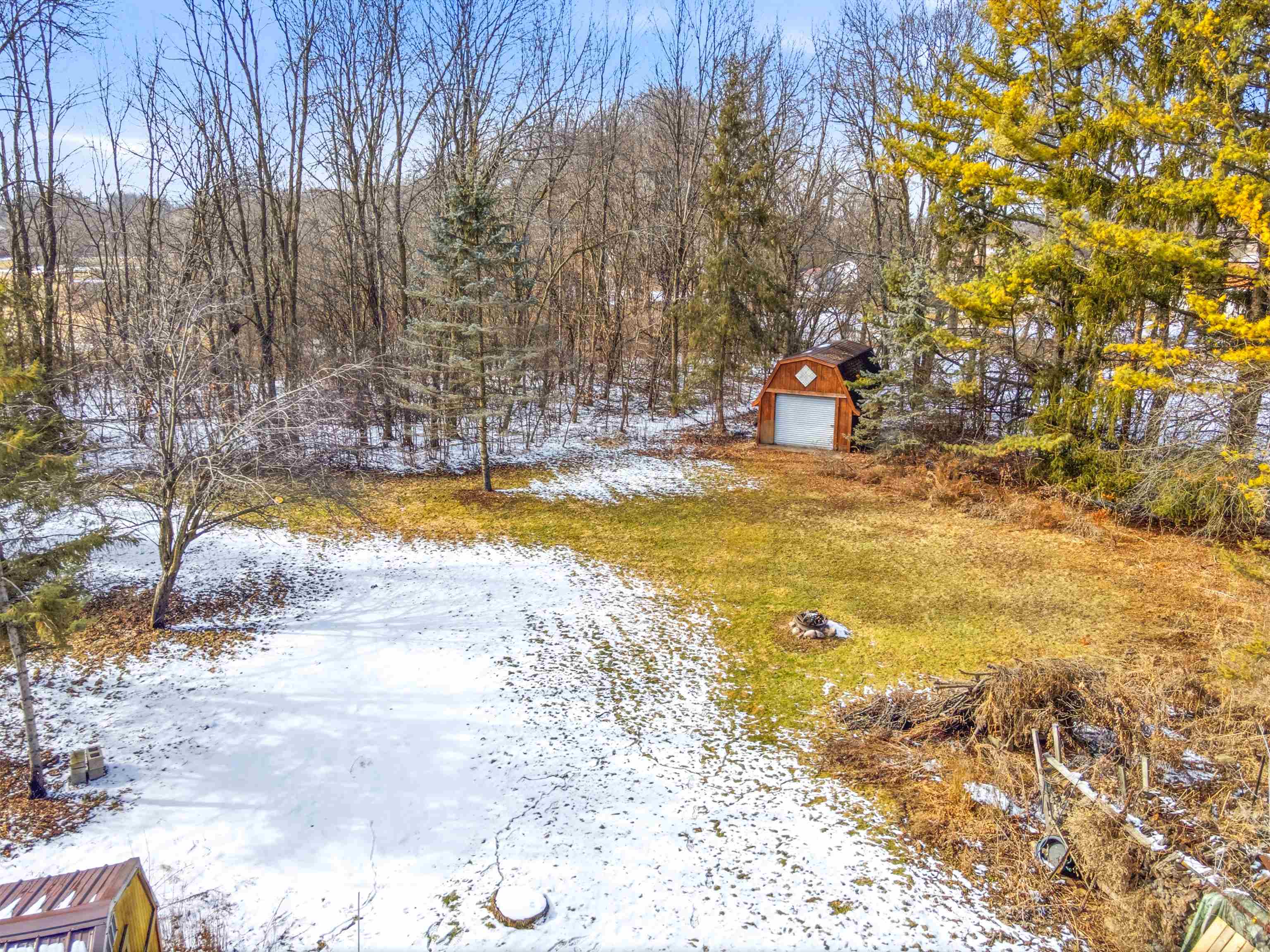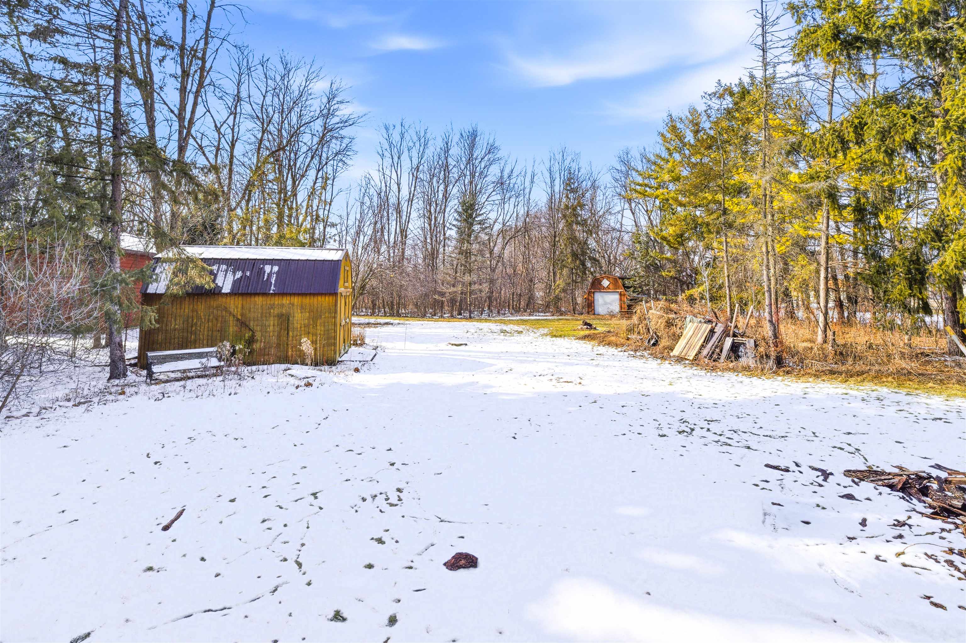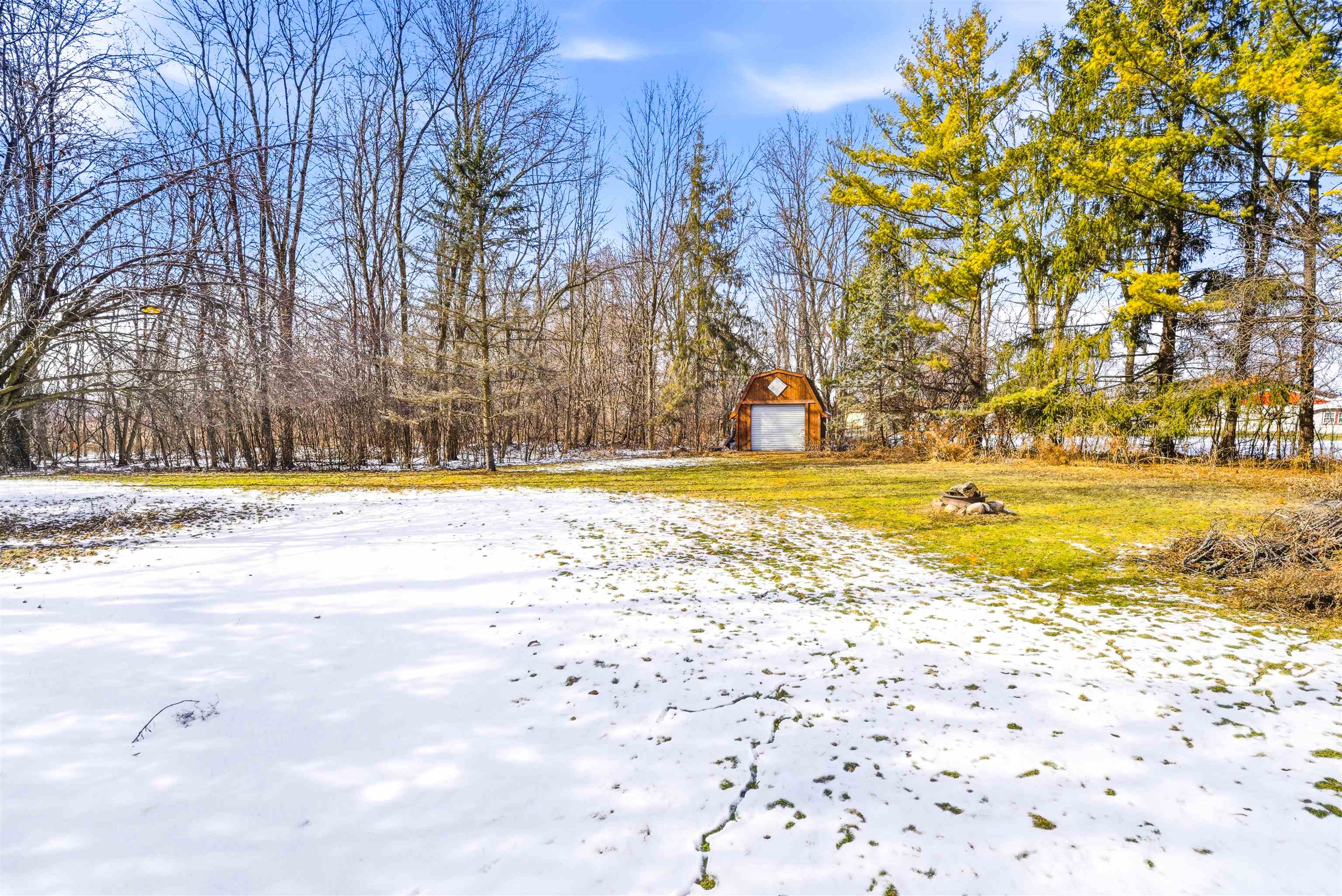 Nestled on nearly an acre, this distinctive log home offers rustic charm with an exposed stone two-story fireplace, arched doorways, and a wraparound porch. The soaring great room features a floor-to-ceiling fireplace flanked by windows. The efficient eat-in kitchen includes a snack bar. Main-floor ensuite offers dual closets, dual bath access, private deck, and first-floor laundry. Upstairs loft overlooks the great room, plus second suite with walk-in closet. Full basement stubbed for bath, 2.5-car garage, and two sheds. Close to Lake Winnebago and public boat launch. Sold as-is by guardian.