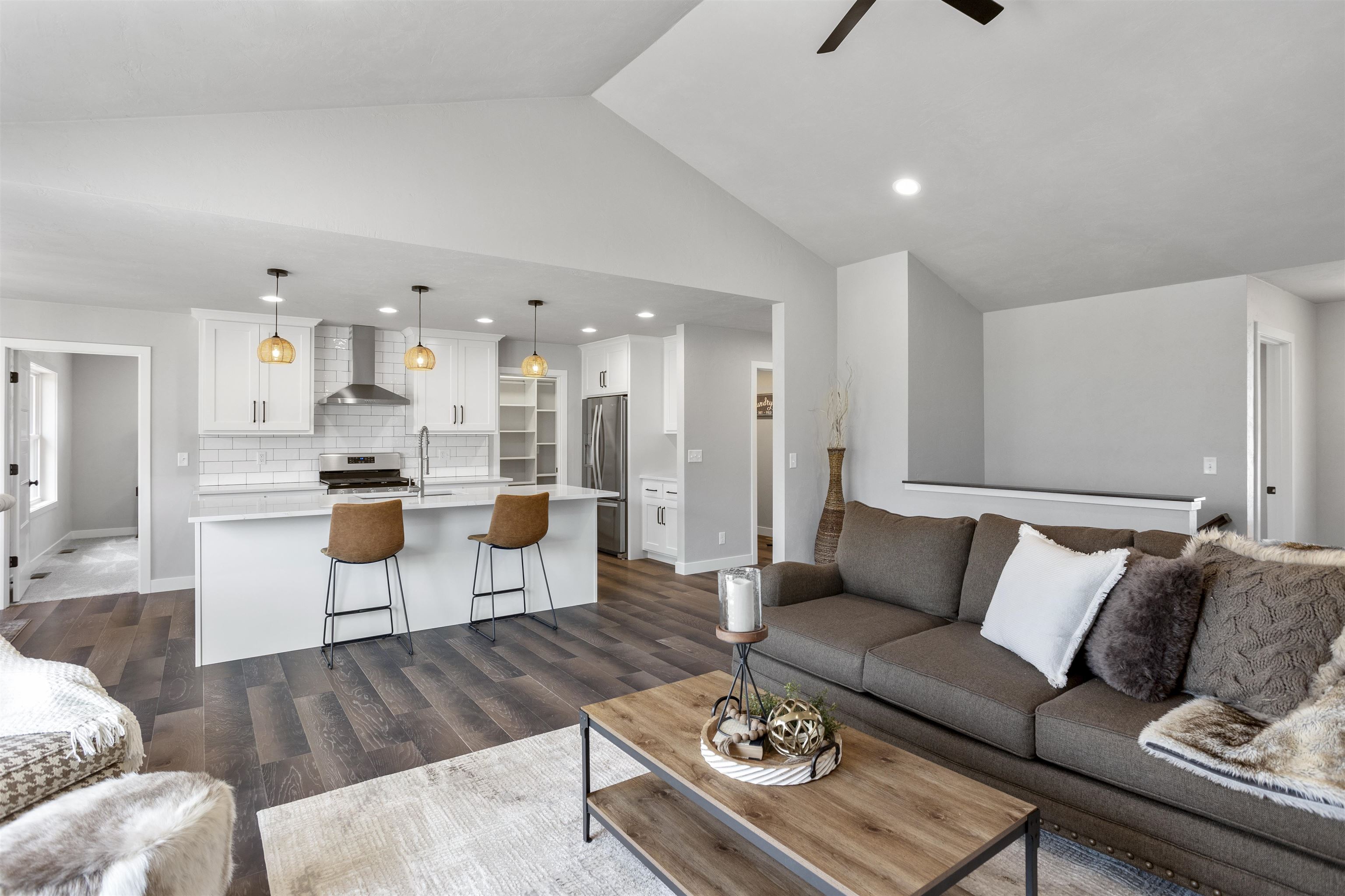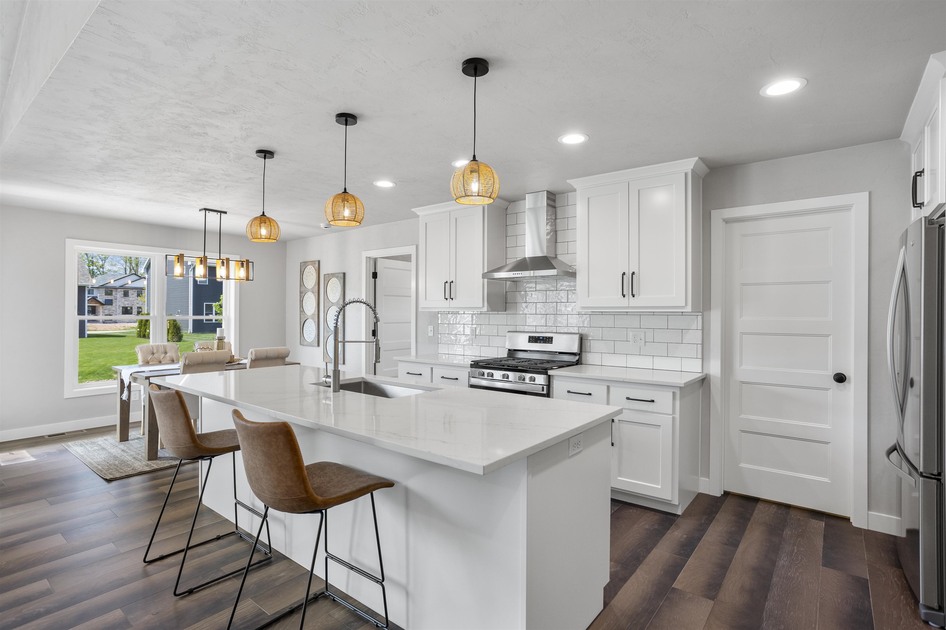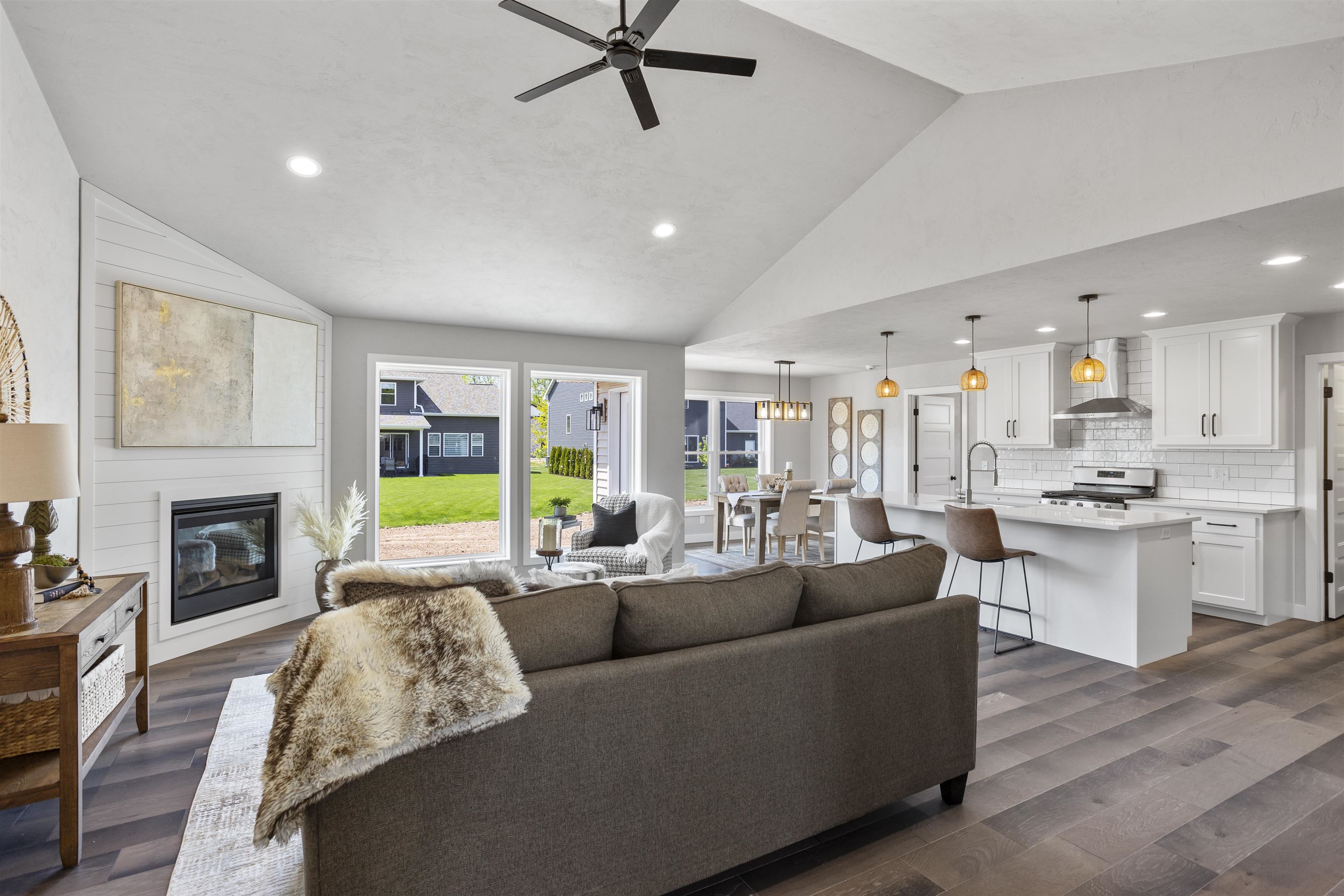 This luxury split bdrm ranch offers an open concept floor plan designed around the space where life is most lived! Step inside to be greeted by foyer w/access to home office. The GR features volume ceilings, tall windows & gas FP. A chef's kitchen includes SS appliances, quartz counter, center island, HUGE walk-in pantry & subway tile backsplash. The bump out dining area is surrounded by windows & includes a glass door to the backyard. The primary suite will sure be the favorite retreat w/tile shower, quartz dual vanity & California closet. Enjoy split bdrm design w/2 bdrms & common full bath on the opposite side of the home. Additional features include: FF Laundry, LL w/FR w/FP, 4th bdrm & 3rd bath, Engineered hardwood floors, 3 car garage & Kimberly Schools! Photos of similar home.