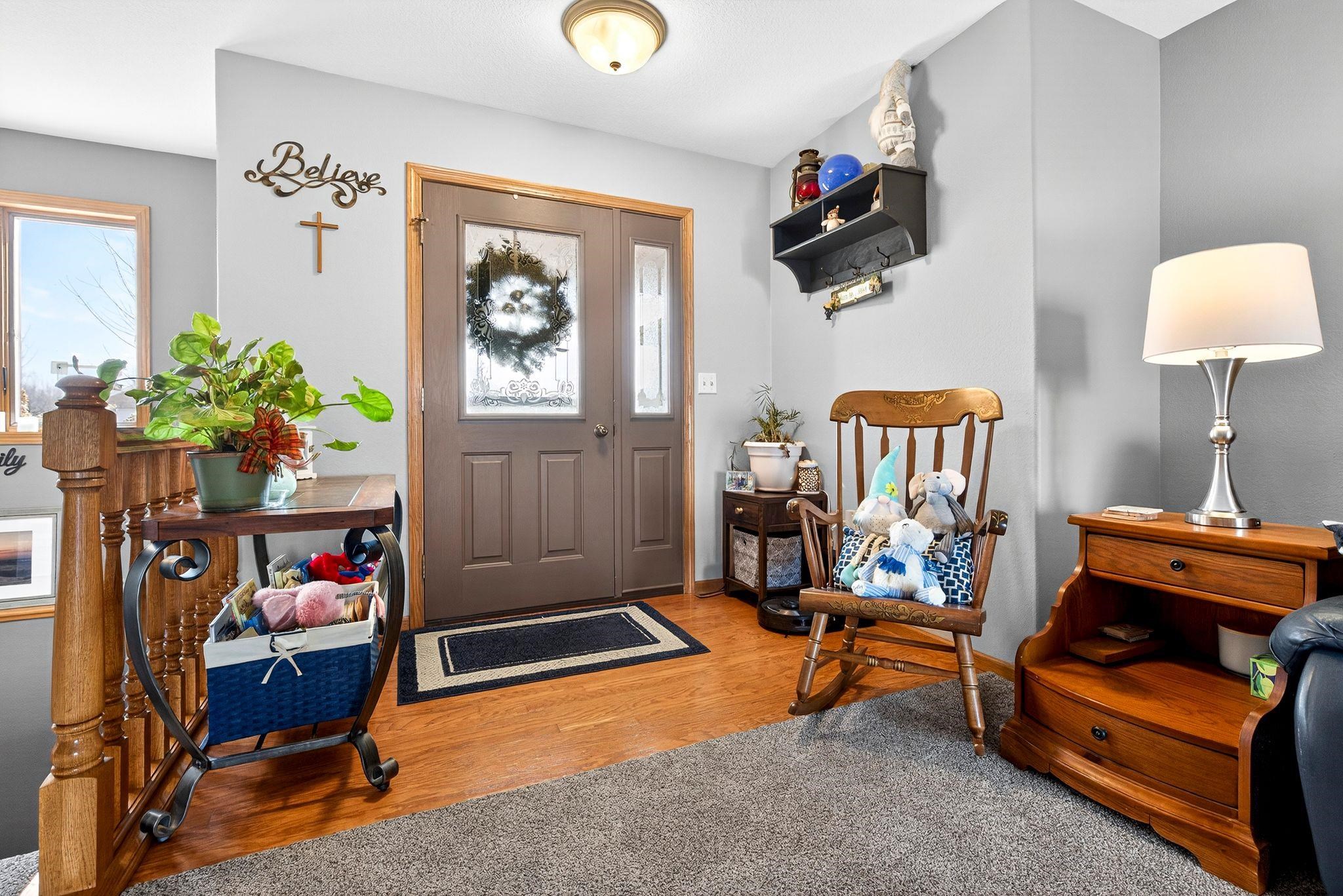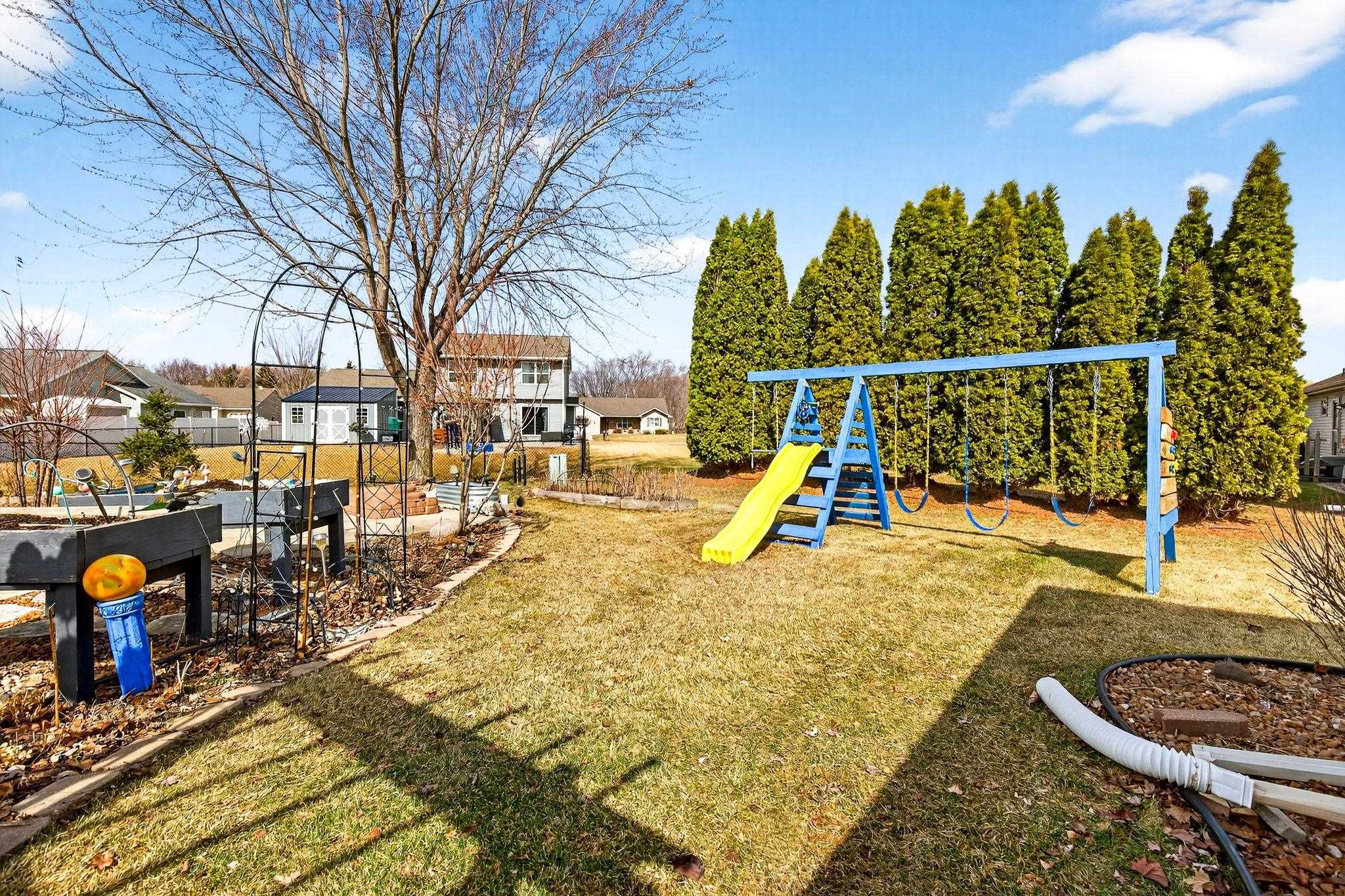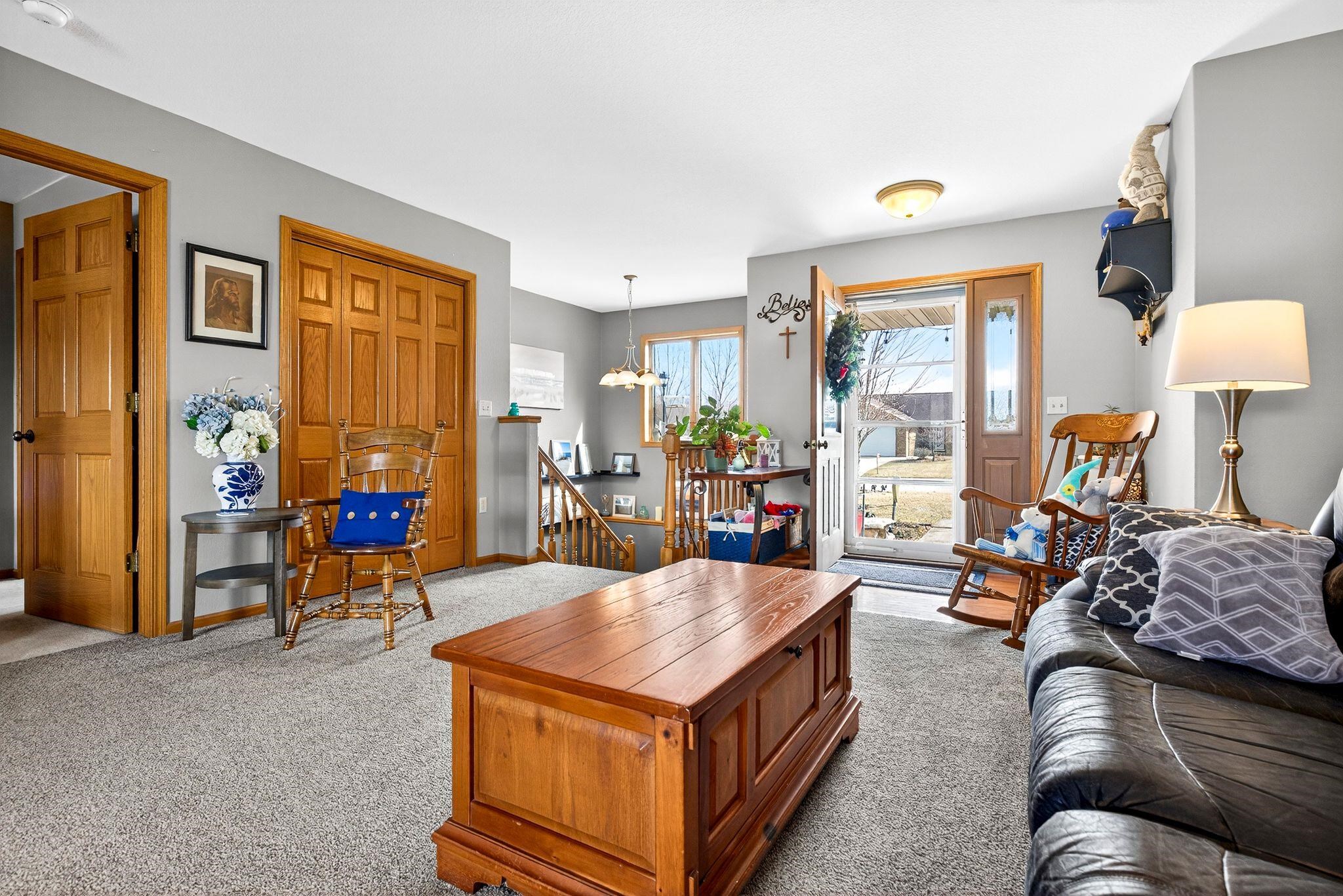 City amenities with a country atmosphere! Located on a quiet street just minutes from the city. Split bedroom designed ranch with finished lower level. Main floor has a spacious open kitchen-living room layout. Den/office on main floor could be used as a third bedroom. Gas fireplace in living room. Open lower level staircase just off front of home. Downstairs find a rec room with nice dry bar w/stools included in sale; full bath, game room and another large bedroom with egress windows. Stairs to garage and plenty of storage left. Seller has taken great care of both interior and exterior. Outside find flower beds, raised garden boxes, perennials, raspberry and strawberry beds. Home faces south for the natual sunlight to beem inside!