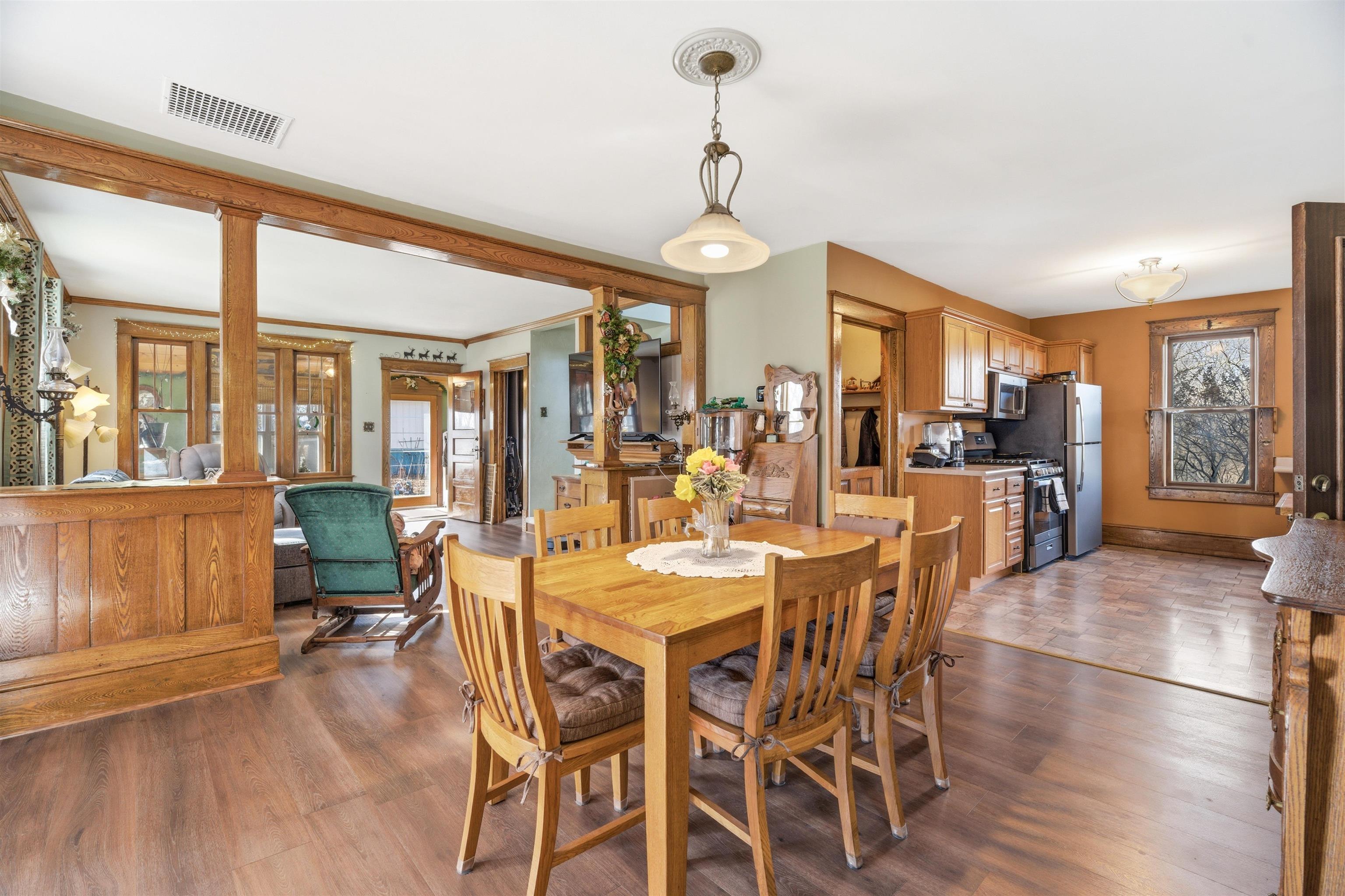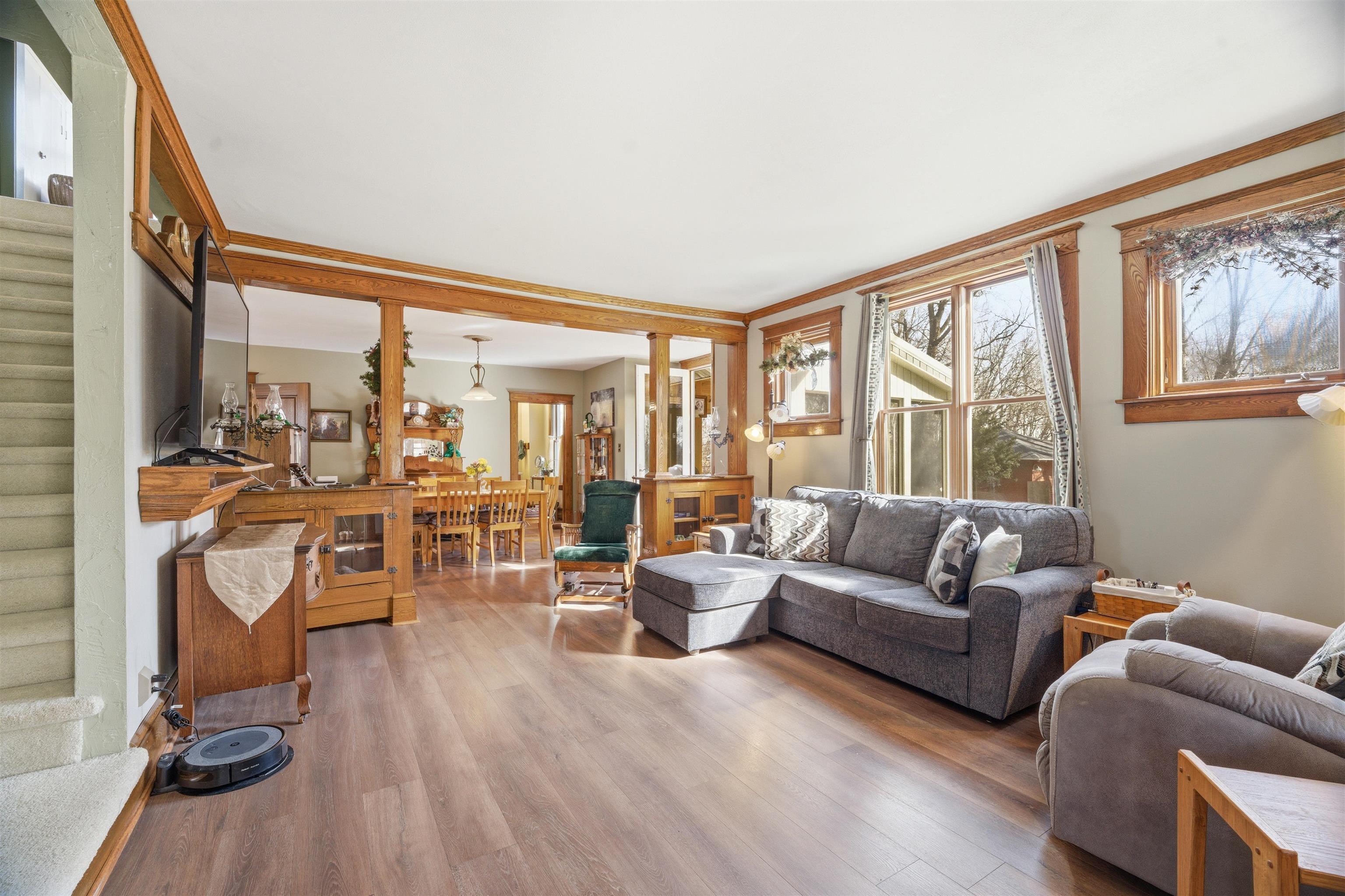 Nestled on 3.5 scenic acres lined by trees, this beautifully remodeled farmhouse offers the perfect blend of country charm & modern comfort. Showcasing excellent craftsmanship & rich woodwork, warm, inviting living spaces & natural light pouring into the sunroom, creates peaceful spots to enjoy the surrounding landscape in every season. Large bedrooms & finished lower level. Outside, the property truly shines. Detached garage & large shop offer exceptional space for projects, storage, or small business use. Several hobby sheds (each with power) add incredible flexibility for equipment, creative pursuits, or workspace. Home Generator included. A rare opportunity to own a beautifully updated home, acreage, outbuildings & room to live the country lifestyle - all just a short drive from Town!