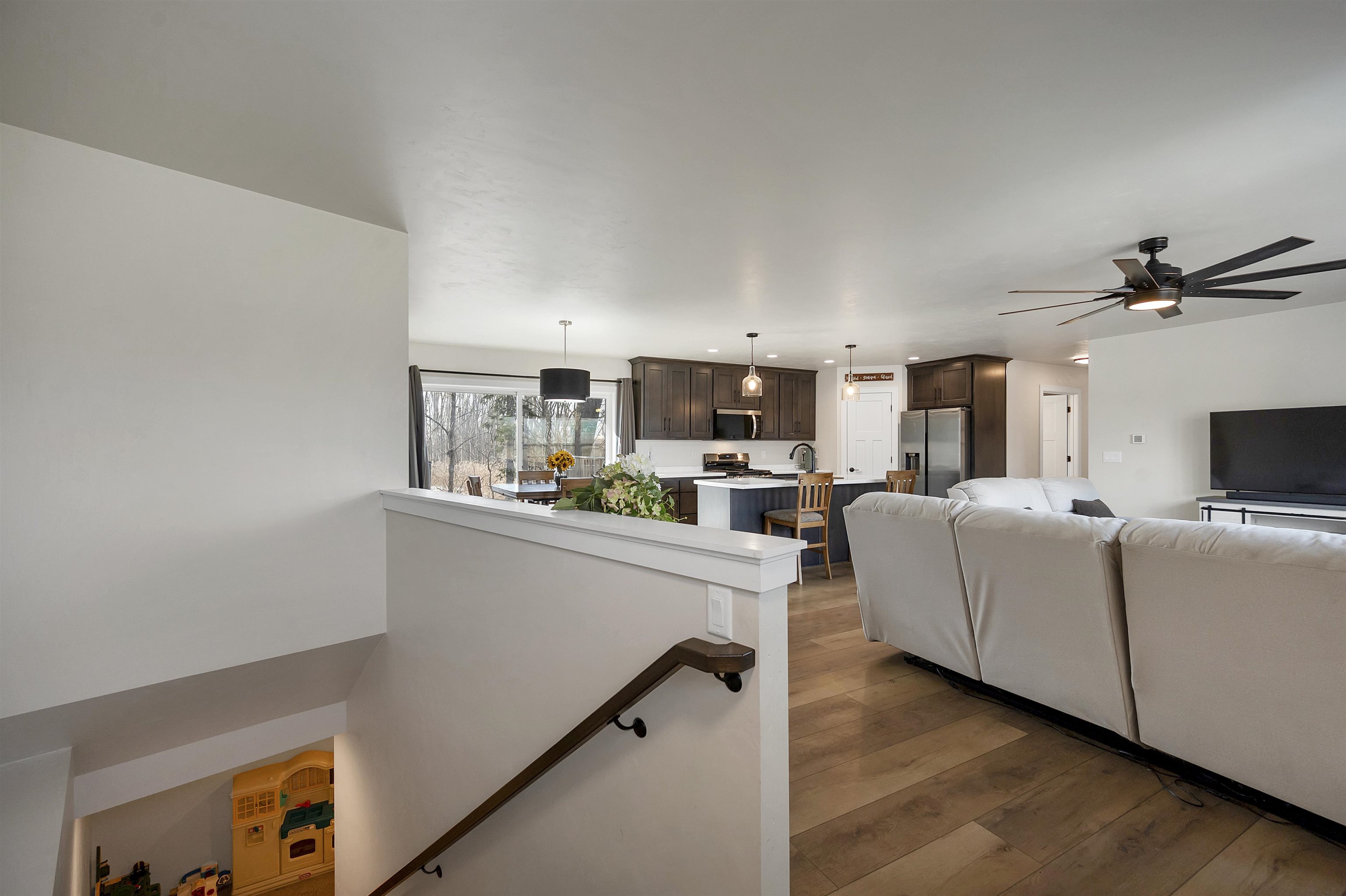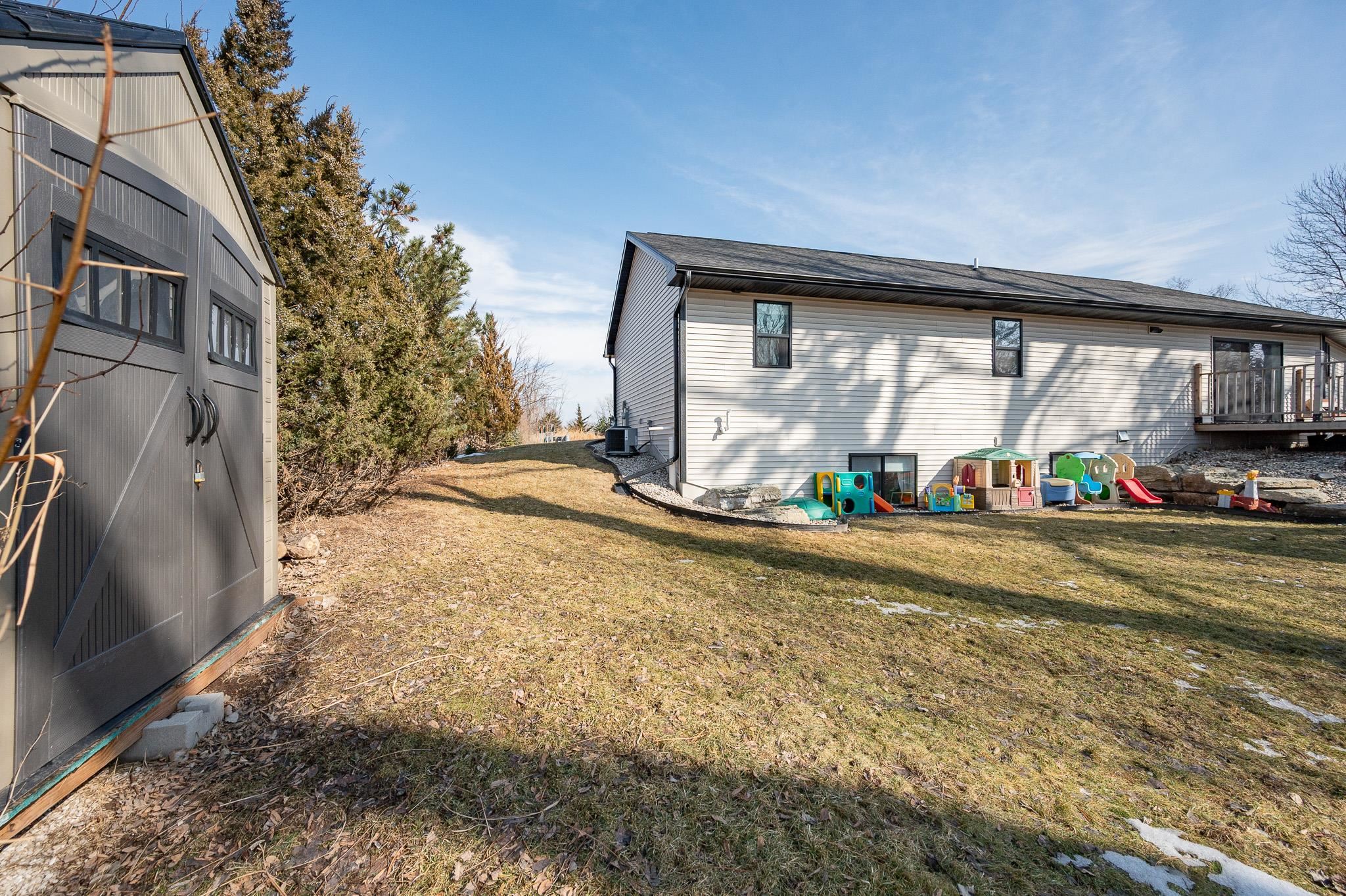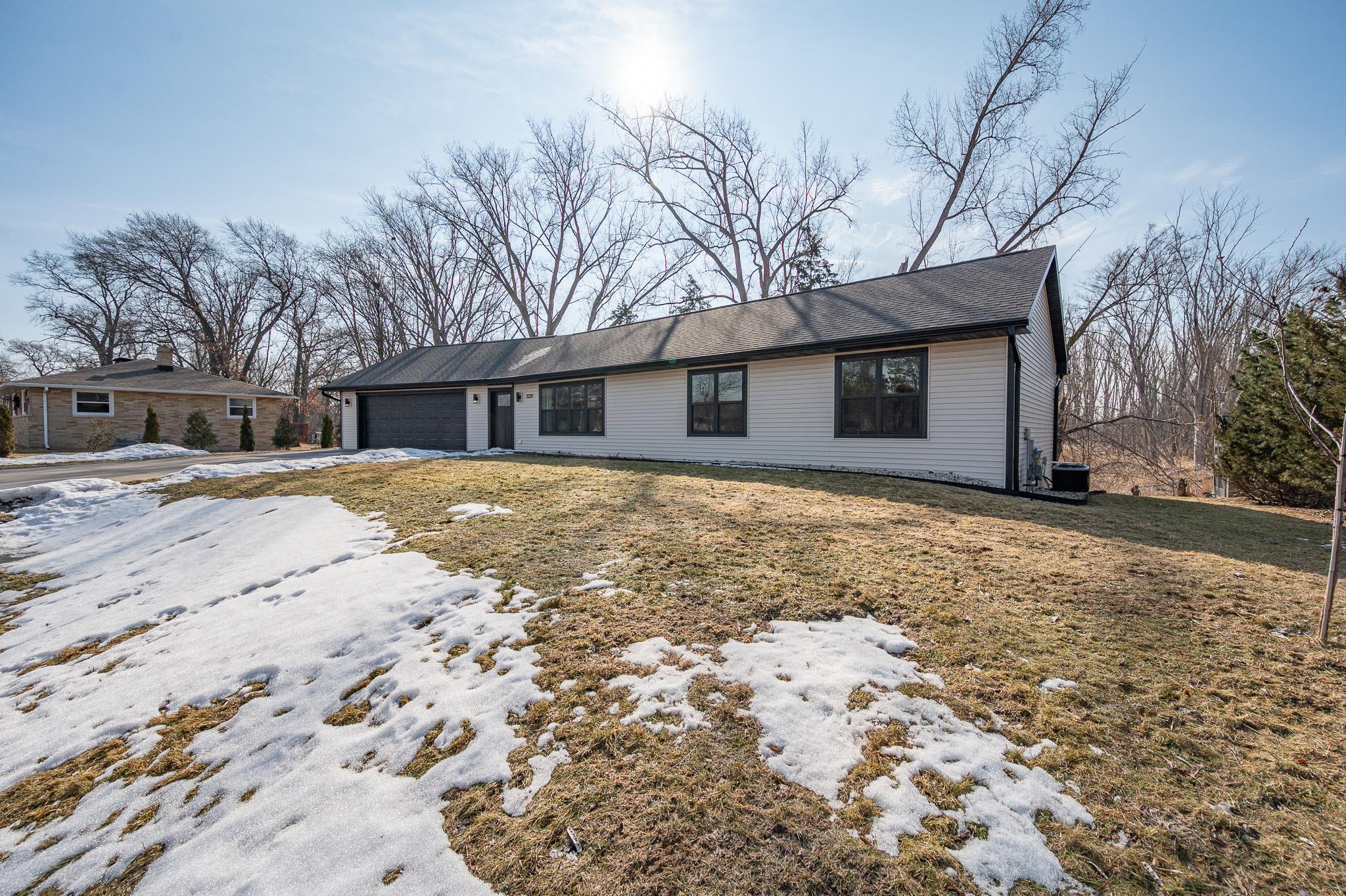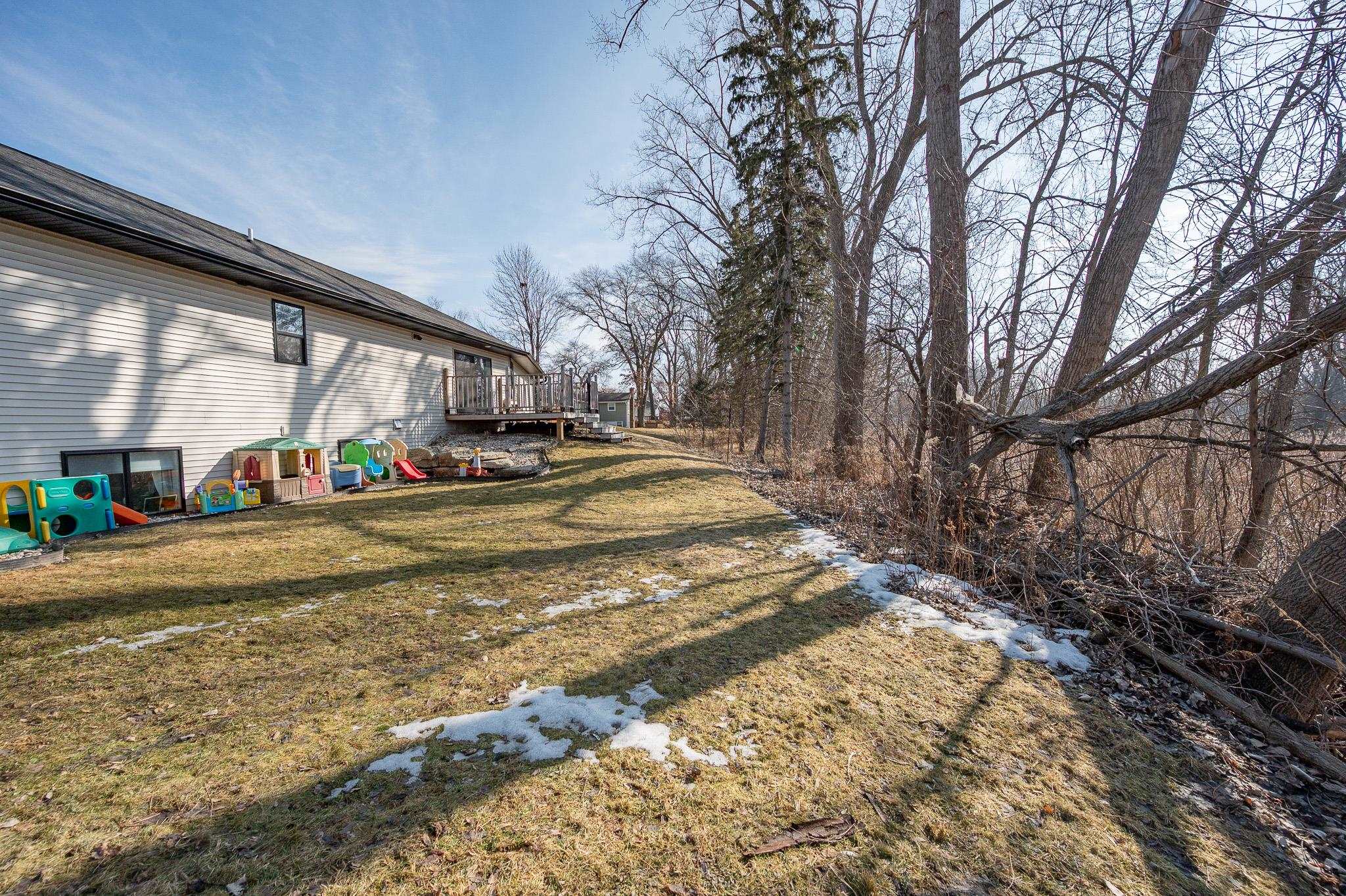 Built in 2023, this ranch offers a layout that simply makes sense. The main level is open and connected, with a large island that anchors the kitchen, seating for gathering, a pantry for storage, and patio doors leading to the deck. The wooded backyard with a creek creates a peaceful setting and privacy year round. The primary suite features a walk in closet and private full bath, while the finished lower level adds a comfortable family room, two additional bedrooms, and another full bath for added flexibility. Zero entry design, thoughtful storage throughout, a 2 stall attached garage, shed, and updated landscaping in 2025 complete the home. Located on a quiet cul de sac with a park right down the street and quick highway access for an easy commute. 48 hr binding acceptance