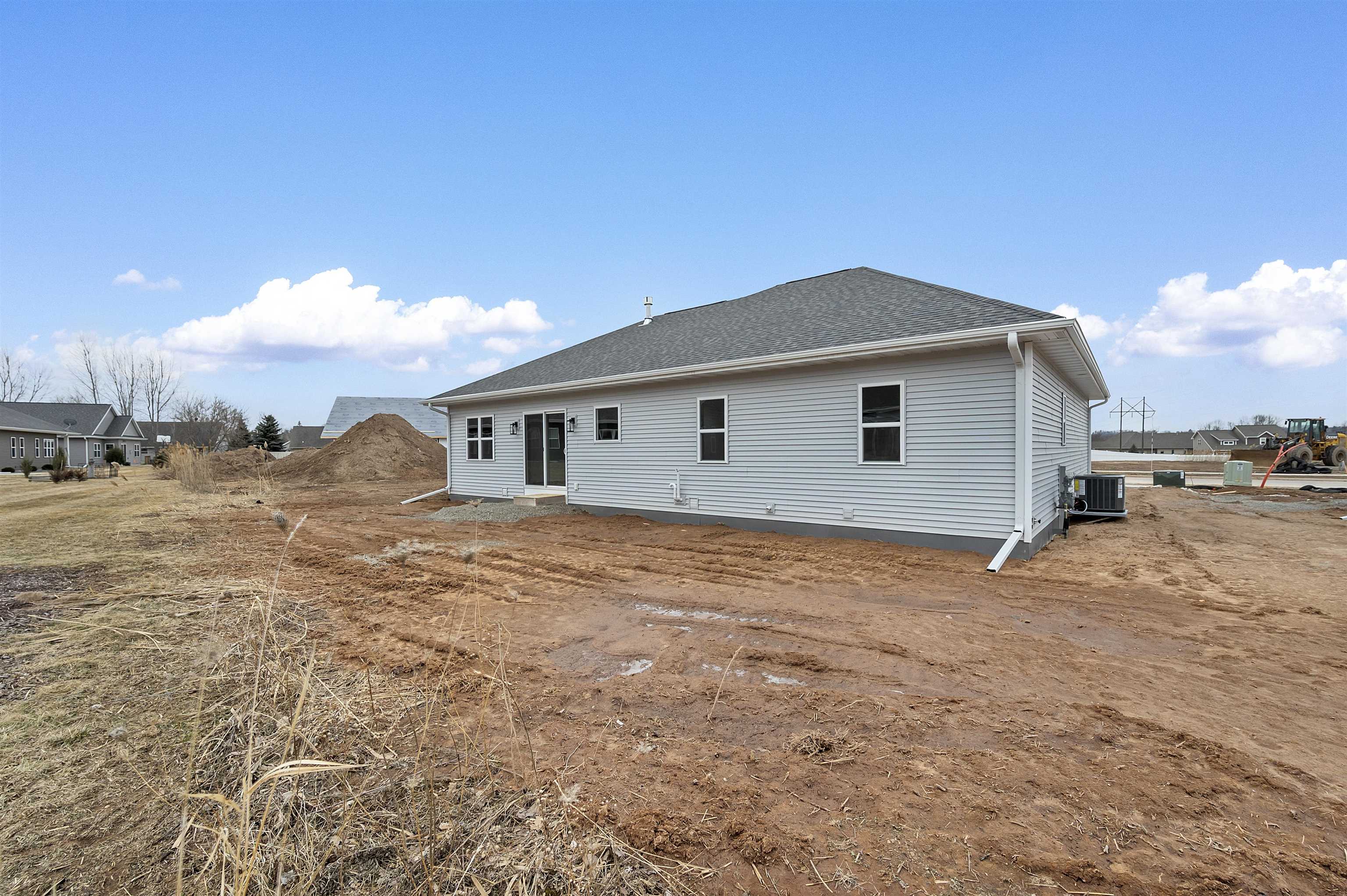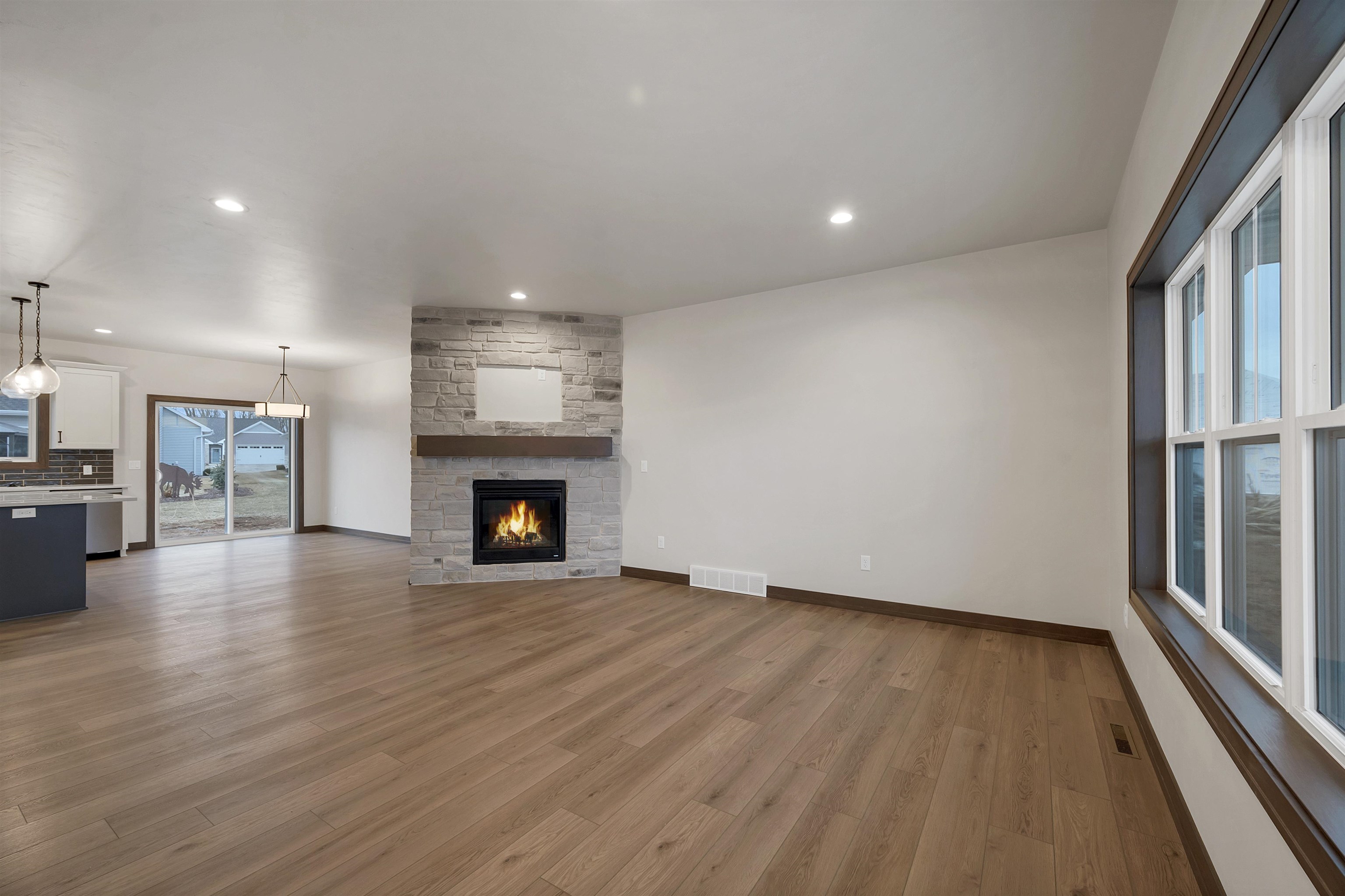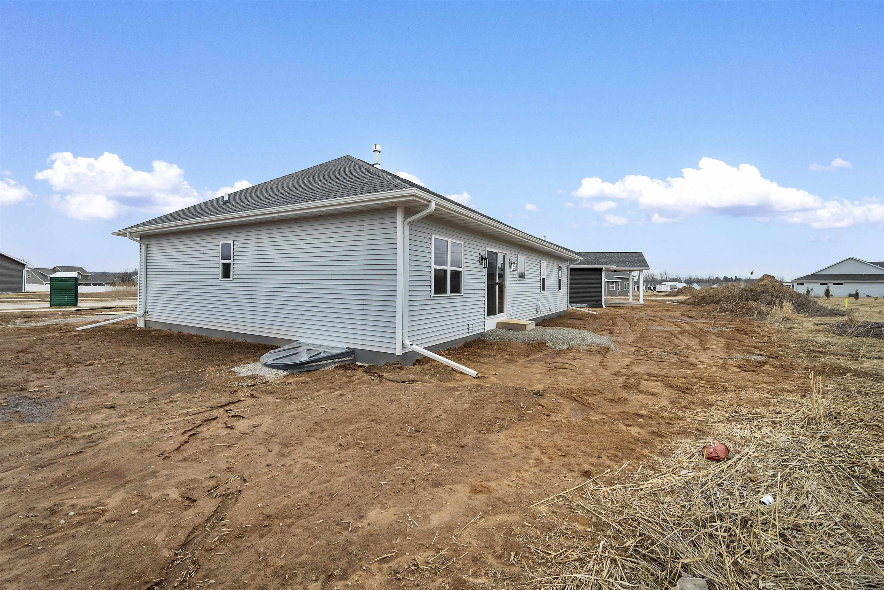 Welcome to the Hidden Creek HOA community. This thoughtfully designed new construction home offers 3 bedrooms and 2 bathrooms with an open-concept layout designed for everyday living. The zero-entry design includes an 18x6 covered front porch and easy main-level access throughout. The living room features a cozy fireplace and opens to a 12x12 patio for outdoor enjoyment. The kitchen includes a large island, walk-in pantry, and modern finishes. The primary suite offers a tray ceiling, walk-in closet, and a custom tiled shower. Additional features include first-floor laundry and an unfinished lower level with an egress window, ready for future expansion. HOA amenities include a clubhouse, pool, fitness area, lawn care, and snow removal for low-maintenance living. Photo is digitally enhanced.