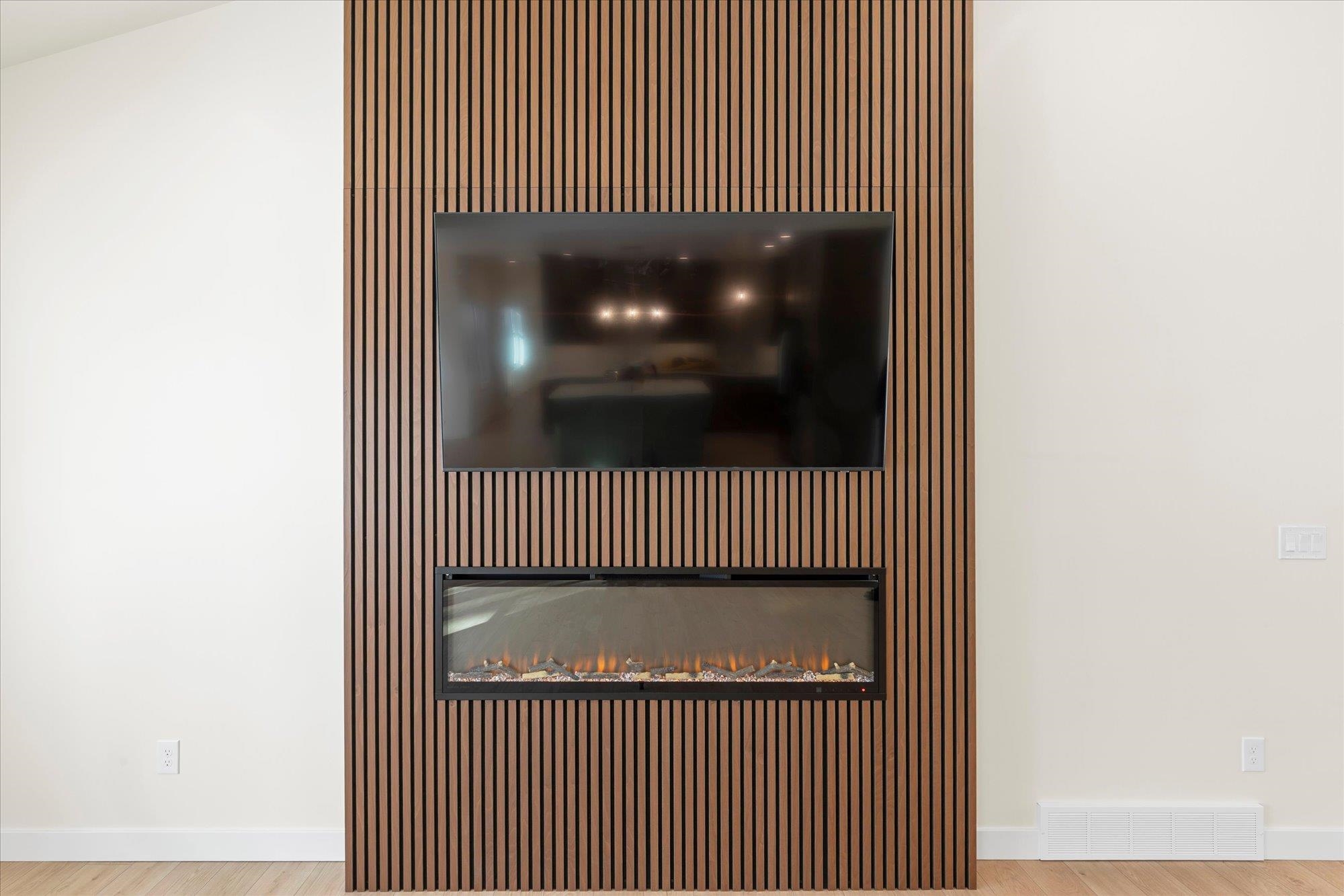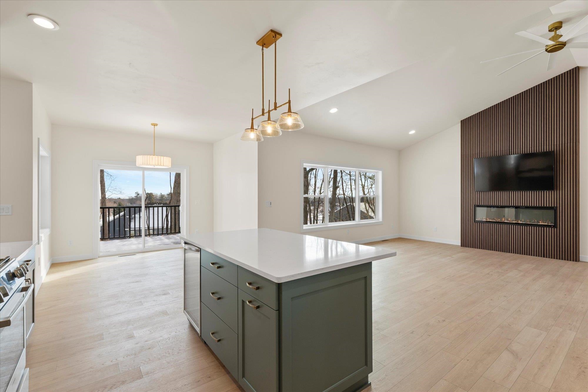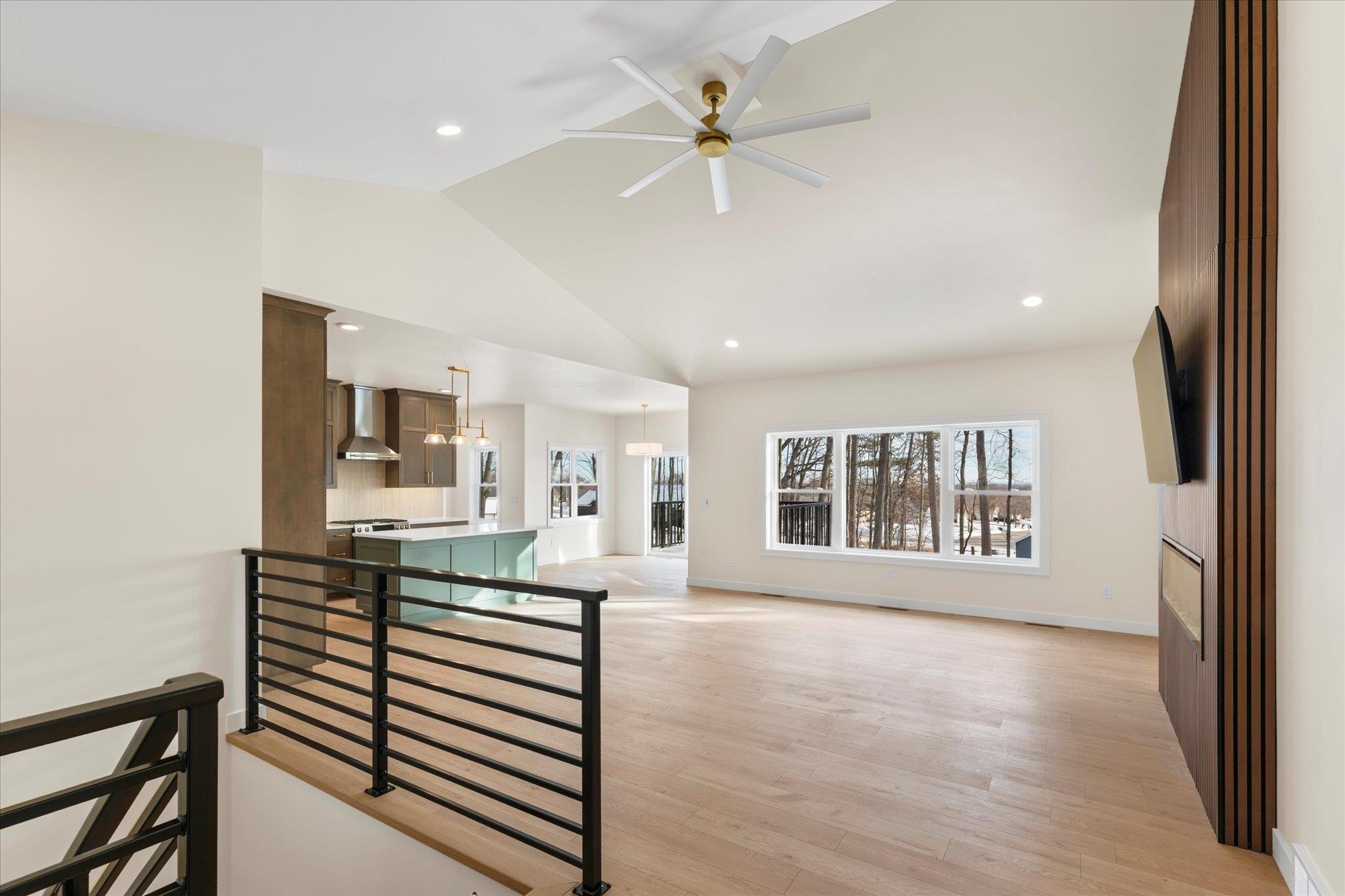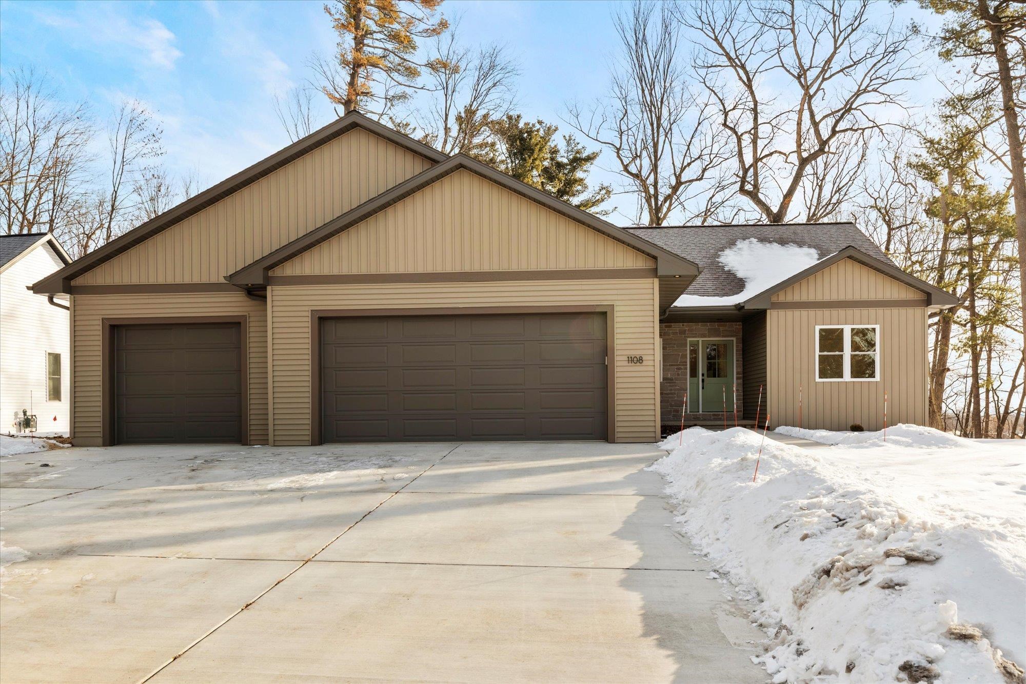 Beautiful 3-bedroom, 2.5-bath home in the sought-after Howard-Suamico School District offering 1,750 sq ft on a private wooded .42-acre lot. The open-concept main level features vaulted ceilings, expansive windows, and a floor-to-ceiling custom slat fireplace with sleek linear insert. The kitchen includes rich cabinetry, quartz countertops, stainless appliances, designer lighting, tile backsplash with accent niche, and a contrasting island. The primary suite offers dual vanities and a tiled walk-in shower. Exposed lower level is pre-plumbed for a future bath with space for a bedroom and family room. Focus on Energy Certified with high-efficiency systems.