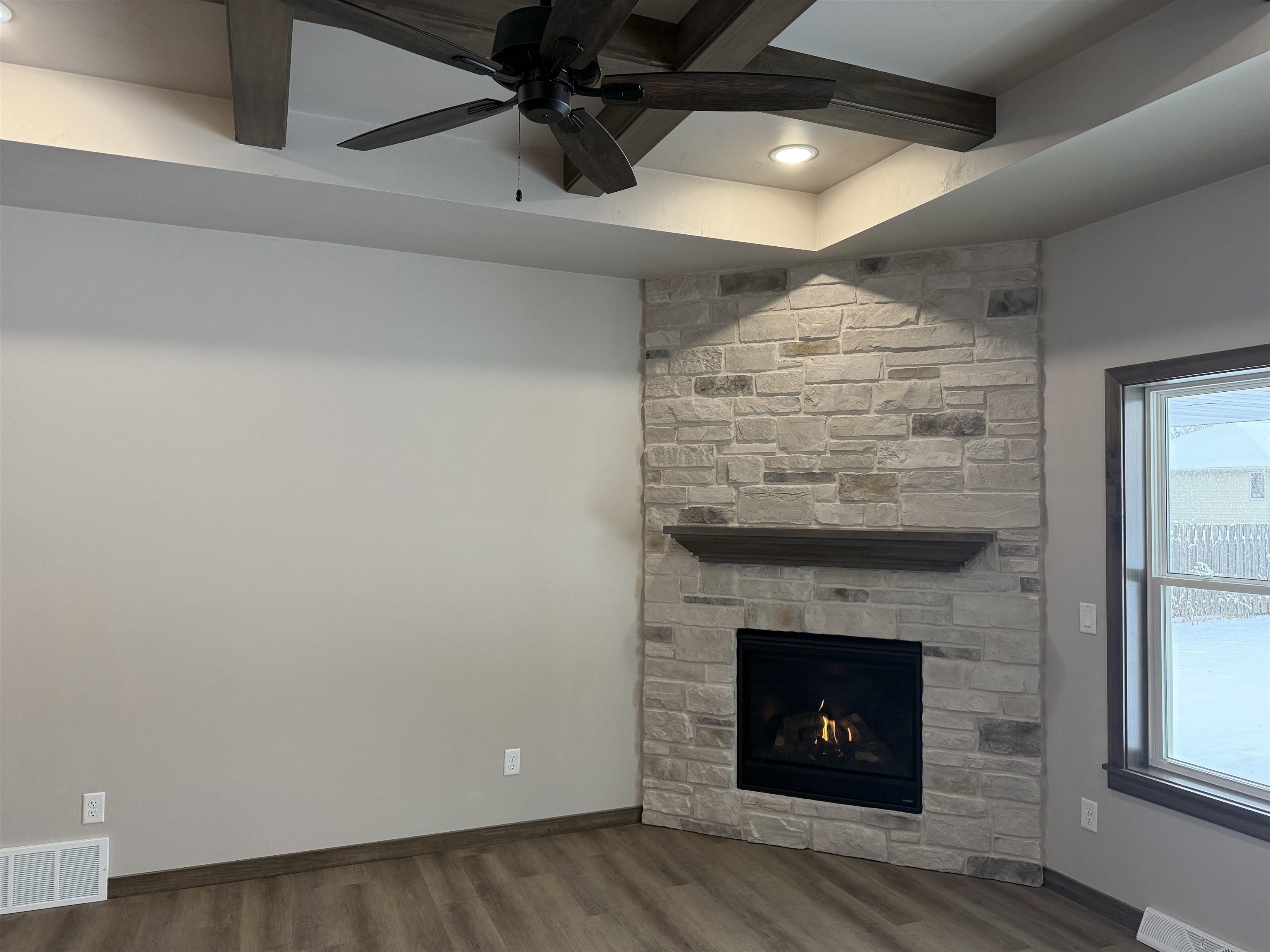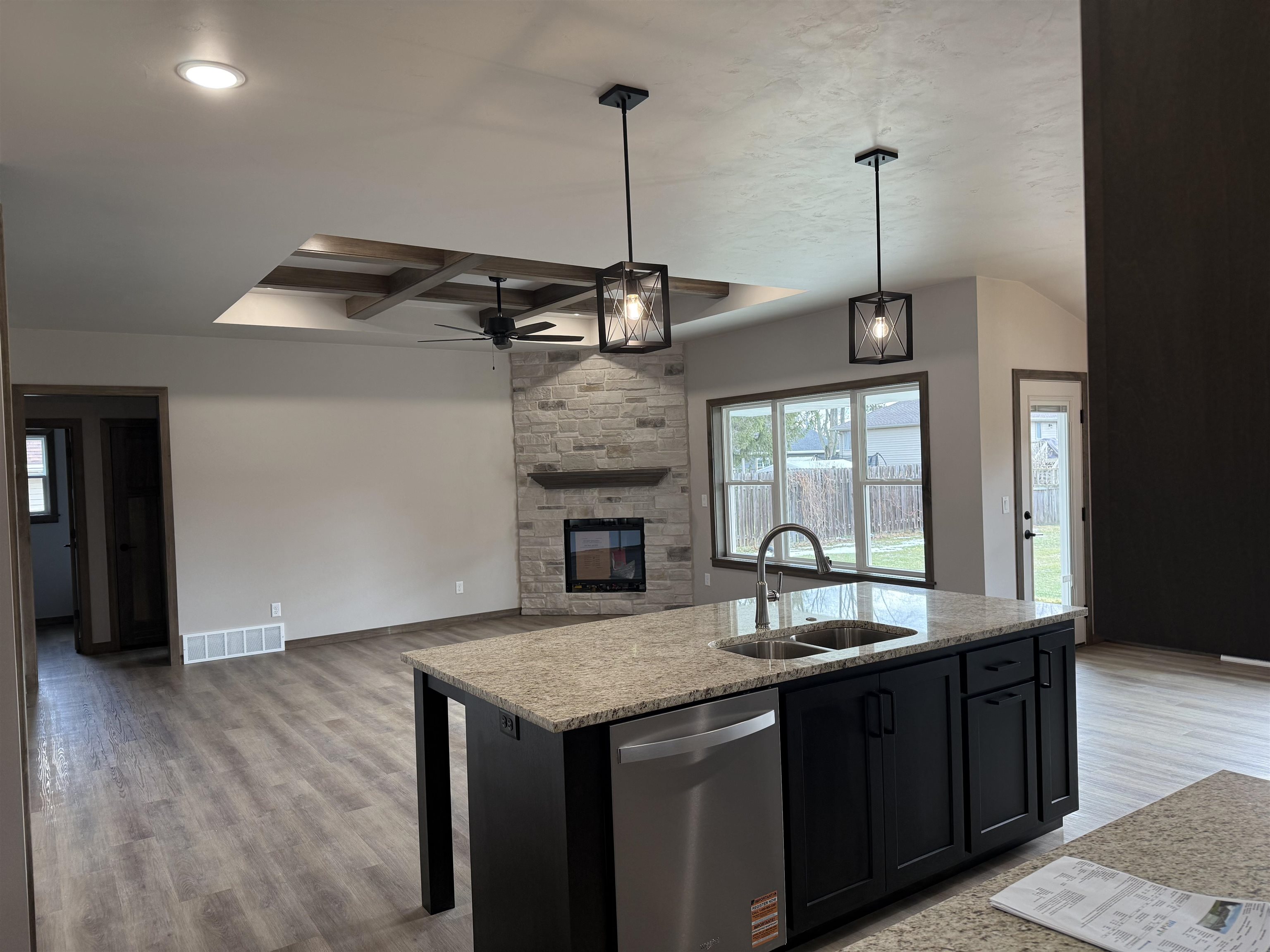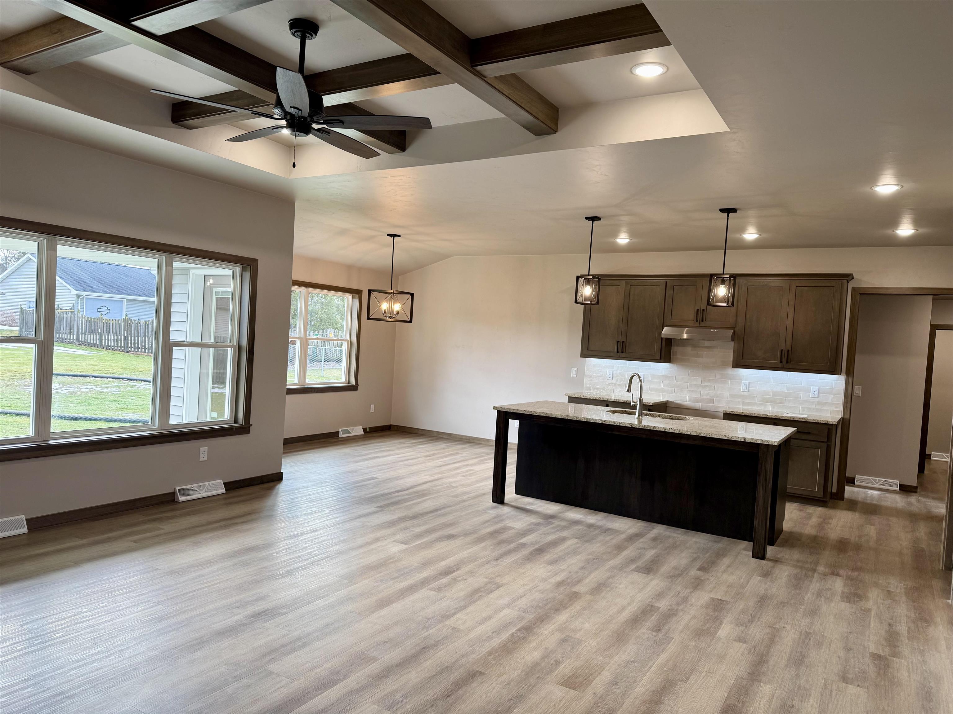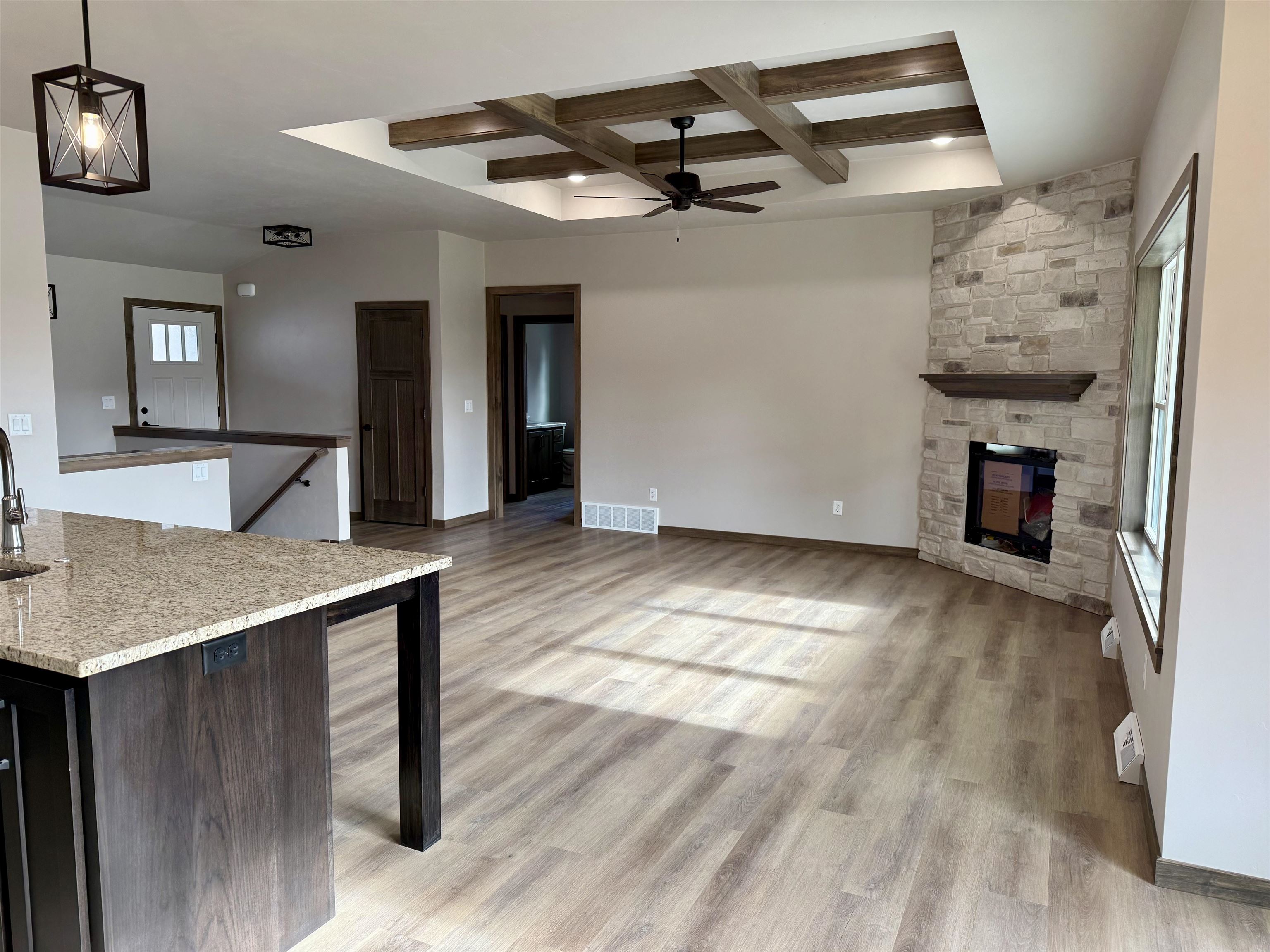 Quality Built, Focus on Energy Split Bedroom Home in convenient location to all amenities. 1/3 acre lot with no restrictive covenants. Coffered ceiling with wood beams. No step entries. LVP floors. Granite countertops. Lg pantry. Step tray in master bedroom. Large walk in closet. Tile shower. 2 full baths. Gas log fireplace with stone to ceiling. Lg. partially covered patio. 2 egress windows in basement for future finishing. Seeded lawn included. One year builder warranty