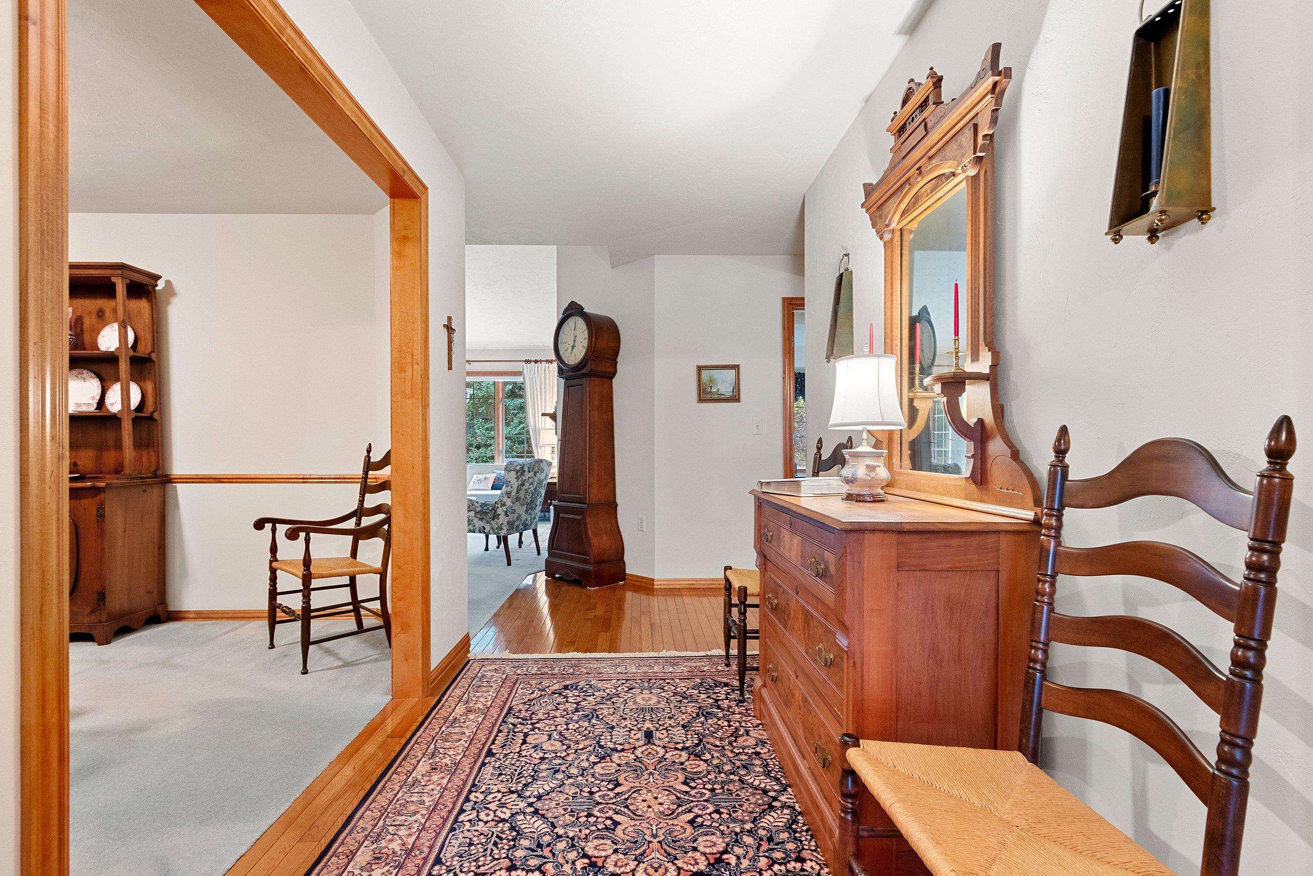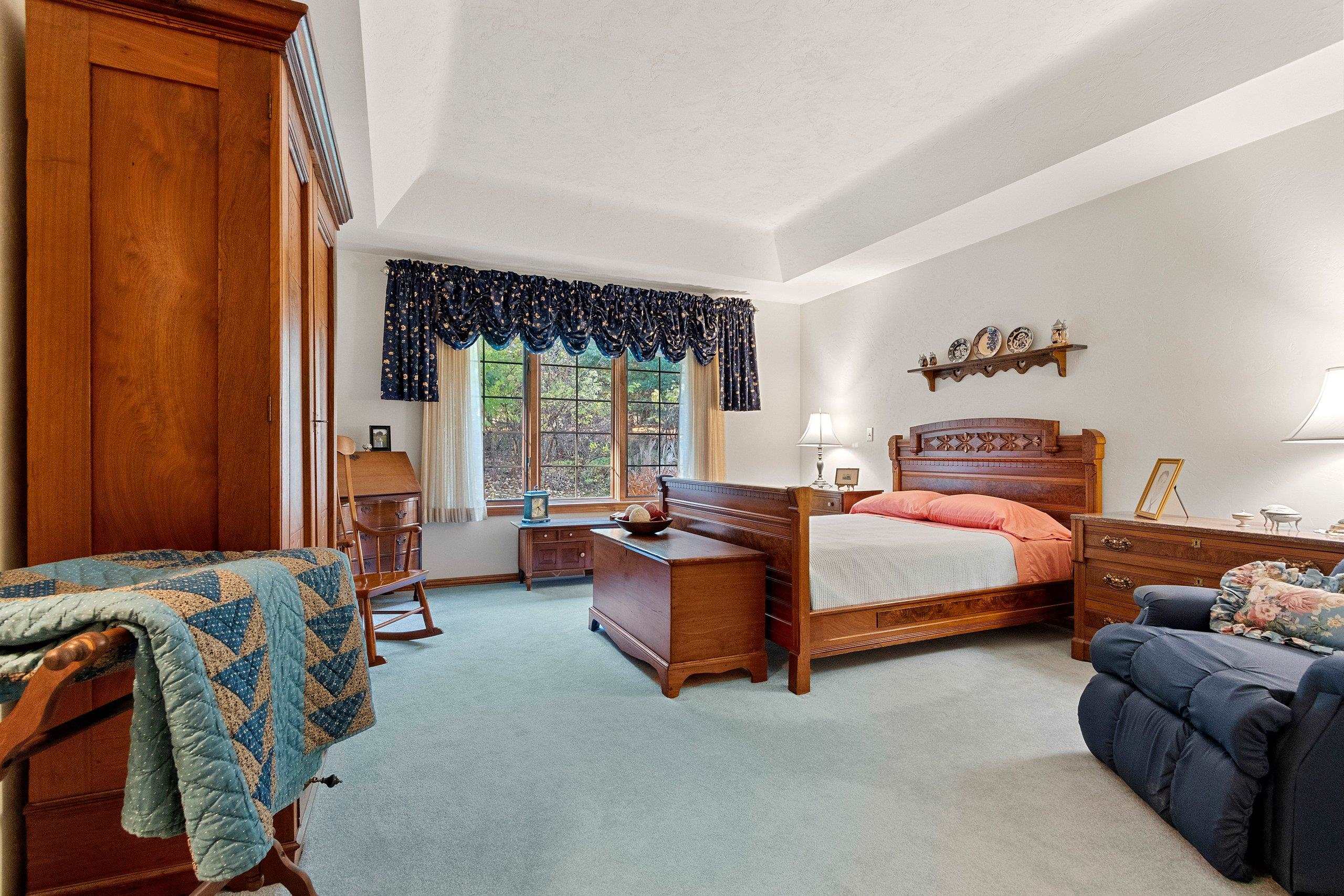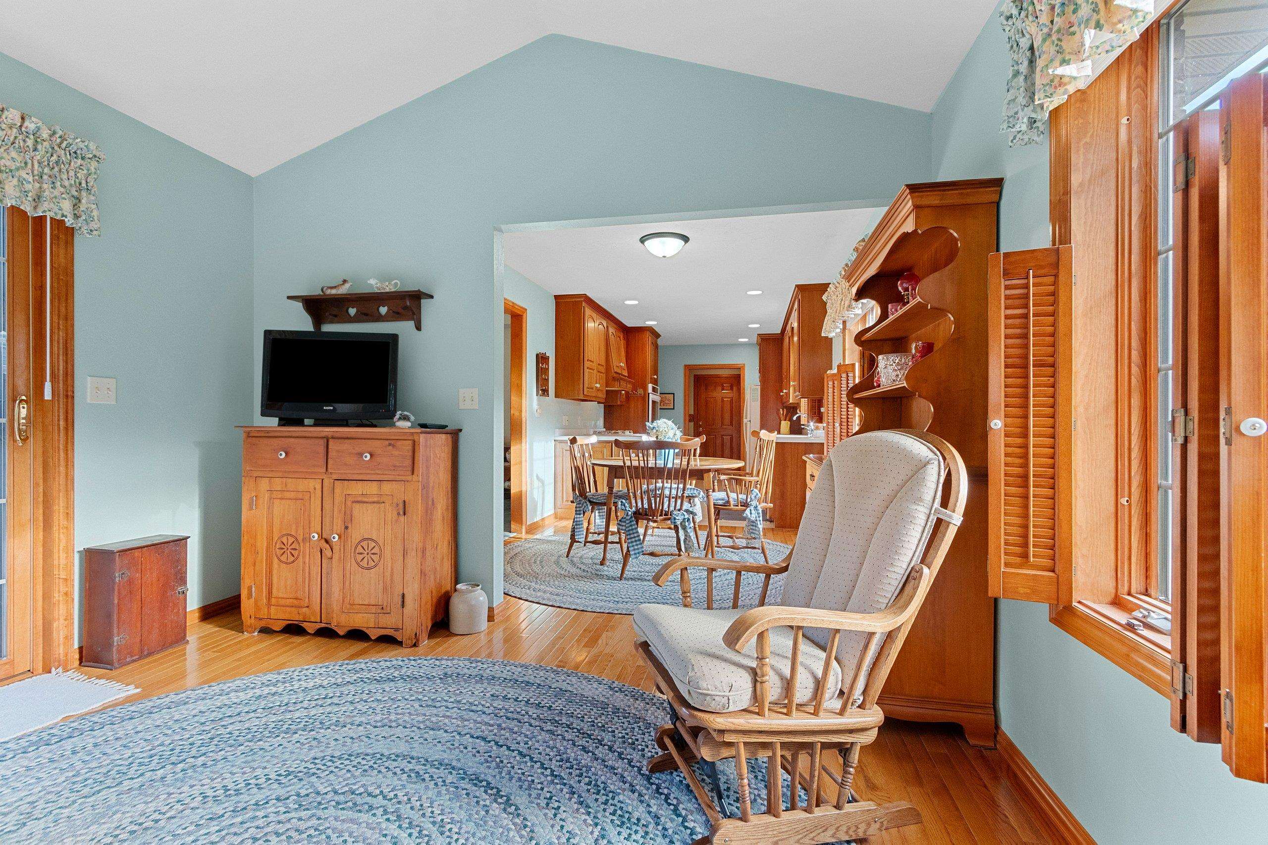 You will love this beautiful 2-plus bedroom, 3 full-bath, all-brick home in the sought-after Howard community. The pride of ownership is evident in this one-owner's home, which has been meticulously maintained. Stunning Cherry cabinets, 6-panel doors, and woodwork throughout. The craftsmanship of ceiling heights—cathedral, vaulted, tray, and traditional, along with the hardwood flooring and decor, adds so much character. Two primary suites on the main floor with private baths and walk-in closets. Experience tranquility in the 4-season room. Zero-lot-line home offers amenities such as snow removal and lawn care. Large partially finished basement with additional sleeping space, rec area, full bath, and storage area with shelving. Furnace 2018, Roof 2013, updated deck 2024