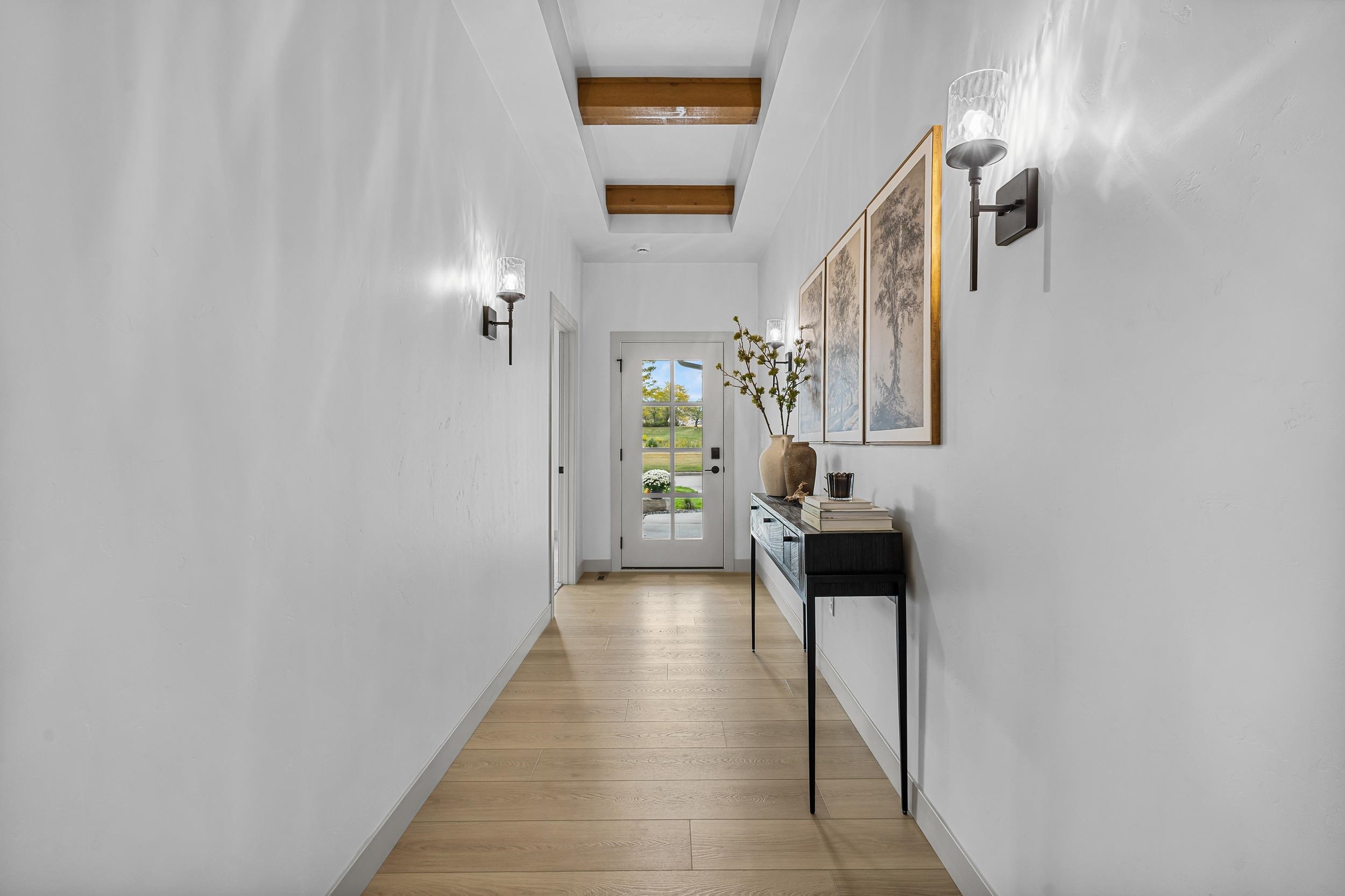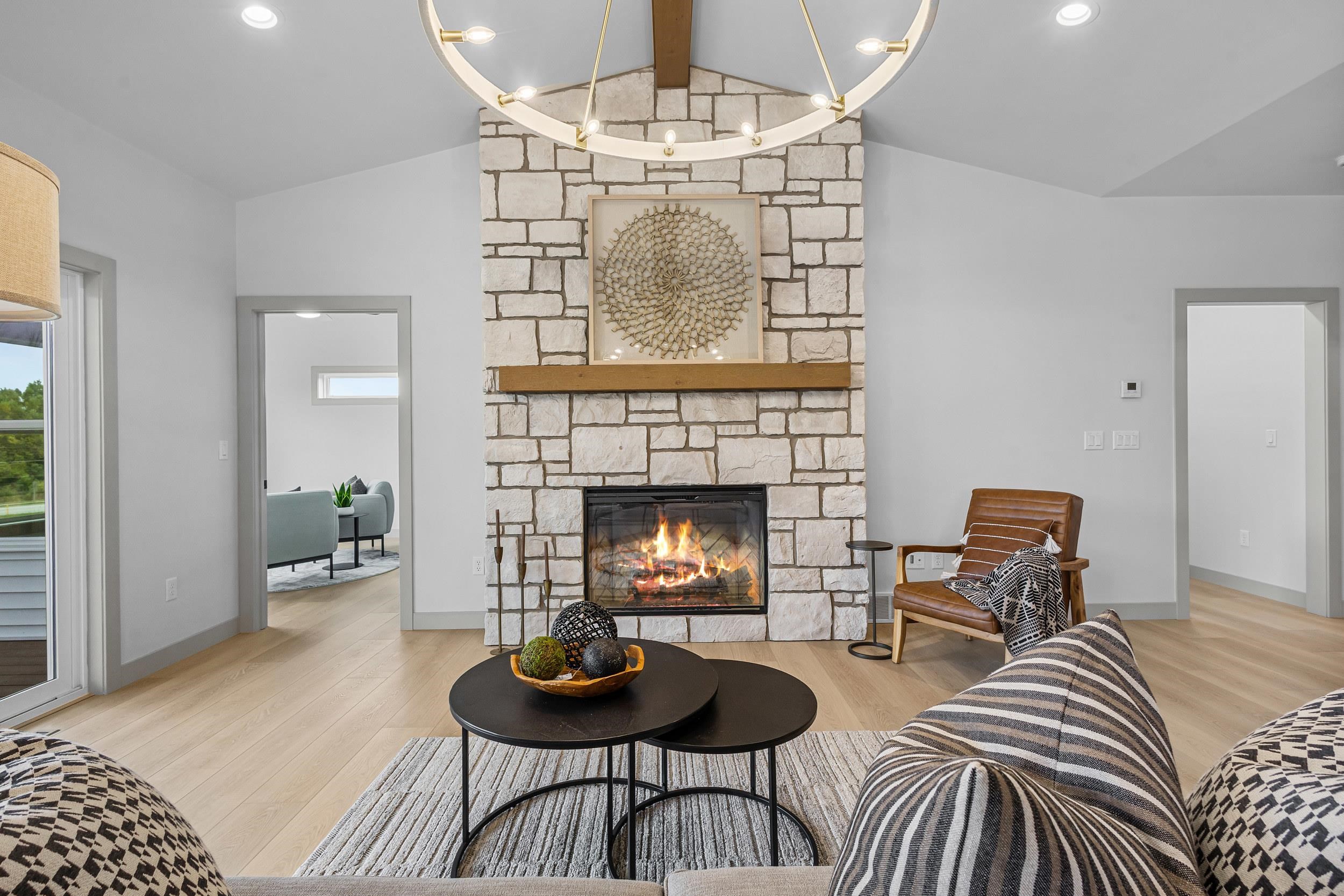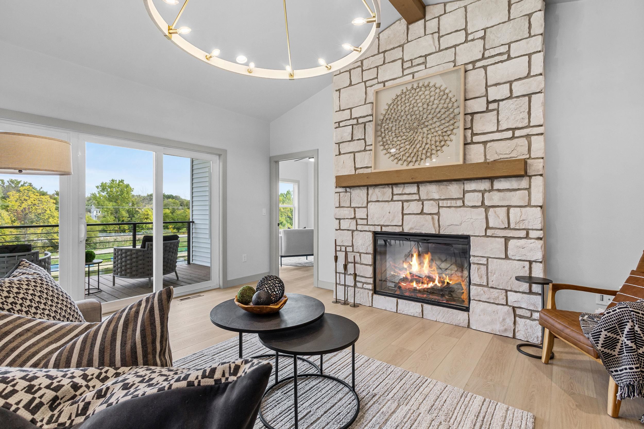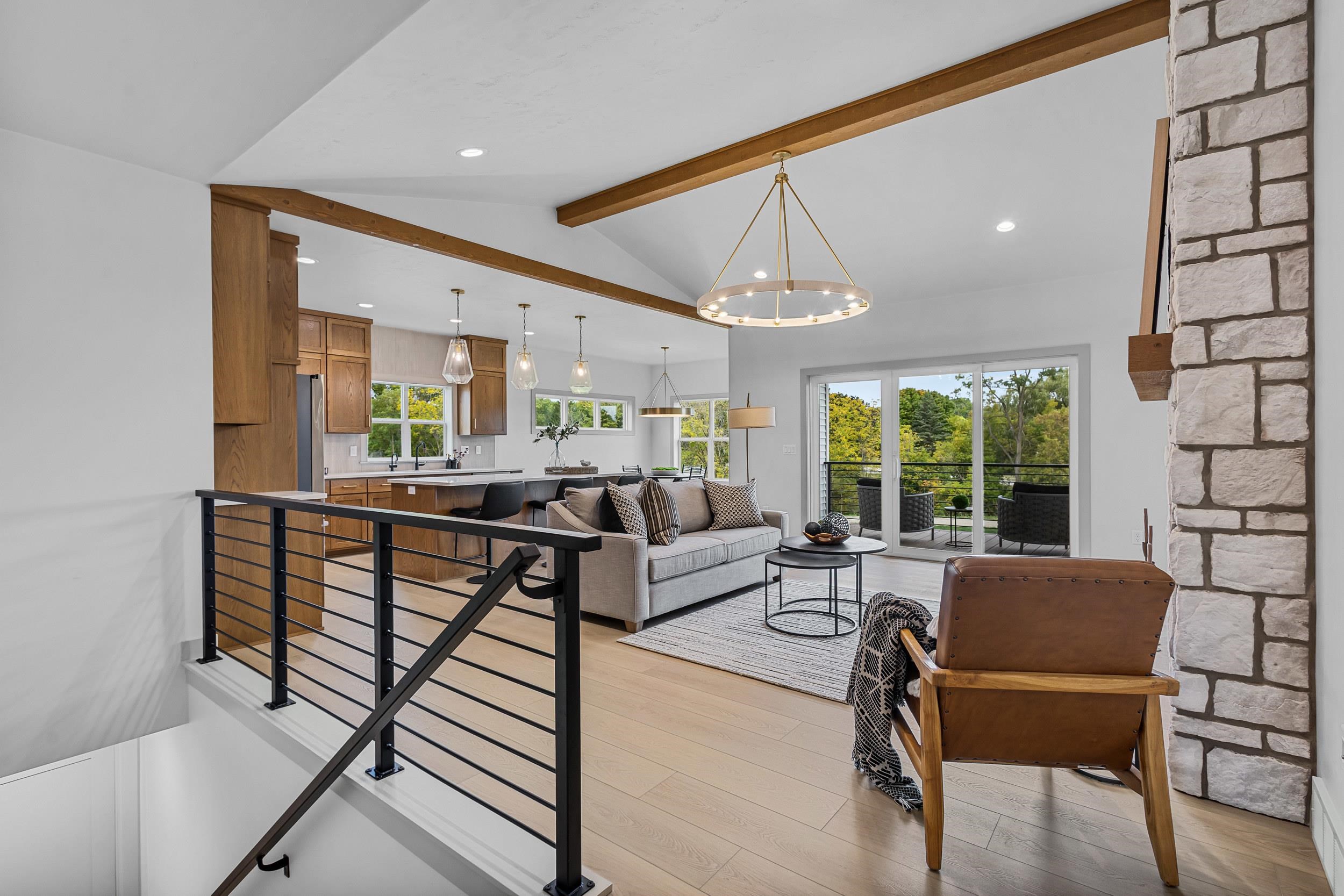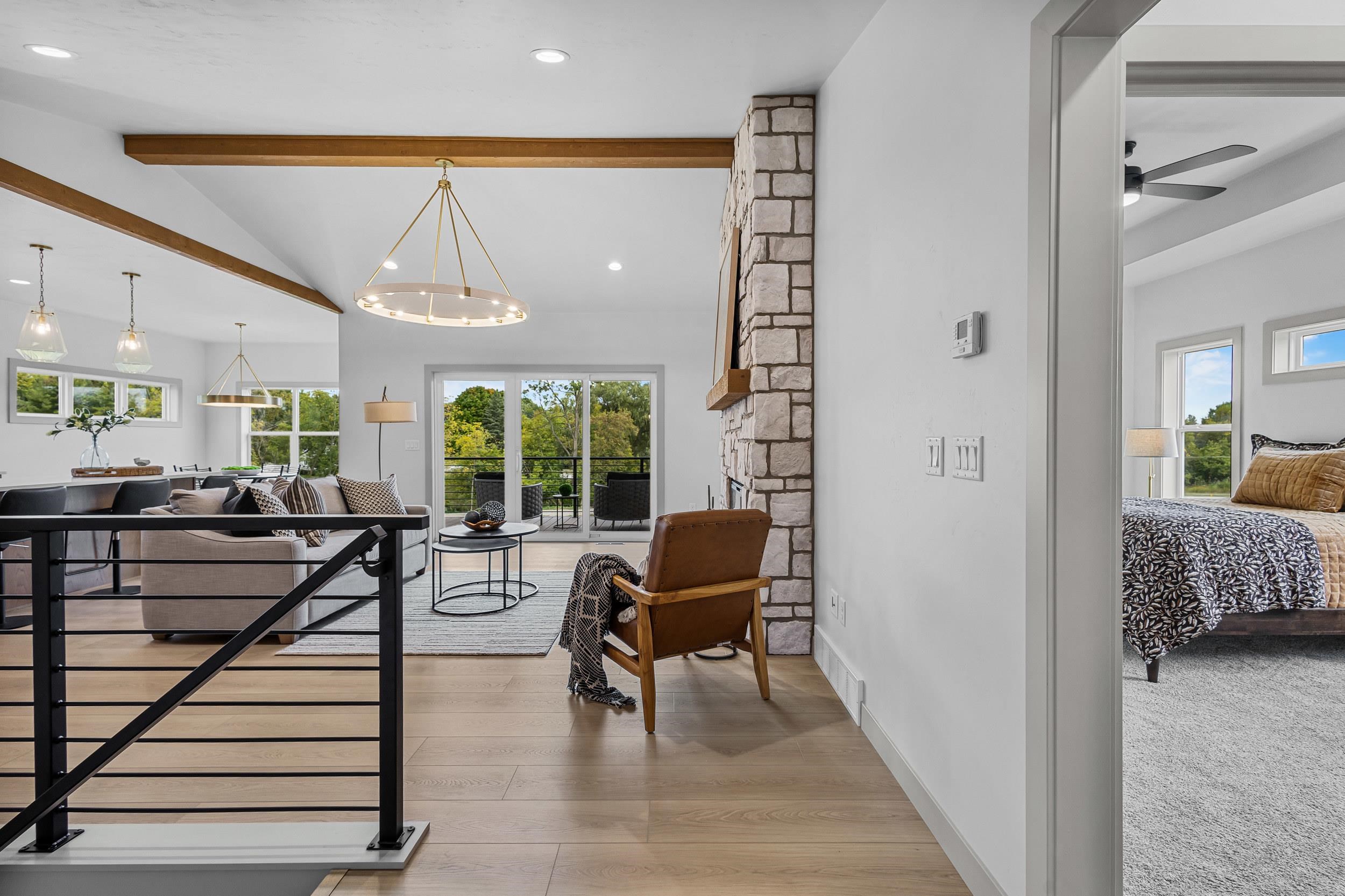 Step into this stunning 2-bed, 2.5-bath, zero-step entry home that offers a touch of elegance. The kitchen features custom white oak cabinets, quartz countertops, stylish backsplash, & walk-in pantry. Relax by the electric fireplace framed in Volterra Niveo stone, beneath warm wood beam accents. The mudroom is a perfect mix of function & style with built-in bench & custom lockers. The powder room is eye-catching with tiled accent wall & floating vanity. Guests can enter a charm-filled foyer w/wood beams & ambient wall lighting. The primary suite includes a quartz dual vanity, tiled shower, & WIC. Enjoy peaceful views from the covered deck or 4 season room. A custom metal railing leads to the exposed lower level, stubbed for a full bath bath for room to expand!