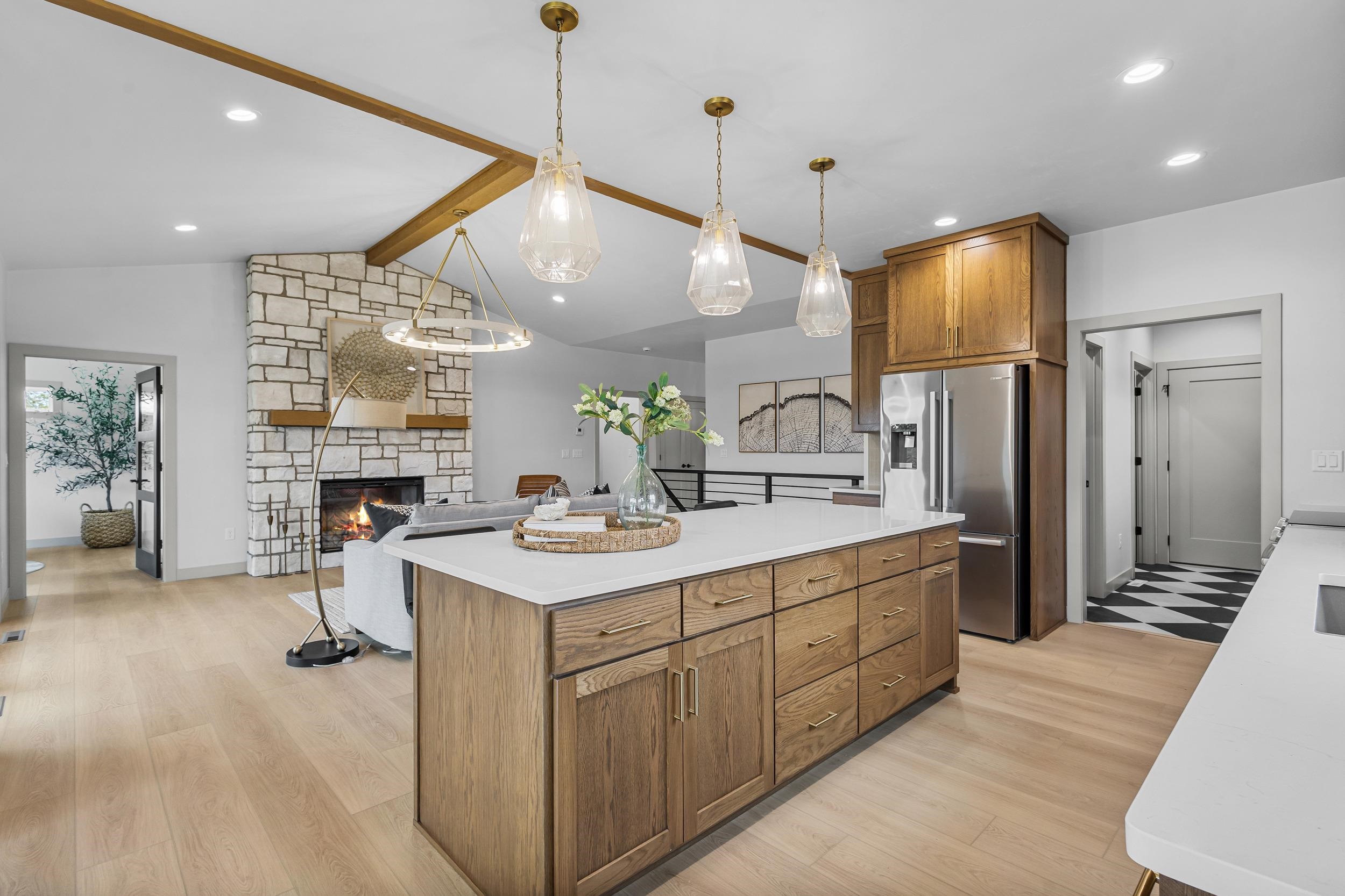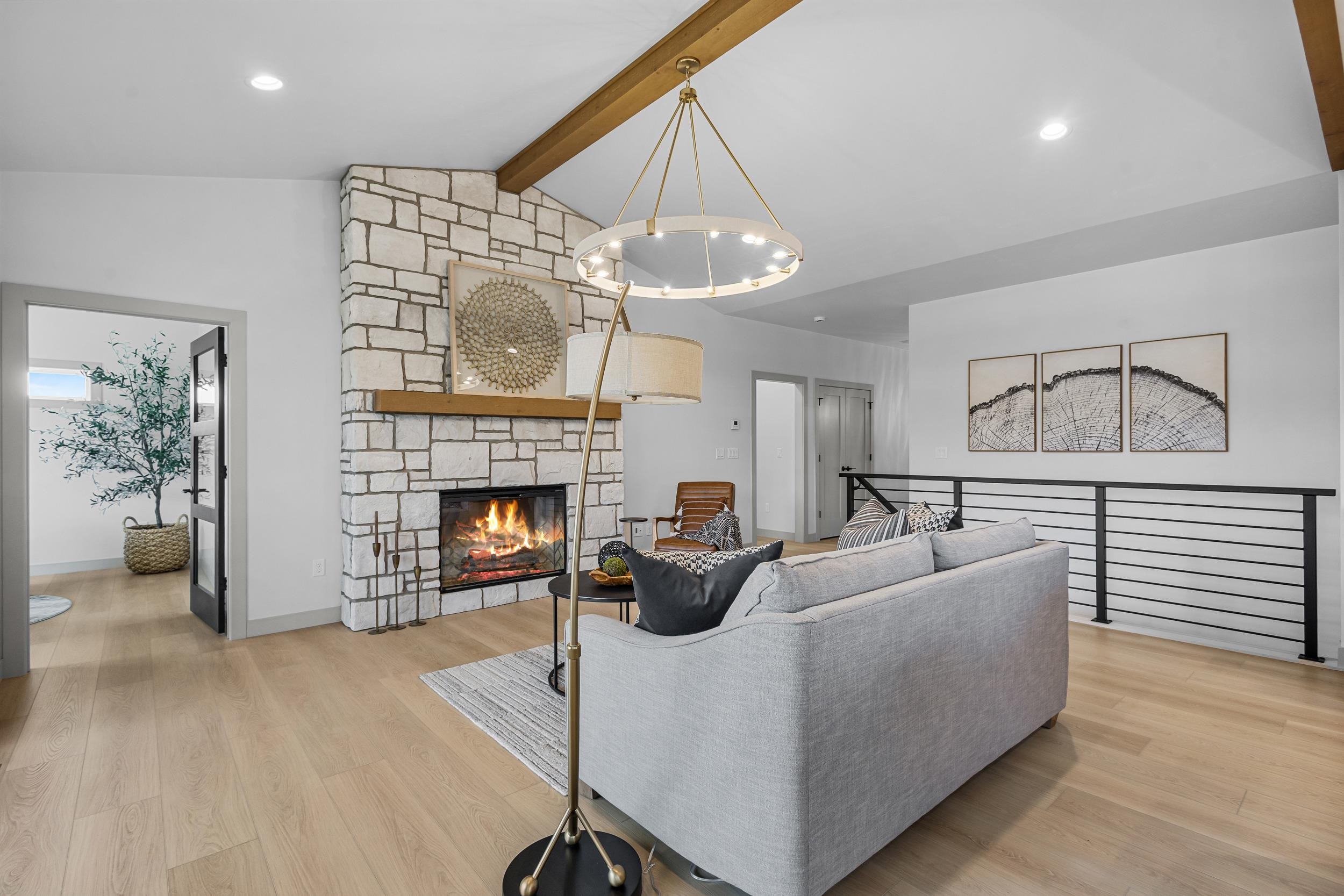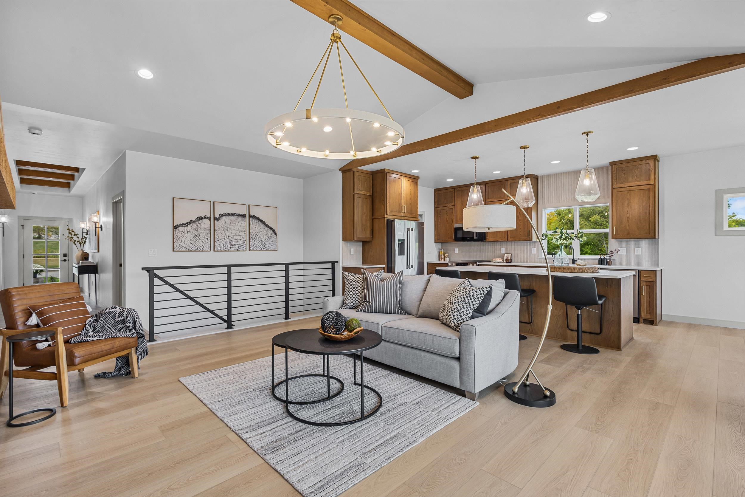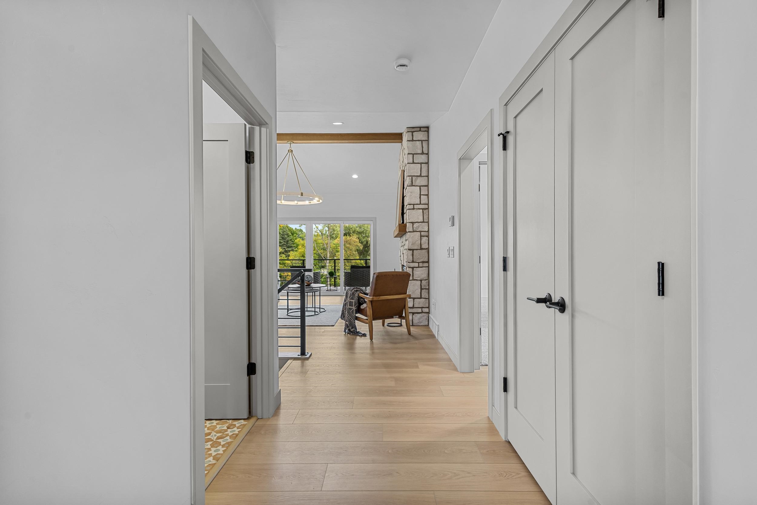 Step into this stunning 2-bed, 2.5-bath, zero-step entry home that offers a touch of elegance. The kitchen features custom white oak cabinets, quartz countertops, stylish backsplash, & walk-in pantry. Relax by the electric fireplace framed in Volterra Niveo stone, beneath warm wood beam accents. The mudroom is a perfect mix of function & style with built-in bench & custom lockers. The powder room is eye-catching with tiled accent wall & floating vanity. Guests can enter a charm-filled foyer w/wood beams & ambient wall lighting. The primary suite includes a quartz dual vanity, tiled shower, & WIC. Enjoy peaceful views from the covered deck or 4 season room. A custom metal railing leads to the exposed lower level, stubbed for a full bath bath for room to expand!