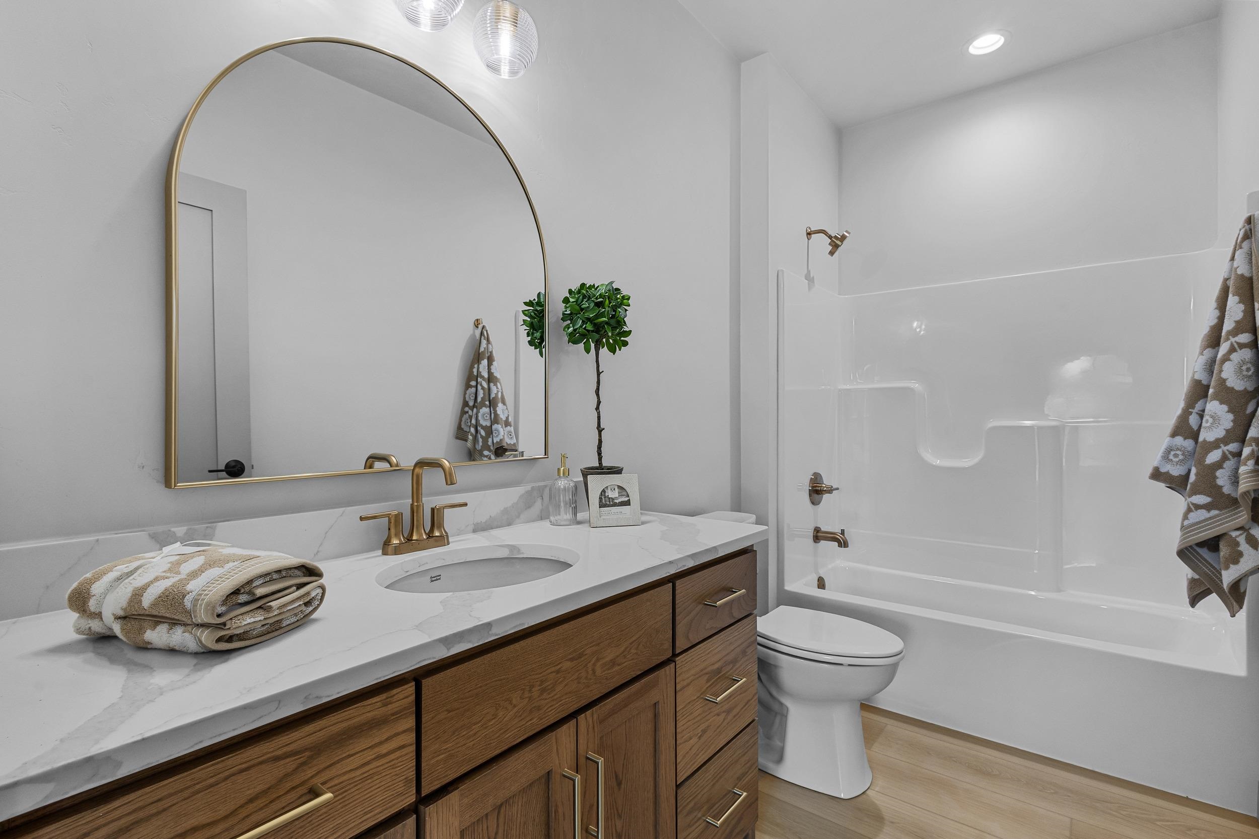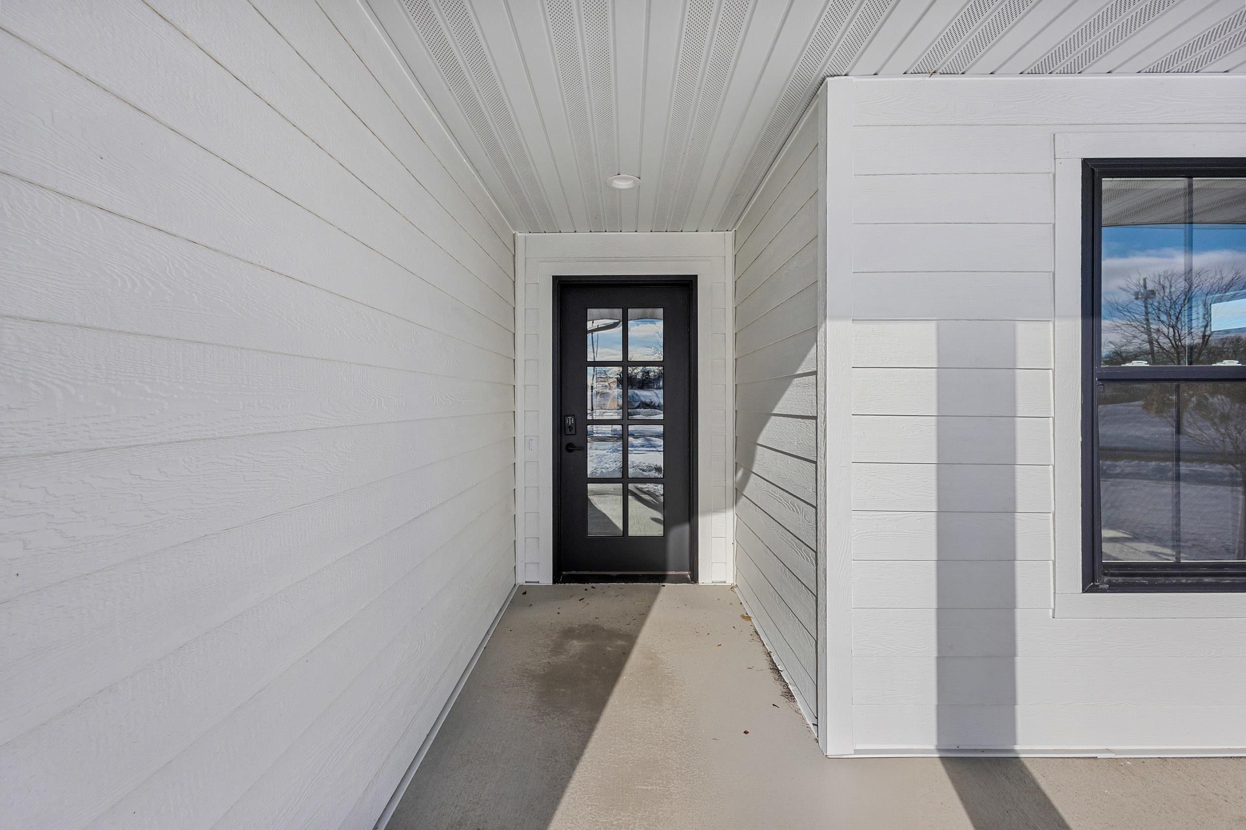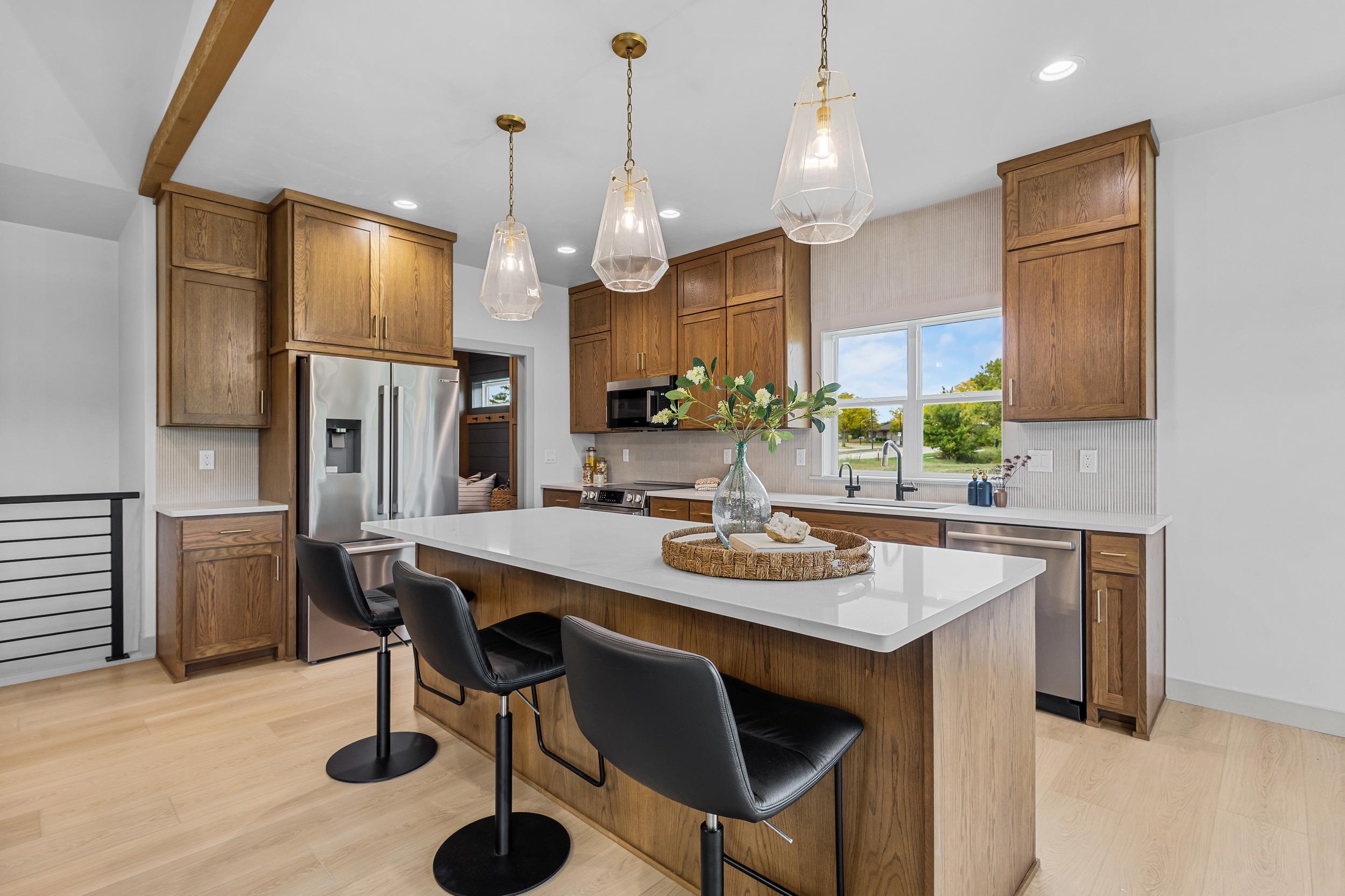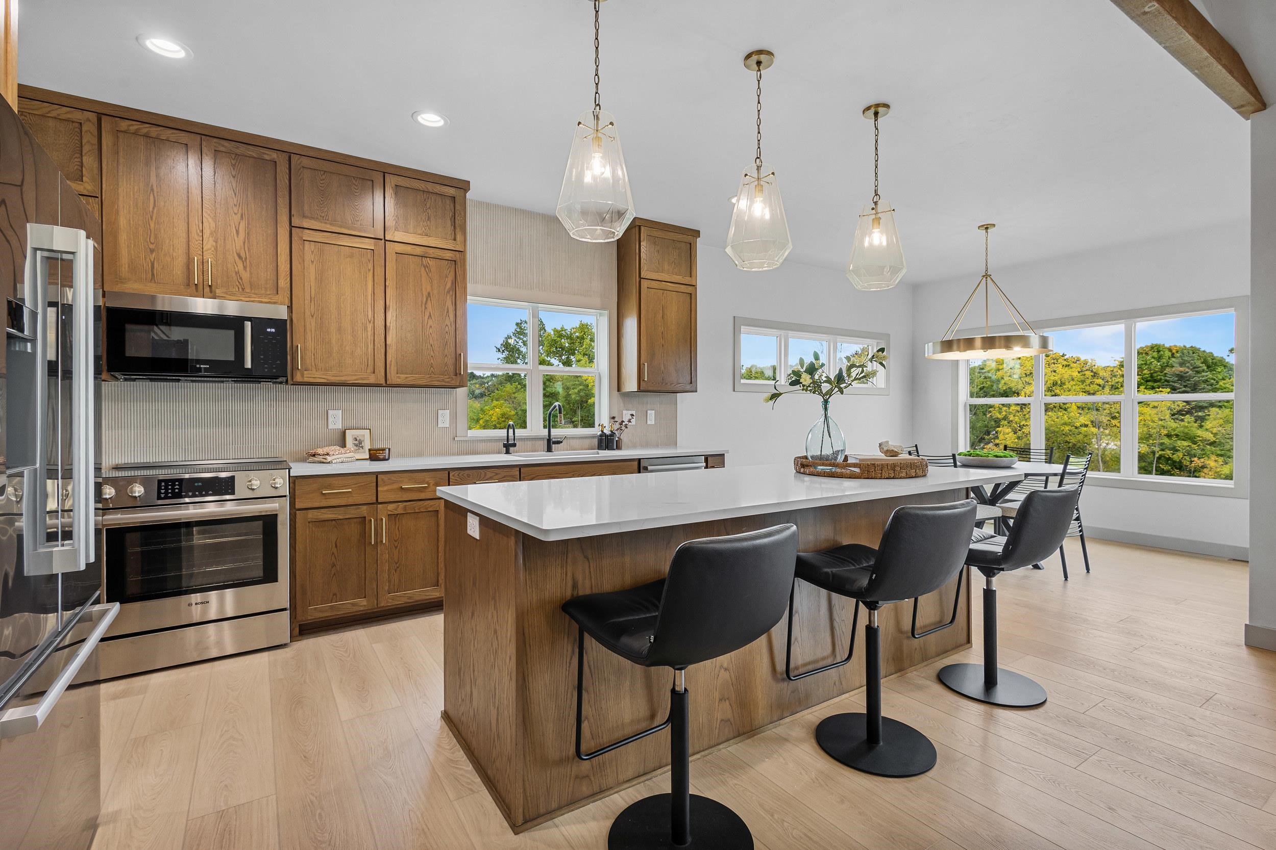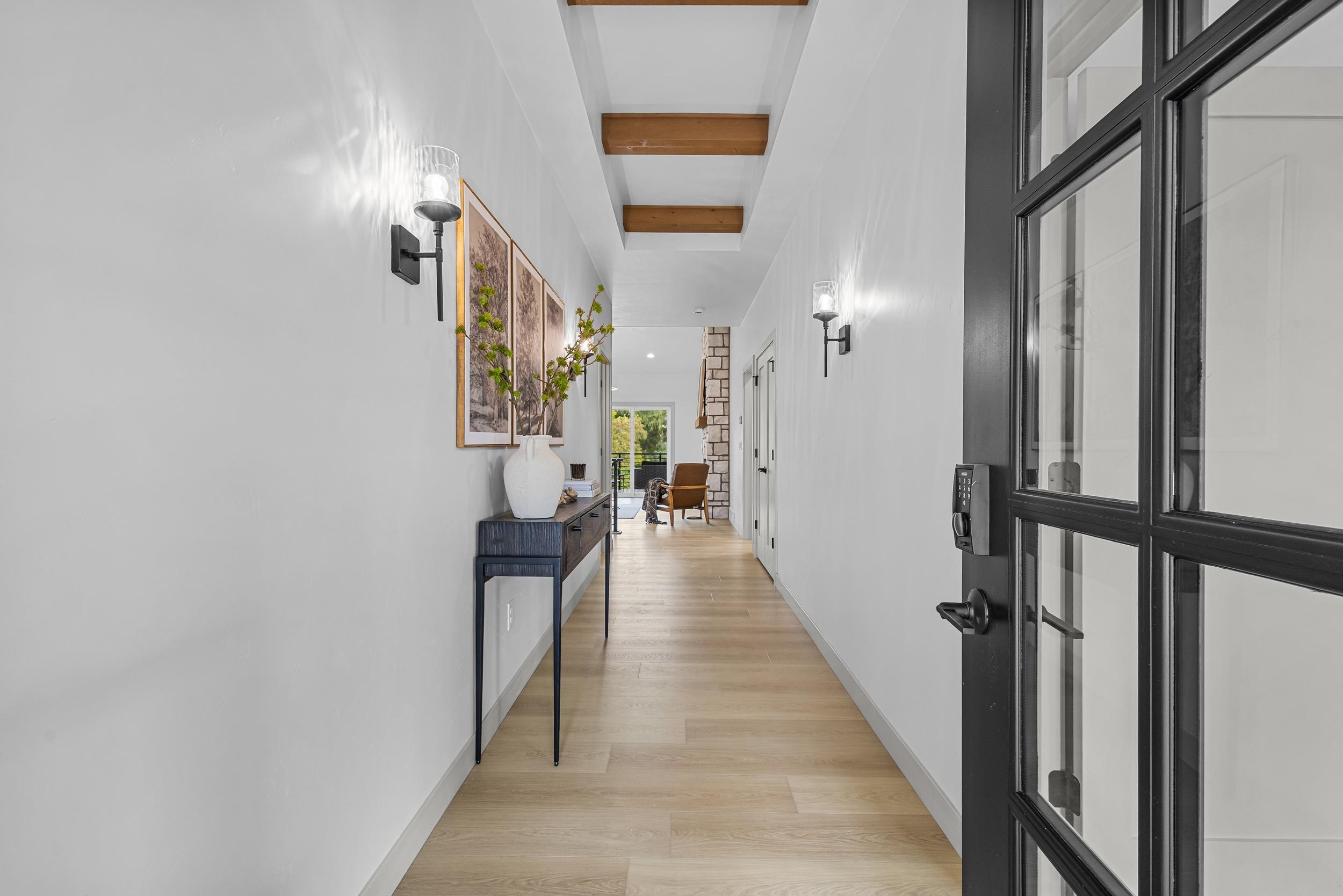 Step into this stunning 2-bed, 2.5-bath, zero-step entry home that offers a touch of elegance. The kitchen features custom white oak cabinets, quartz countertops, stylish backsplash, & walk-in pantry. Relax by the electric fireplace framed in Volterra Niveo stone, beneath warm wood beam accents. The mudroom is a perfect mix of function & style with built-in bench & custom lockers. The powder room is eye-catching with tiled accent wall & floating vanity. Guests can enter a charm-filled foyer w/wood beams & ambient wall lighting. The primary suite includes a quartz dual vanity, tiled shower, & WIC. Enjoy peaceful views from the covered deck or 4 season room. A custom metal railing leads to the exposed lower level, stubbed for a full bath bath for room to expand!