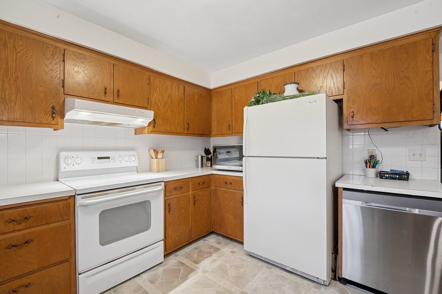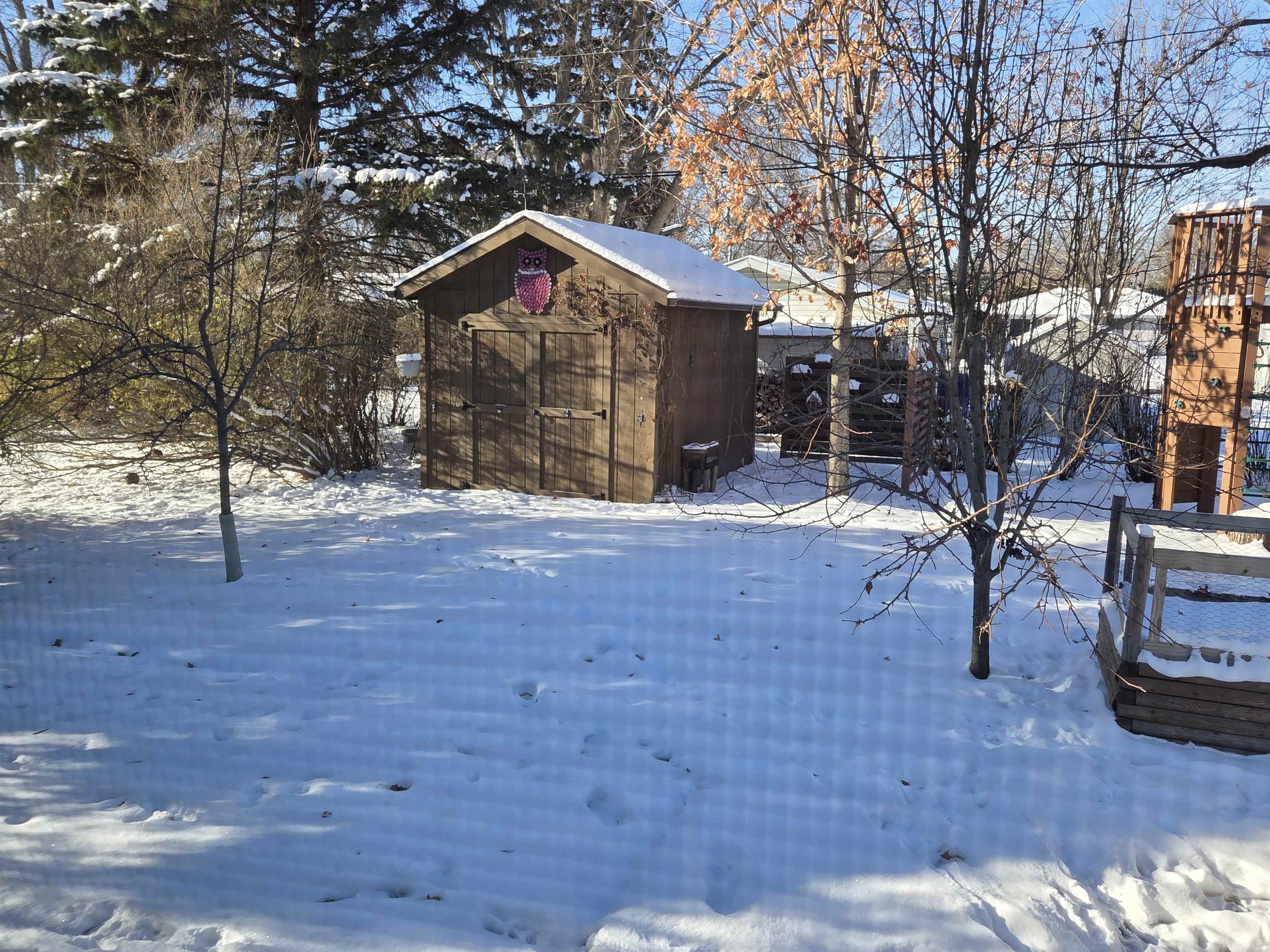 Mid century modern brick ranch steps to schools. You'll love the big open living and dining room. The nice kitchen creates a great space for fun entertaining. First floor family room opens to a funland backyard including a tree house and playset for hours of outside fun. Raised garden beds and fruit trees highlight this space as well. The lower level features LVP floors and plenty of space to relax. The extra private room provides a quiet retreat, study, office, or exercise space. Great house in a wonderful neighborhood!