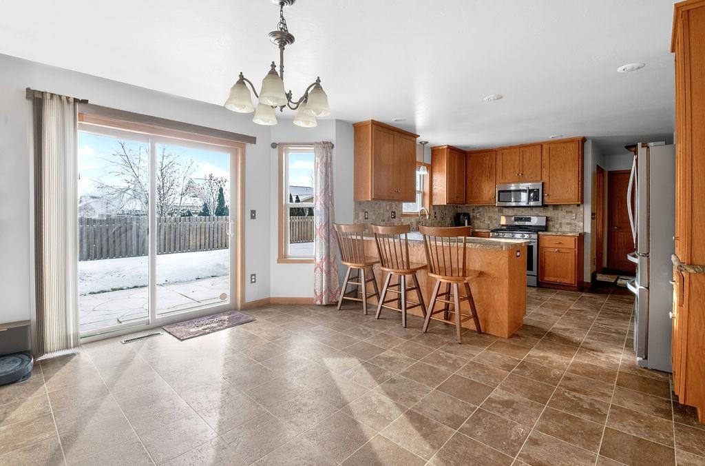 Welcome to this updated 3-bedroom, 2.5-bath home in the Town of Lawrence, within the West De Pere School District. Features include a spacious fenced yard, finished lower level with wet bar, mini fridge, beer tap, and wine fridge for entertaining. The main floor offers a kitchen with stainless steel appliances, dining area, half bath, living room with gas fireplace, and first-floor laundry with smart washer and dryer. Upstairs, find a primary suite with a walk-in closet and master bath, plus two additional bedrooms and a full bath. Exterior highlights: .31-acre fenced in yard, DogWatch hidden fence, 2 storage sheds, mature fruit trees, and wiring for a hot tub. The 2.5-car garage has extra depth & attic storage. Recent updates include a new roof, gutters (2024), and water heater (2019).