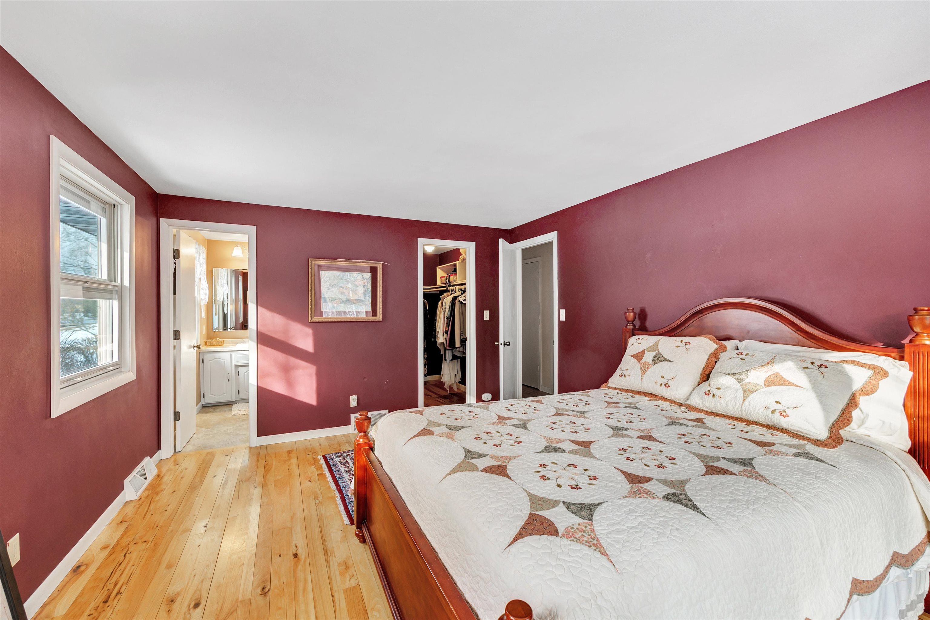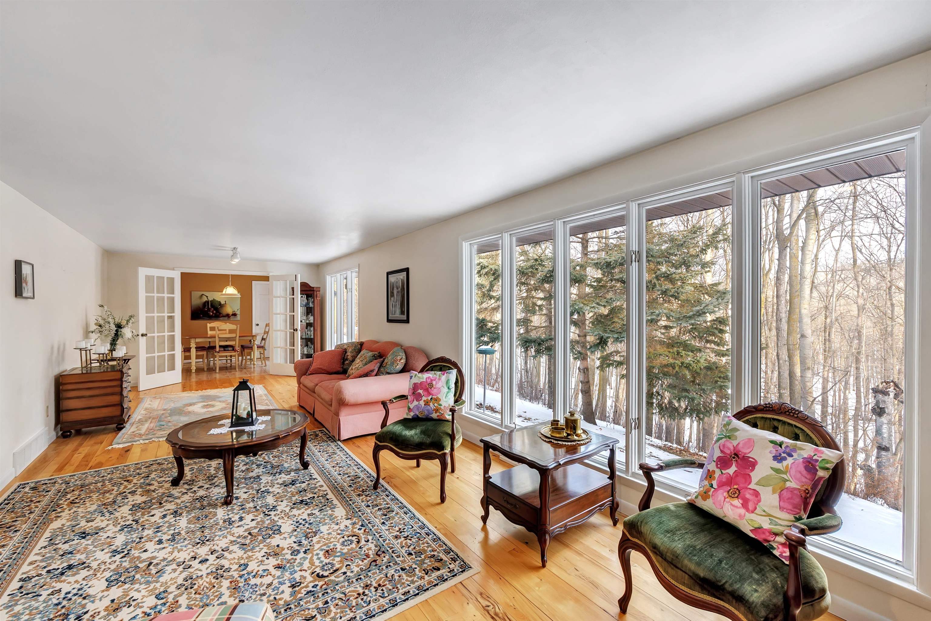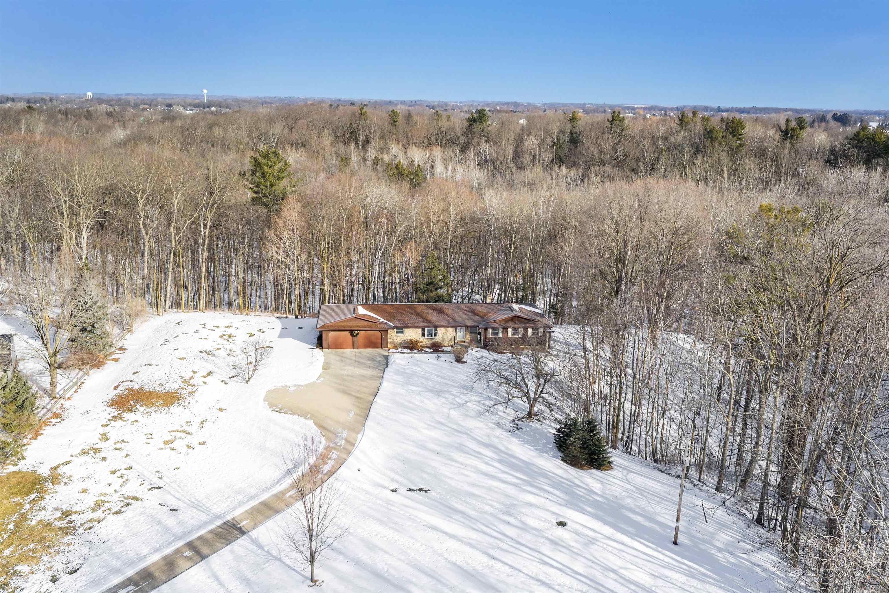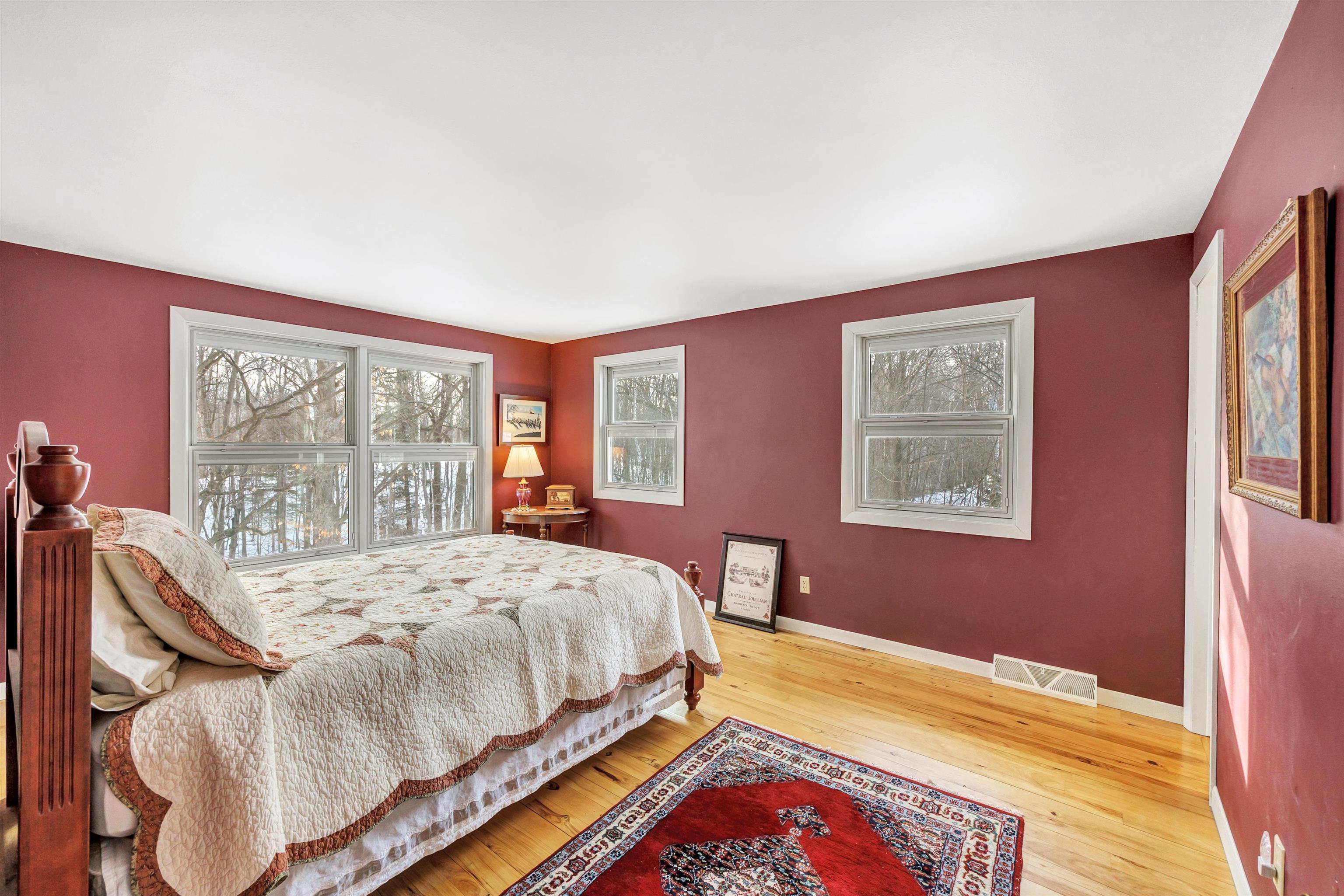 Nestled on 2.72 serene acres on a quiet dead-end road, this charming 3-bedroom, 2-full-bath walk-out ranch offers the perfect blend of character & modern updates. Step inside to discover beautiful rustic hickory floors flowing throughout the home, complemented by Pella windows with convenient built-in blinds. The inviting living room showcases panoramic views of the wooded backdrop, a cozy wood-burning fireplace, & elegant french doors. Kitchen features granite countertops, stainless steel appliances, & custom cabinetry. The spacious primary suite offers a walk-in closet & updated shower. Set back on a wooded ravine lot, this home provides exceptional privacy, natural beauty, & timeless charm! Electric heat in LL.