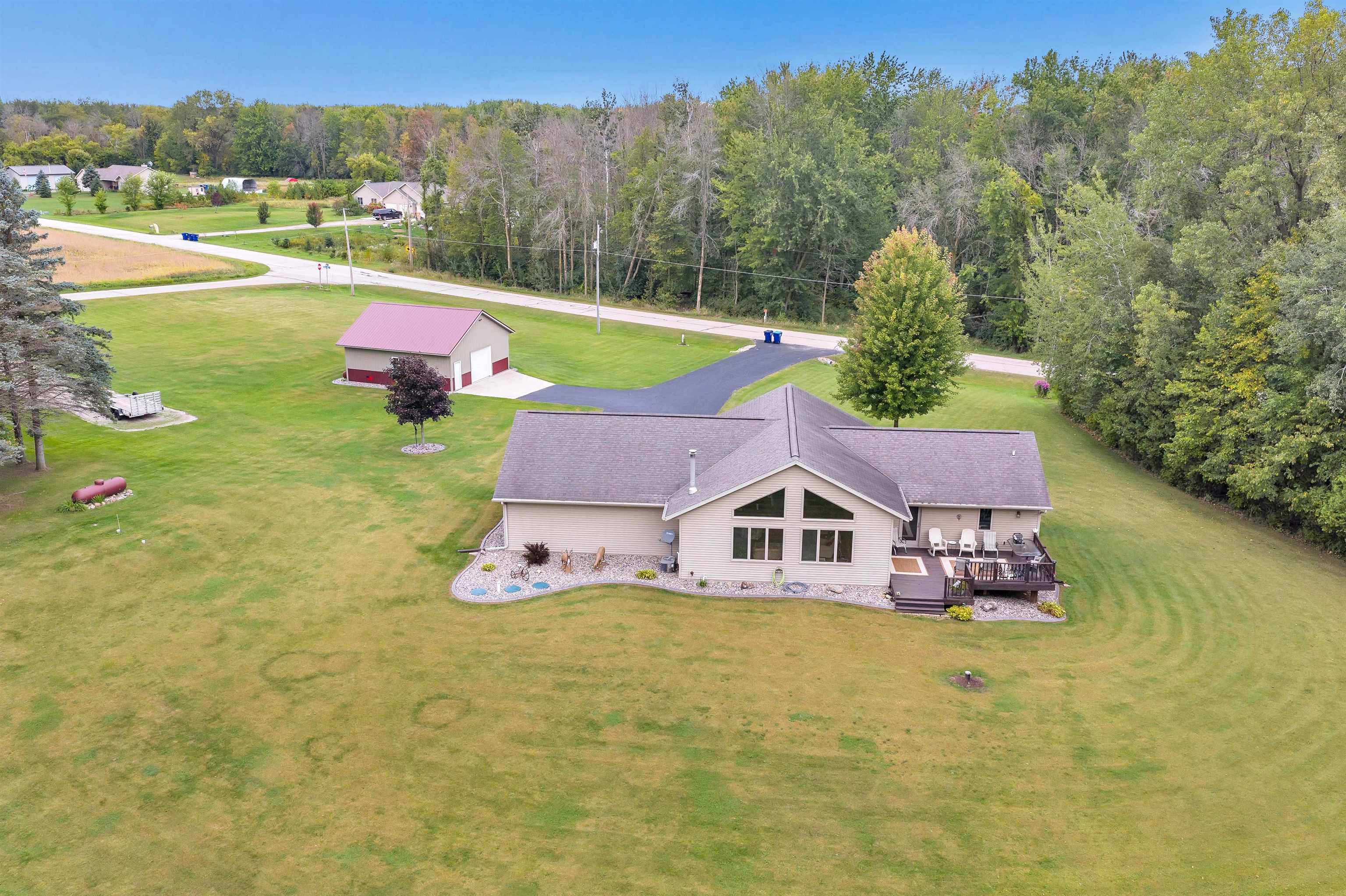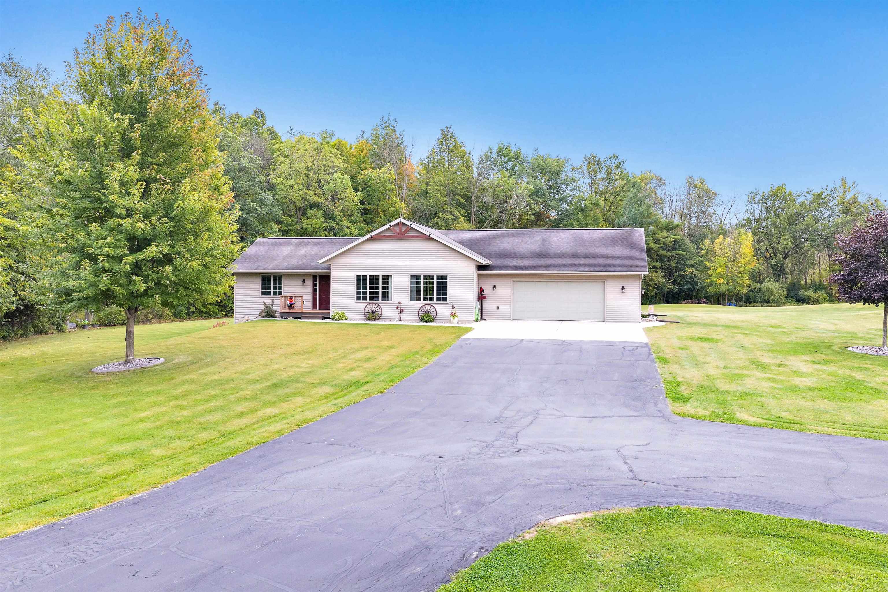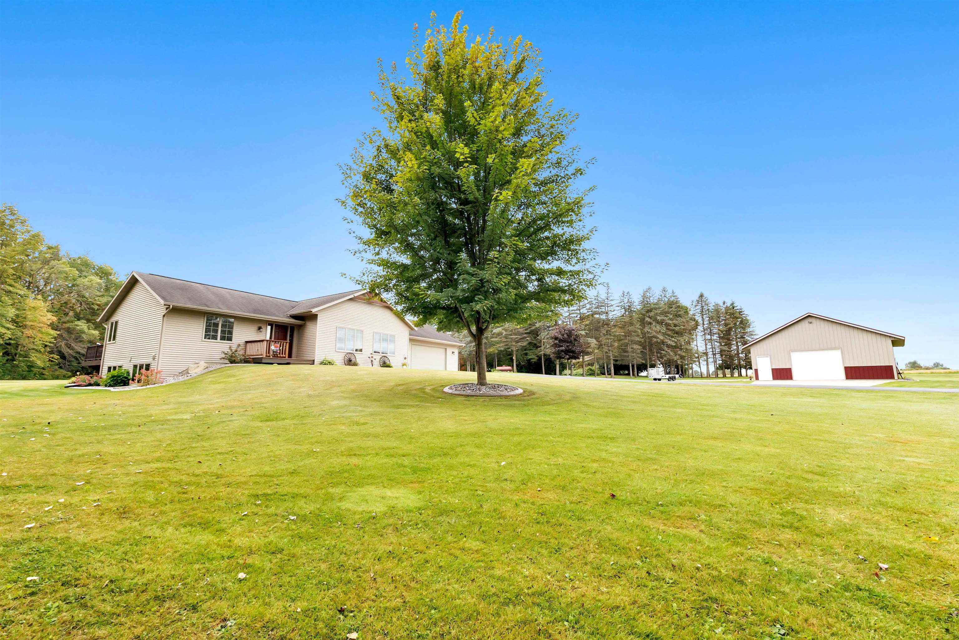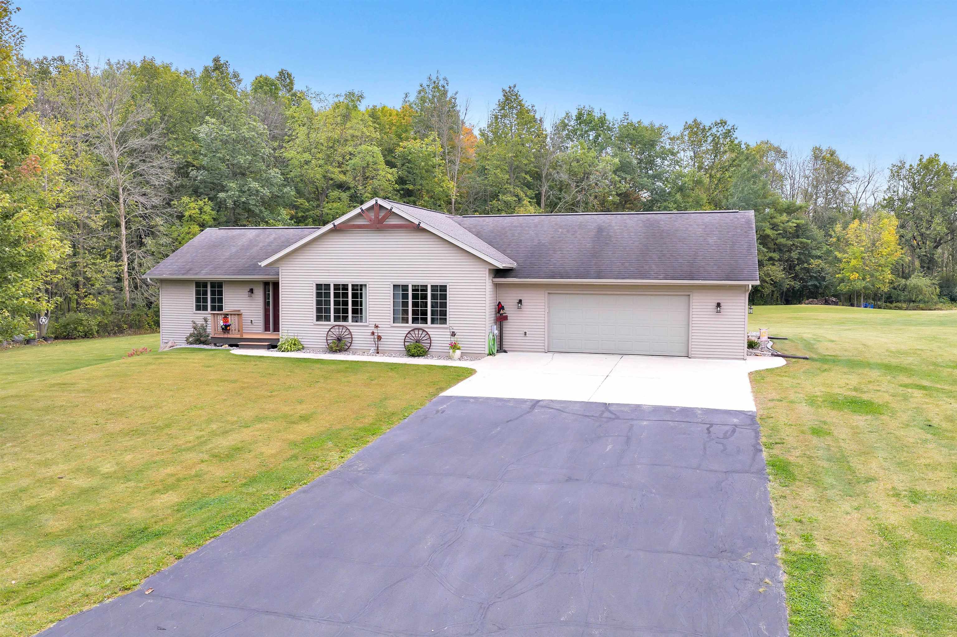 Exceptionally well maintained custom home on beautiful acreage. Property is conveniently located between Appleton, Green Bay, Shawano, and Pulaski. Home features a great open concept floorplan with stunning views of the property throughout. Main floor features a great flex space off the garage, currently being used as an office, 2 bedrooms and 2 full baths. Spacious living, dining, and kitchen area - great for entertaining. Kitchen has gorgeous hickory cabinets. Wood burning fireplace in living room. Lower level rec room features large windows, half bath, and abundant storage. Detached garage ready for your next project! Garage is heated and insulated. Garage has an outlet for welding. Path in woods great for walking! Move-in ready home!